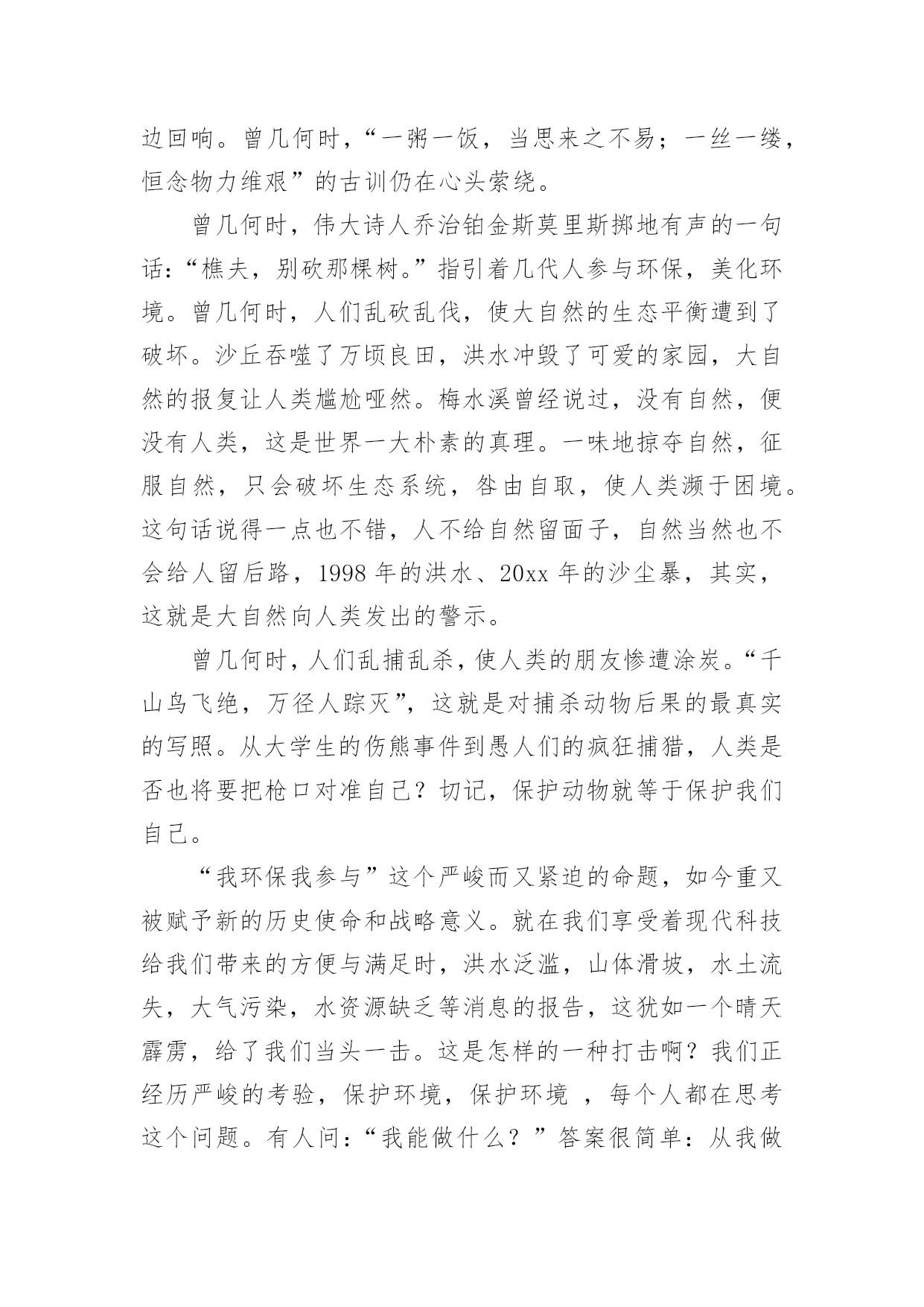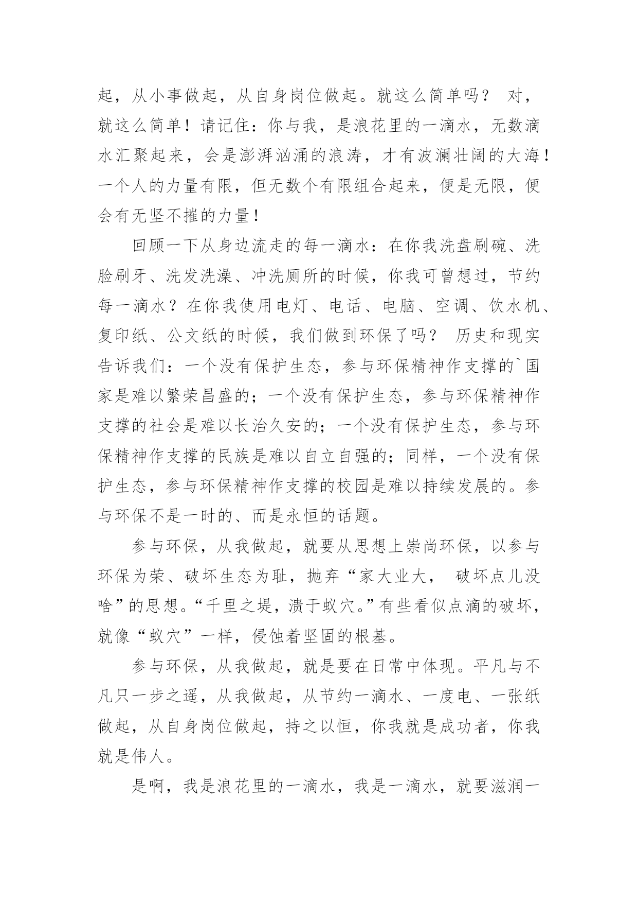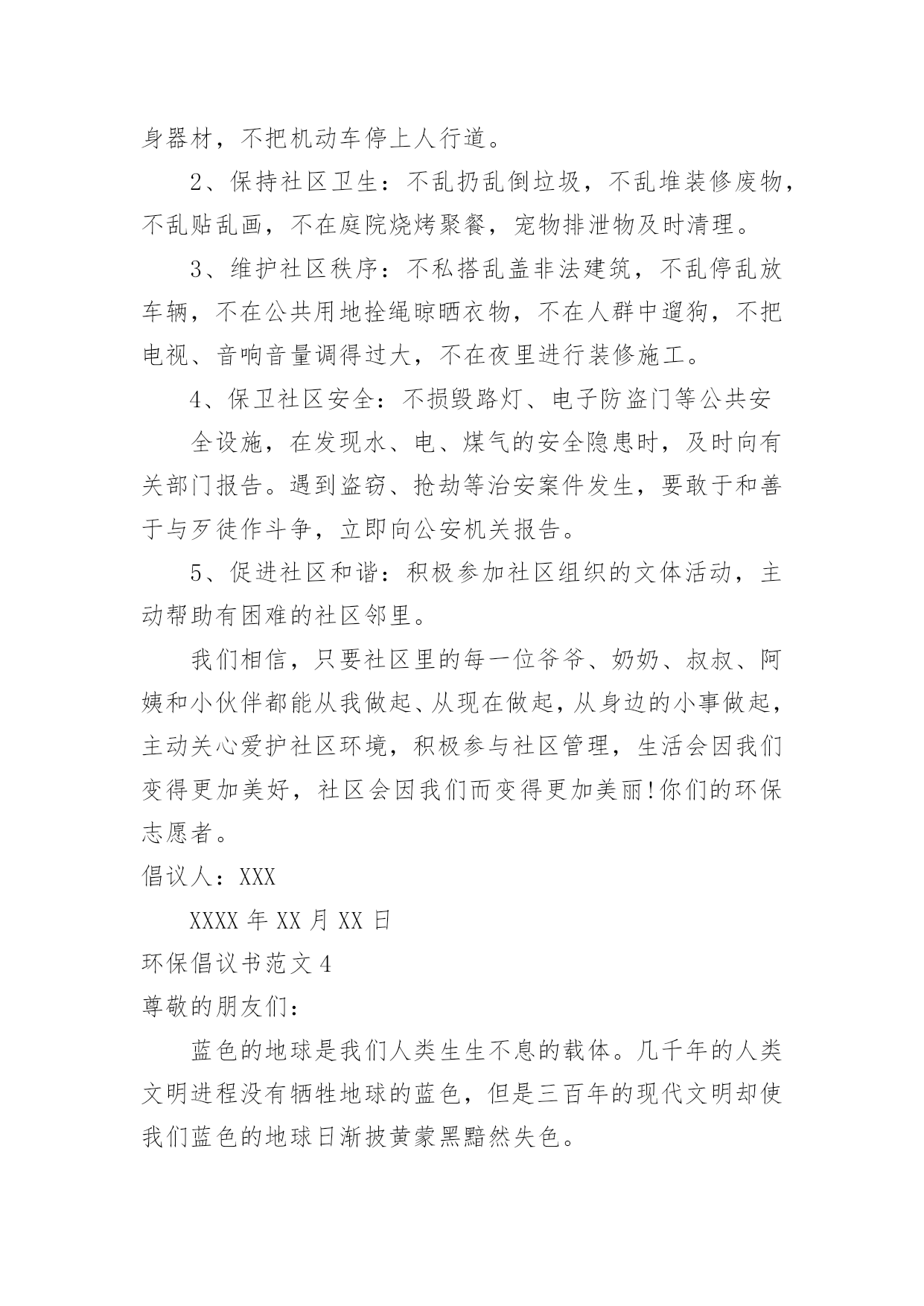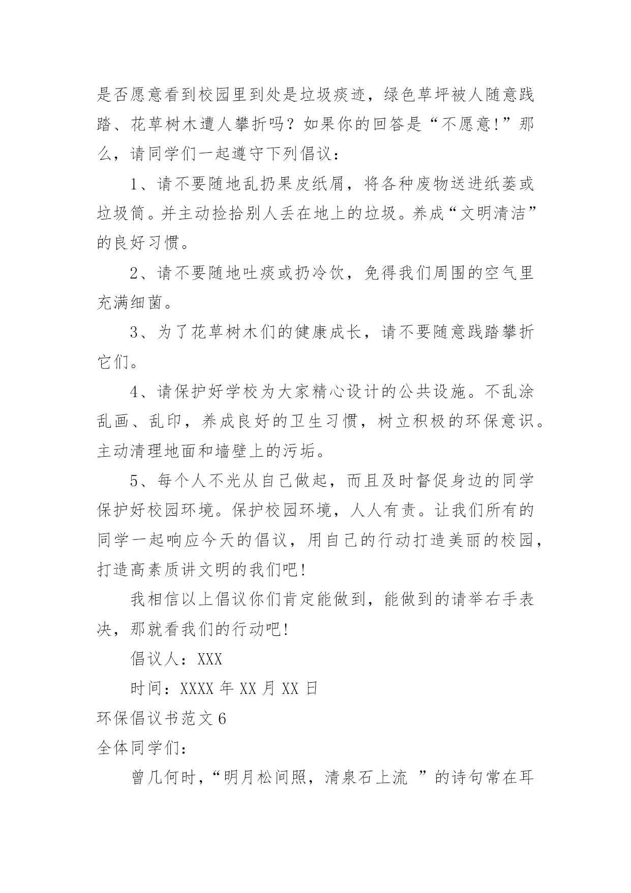 环保倡议书环保倡议书范文(汇编15篇)在充满活力,日益开放的今天,越来越多人会去使用倡议书,在写作上,倡议书有一定的书写规范。相信很多朋友都对写倡议书感到非常苦恼吧,下面是小编帮大家整理的环保倡议书范文,欢迎大家分享。环保倡议书范文1全镇的同胞们:地球,是人类的家园。它无私地把资源和空间送给我们,让我们能住上结实的房屋,能吃上可口的食物,能呼吸到新奇的空气,能感受到自然的芳香……可如今,环境已经被破坏得特别恶劣:被塑料袋填充的河流、卡着易拉罐的树木、飘舞着包装纸和传单的天空……人类假如不去爱护环境,环境自然也不会爱护我们。你顺手丢弃的垃圾,在几百年后才能分解完,还会被大自然中的`动物当做食物吃掉,而人又把动物当成食物。所以,人们丢的垃圾终有一天会害惨他们自己。在环境的报复里,没有一个人会是无辜的。为了生存的环境,为了健康的食物,为了人物的将来,请大家开头重视环境、爱护环境!为此,我向大家发出倡议:1、不乱扔垃圾,尽可能少使用塑料袋、塑料杯和一次性餐具等。2、不损害动物和益虫、不往花草树木上刻字、不往河里倒污水和垃圾。3、绿色出行,出门尽量乘坐公共汽车、地铁等公共交通工具或者步行、骑自行车,削减排放量。4、政府和社区可以在河边、街道放置垃圾桶,促进垃圾回收。5、政府可以组织义工或志愿者定期清理河道垃圾,保持河道洁净。6、循环利用水资源,把可回收垃圾和电池送到特地的回收站里,促进资源可回收利用。请大家行动起来,从小事做起、爱护环境,爱护我们共同的家园,让漂亮的家园不被垃圾废水污染!倡议人:xxx20xx年xx月xx日环保倡议书范文2新的世纪,我们渴望干净的地球,渴望健康的生命,渴望幸福的`家园,渴望绿色、健康、卫生的生活环境......作为二十一世纪的xx公司的职员,我们要义不容辞地承担起使命,共创绿色环保、健康卫生的新社会。我们的口号是:“绿色环保,举手之劳;从我做起,从点滴做起”。xx公司倡议:大了宣传普及环境保护知识,提高工人们的环境意识,积极参与工业园区的环保实践和监督;从我做起,从现在做起,从身边小事做起,提倡绿色生活,节约资源,减少污染,回收资源,绿色消费,支持环保;积极参与环境的绿化、美化、净化,清除或有效控制日常生活中产生的污染,对环境少一份破坏,多一份关爱,共创绿色家园;全面提高环境与发展意识,树立正确的环境价值观和环境道德风尚;认真贯彻国家方针政策,法律法规,为改善人类居住环境做出实质性的贡献。为了我们共同的家园,让我们行动起来,用爱心去关注环境的变化,用热情去传播环保的理念,用行动肩负起环保重任。让天更蓝,水更清,地更绿,让我们的工业园区更美丽。倡议人:XX时间:XX年XX月XX日环保倡议书范文3亲爱的爷爷、奶奶、叔叔、阿姨,社区小伙伴们:在市、区党委和政府的大力推动下,裸土地面硬化绿化集中整治战役在我们身边轰轰烈烈的打响了。社会各界纷纷出钱出力,参与到地面硬化、社区绿化、楼体粉刷、私建拆除等工作中,身边发生的巨大变化让我们欣喜又兴奋:破损的道板被重新铺装、荒芜的绿地种上了鲜花、角落里的垃圾杂物不见了踪影、多年的老楼也被粉刷一新,我们的家园,真的彻底变了样!但是,整洁、舒适、安全的社区环境不能光靠工人叔叔的建设,更需要大家承担起社区主人翁的责任,自觉担当社区的.管护员和监督员,为建设美好家园贡献力量。在此,我们向大家发出倡议:1、爱护社区设施:不践踏、损毁花坛绿地,不破坏健身器材,不把机动车停上人行道。2、保持社区卫生:不乱扔乱倒垃圾,不乱堆装修废物,不乱贴乱画,不在庭院烧烤聚餐,宠物排泄物及时清理。3、维护社区秩序:不私搭乱盖非法建筑,不乱停乱放车辆,不在公共用地拴绳晾晒衣物,不在人群中遛狗,不把电视、音响音量调得过大,不在夜里进行装修施工。4、保卫社区安全:不损毁路灯、电子防盗门等公共安全设施,在发现水、电、煤气的安全隐患时,及时向有关部门报告。遇到盗窃、抢劫等治安案件发生,要敢于和善于与歹徒作斗争,立即向公安机关报告。5、促进社区和谐:积极参加社区组织的文体活动,主动帮助有困难的社区邻里。我们相信,只要社区里的每一位爷爷、奶奶、叔叔、阿姨和小伙伴都能从我做起、从现在做起,从身边的小事做起,主动关心爱护社区环境,积极参与社区管理,生活会因我们变得更加美好,社区会因我们而变得更加美丽!你们的环保志愿者。倡议人:XXXXXXX年XX月XX日环保倡议书范文4尊敬的朋友们:蓝色的地球是我们人类生生不息的载体。几千年的人类文明进程没有牺牲地球的蓝色,但是三百年的现代文明却使我们蓝色的地球日渐披黄蒙黑黯然失色。当林立的高楼取代了荫荫的绿树,当城市的霓虹暗淡了星星的光茫,文明战胜了蛮荒,21世纪的人类站在了世界的巅峰。但是,北极熊却只能在越来越小的冰面上艰难地觅食,印度洋大海啸夺走了万千人的生命,sas肆虐、洪水横