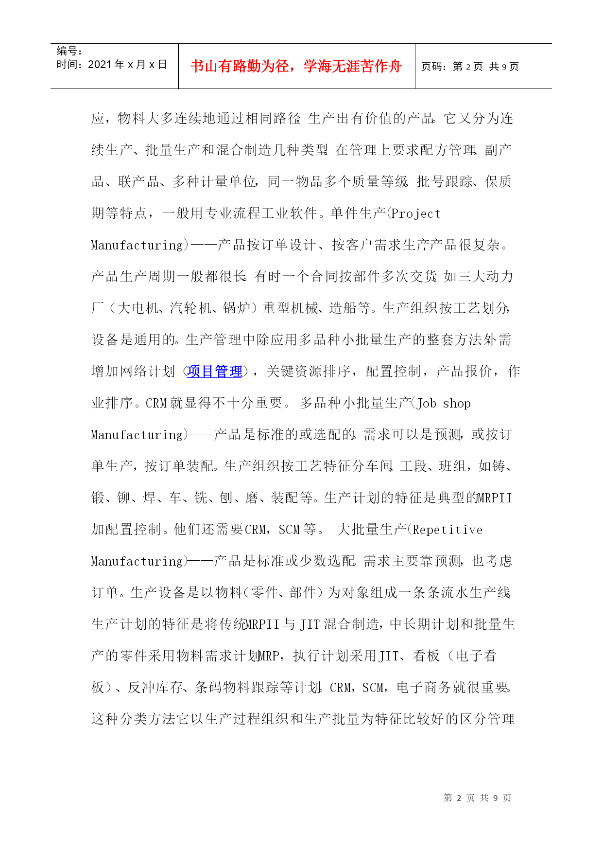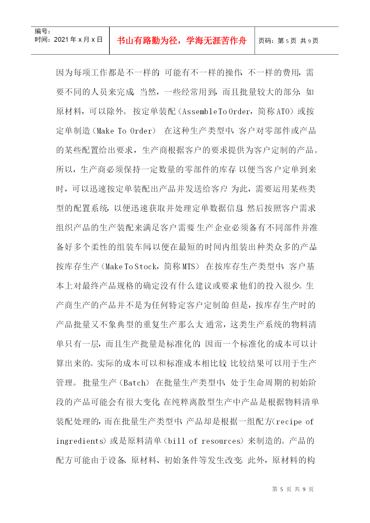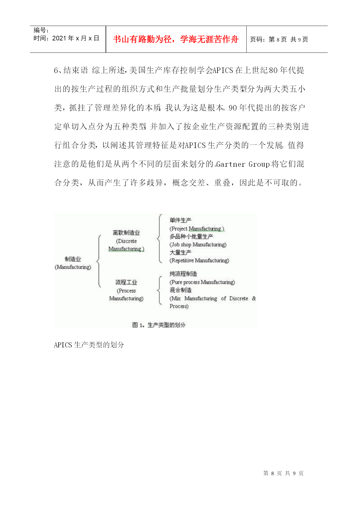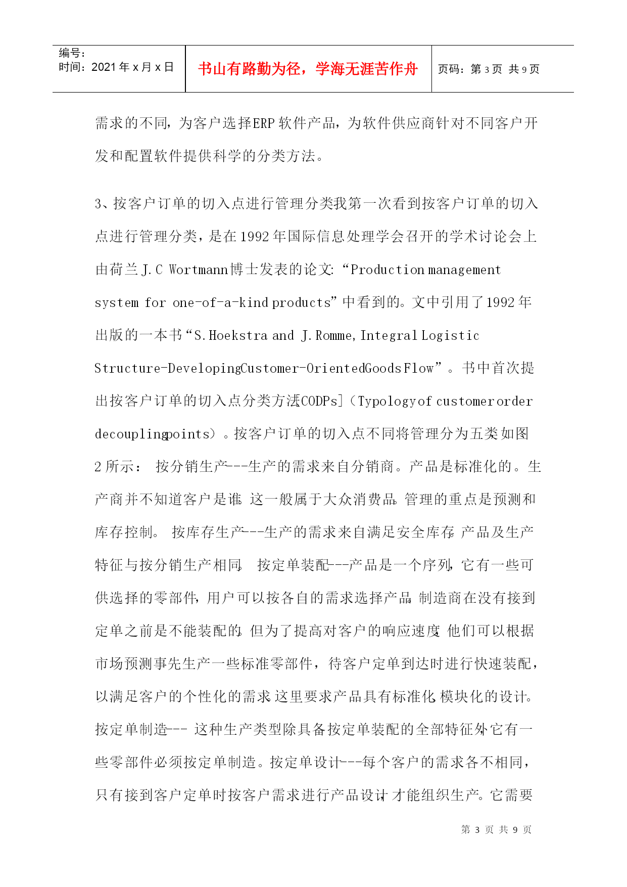 编号:时间:2021年x月x日书山有路勤为径,学海无涯苦作舟页码:第PAGE9页共NUMPAGES9页第PAGE\*MERGEFORMAT9页共NUMPAGES\*MERGEFORMAT9页1、前言GartnerGroup1997年在ERP供应商指南中提出将制造业按生产类型分为六类,即按(1)定单设计(EngineerToOrder,简称ETO)或按项目设计(EngineerToProject),(2)按定单装配(AssembleToOrder,简称ATO)或按定单制造(MakeToOrder),(3)按库存生产(MakeToStock,简称MTS),(4)批量生产(Batch),(5)重复生产(Repetitive),(6)连续生产(Continuous)。文章描述了六种生产类型的特点,生产的典型产品和对ERP的要求。目的是希望ERP的用户按此分类来选择ERP产品,希望ERP供应商以此来指导软件开发。这篇文章在中文网站上被几千次地引用,可谓影响深远。作者认为这样的分类方法是概念含混的,因此是不科学的。2、按生产过程的组织方式和生产批量划分生产类型早在上世纪80年代美国生产控制学会(APICS)就提出了制造业生产类型划分的标准。提出按生产过程的组织方式和生产批量划分生产类型,以便区别管理需求的不同和对MRPII管理软件适应不同生产类型的解决方案。图1是APICS当年对生产类型的划分。这些制造类型的特征:离散制造(DiscreteManufacturing)——不同的物料经过非连续的移动,通过不同路径,生产出不同的物料和产品。如汽车、飞机、计算机等。流程工业(ProcessManufacturing)——物料经过混合、分离、成型或者化学反应,物料大多连续地通过相同路径,生产出有价值的产品。它又分为连续生产、批量生产和混合制造几种类型。在管理上要求配方管理、副产品、联产品、多种计量单位,同一物品多个质量等级、批号跟踪、保质期等特点,一般用专业流程工业软件。单件生产(ProjectManufacturing)——产品按订单设计、按客户需求生产,产品很复杂。产品生产周期一般都很长。有时一个合同按部件多次交货。如三大动力厂(大电机、汽轮机、锅炉)重型机械、造船等。生产组织按工艺划分,设备是通用的。生产管理中除应用多品种小批量生产的整套方法外,需增加网络计划(项目管理),关键资源排序,配置控制,产品报价,作业排序。CRM就显得不十分重要。多品种小批量生产(JobshopManufacturing)——产品是标准的或选配的。需求可以是预测,或按订单生产,按订单装配。生产组织按工艺特征分车间、工段、班组,如铸、锻、铆、焊、车、铣、刨、磨、装配等。生产计划的特征是典型的MRPII加配置控制。他们还需要CRM,SCM等。大批量生产(RepetitiveManufacturing)——产品是标准或少数选配。需求主要靠预测,也考虑订单。生产设备是以物料(零件、部件)为对象组成一条条流水生产线。生产计划的特征是将传统MRPII与JIT混合制造,中长期计划和批量生产的零件采用物料需求计划MRP,执行计划采用JIT、看板(电子看板)、反冲库存、条码物料跟踪等计划。CRM,SCM,电子商务就很重要。这种分类方法它以生产过程组织和生产批量为特征,比较好的区分管理需求的不同,为客户选择ERP软件产品,为软件供应商针对不同客户开发和配置软件提供科学的分类方法。3、按客户订单的切入点进行管理分类我第一次看到按客户订单的切入点进行管理分类,是在1992年国际信息处理学会召开的学术讨论会上由荷兰J.CWortmann博士发表的论文:“Productionmanagementsystemforone-of-a-kindproducts”中看到的。文中引用了1992年出版的一本书“S.HoekstraandJ.Romme,IntegralLogisticStructure-DevelopingCustomer-OrientedGoodsFlow”。书中首次提出按客户订单的切入点分类方法[CODPs](Typologyofcustomerorderdecouplingpoints)。按客户订单的切入点不同将管理分为五类,如图2所示:按分销生产---生产的需求来自分销商。产品是标准化的。生产商并不知道客户是谁。这一般属于大众消费品。管理的重点是预测和库存控制。按库存生产---生产的需求来自满足安全库存。产品及生产特征与按分销生产相同。按定单装配---产品是一个序列,它有一些可供选择的零部件,用户可以按各自的需求选择产品。制造商在没有接到定单之前是不能装配的。但为了提高对客户的响应速度,他们可以根据市场预测事先生产一些标准零部件,待客户定单