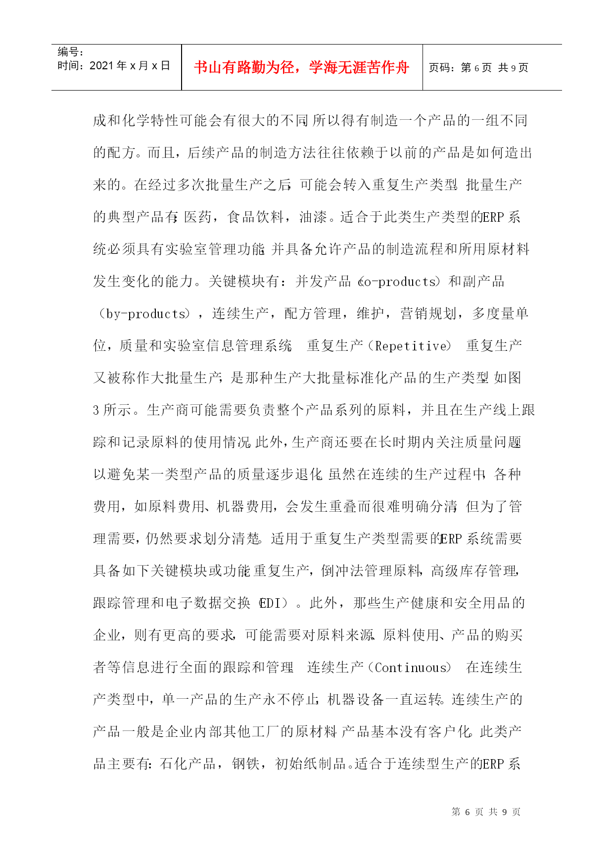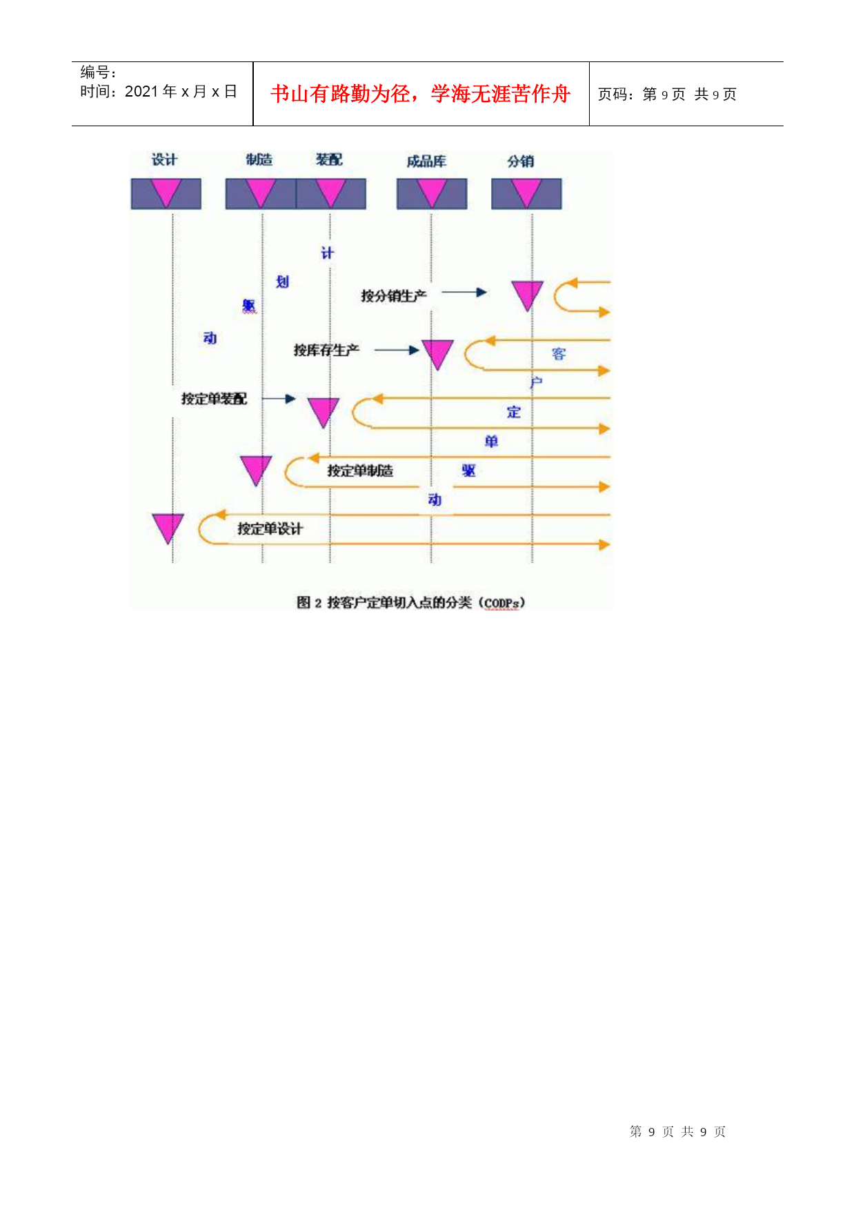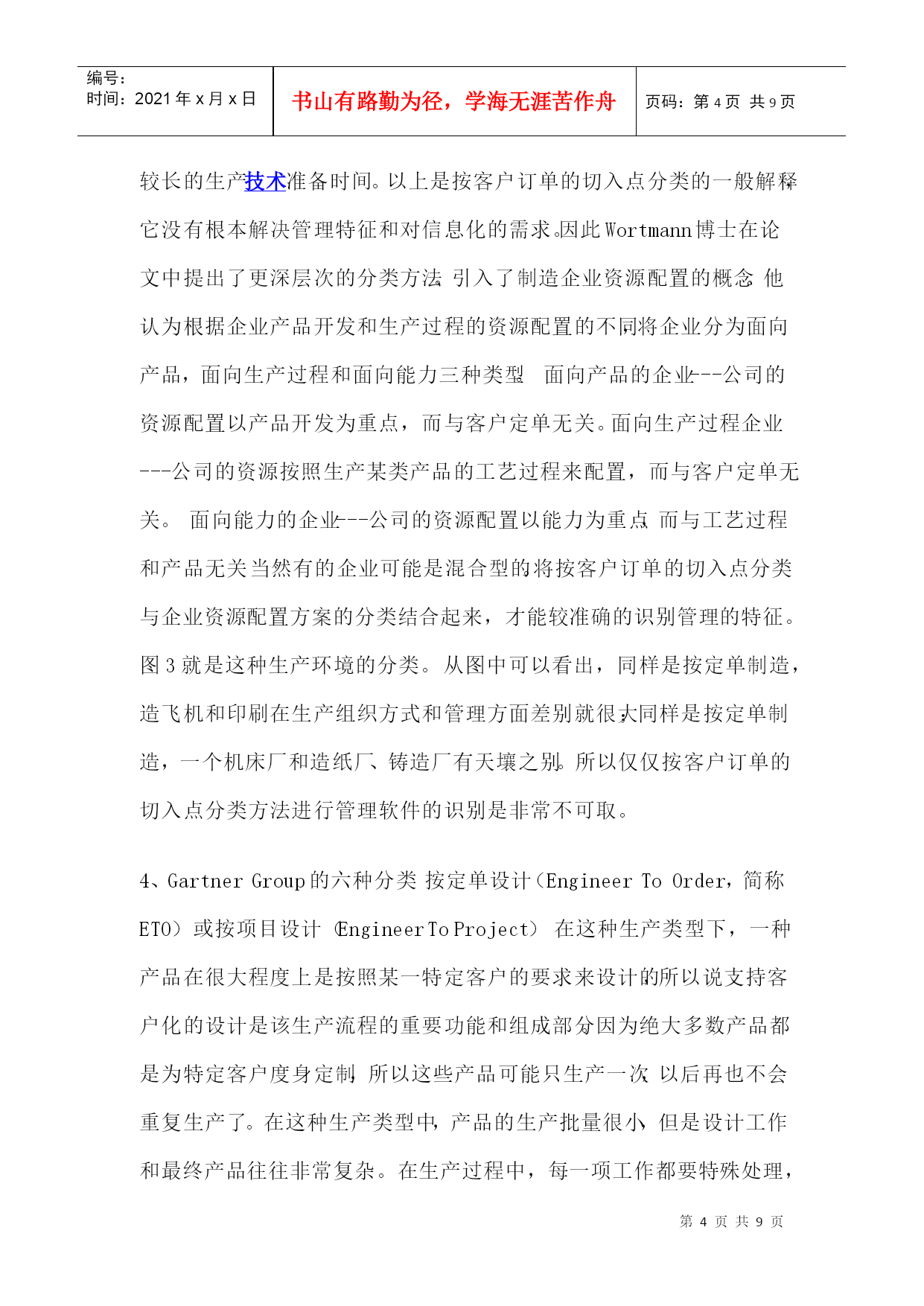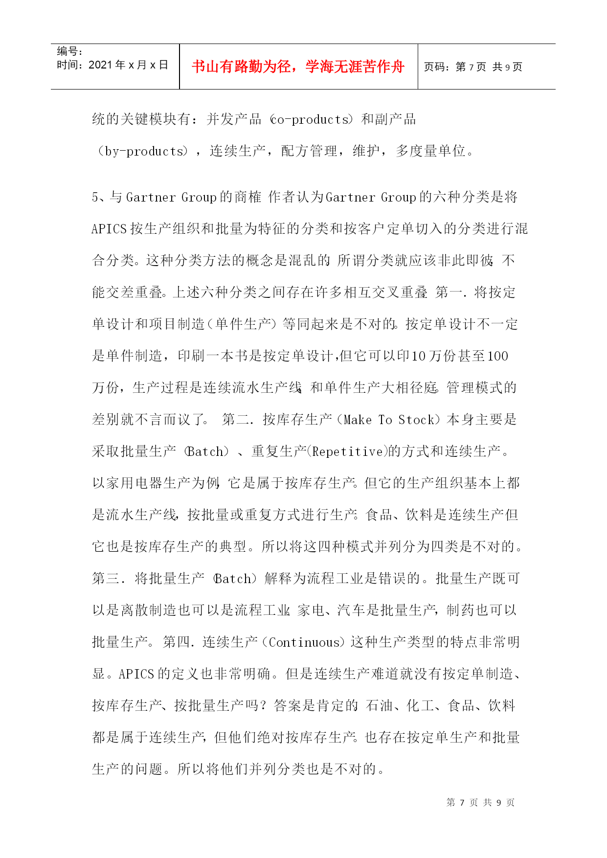 编号:时间:2021年x月x日书山有路勤为径,学海无涯苦作舟页码:第PAGE9页共NUMPAGES9页第PAGE\*MERGEFORMAT9页共NUMPAGES\*MERGEFORMAT9页1、前言GartnerGroup1997年在ERP供应商指南中提出将制造业按生产类型分为六类,即按(1)定单设计(EngineerToOrder,简称ETO)或按项目设计(EngineerToProject),(2)按定单装配(AssembleToOrder,简称ATO)或按定单制造(MakeToOrder),(3)按库存生产(MakeToStock,简称MTS),(4)批量生产(Batch),(5)重复生产(Repetitive),(6)连续生产(Continuous)。文章描述了六种生产类型的特点,生产的典型产品和对ERP的要求。目的是希望ERP的用户按此分类来选择ERP产品,希望ERP供应商以此来指导软件开发。这篇文章在中文网站上被几千次地引用,可谓影响深远。作者认为这样的分类方法是概念含混的,因此是不科学的。2、按生产过程的组织方式和生产批量划分生产类型早在上世纪80年代美国生产控制学会(APICS)就提出了制造业生产类型划分的标准。提出按生产过程的组织方式和生产批量划分生产类型,以便区别管理需求的不同和对MRPII管理软件适应不同生产类型的解决方案。图1是APICS当年对生产类型的划分。这些制造类型的特征:离散制造(DiscreteManufacturing)——不同的物料经过非连续的移动,通过不同路径,生产出不同的物料和产品。如汽车、飞机、计算机等。流程工业(ProcessManufacturing)——物料经过混合、分离、成型或者化学反应,物料大多连续地通过相同路径,生产出有价值的产品。它又分为连续生产、批量生产和混合制造几种类型。在管理上要求配方管理、副产品、联产品、多种计量单位,同一物品多个质量等级、批号跟踪、保质期等特点,一般用专业流程工业软件。单件生产(ProjectManufacturing)——产品按订单设计、按客户需求生产,产品很复杂。产品生产周期一般都很长。有时一个合同按部件多次交货。如三大动力厂(大电机、汽轮机、锅炉)重型机械、造船等。生产组织按工艺划分,设备是通用的。生产管理中除应用多品种小批量生产的整套方法外,需增加网络计划(项目管理),关键资源排序,配置控制,产品报价,作业排序。CRM就显得不十分重要。多品种小批量生产(JobshopManufacturing)——产品是标准的或选配的。需求可以是预测,或按订单生产,按订单装配。生产组织按工艺特征分车间、工段、班组,如铸、锻、铆、焊、车、铣、刨、磨、装配等。生产计划的特征是典型的MRPII加配置控制。他们还需要CRM,SCM等。大批量生产(RepetitiveManufacturing)——产品是标准或少数选配。需求主要靠预测,也考虑订单。生产设备是以物料(零件、部件)为对象组成一条条流水生产线。生产计划的特征是将传统MRPII与JIT混合制造,中长期计划和批量生产的零件采用物料需求计划MRP,执行计划采用JIT、看板(电子看板)、反冲库存、条码物料跟踪等计划。CRM,SCM,电子商务就很重要。这种分类方法它以生产过程组织和生产批量为特征,比较好的区分管理需求的不同,为客户选择ERP软件产品,为软件供应商针对不同客户开发和配置软件提供科学的分类方法。3、按客户订单的切入点进行管理分类我第一次看到按客户订单的切入点进行管理分类,是在1992年国际信息处理学会召开的学术讨论会上由荷兰J.CWortmann博士发表的论文:“Productionmanagementsystemforone-of-a-kindproducts”中看到的。文中引用了1992年出版的一本书“S.HoekstraandJ.Romme,IntegralLogisticStructure-DevelopingCustomer-OrientedGoodsFlow”。书中首次提出按客户订单的切入点分类方法[CODPs](Typologyofcustomerorderdecouplingpoints)。按客户订单的切入点不同将管理分为五类,如图2所示:按分销生产---生产的需求来自分销商。产品是标准化的。生产商并不知道客户是谁。这一般属于大众消费品。管理的重点是预测和库存控制。按库存生产---生产的需求来自满足安全库存。产品及生产特征与按分销生产相同。按定单装配---产品是一个序列,它有一些可供选择的零部件,用户可以按各自的需求选择产品。制造商在没有接到定单之前是不能装配的。但为了提高对客户的响应速度,他们可以根据市场预测事先生产一些标准零部件,待客户定单
