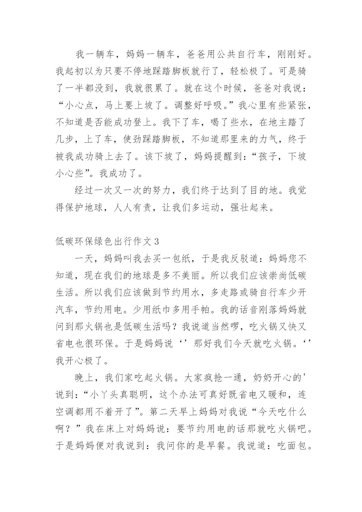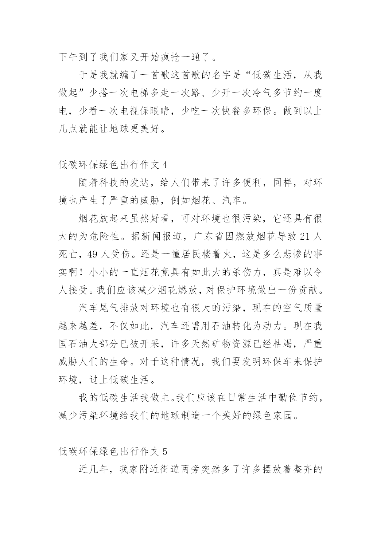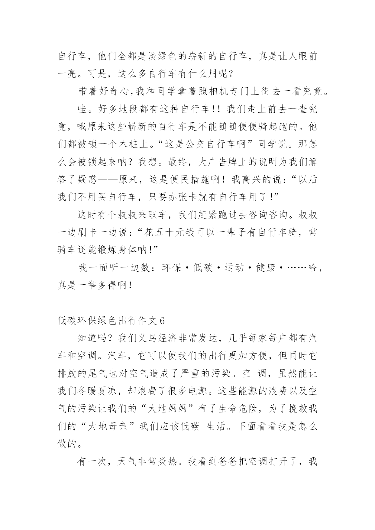 低碳环保绿色出行作文在日常学习、工作和生活中,大家对作文都再熟悉不过了吧,借助作文可以宣泄心中的情感,调节自己的心情。你所见过的作文是什么样的呢?下面是小编为大家整理的低碳环保绿色出行作文,欢迎阅读,希望大家能够喜欢。低碳环保绿色出行作文1现在随处都能看到“节能减排,绿色出行”的宣传语。大家知道“绿色出行”是什么意思吗?让我来告诉大家吧!“绿色出行”是一种环保理念,也是一种健康的生活方式。比如说:步行、骑自行车、乘坐公交或地铁都可以减少汽车尾气的排放,都是绿色出行。我是环保小卫士,当然应该保护环境,合理的选择出行方式。以前是爸爸开车送我去上课,现在我让爸爸妈妈骑车送我去。就算是去家或去,我们也选择乘坐公交或地铁。为我们能拥有一个绿色生活环境,真大家都能做到绿色出行。让我们行动起来,共同保卫地球妈妈的健康吧!低碳环保绿色出行作文2一个风和日丽的下午,爸爸、妈妈和我打算去朋友家送点东西,但我们知道该怎么去。汽车不行,太堵了;电瓶车不行,拿去修了;走路不行,太远了。我突然想起放在车棚里的两辆自行车,就打算骑自行车,既方便又低碳。我一辆车,妈妈一辆车,爸爸用公共自行车,刚刚好。我起初以为只要不停地踩踏脚板就行了,轻松极了。可是骑了一半都没到,我就很累了。就在这个时候,爸爸对我说:“小心点,马上要上坡了。调整好呼吸。”我心里有些紧张,不知道是否能成功登上。我下了车,喝了些水,在地主踏了几步,上了车,使劲踩踏脚板,不知道那里来的力气,终于被我成功骑上去了。该下坡了,妈妈提醒到:“孩子,下坡小心些”。我成功了。经过一次又一次的努力,我们终于达到了目的地。我觉得保护地球,人人有责,让我们多运动,强壮起来。低碳环保绿色出行作文3一天,妈妈叫我去买一包纸,于是我反驳道:妈妈您不知道,现在我们的地球是多不美丽。所以我们应该崇尚低碳生活。所以我们应该做到节约用水,多走路或骑自行车少开汽车,节约用电。少用纸巾多用手帕。我的话音刚落妈妈就问到那火锅也是低碳生活吗?我说道当然啰,吃火锅又快又省电也很环保。于是妈妈说‘’那好我们今天就吃火锅。‘’我开心极了。晚上,我们家吃起火锅。大家疯抢一通,奶奶开心的'说到:“小丫头真聪明,这个办法可真好既省电又暖和,连空调都用不着开了”。第二天早上妈妈对我说“今天吃什么啊?”我在床上对妈妈说:要节约用电的话那就吃火锅吧。于是妈妈便对我说到:我问你的是早餐。我说道:吃面包。下午到了我们家又开始疯抢一通了。于是我就编了一首歌这首歌的名字是“低碳生活,从我做起”少搭一次电梯多走一次路、少开一次冷气多节约一度电,少看一次电视保眼睛,少吃一次快餐多环保。做到以上几点就能让地球更美好。低碳环保绿色出行作文4随着科技的发达,给人们带来了许多便利,同样,对环境也产生了严重的威胁,例如烟花、汽车。烟花放起来虽然好看,可对环境也很污染,它还具有很大的为危险性。据新闻报道,广东省因燃放烟花导致21人死亡,49人受伤。还是一幢居民楼着火,这是多么悲惨的事实啊!小小的一直烟花竟具有如此大的杀伤力,真是难以令人接受。我们应该减少烟花燃放,对保护环境做出一份贡献。汽车尾气排放对环境也有很大的污染,现在的空气质量越来越差,不仅如此,汽车还需用石油转化为动力。现在我国石油大部分已被开采,许多天然矿物资源已经枯竭,严重威胁人们的生命。对于这种情况,我们要发明环保车来保护环境,过上低碳生活。我的低碳生活我做主。我们应该在日常生活中勤俭节约,减少污染环境给我们的地球制造一个美好的绿色家园。低碳环保绿色出行作文5近几年,我家附近街道两旁突然多了许多摆放着整齐的自行车,他们全都是淡绿色的崭新的自行车,真是让人眼前一亮。可是,这么多自行车有什么用呢?带着好奇心,我和同学拿着照相机专门上街去一看究竟。哇。好多地段都有这种自行车!!我们走上前去一查究竟,哦原来这些崭新的自行车是不能随随便便骑起跑的。他们都被锁一个木桩上。“这是公交自行车啊”同学说。那怎么会被锁起来呐?我想。最终,大广告牌上的说明为我们解答了疑惑——原来,这是便民措施啊!我高兴的说:“以后我们不用买自行车,只要办张卡就有自行车用了!”这时有个叔叔来取车,我们赶紧跑过去咨询咨询。叔叔一边刷卡一边说:“花五十元钱可以一辈子有自行车骑,常骑车还能锻炼身体呐!”我一面听一边数:环保·低碳·运动·健康·……哈,真是一举多得啊!低碳环保绿色出行作文6知道吗?我们义乌经济非常发达,几乎每家每户都有汽车和空调。汽车,它可以使我们的出行更加方便,但同时它排放的尾气也对空气造成了严重的污染。空调,虽然能让我们冬暖夏凉,却浪费了很多电源。这些能源的浪费以及空气的污染让我们的“大地妈妈”有了生命危险,为了挽救我们的“大地母亲”我们应该低碳生活。下面看看我是怎么做的。有一次,天气非常炎热。我看到爸爸把空调打开了,我忙跑过去说: