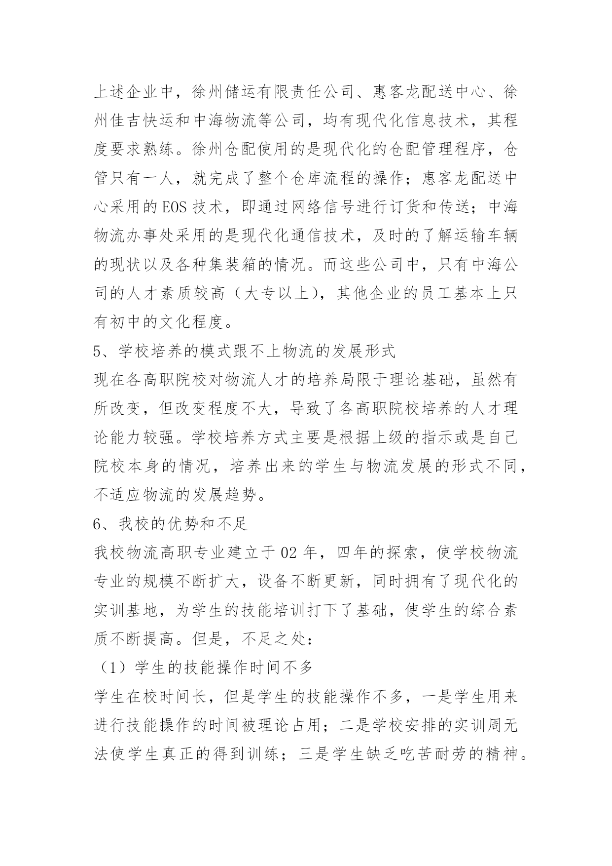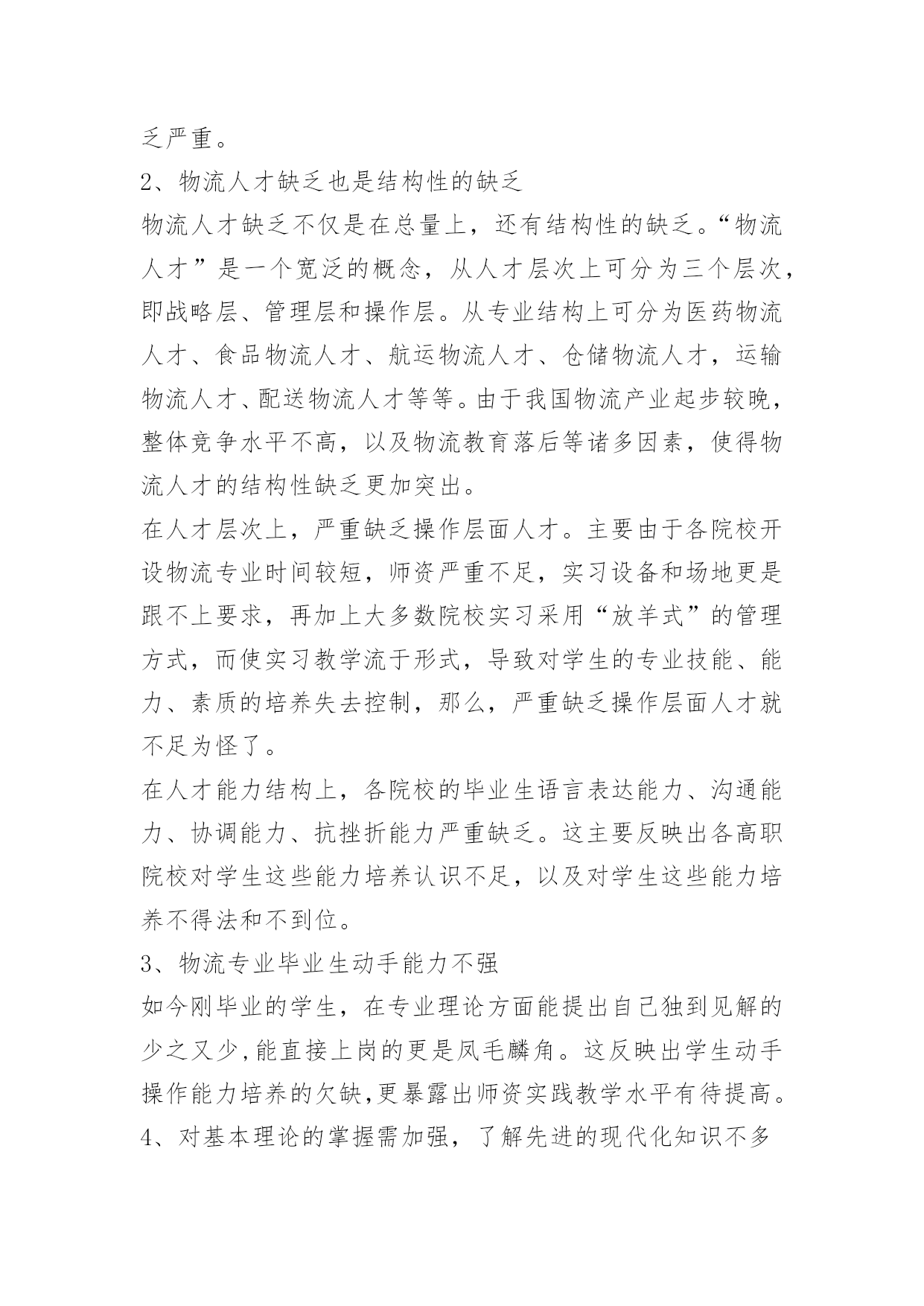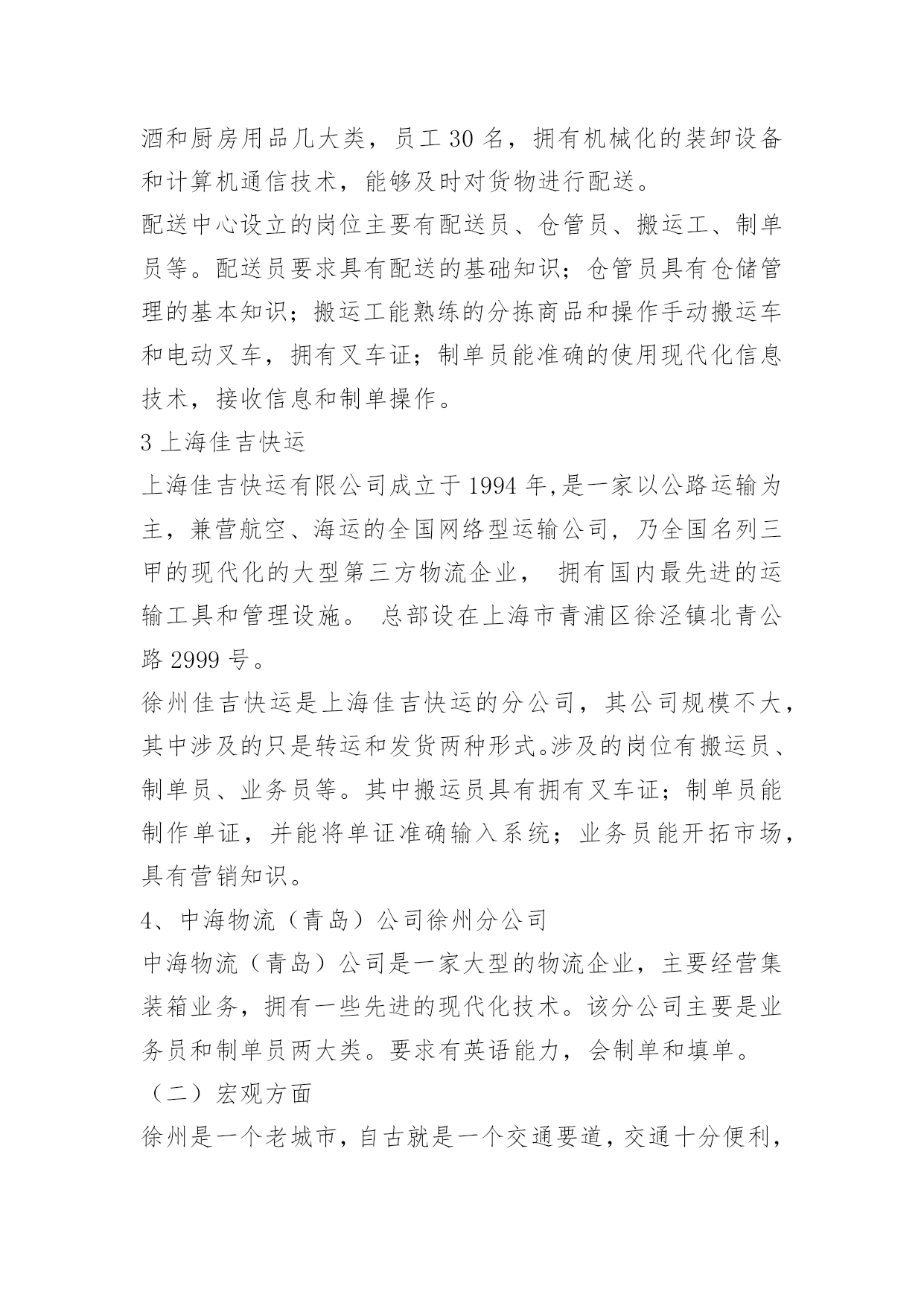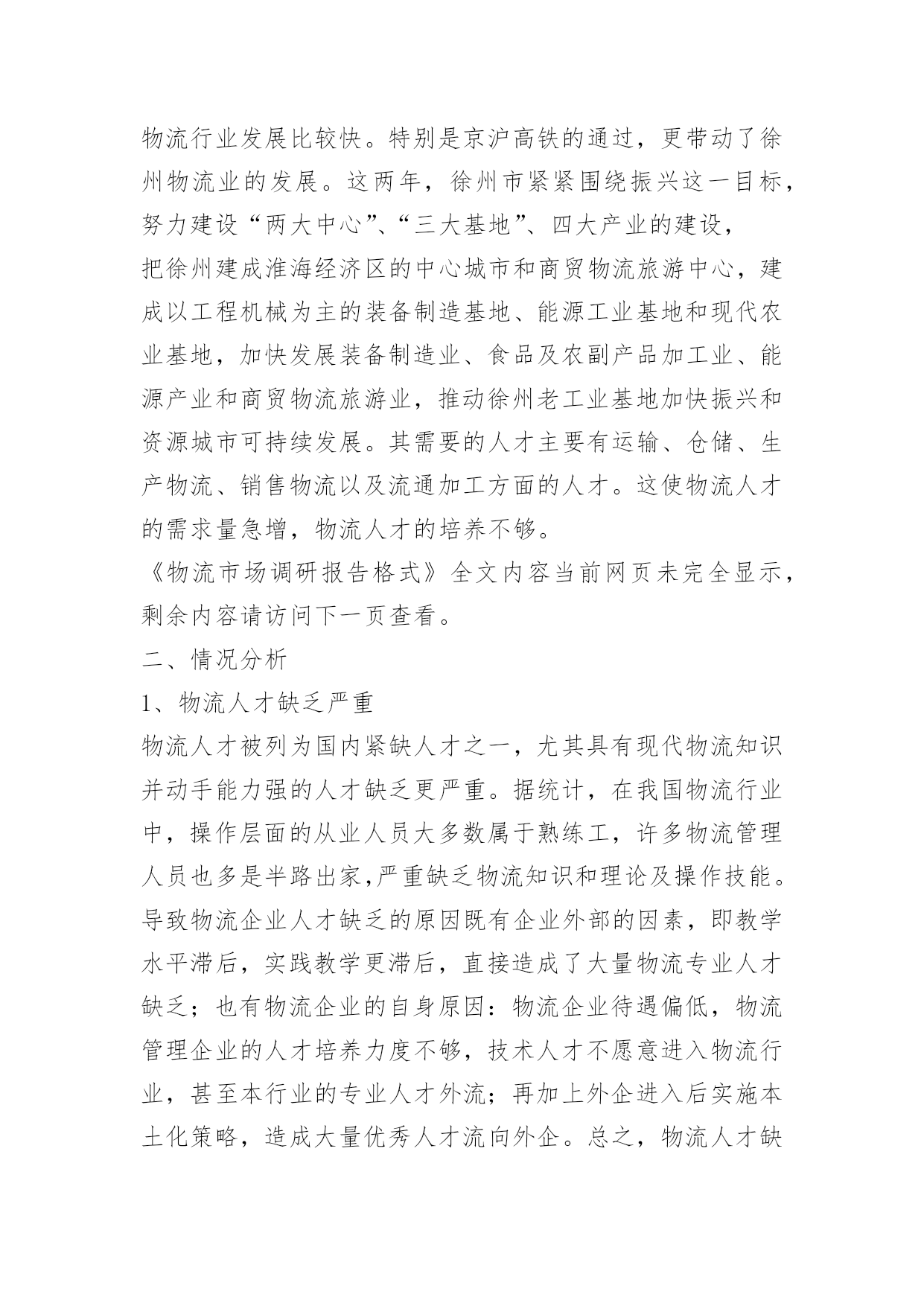 物流市场调研报告格式了解物流行业人才供求状况,物流行业人才需求的状况是院校物流管理专业培养人才的“指南针”,是物流管理专业开发哪些课程和怎样组织教学的重要依据。人才需要具备哪些专业技能、能力、素质,为物流管理专业课程的改革提供信息支持。从2017年12月起,我校物流专业张广敬、潘洪建等老师先后走访了香山物流园、惠克隆配送中心、佳吉快运、中海物流等物流公司,对其物流岗位涉及的人才需求方面进行调研。一、调研情况(一)微观方面1、徐州储运有限责任公司徐州储运有限责任公司创建于1953年,是专门从事仓储、配送、运输、加工、包装、信息交换、物流流程设计等物流增值服务的专业化第三方物流企业,是中国仓储协会会员单位。公司主营仓储、公路运输、铁路中转运输和物资托运业务,共占地550亩,固定资产1.18亿元人民币,现有职工805名,下属601、602、605三大物流中心,以及铁路中转运输、物资托运、公路汽车运输三家运输单位,还有家电市场、储运宾馆、第二招待所等商业、服务企业。其中,601、602和605三大物流中心共拥有平面仓库10万平方米,能够为客户提供24小时的仓储、装卸、分拣、加工、包装、配送等服务,年货物吞吐量为100万吨;铁路中转运输公司、社会物资托运公司和汽车运输公司拥有二条铁路专用线、1万平方米的中转仓库、30余台货运车辆,全面承接商品发送、到达和中转运输业务,为客户提供铁路、公路、水路等多式联运服务,年货物吞吐能力达45万吨。近年来,公司正依照“以现代科技改造传统产业、努力打造企业核心竞争力”的战略决策,通过战略调整,立足物流主业,走专业化经营之路,努力筹建徐州香山物流园,打造淮海经济区物流航母,并以此为龙头整合徐州现有社会物流资源,力争实现物流手段现代化。徐州储运有限责任公司与与海尔、移动公司合作,承担了仓储这项业务,同时又是棉花储备中心。徐州储运徐州储运有限责任公司涉及的物流岗位有搬运员、仓管员、调度员、业务员、制单员和管理员等。其中搬运员能熟练的操作搬运机械,拥有叉车操作证,并能对货物进行准确放置,能吃苦耐劳;仓管员要求能熟悉仓库管理原则,掌握仓库管理技能,并能使用现代化的信息技术;调度员能合理的安排车辆进行调度,并合理规范货物进场位置;制单员能熟练的使用现代化技术,掌握制单的原则;业务员应具有市场营销的知识,能开拓市场;管理员需要有相关的物流管理知识,能对整个物流活动进行管理等。2、徐州市惠客隆配送中心徐州市惠客隆配送中心位于中山北路延长段,是一个交通便利的地方。该中心拥有货物几百种,分别包含食品、饮料、酒和厨房用品几大类,员工30名,拥有机械化的装卸设备和计算机通信技术,能够及时对货物进行配送。配送中心设立的岗位主要有配送员、仓管员、搬运工、制单员等。配送员要求具有配送的基础知识;仓管员具有仓储管理的基本知识;搬运工能熟练的分拣商品和操作手动搬运车和电动叉车,拥有叉车证;制单员能准确的使用现代化信息技术,接收信息和制单操作。3上海佳吉快运上海佳吉快运有限公司成立于1994年,是一家以公路运输为主,兼营航空、海运的全国网络型运输公司,乃全国名列三甲的现代化的大型第三方物流企业,拥有国内最先进的运输工具和管理设施。总部设在上海市青浦区徐泾镇北青公路2999号。徐州佳吉快运是上海佳吉快运的分公司,其公司规模不大,其中涉及的只是转运和发货两种形式。涉及的岗位有搬运员、制单员、业务员等。其中搬运员具有拥有叉车证;制单员能制作单证,并能将单证准确输入系统;业务员能开拓市场,具有营销知识。4、中海物流(青岛)公司徐州分公司中海物流(青岛)公司是一家大型的物流企业,主要经营集装箱业务,拥有一些先进的现代化技术。该分公司主要是业务员和制单员两大类。要求有英语能力,会制单和填单。(二)宏观方面徐州是一个老城市,自古就是一个交通要道,交通十分便利,物流行业发展比较快。特别是京沪高铁的通过,更带动了徐州物流业的发展。这两年,徐州市紧紧围绕振兴这一目标,努力建设“两大中心”、“三大基地”、四大产业的建设,把徐州建成淮海经济区的中心城市和商贸物流旅游中心,建成以工程机械为主的装备制造基地、能源工业基地和现代农业基地,加快发展装备制造业、食品及农副产品加工业、能源产业和商贸物流旅游业,推动徐州老工业基地加快振兴和资源城市可持续发展。其需要的人才主要有运输、仓储、生产物流、销售物流以及流通加工方面的人才。这使物流人才的需求量急增,物流人才的培养不够。《物流市场调研报告格式》全文内容当前网页未完全显示,剩余内容请访问下一页查看。二、情况分析1、物流人才缺乏严重物流人才被列为国内紧缺人才之一,尤其具有现代物流知识并动手能力强的人才缺乏更严重。据统计,在我国物流行业中,操作层面的从业人员大多数属于熟练工,许多物流管理人员也多是半路出家,严重缺乏物流知识