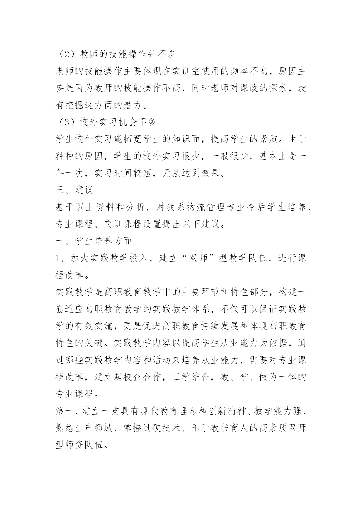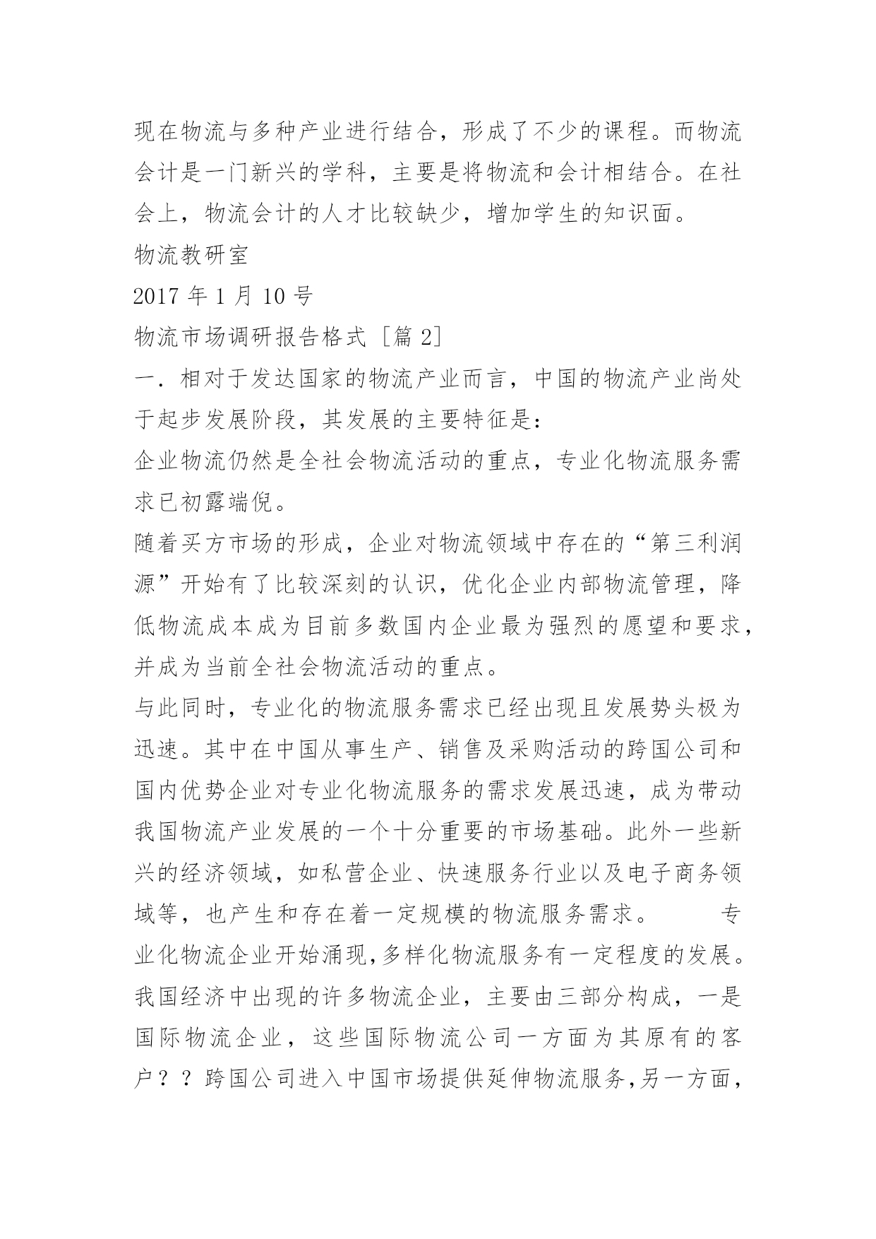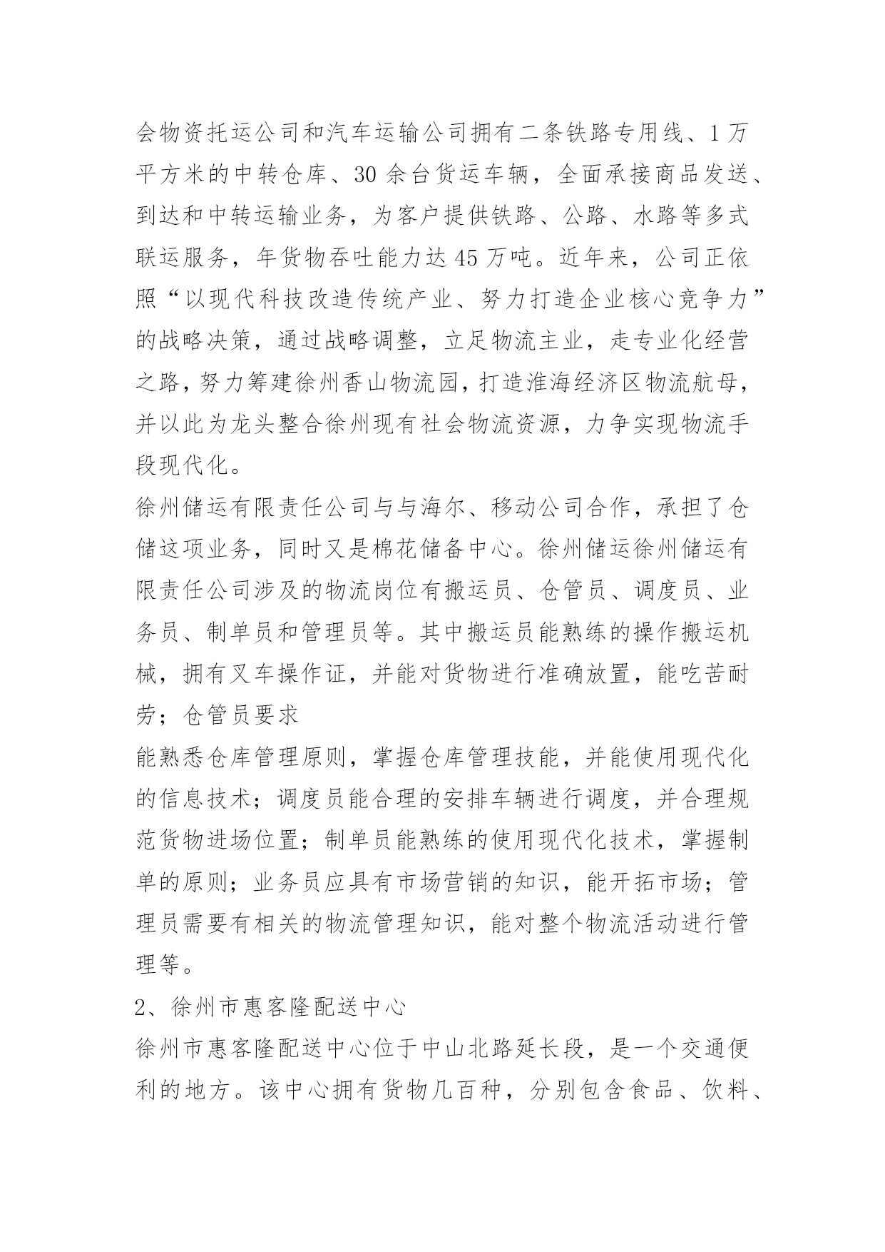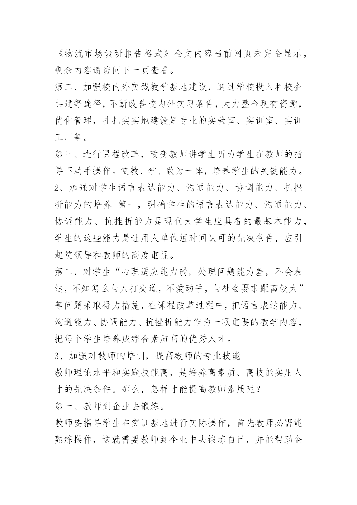 物流市场调研报告格式了解物流行业人才供求状况,物流行业人才需求的状况是院校物流管理专业培养人才的“指南针”,是物流管理专业开发哪些课程和怎样组织教学的重要依据。人才需要具备哪些专业技能、能力、素质,为物流管理专业课程的改革提供信息支持。从2017年12月起,我校物流专业张广敬、潘洪建等老师先后走访了香山物流园、惠克隆配送中心、佳吉快运、中海物流等物流公司,对其物流岗位涉及的人才需求方面进行调研。一、调研情况(一)微观方面1、徐州储运有限责任公司徐州储运有限责任公司创建于1953年,是专门从事仓储、配送、运输、加工、包装、信息交换、物流流程设计等物流增值服务的专业化第三方物流企业,是中国仓储协会会员单位。公司主营仓储、公路运输、铁路中转运输和物资托运业务,共占地550亩,固定资产1.18亿元人民币,现有职工805名,下属601、602、605三大物流中心,以及铁路中转运输、物资托运、公路汽车运输三家运输单位,还有家电市场、储运宾馆、第二招待所等商业、服务企业。其中,601、602和605三大物流中心共拥有平面仓库10万平方米,能够为客户提供24小时的仓储、装卸、分拣、加工、包装、配送等服务,年货物吞吐量为100万吨;铁路中转运输公司、社会物资托运公司和汽车运输公司拥有二条铁路专用线、1万平方米的中转仓库、30余台货运车辆,全面承接商品发送、到达和中转运输业务,为客户提供铁路、公路、水路等多式联运服务,年货物吞吐能力达45万吨。近年来,公司正依照“以现代科技改造传统产业、努力打造企业核心竞争力”的战略决策,通过战略调整,立足物流主业,走专业化经营之路,努力筹建徐州香山物流园,打造淮海经济区物流航母,并以此为龙头整合徐州现有社会物流资源,力争实现物流手段现代化。徐州储运有限责任公司与与海尔、移动公司合作,承担了仓储这项业务,同时又是棉花储备中心。徐州储运徐州储运有限责任公司涉及的物流岗位有搬运员、仓管员、调度员、业务员、制单员和管理员等。其中搬运员能熟练的操作搬运机械,拥有叉车操作证,并能对货物进行准确放置,能吃苦耐劳;仓管员要求能熟悉仓库管理原则,掌握仓库管理技能,并能使用现代化的信息技术;调度员能合理的安排车辆进行调度,并合理规范货物进场位置;制单员能熟练的使用现代化技术,掌握制单的原则;业务员应具有市场营销的知识,能开拓市场;管理员需要有相关的物流管理知识,能对整个物流活动进行管理等。2、徐州市惠客隆配送中心徐州市惠客隆配送中心位于中山北路延长段,是一个交通便利的地方。该中心拥有货物几百种,分别包含食品、饮料、酒和厨房用品几大类,员工30名,拥有机械化的装卸设备和计算机通信技术,能够及时对货物进行配送。配送中心设立的岗位主要有配送员、仓管员、搬运工、制单员等。配送员要求具有配送的基础知识;仓管员具有仓储管理的基本知识;搬运工能熟练的分拣商品和操作手动搬运车和电动叉车,拥有叉车证;制单员能准确的使用现代化信息技术,接收信息和制单操作。3上海佳吉快运上海佳吉快运有限公司成立于1994年,是一家以公路运输为主,兼营航空、海运的全国网络型运输公司,乃全国名列三甲的现代化的大型第三方物流企业,拥有国内最先进的运输工具和管理设施。总部设在上海市青浦区徐泾镇北青公路2999号。徐州佳吉快运是上海佳吉快运的分公司,其公司规模不大,其中涉及的只是转运和发货两种形式。涉及的岗位有搬运员、制单员、业务员等。其中搬运员具有拥有叉车证;制单员能制作单证,并能将单证准确输入系统;业务员能开拓市场,具有营销知识。4、中海物流(青岛)公司徐州分公司中海物流(青岛)公司是一家大型的物流企业,主要经营集装箱业务,拥有一些先进的现代化技术。该分公司主要是业务员和制单员两大类。要求有英语能力,会制单和填单。(二)宏观方面徐州是一个老城市,自古就是一个交通要道,交通十分便利,物流行业发展比较快。特别是京沪高铁的通过,更带动了徐州物流业的发展。这两年,徐州市紧紧围绕振兴这一目标,努力建设“两大中心”、“三大基地”、四大产业的建设,把徐州建成淮海经济区的中心城市和商贸物流旅游中心,建成以工程机械为主的装备制造基地、能源工业基地和现代农业基地,加快发展装备制造业、食品及农副产品加工业、能源产业和商贸物流旅游业,推动徐州老工业基地加快振兴和资源城市可持续发展。其需要的人才主要有运输、仓储、生产物流、销售物流以及流通加工方面的人才。这使物流人才的需求量急增,物流人才的培养不够。《物流市场调研报告格式》全文内容当前网页未完全显示,剩余内容请访问下一页查看。二、情况分析1、物流人才缺乏严重物流人才被列为国内紧缺人才之一,尤其具有现代物流知识并动手能力强的人才缺乏更严重。据统计,在我国物流行业中,操作层面的从业人员大多数属于熟练工,许多物流管理人员也多是半路出家,严重缺乏物流知识