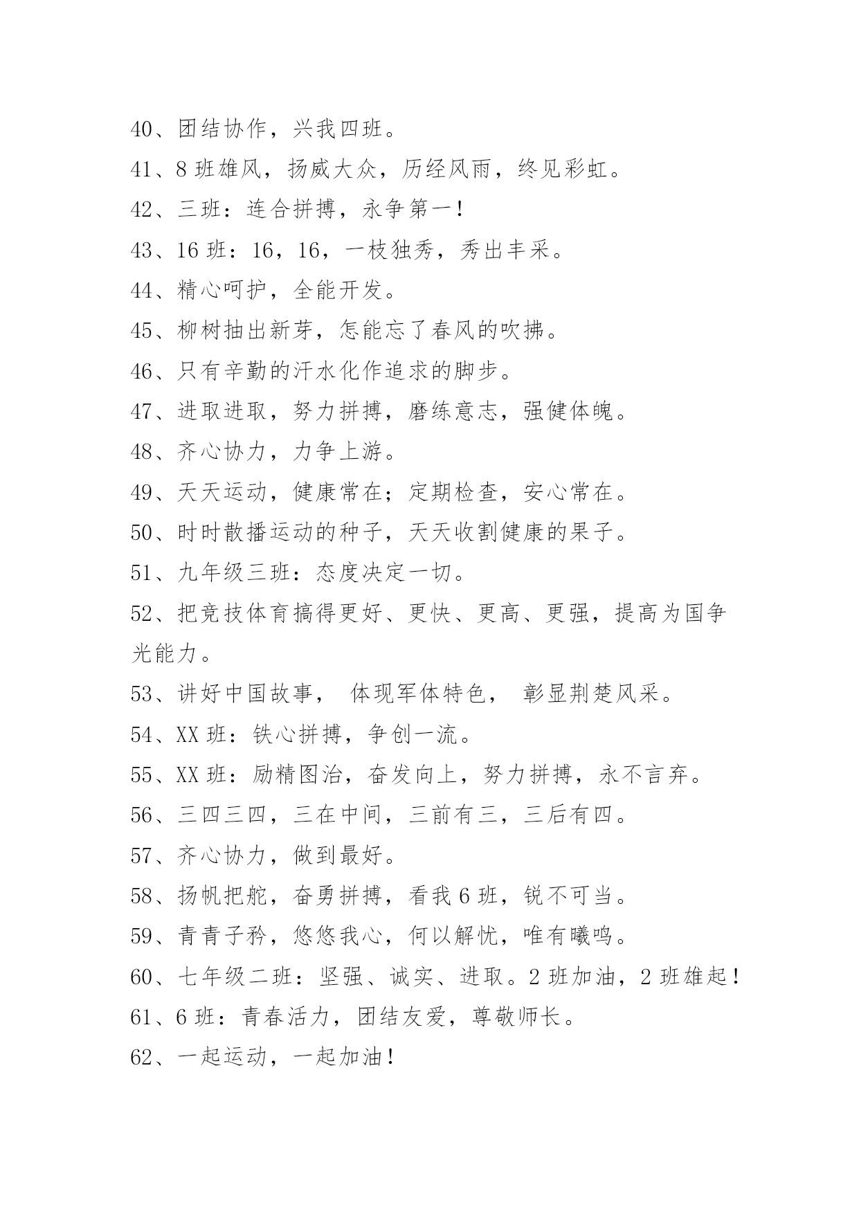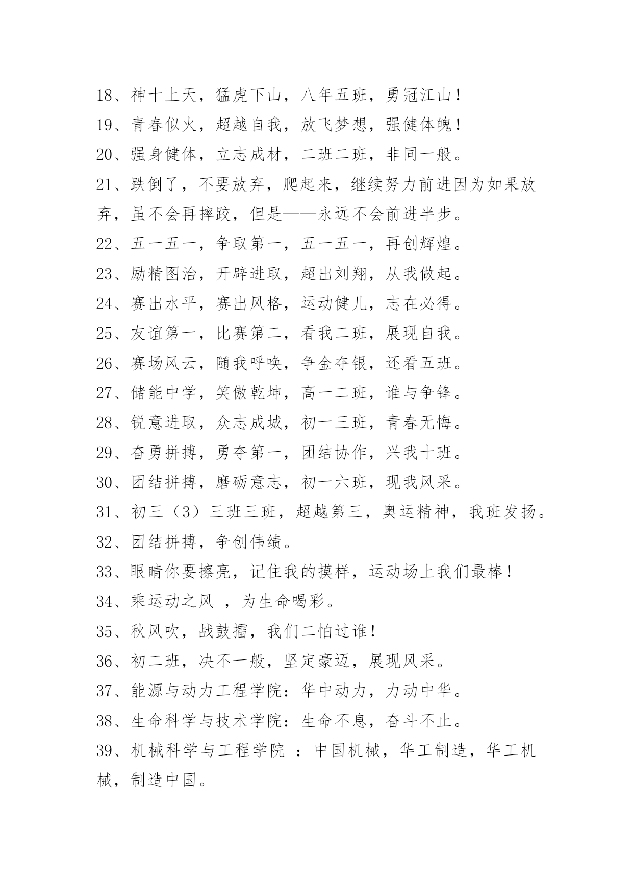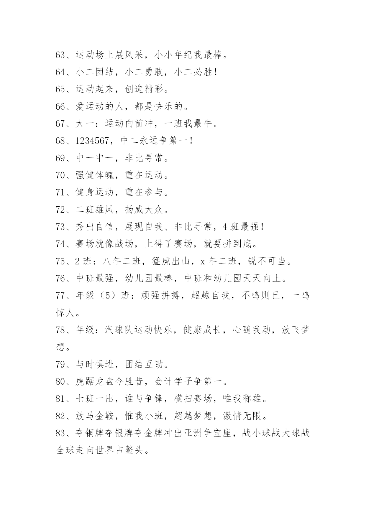 励志的运动会口号励志的运动会口号集锦88句意气风发斗志昂扬高二六班展翅飞翔。下面是小编为大家准备的励志的运动会口号88句,欢迎阅读与收藏。1、4班超越梦想,激、情无限!奥运精神、永驻我心。2、看我8班,锐不可当初一(8)班,猛虎出山,锐不可当。3、打出风度,赢得精彩!4、我爱运动,快乐成长;我爱运动,我更健康。5、中二,中二,用力拼搏,人生几何。6、我运动,我快乐我健康我做主。7、大一大一,处处争先!看我大一,豪气冲天!8、大二班,不一般!无人能及争第一!9、强强强强,宝宝班是最强,超越刘翔,不准投降。10、脱吾帽,向君笑,饮君酒,为君饮。11、飞跃梦想,热情奔放。12、心系八班,合作无间,力斩群敌,舍我其谁。13、十二分的努力,十二班的胜利。14、虎踞龙盘今胜昔,高一十四争第一。15、高二二班,绝不一般;犯其至难,图其至远。16、坚定,执着,耐力与希望,在延伸的白色跑道中点点凝聚。17、浪潮风行,气势如虹,浪潮风行,众志成城。18、神十上天,猛虎下山,八年五班,勇冠江山!19、青春似火,超越自我,放飞梦想,强健体魄!20、强身健体,立志成材,二班二班,非同一般。21、跌倒了,不要放弃,爬起来,继续努力前进因为如果放弃,虽不会再摔跤,但是——永远不会前进半步。22、五一五一,争取第一,五一五一,再创辉煌。23、励精图治,开辟进取,超出刘翔,从我做起。24、赛出水平,赛出风格,运动健儿,志在必得。25、友谊第一,比赛第二,看我二班,展现自我。26、赛场风云,随我呼唤,争金夺银,还看五班。27、储能中学,笑傲乾坤,高一二班,谁与争锋。28、锐意进取,众志成城,初一三班,青春无悔。29、奋勇拼搏,勇夺第一,团结协作,兴我十班。30、团结拼搏,磨砺意志,初一六班,现我风采。31、初三(3)三班三班,超越第三,奥运精神,我班发扬。32、团结拼搏,争创伟绩。33、眼睛你要擦亮,记住我的摸样,运动场上我们最棒!34、乘运动之风,为生命喝彩。35、秋风吹,战鼓擂,我们二怕过谁!36、初二班,决不一般,坚定豪迈,展现风采。37、能源与动力工程学院:华中动力,力动中华。38、生命科学与技术学院:生命不息,奋斗不止。39、机械科学与工程学院:中国机械,华工制造,华工机械,制造中国。40、团结协作,兴我四班。41、8班雄风,扬威大众,历经风雨,终见彩虹。42、三班:连合拼搏,永争第一!43、16班:16,16,一枝独秀,秀出丰采。44、精心呵护,全能开发。45、柳树抽出新芽,怎能忘了春风的吹拂。46、只有辛勤的汗水化作追求的脚步。47、进取进取,努力拼搏,磨练意志,强健体魄。48、齐心协力,力争上游。49、天天运动,健康常在;定期检查,安心常在。50、时时散播运动的种子,天天收割健康的果子。51、九年级三班:态度决定一切。52、把竞技体育搞得更好、更快、更高、更强,提高为国争光能力。53、讲好中国故事,体现军体特色,彰显荆楚风采。54、XX班:铁心拼搏,争创一流。55、XX班:励精图治,奋发向上,努力拼搏,永不言弃。56、三四三四,三在中间,三前有三,三后有四。57、齐心协力,做到最好。58、扬帆把舵,奋勇拼搏,看我6班,锐不可当。59、青青子矜,悠悠我心,何以解忧,唯有曦鸣。60、七年级二班:坚强、诚实、进取。2班加油,2班雄起!61、6班:青春活力,团结友爱,尊敬师长。62、一起运动,一起加油!63、运动场上展风采,小小年纪我最棒。64、小二团结,小二勇敢,小二必胜!65、运动起来,创造精彩。66、爱运动的人,都是快乐的。67、大一:运动向前冲,一班我最牛。68、1234567,中二永远争第一!69、中一中一,非比寻常。70、强健体魄,重在运动。71、健身运动,重在参与。72、二班雄风,扬威大众。73、秀出自信,展现自我、非比寻常,4班最强!74、赛场就像战场,上得了赛场,就要拼到底。75、2班:八年二班,猛虎出山,x年二班,锐不可当。76、中班最强,幼儿园最棒,中班和幼儿园天天向上。77、年级(5)班:顽强拼搏,超越自我,不鸣则已,一鸣惊人。78、年级:汽球队运动快乐,健康成长,心随我动,放飞梦想。79、与时惧进,团结互助。80、虎踞龙盘今胜昔,会计学子争第一。81、七班一出,谁与争锋,横扫赛场,唯我称雄。82、放马金鞍,惟我小班,超越梦想,激情无限。83、夺铜牌夺银牌夺金牌冲出亚洲争宝座,战小球战大球战全球走向世界占鳌头。84、振兴中华,赛出水平,振兴中华,扬我班威。85、一六一六,拼搏奋斗,九中校园,一枝独秀。86、大手拉小手,健康好未来,宝宝班加油。87、带给运动员的是信心,是勇气。88、因为你只求付出,不求回报的个性。