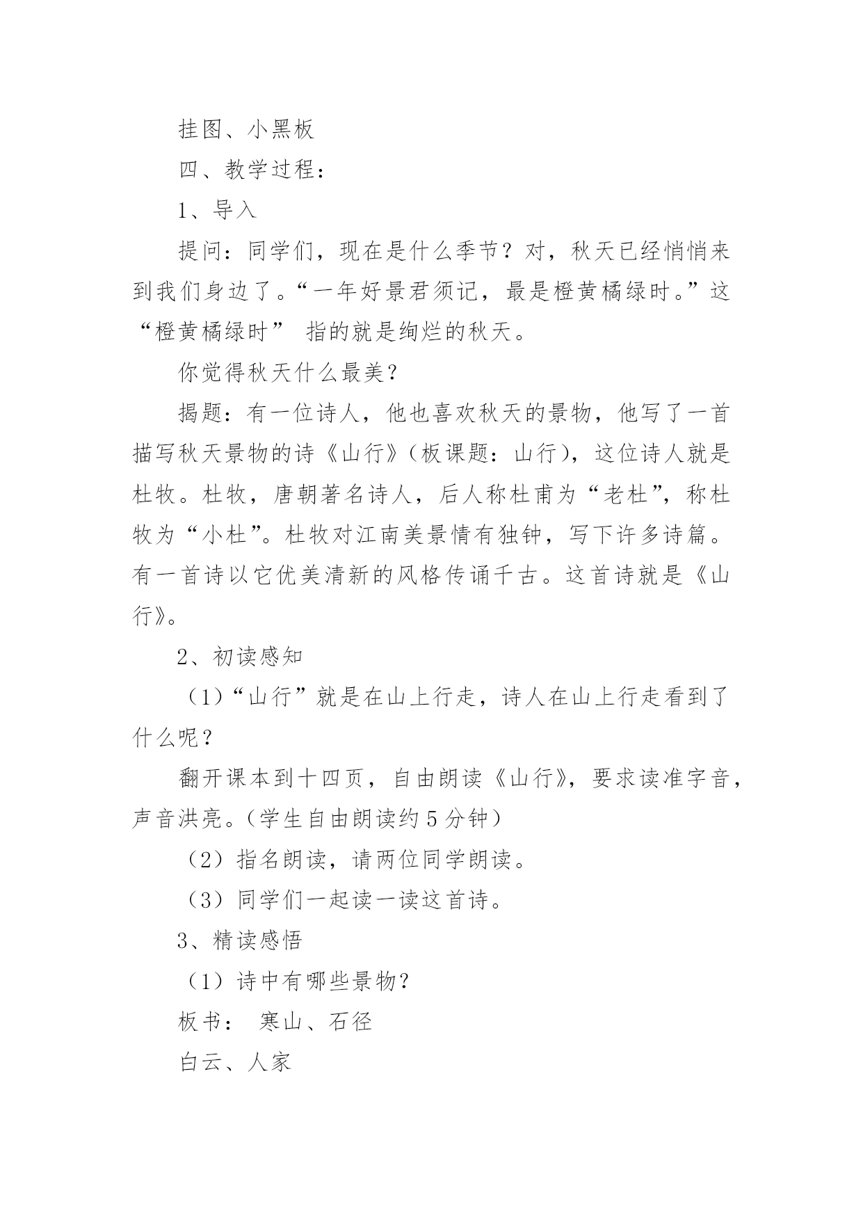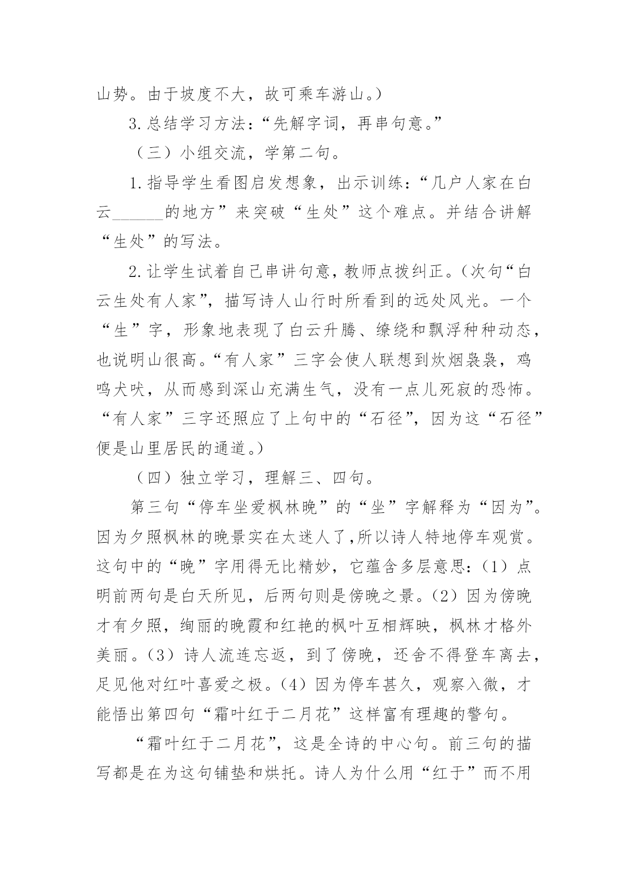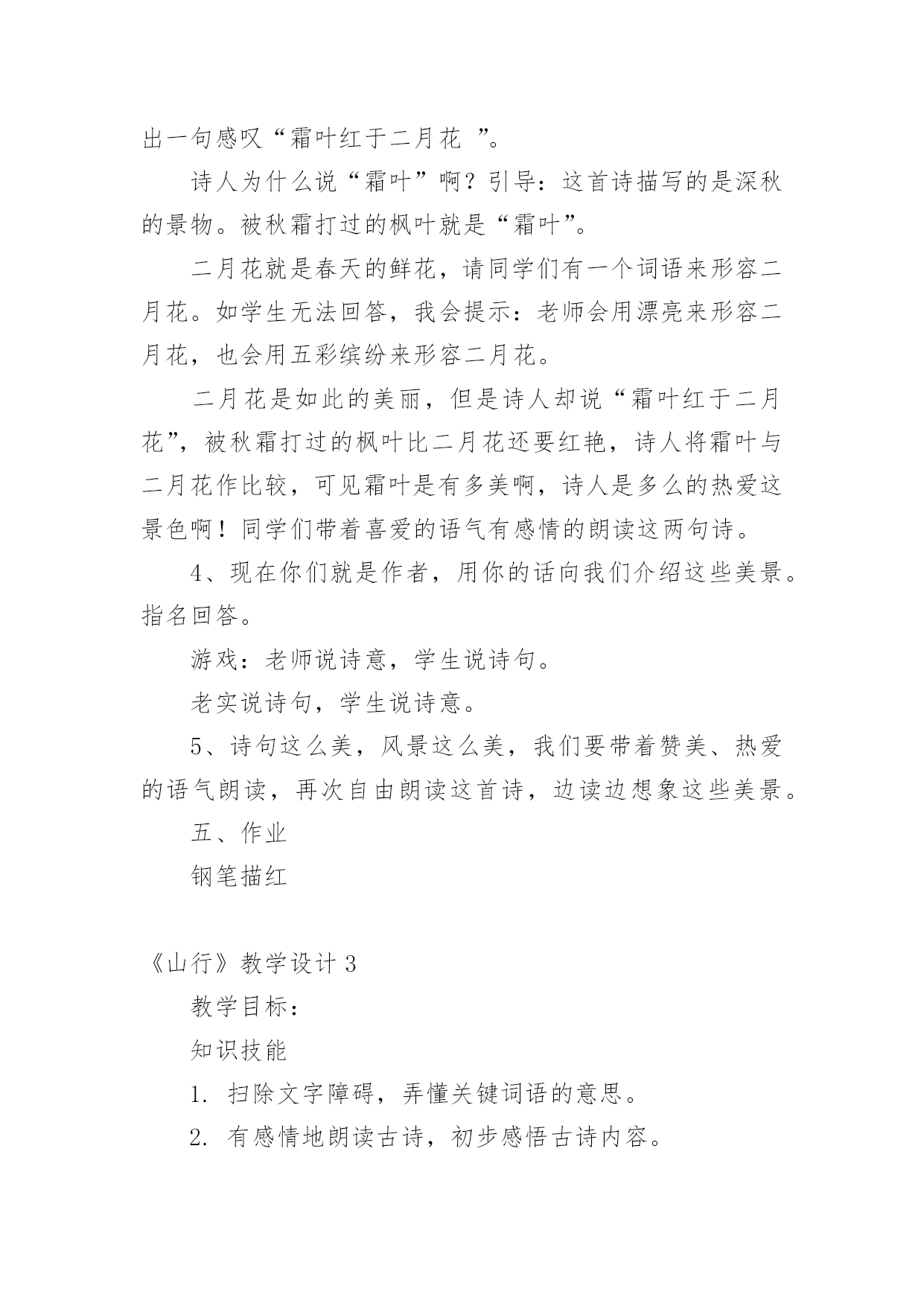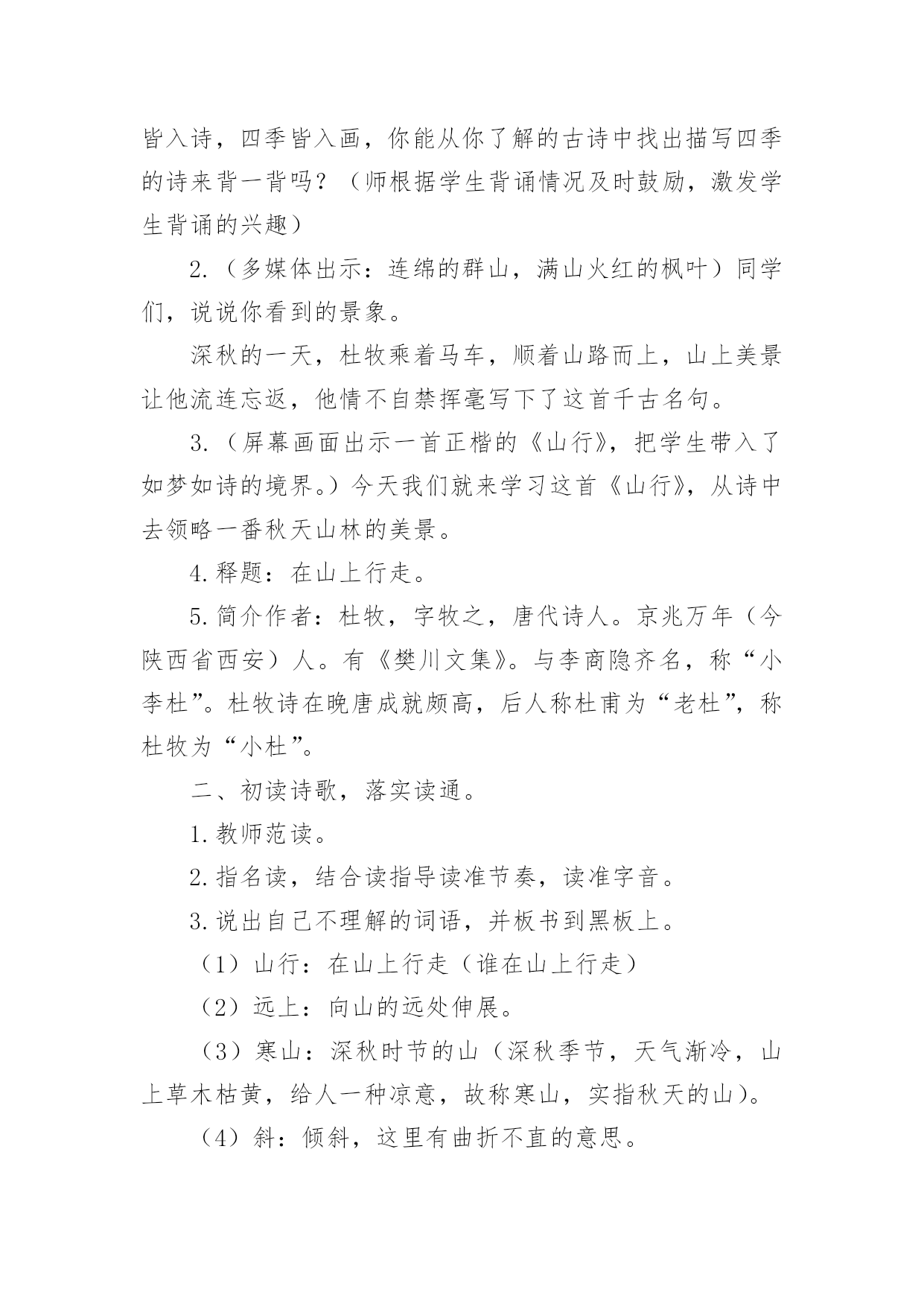 《山行》教学设计【必备】《山行》教学设计15篇作为一位无私奉献的人民教师,通常需要用到教学设计来辅助教学,教学设计是根据课程标准的要求和教学对象的特点,将教学诸要素有序安排,确定合适的教学方案的设想和计划。那么教学设计应该怎么写才合适呢?以下是小编帮大家整理的《山行》教学设计,希望能够帮助到大家。《山行》教学设计1【教学设想】唐诗是中国古代文学史上的一颗璀璨的明珠,它的语言精练、意境优美、节奏明快、读起来郎朗上口。本课教学目标的确定牢记一个“实”字,遵循诗教规律,以人为本,关注生命,引领学生一步一趋地进入诗的意境,走进诗人的生活。在教学中通过多种形式组织学生学习,整体读、理解读、想象读、延伸读、布置选择性作业,由浅入深,由表及里,为学生营造一个美读、读美的学习环境,让学生入情入境,充分展开想象,开拓学生的思维空间,激发学生的情感。【教学过程】一、背诵古诗,激发兴趣。1.你喜欢读古诗,背古诗吗?古诗是我们中华民族的文化瑰宝,用最凝练、简洁的语言表达出诗一般的境界。四季皆入诗,四季皆入画,你能从你了解的古诗中找出描写四季的诗来背一背吗?(师根据学生背诵情况及时鼓励,激发学生背诵的兴趣)2.(多媒体出示:连绵的群山,满山火红的枫叶)同学们,说说你看到的景象。深秋的一天,杜牧乘着马车,顺着山路而上,山上美景让他流连忘返,他情不自禁挥毫写下了这首千古名句。3.(屏幕画面出示一首正楷的《山行》,把学生带入了如梦如诗的境界。)今天我们就来学习这首《山行》,从诗中去领略一番秋天山林的美景。4.释题:在山上行走。5.简介作者:杜牧,字牧之,唐代诗人。京兆万年(今陕西省西安)人。有《樊川文集》。与李商隐齐名,称“小李杜”。杜牧诗在晚唐成就颇高,后人称杜甫为“老杜”,称杜牧为“小杜”。二、初读诗歌,落实读通。1.教师范读。2.指名读,结合读指导读准节奏,读准字音。3.说出自己不理解的词语,并板书到黑板上。(1)山行:在山上行走(谁在山上行走)(2)远上:向山的远处伸展。(3)寒山:深秋时节的山(深秋季节,天气渐冷,山上草木枯黄,给人一种凉意,故称寒山,实指秋天的山)。(4)斜:倾斜,这里有曲折不直的意思。(5)“白云生处”与“白云深处”的区别:深:浓厚,浓郁。生:生出,存在。(指有白云缭绕的地方,也说明那地方比较高。)(6)坐:因为。爱:真爱,留恋。(7)霜叶:经霜打过的枫叶。枫林晚:傍晚时候的枫树林。(8)红于:比……更红。——与“红如”区别。4.结合画面,讨论交流疑难字词。三、尝试学习,读诗明意。(一)自主学习,合作探究1.自由朗读,读到郎朗上口为止。2.请生朗读,互相评价。3.四人小组合作,利用文中的注释及词语手册,合作互助,逐字逐句理解诗文。有不理解的地方做上标记或写下来。(二)师生合作,学第一句。1.先运用不同手段突破“远上”“斜”“寒山”这三个难懂词的`意思。(“远上”:用“联系实际,展开想象”法。“斜”:用“简笔画演示”法。“寒山”:用学生“介绍”法。)2.指导学生串讲句意。注意调整说话顺序。(首句“远上寒山石径斜”,由下而上,写一条石头小路蜿蜒曲折地伸向充满秋意的山峦。“寒”字点明深秋季节;“远”字写出山路的绵长;“斜”字照应句首的“远”字,写出了高而缓的山势。由于坡度不大,故可乘车游山。)3.总结学习方法:“先解字词,再串句意。”(三)小组交流,学第二句。1.指导学生看图启发想象,出示训练:“几户人家在白云______的地方”来突破“生处”这个难点。并结合讲解“生处”的写法。2.让学生试着自己串讲句意,教师点拨纠正。(次句“白云生处有人家”,描写诗人山行时所看到的远处风光。一个“生”字,形象地表现了白云升腾、缭绕和飘浮种种动态,也说明山很高。“有人家”三字会使人联想到炊烟袅袅,鸡鸣犬吠,从而感到深山充满生气,没有一点儿死寂的恐怖。“有人家”三字还照应了上句中的“石径”,因为这“石径”便是山里居民的通道。)(四)独立学习,理解三、四句。第三句“停车坐爱枫林晚”的“坐”字解释为“因为”。因为夕照枫林的晚景实在太迷人了,所以诗人特地停车观赏。这句中的“晚”字用得无比精妙,它蕴含多层意思:(1)点明前两句是白天所见,后两句则是傍晚之景。(2)因为傍晚才有夕照,绚丽的晚霞和红艳的枫叶互相辉映,枫林才格外美丽。(3)诗人流连忘返,到了傍晚,还舍不得登车离去,足见他对红叶喜爱之极。(4)因为停车甚久,观察入微,才能悟出第四句“霜叶红于二月花”这样富有理趣的警句。“霜叶红于二月花”,这是全诗的中心句。前三句的描写都是在为这句铺垫和烘托。诗人为什么用“红于”而不用“红如”?因为“红如”不过和春花一样,无非是装点自然美景而已;而“红于”则是春花所不能比拟的,不仅仅是色彩更鲜艳,而且更能耐寒,经得起风霜考验。(五)感情朗读,学会背诵。1.想象着诗歌