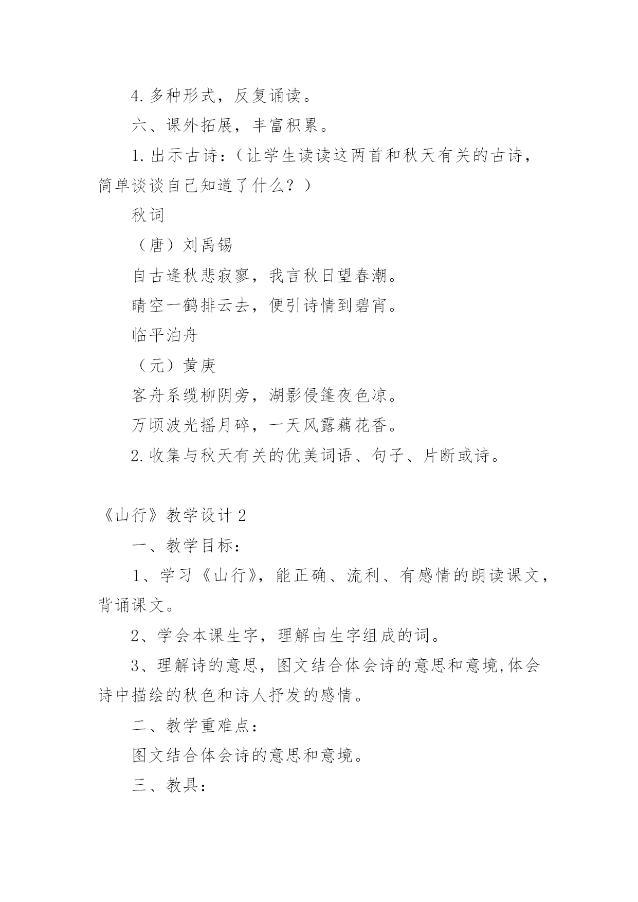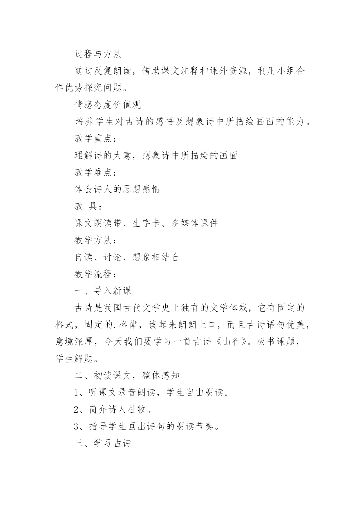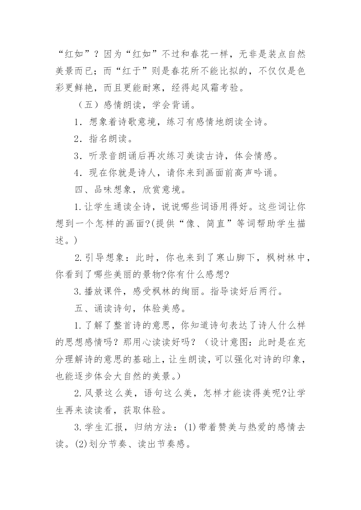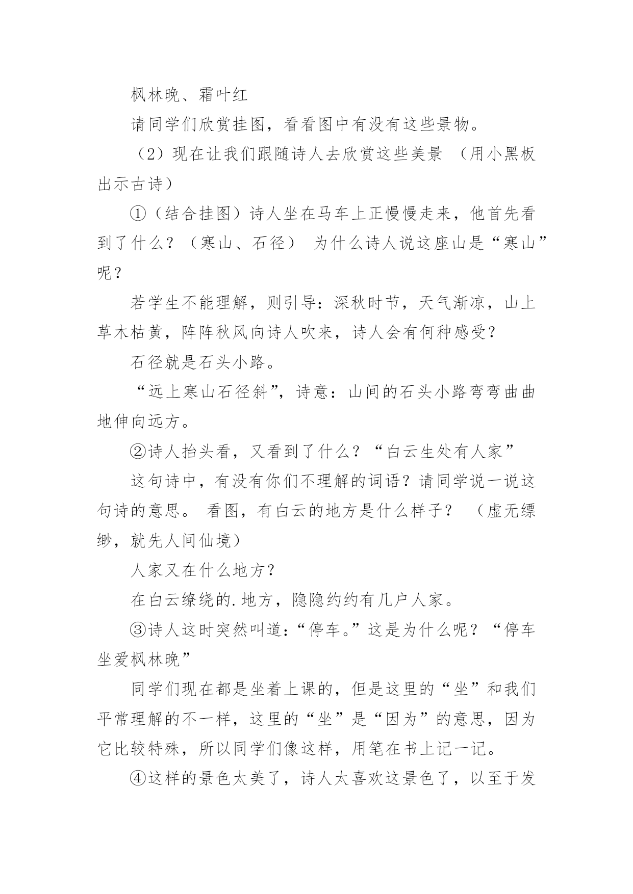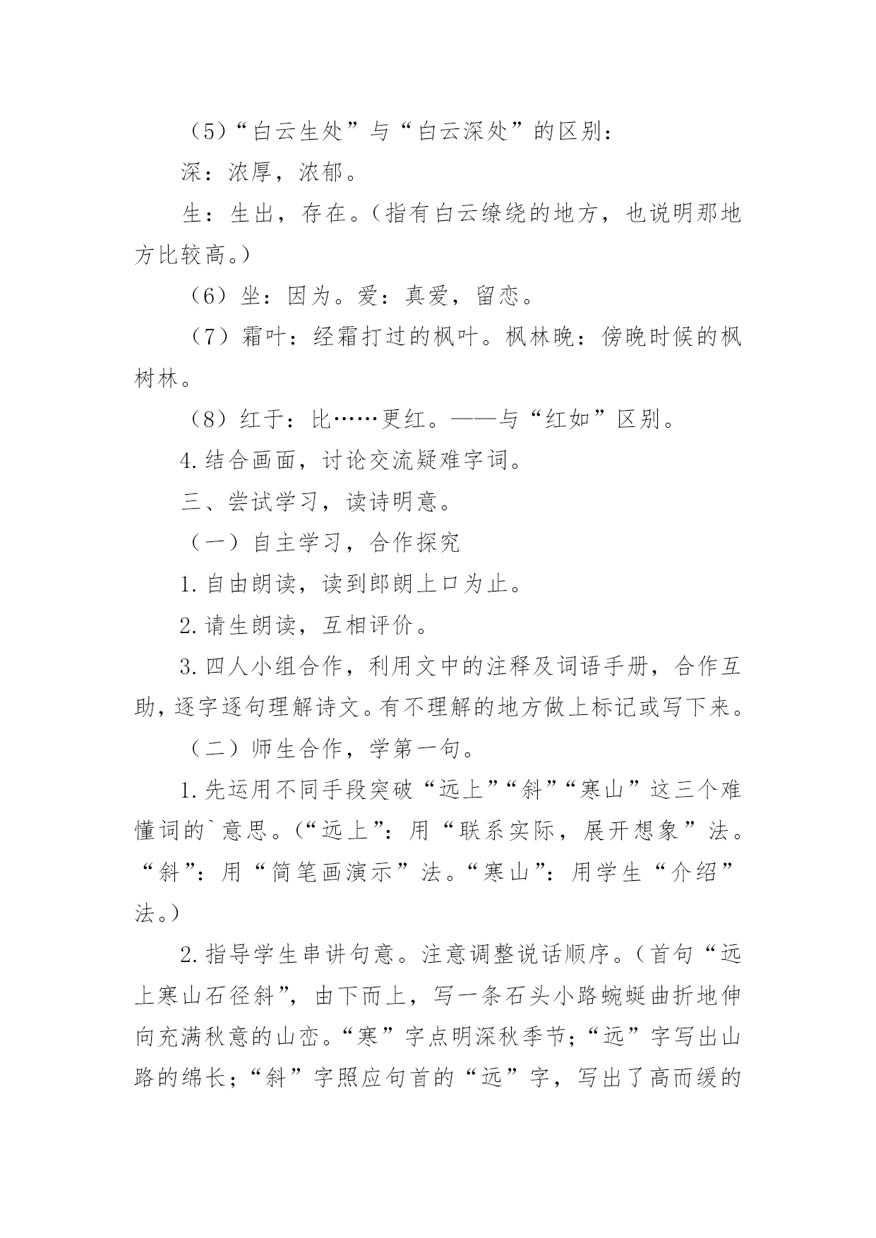 《山行》教学设计【必备】《山行》教学设计15篇作为一位无私奉献的人民教师,通常需要用到教学设计来辅助教学,教学设计是根据课程标准的要求和教学对象的特点,将教学诸要素有序安排,确定合适的教学方案的设想和计划。那么教学设计应该怎么写才合适呢?以下是小编帮大家整理的《山行》教学设计,希望能够帮助到大家。《山行》教学设计1【教学设想】唐诗是中国古代文学史上的一颗璀璨的明珠,它的语言精练、意境优美、节奏明快、读起来郎朗上口。本课教学目标的确定牢记一个“实”字,遵循诗教规律,以人为本,关注生命,引领学生一步一趋地进入诗的意境,走进诗人的生活。在教学中通过多种形式组织学生学习,整体读、理解读、想象读、延伸读、布置选择性作业,由浅入深,由表及里,为学生营造一个美读、读美的学习环境,让学生入情入境,充分展开想象,开拓学生的思维空间,激发学生的情感。【教学过程】一、背诵古诗,激发兴趣。1.你喜欢读古诗,背古诗吗?古诗是我们中华民族的文化瑰宝,用最凝练、简洁的语言表达出诗一般的境界。四季皆入诗,四季皆入画,你能从你了解的古诗中找出描写四季的诗来背一背吗?(师根据学生背诵情况及时鼓励,激发学生背诵的兴趣)2.(多媒体出示:连绵的群山,满山火红的枫叶)同学们,说说你看到的景象。深秋的一天,杜牧乘着马车,顺着山路而上,山上美景让他流连忘返,他情不自禁挥毫写下了这首千古名句。3.(屏幕画面出示一首正楷的《山行》,把学生带入了如梦如诗的境界。)今天我们就来学习这首《山行》,从诗中去领略一番秋天山林的美景。4.释题:在山上行走。5.简介作者:杜牧,字牧之,唐代诗人。京兆万年(今陕西省西安)人。有《樊川文集》。与李商隐齐名,称“小李杜”。杜牧诗在晚唐成就颇高,后人称杜甫为“老杜”,称杜牧为“小杜”。二、初读诗歌,落实读通。1.教师范读。2.指名读,结合读指导读准节奏,读准字音。3.说出自己不理解的词语,并板书到黑板上。(1)山行:在山上行走(谁在山上行走)(2)远上:向山的远处伸展。(3)寒山:深秋时节的山(深秋季节,天气渐冷,山上草木枯黄,给人一种凉意,故称寒山,实指秋天的山)。(4)斜:倾斜,这里有曲折不直的意思。(5)“白云生处”与“白云深处”的区别:深:浓厚,浓郁。生:生出,存在。(指有白云缭绕的地方,也说明那地方比较高。)(6)坐:因为。爱:真爱,留恋。(7)霜叶:经霜打过的枫叶。枫林晚:傍晚时候的枫树林。(8)红于:比……更红。——与“红如”区别。4.结合画面,讨论交流疑难字词。三、尝试学习,读诗明意。(一)自主学习,合作探究1.自由朗读,读到郎朗上口为止。2.请生朗读,互相评价。3.四人小组合作,利用文中的注释及词语手册,合作互助,逐字逐句理解诗文。有不理解的地方做上标记或写下来。(二)师生合作,学第一句。1.先运用不同手段突破“远上”“斜”“寒山”这三个难懂词的`意思。(“远上”:用“联系实际,展开想象”法。“斜”:用“简笔画演示”法。“寒山”:用学生“介绍”法。)2.指导学生串讲句意。注意调整说话顺序。(首句“远上寒山石径斜”,由下而上,写一条石头小路蜿蜒曲折地伸向充满秋意的山峦。“寒”字点明深秋季节;“远”字写出山路的绵长;“斜”字照应句首的“远”字,写出了高而缓的山势。由于坡度不大,故可乘车游山。)3.总结学习方法:“先解字词,再串句意。”(三)小组交流,学第二句。1.指导学生看图启发想象,出示训练:“几户人家在白云______的地方”来突破“生处”这个难点。并结合讲解“生处”的写法。2.让学生试着自己串讲句意,教师点拨纠正。(次句“白云生处有人家”,描写诗人山行时所看到的远处风光。一个“生”字,形象地表现了白云升腾、缭绕和飘浮种种动态,也说明山很高。“有人家”三字会使人联想到炊烟袅袅,鸡鸣犬吠,从而感到深山充满生气,没有一点儿死寂的恐怖。“有人家”三字还照应了上句中的“石径”,因为这“石径”便是山里居民的通道。)(四)独立学习,理解三、四句。第三句“停车坐爱枫林晚”的“坐”字解释为“因为”。因为夕照枫林的晚景实在太迷人了,所以诗人特地停车观赏。这句中的“晚”字用得无比精妙,它蕴含多层意思:(1)点明前两句是白天所见,后两句则是傍晚之景。(2)因为傍晚才有夕照,绚丽的晚霞和红艳的枫叶互相辉映,枫林才格外美丽。(3)诗人流连忘返,到了傍晚,还舍不得登车离去,足见他对红叶喜爱之极。(4)因为停车甚久,观察入微,才能悟出第四句“霜叶红于二月花”这样富有理趣的警句。“霜叶红于二月花”,这是全诗的中心句。前三句的描写都是在为这句铺垫和烘托。诗人为什么用“红于”而不用“红如”?因为“红如”不过和春花一样,无非是装点自然美景而已;而“红于”则是春花所不能比拟的,不仅仅是色彩更鲜艳,而且更能耐寒,经得起风霜考验。(五)感情朗读,学会背诵。1.想象着诗歌