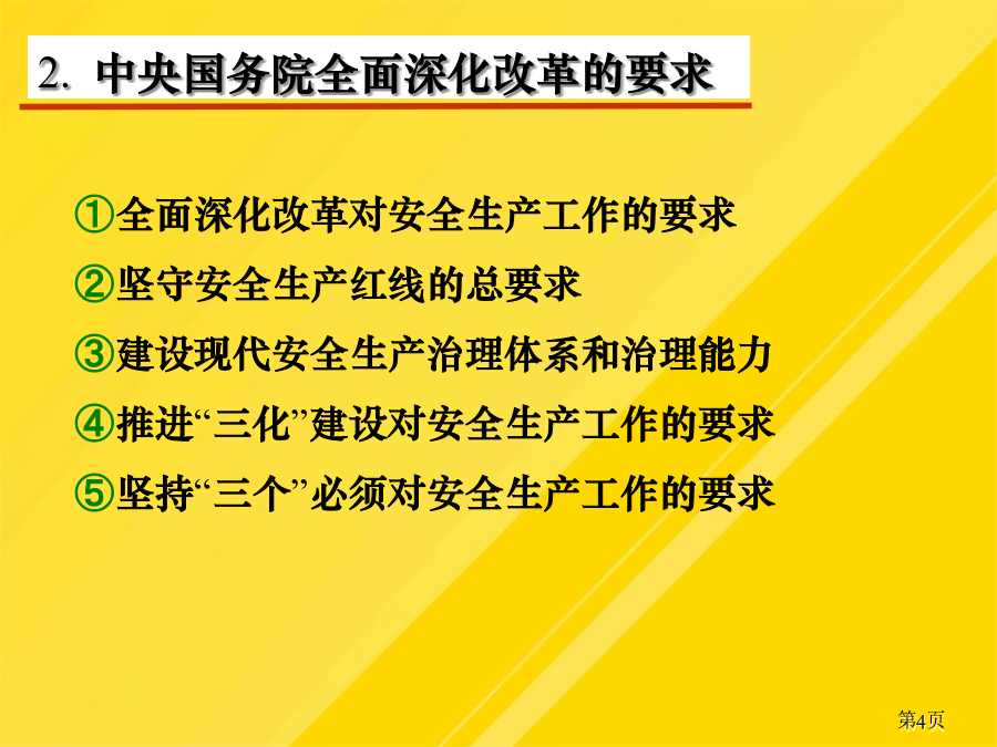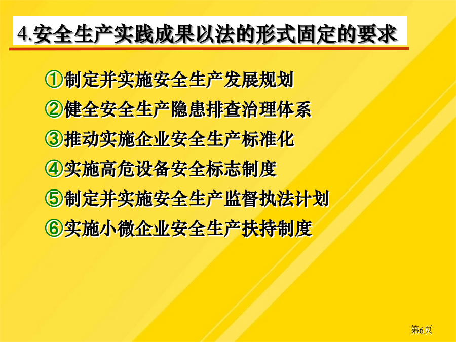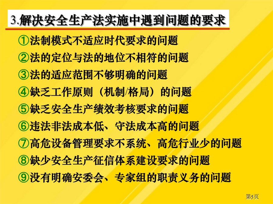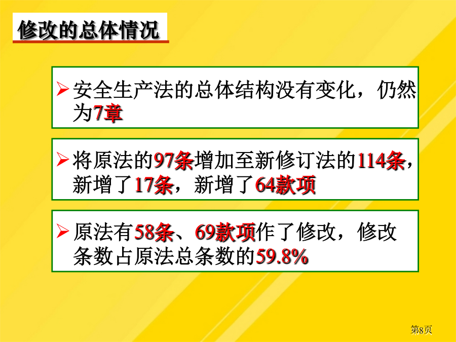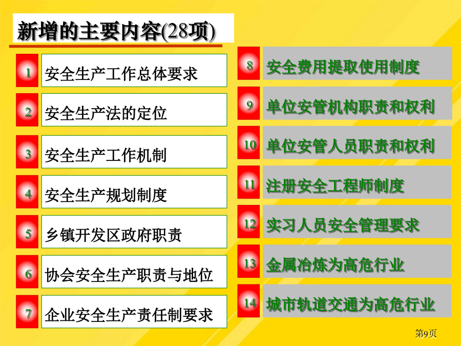 新增条款说明主要负责人未履行安全生产管理职责的判据生产经营单位安全生产管理人员的资格一般事故容易发生,应加大单位损失的经济罚款额度从业人员违反规章制度、操作规程,只要构成犯罪就追究刑事责任,删除了“造成严重后果”增加危险物品过程管理的运输、使用、处置废气等三个环节未经批准处罚和追责实施高危设备安全标志制度第25条第4款安全教育培训档案管理的要求安全生产的监督管理—新增1个款项建设项目安全设施设计施工、验收增加:金属冶炼和装卸危险物品单位建设项目违法行为只要构成犯罪就追究刑事责任,删除了“造成严重后果”第75条:安全生产违法非法行为记录公告制度没有事故应急救援预案或事故发生时没有及时启动预案特别重大事故万元/人,按30人计坚持“三个”必须对安全生产工作的要求配备必要应急设备单位增加:运输单位、金属冶炼企业、城市轨道交通运营企业以进行事故调查、做出各个处理结论必须依据法律法规,特别是确定和处理责任人员以及做出经济处罚高危设备管理要求不系统、高危行业少的问题第9条第3款安全生产监管部门统称增加因资金投入不足导致事故发生对单位主要负责人追究刑事责任单位安管人员职责和权利单位建设项目违法行为只要构成犯罪就追究刑事责任,删除了“造成严重后果”安全生产投入不足或没有有效实施定期编制行业发展规划,并与国民经济和社会发展规划有效衔接事故、事件报告与调查处理制度危及安全工艺和设备淘汰制度,第35条重大危险源管理制度,第37条以严谨的态度进行调查,不要遗漏任何过程的细节增加单位主要负责人未履行职责不改正处2-5万元罚款第25条第4款安全教育培训档案管理的要求中央政府富有安全生产监督管理职责的部门第92条:对事故单位未尽职主要负责人的经济处罚安全生产奖励制度,第16条第84条第2款事故发生单位整改措施要求第58条:劳务派遣人员的安全生产权利和义务将原法的97条增加至新修订法的114条,新增了17条,新增了64款项生产经营单位的安全生产保障—修改12个款项6.法律责任—修改12个款项(8)第100条四、新安法有哪些职责义务谢谢谢谢观看