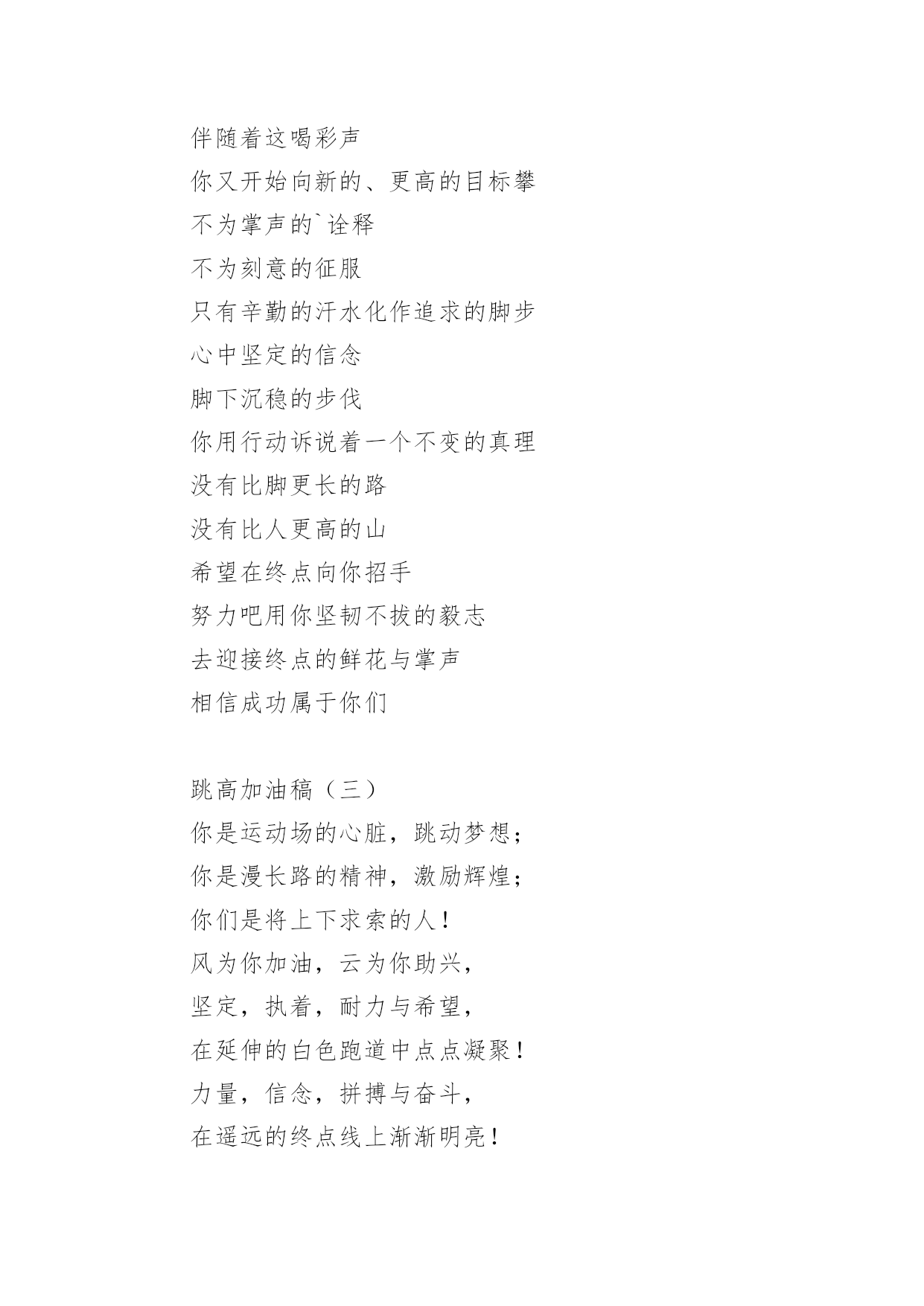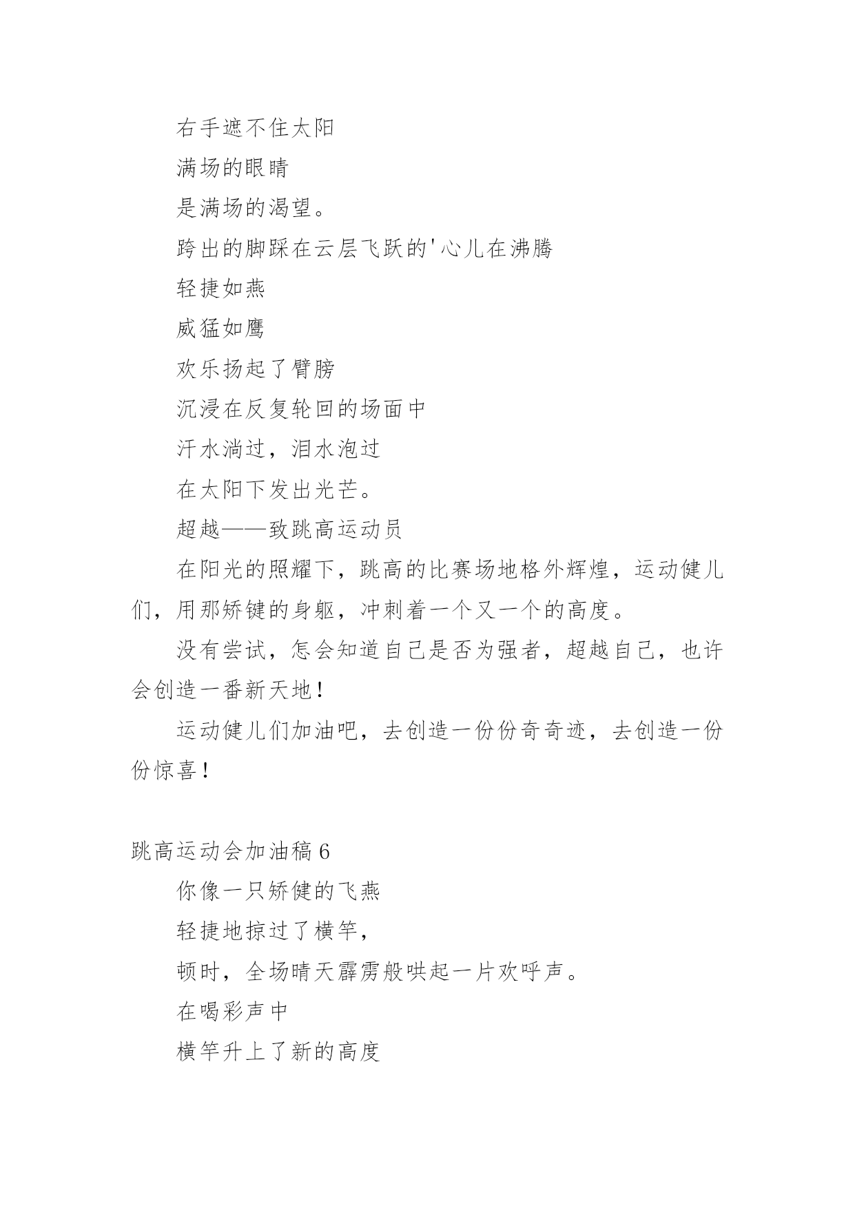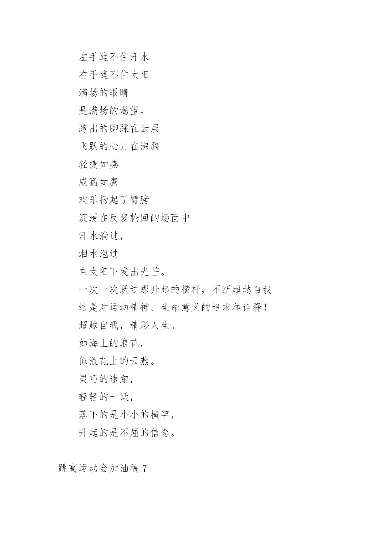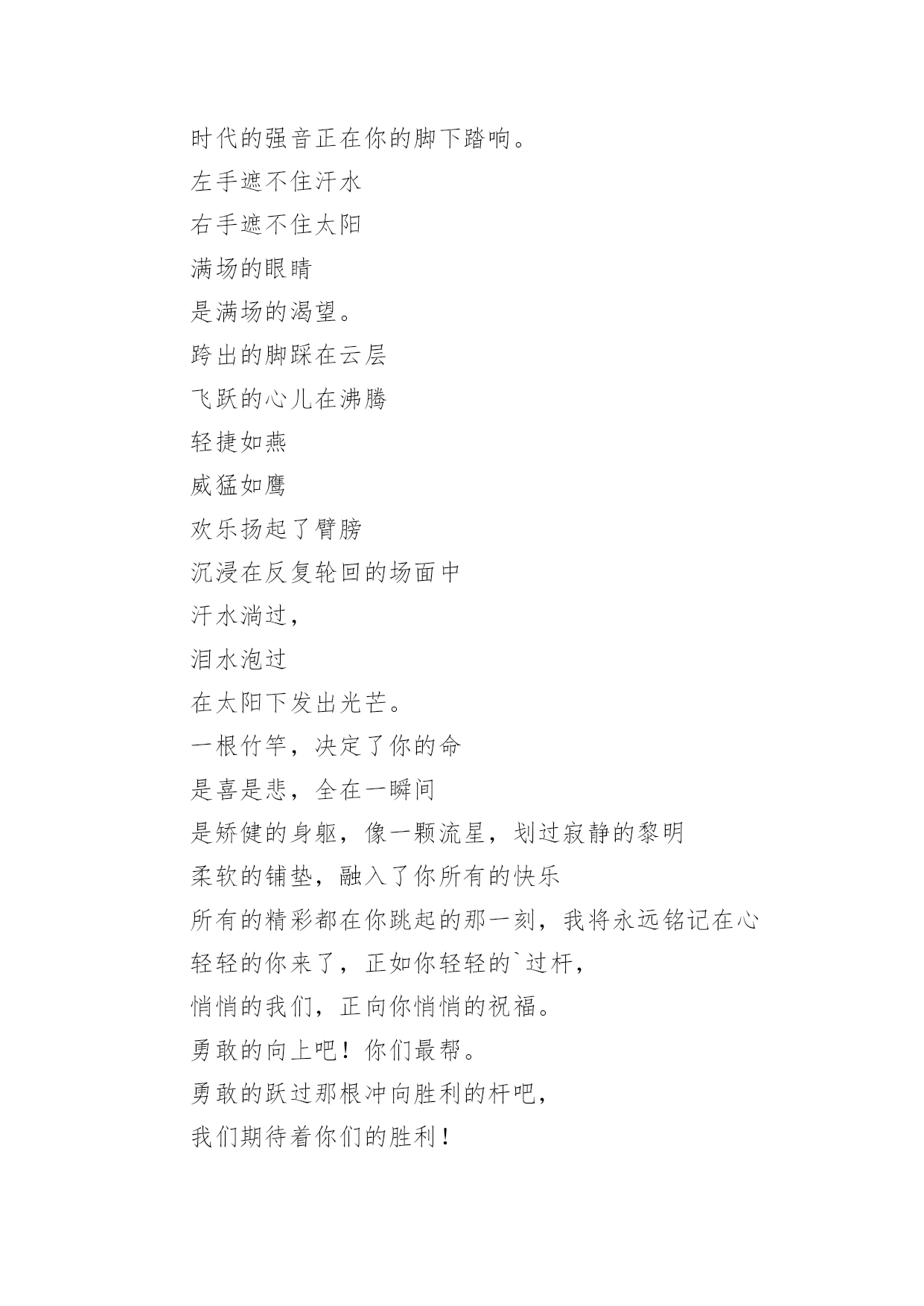 跳高运动会加油稿在现在的社会生活中,我们可以使用加油稿的机会越来越多,加油稿有着正向的鼓动作用。那么,怎么去写加油稿呢?下面是小编为大家整理的跳高运动会加油稿,仅供参考,希望能够帮助到大家。跳高运动会加油稿1你是运动场的心脏,跳动梦想;你是漫长路的精神,激励辉煌;你们是将上下求索的人!风为你加油,云为你助兴,坚定,执着,耐力与希望,在延伸的白色跑道中点点凝聚!力量,信念,拼搏与奋斗,在遥远的终点线上渐渐明亮!时代的强音正在你的脚下踏响。左手遮不住汗水右手遮不住太阳满场的眼睛是满场的渴望。跨出的脚踩在云层飞跃的心儿在沸腾轻捷如燕威猛如鹰欢乐扬起了臂膀沉浸在反复轮回的场面中汗水淌过,泪水泡过在太阳下发出光芒。一根竹竿,决定了你的命是喜是悲,全在一瞬间是矫健的身躯,像一颗流星,划过寂静的黎明柔软的铺垫,融入了你所有的快乐所有的精彩都在你跳起的那一刻,我将永远铭记在心轻轻的你来了,正如你轻轻的过杆,悄悄的我们,正向你悄悄的祝福。勇敢的`向上吧!你们最帮。勇敢的跃过那根冲向胜利的杆吧,我们期待着你们的胜利!左手遮不住汗水右手遮不住太阳满场的眼睛是满场的渴望。跨出的脚踩在云层飞跃的心儿在沸腾轻捷如燕威猛如鹰欢乐扬起了臂膀沉浸在反复轮回的场面中汗水淌过,泪水泡过在太阳下发出光芒。一次一次跃过那升起的横杆,不断超越自我这是对运动精神、生命意义的追求和诠释!超越自我,精彩人生。如海上的浪花,似浪花上的云燕。灵巧的速跑,轻轻的一跃,落下的是小小的横竿,升起的是不屈的信念。跳高运动会加油稿2如你轻轻的过杆,你悄悄的祝福。们最帮。向胜利的杆吧,胜利!放在半空中,生命中的`坎,冲刺着一个又一个没有尝试,怎会知道自己是否超越自己,也许会创造一番新运动健儿们加油吧,去创造一份份奇奇去创造一份份惊喜!跳高运动会加油稿3一根竹竿,决定你的命运。是喜是悲,全在一瞬间。你矫健的身躯,像一颗流星,划过寂静的黎明。柔软的铺垫,融入你所有的快乐。所有的精彩都在你跳起的那一刻,我将永远铭记在心。弧线——致铅球运动员一道优美的'弧线划过眼前,我不禁浮想联翩。这精彩的弧线啊,凝结着多少辛勤的汗水。无论的弧线啊,穿托着多少热切的企盼,它是这般自然,又是如此完美,没有什么遗憾,只留下一片美的体验。我要永远将你留下,让我的心中印上一条弧线。走过一段很长的路,你用青春的脚步,敲出铿锵的音符。成功融入笑容,失败也有幸福。一双双期盼的目光,每个人脚下都有一条成功之路。跳高运动会加油稿4跳高运动员超过——在阳光的`照射下,跳高体育场格外辉煌。运动员们,用那个矫正器的身体,正在冲刺另一个高度。没有尝试过。如何知道自己是不是强者?超越自我,也许创造一个新世界!运动健儿们加油。可以创造惊人的奇迹。可以制造惊喜!跳高运动会加油稿5致跳高运动员轻轻的你来了,正如你轻轻的过杆,悄悄的我们,正向你悄悄的祝福。勇敢的向上吧!你们最帮。勇敢的跃过那根冲向胜利的杆吧,我们期待着你们的胜利!致跳高者在步伐优美的助跑后,一跃,身体在空中划出一道弧线,迅速沉身,收脚。过。真是优美的跳高姿势。每一次,都是挑战,是超越。为了每一次超越喝彩。致跳高运动员一根细细的杆子横放在半空中,它细,然而却像你生命中的坎,不可怕,不要怕,只要你有决心,只要你有信心,这又算得了什么?没有经历过坎坷就不会有成功的喜悦,一次次的战胜,一次次的超越自己,加油吧,努力跳过这挡在你前面的坎。去燃烧你的青春!致跳高运动员左手遮不住汗水右手遮不住太阳满场的眼睛是满场的渴望。跨出的脚踩在云层飞跃的'心儿在沸腾轻捷如燕威猛如鹰欢乐扬起了臂膀沉浸在反复轮回的场面中汗水淌过,泪水泡过在太阳下发出光芒。超越——致跳高运动员在阳光的照耀下,跳高的比赛场地格外辉煌,运动健儿们,用那矫键的身躯,冲刺着一个又一个的高度。没有尝试,怎会知道自己是否为强者,超越自己,也许会创造一番新天地!运动健儿们加油吧,去创造一份份奇奇迹,去创造一份份惊喜!跳高运动会加油稿6你像一只矫健的飞燕轻捷地掠过了横竿,顿时,全场晴天霹雳般哄起一片欢呼声。在喝彩声中横竿升上了新的高度伴随着这喝彩声你又开始向新的、更高的目标攀不为掌声的`诠释不为刻意的征服只有辛勤的汗水化作追求的脚步心中坚定的信念脚下沉稳的步伐你用行动诉说着一个不变的真理没有比脚更长的路没有比人更高的山希望在终点向你招手努力吧用你坚韧不拔的毅志去迎接终点的鲜花与掌声相信成功属于你们跳高加油稿(三)你是运动场的心脏,跳动梦想;你是漫长路的精神,激励辉煌;你们是将上下求索的人!风为你加油,云为你助兴,坚定,执着,耐力与希望,在延伸的白色跑道中点点凝聚!力量,信念,拼搏与奋斗,在遥远的终点线上渐渐明亮!时代的强音正在你的脚下踏响。左手遮不住汗水右手遮不住太阳满场的眼睛是满场的渴望。跨出的脚踩在云层飞跃的心儿在沸腾轻捷如燕威猛如鹰欢乐