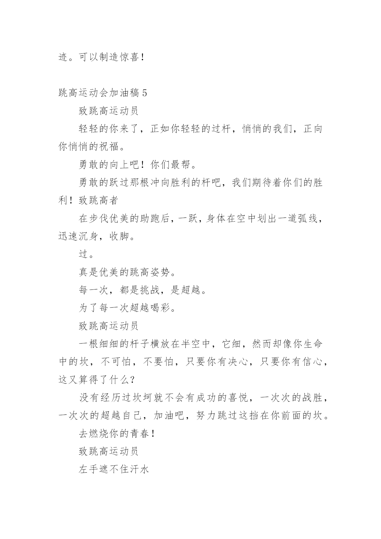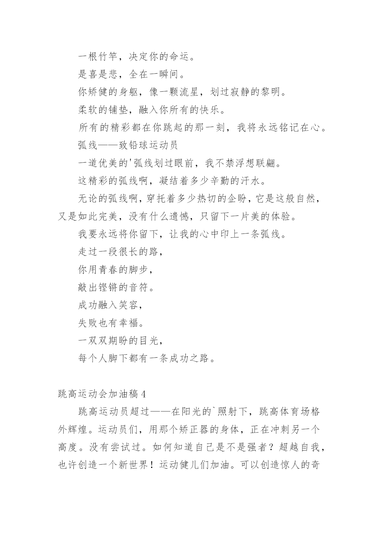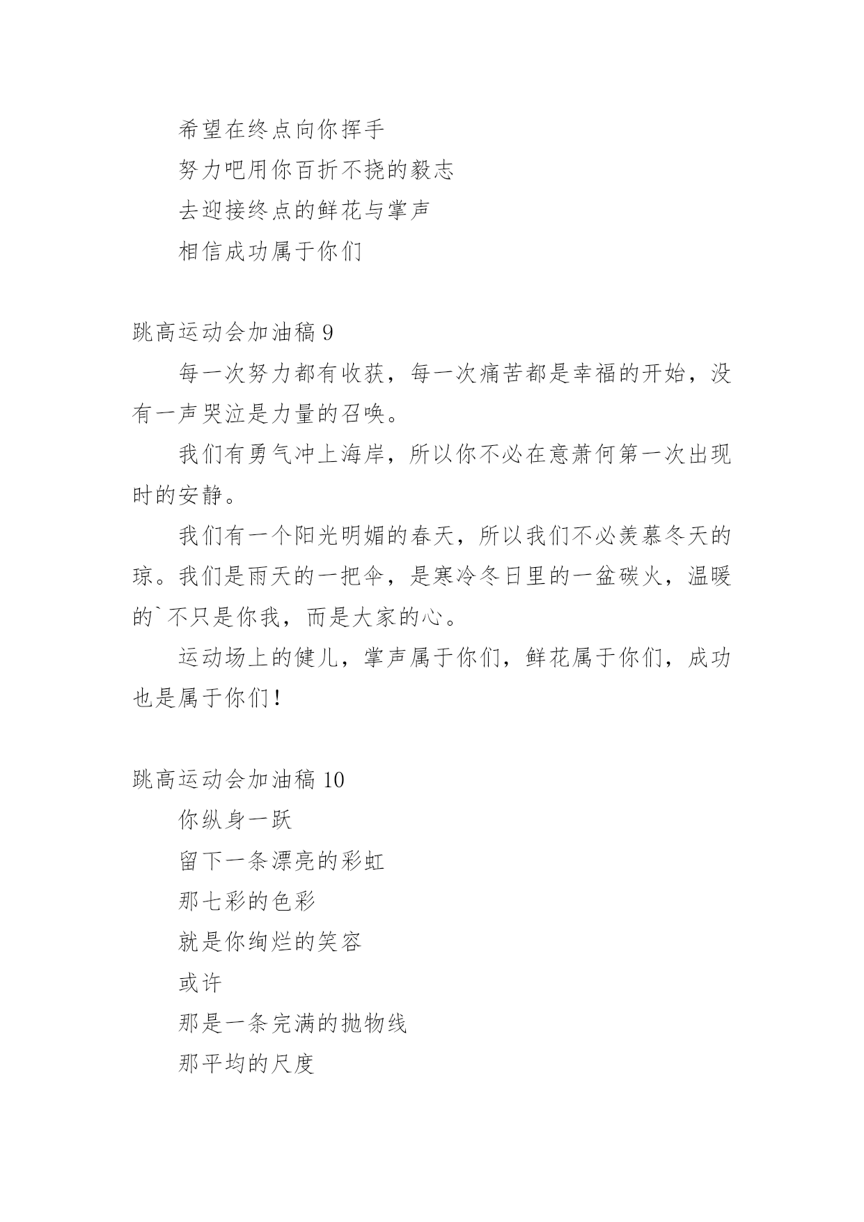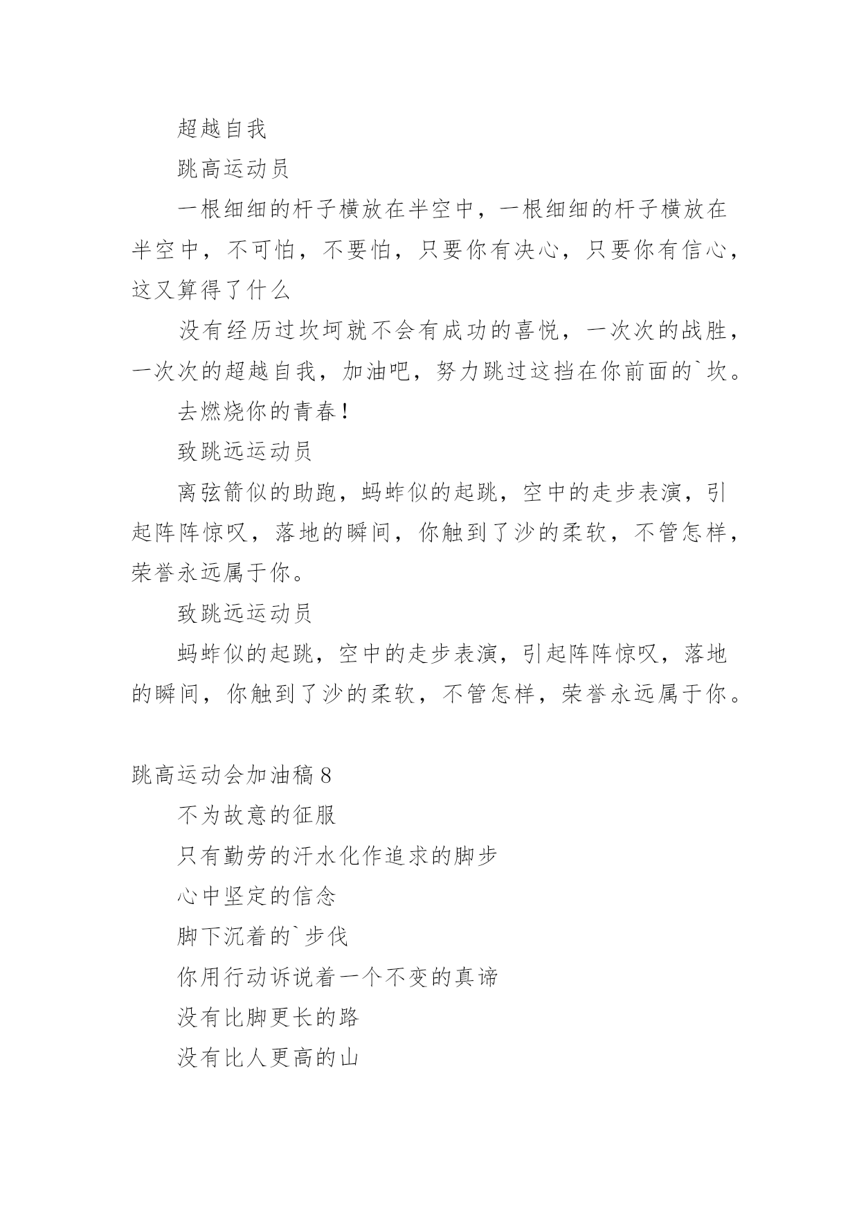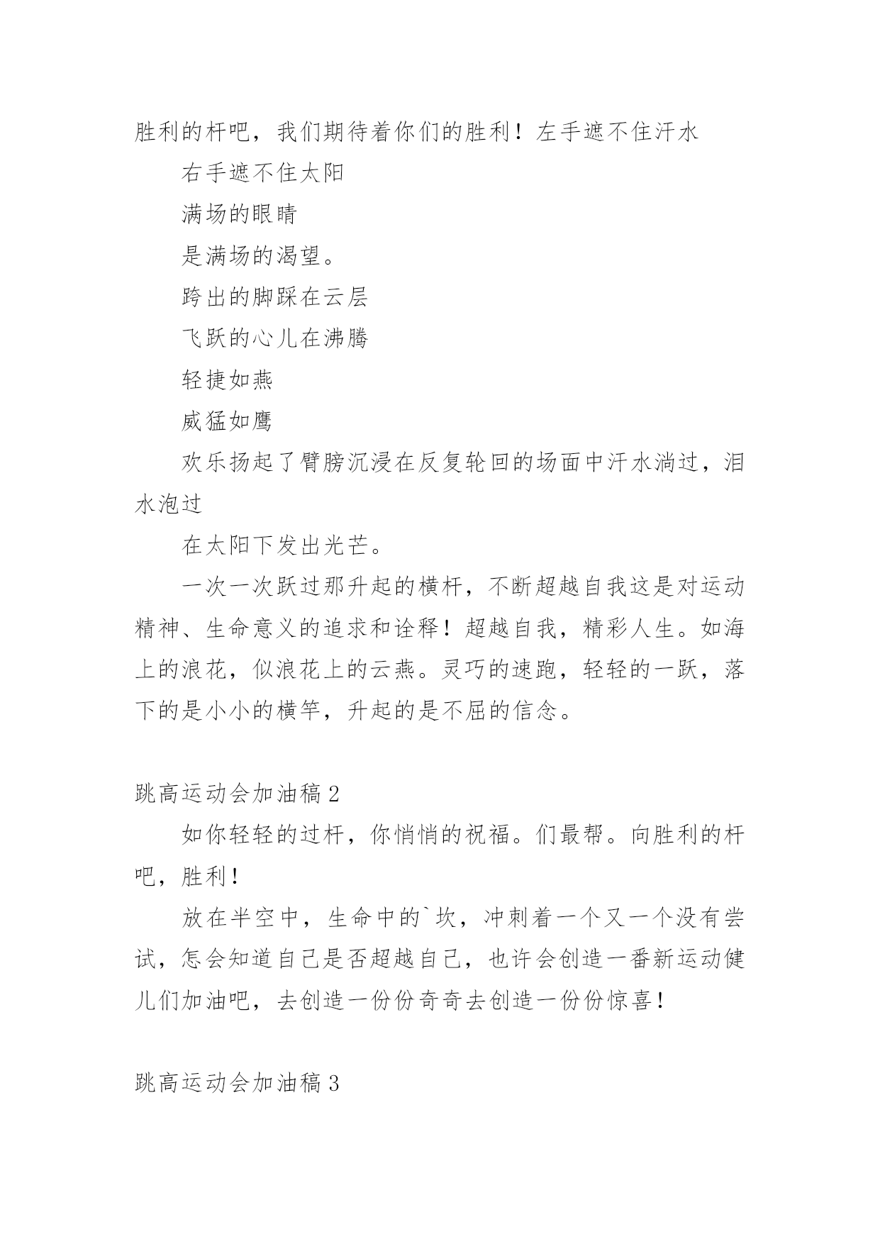 跳高运动会加油稿在现在的社会生活中,我们可以使用加油稿的机会越来越多,加油稿有着正向的鼓动作用。那么,怎么去写加油稿呢?下面是小编为大家整理的跳高运动会加油稿,仅供参考,希望能够帮助到大家。跳高运动会加油稿1你是运动场的心脏,跳动梦想;你是漫长路的精神,激励辉煌;你们是将上下求索的人!风为你加油,云为你助兴,坚定,执着,耐力与希望,在延伸的白色跑道中点点凝聚!力量,信念,拼搏与奋斗,在遥远的终点线上渐渐明亮!时代的强音正在你的脚下踏响。左手遮不住汗水右手遮不住太阳满场的眼睛是满场的渴望。跨出的脚踩在云层飞跃的心儿在沸腾轻捷如燕威猛如鹰欢乐扬起了臂膀沉浸在反复轮回的场面中汗水淌过,泪水泡过在太阳下发出光芒。一根竹竿,决定了你的命是喜是悲,全在一瞬间是矫健的身躯,像一颗流星,划过寂静的黎明柔软的铺垫,融入了你所有的快乐所有的精彩都在你跳起的那一刻,我将永远铭记在心轻轻的你来了,正如你轻轻的过杆,悄悄的我们,正向你悄悄的祝福。勇敢的`向上吧!你们最帮。勇敢的跃过那根冲向胜利的杆吧,我们期待着你们的胜利!左手遮不住汗水右手遮不住太阳满场的眼睛是满场的渴望。跨出的脚踩在云层飞跃的心儿在沸腾轻捷如燕威猛如鹰欢乐扬起了臂膀沉浸在反复轮回的场面中汗水淌过,泪水泡过在太阳下发出光芒。一次一次跃过那升起的横杆,不断超越自我这是对运动精神、生命意义的追求和诠释!超越自我,精彩人生。如海上的浪花,似浪花上的云燕。灵巧的速跑,轻轻的一跃,落下的是小小的横竿,升起的是不屈的信念。跳高运动会加油稿2如你轻轻的过杆,你悄悄的祝福。们最帮。向胜利的杆吧,胜利!放在半空中,生命中的`坎,冲刺着一个又一个没有尝试,怎会知道自己是否超越自己,也许会创造一番新运动健儿们加油吧,去创造一份份奇奇去创造一份份惊喜!跳高运动会加油稿3一根竹竿,决定你的命运。是喜是悲,全在一瞬间。你矫健的身躯,像一颗流星,划过寂静的黎明。柔软的铺垫,融入你所有的快乐。所有的精彩都在你跳起的那一刻,我将永远铭记在心。弧线——致铅球运动员一道优美的'弧线划过眼前,我不禁浮想联翩。这精彩的弧线啊,凝结着多少辛勤的汗水。无论的弧线啊,穿托着多少热切的企盼,它是这般自然,又是如此完美,没有什么遗憾,只留下一片美的体验。我要永远将你留下,让我的心中印上一条弧线。走过一段很长的路,你用青春的脚步,敲出铿锵的音符。成功融入笑容,失败也有幸福。一双双期盼的目光,每个人脚下都有一条成功之路。跳高运动会加油稿4跳高运动员超过——在阳光的`照射下,跳高体育场格外辉煌。运动员们,用那个矫正器的身体,正在冲刺另一个高度。没有尝试过。如何知道自己是不是强者?超越自我,也许创造一个新世界!运动健儿们加油。可以创造惊人的奇迹。可以制造惊喜!跳高运动会加油稿5致跳高运动员轻轻的你来了,正如你轻轻的过杆,悄悄的我们,正向你悄悄的祝福。勇敢的向上吧!你们最帮。勇敢的跃过那根冲向胜利的杆吧,我们期待着你们的胜利!致跳高者在步伐优美的助跑后,一跃,身体在空中划出一道弧线,迅速沉身,收脚。过。真是优美的跳高姿势。每一次,都是挑战,是超越。为了每一次超越喝彩。致跳高运动员一根细细的杆子横放在半空中,它细,然而却像你生命中的坎,不可怕,不要怕,只要你有决心,只要你有信心,这又算得了什么?没有经历过坎坷就不会有成功的喜悦,一次次的战胜,一次次的超越自己,加油吧,努力跳过这挡在你前面的坎。去燃烧你的青春!致跳高运动员左手遮不住汗水右手遮不住太阳满场的眼睛是满场的渴望。跨出的脚踩在云层飞跃的'心儿在沸腾轻捷如燕威猛如鹰欢乐扬起了臂膀沉浸在反复轮回的场面中汗水淌过,泪水泡过在太阳下发出光芒。超越——致跳高运动员在阳光的照耀下,跳高的比赛场地格外辉煌,运动健儿们,用那矫键的身躯,冲刺着一个又一个的高度。没有尝试,怎会知道自己是否为强者,超越自己,也许会创造一番新天地!运动健儿们加油吧,去创造一份份奇奇迹,去创造一份份惊喜!跳高运动会加油稿6你像一只矫健的飞燕轻捷地掠过了横竿,顿时,全场晴天霹雳般哄起一片欢呼声。在喝彩声中横竿升上了新的高度伴随着这喝彩声你又开始向新的、更高的目标攀不为掌声的`诠释不为刻意的征服只有辛勤的汗水化作追求的脚步心中坚定的信念脚下沉稳的步伐你用行动诉说着一个不变的真理没有比脚更长的路没有比人更高的山希望在终点向你招手努力吧用你坚韧不拔的毅志去迎接终点的鲜花与掌声相信成功属于你们跳高加油稿(三)你是运动场的心脏,跳动梦想;你是漫长路的精神,激励辉煌;你们是将上下求索的人!风为你加油,云为你助兴,坚定,执着,耐力与希望,在延伸的白色跑道中点点凝聚!力量,信念,拼搏与奋斗,在遥远的终点线上渐渐明亮!时代的强音正在你的脚下踏响。左手遮不住汗水右手遮不住太阳满场的眼睛是满场的渴望。跨出的脚踩在云层飞跃的心儿在沸腾轻捷如燕威猛如鹰欢乐