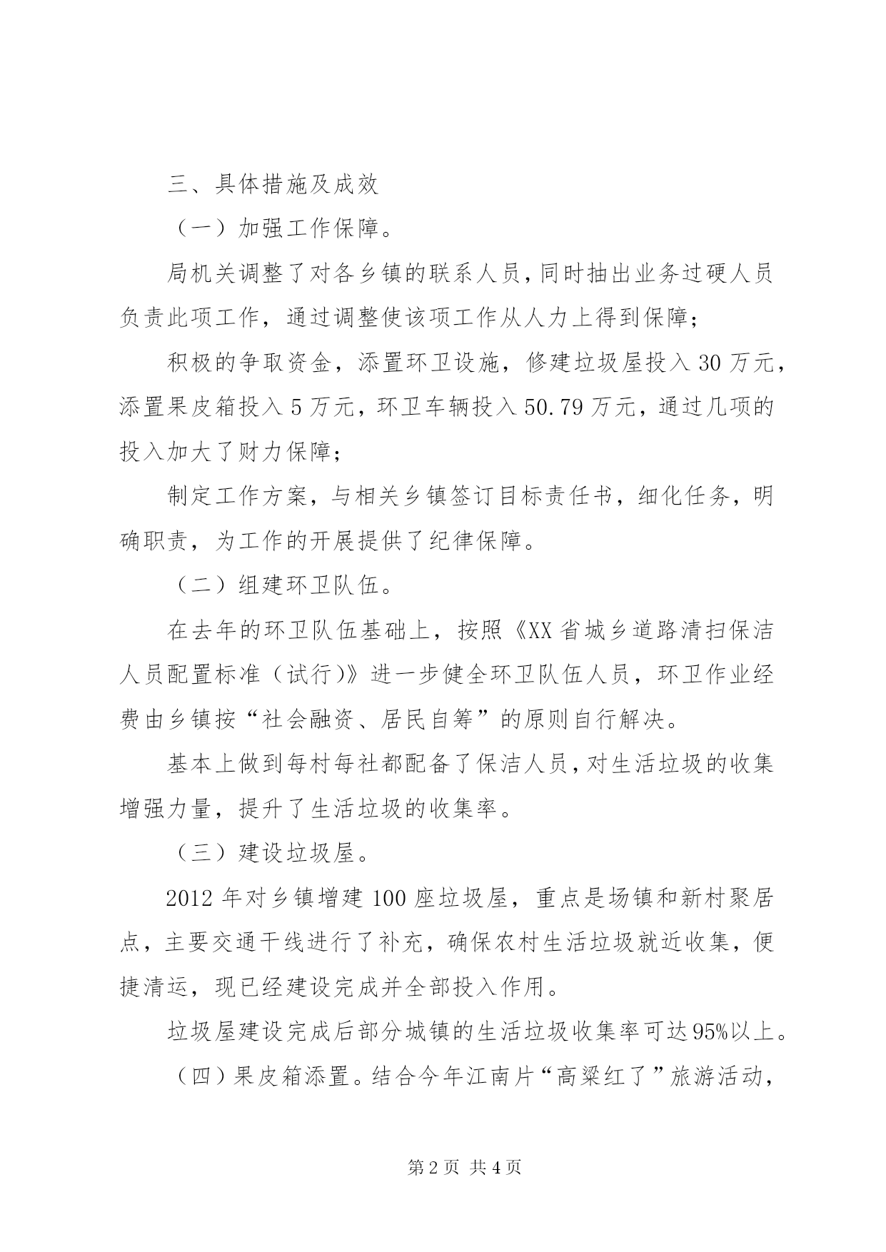 第PAGE\*Arabic\*MERGEFORMAT4页共NUMPAGES\*MERGEFORMAT4页生活垃圾无害处理2012年城镇生活垃圾处理工作按照《关于印发2012年创建国家级生态区任务的通知》(xx[2012]59号)文件的要求,紧密结合“两化互动、统筹城乡”的工作部署。通过增添措施,加大环卫基础设施的建设力度,圆满完成了区委、区政府下达的工作任务,现总结如下。一、强化领导、提升认识结合前期各乡镇生活垃圾处理的情况和今年的工作要求,调整了xxx市容管理局生态区建设领导班子成员,成立了生态区建设工作组领导小组,市容管理局局长为组长主要抓,分管环卫工作领导具体抓。多次召开专题会议,分析讨论存在的问题,提出解决的方法,组织全局班干部职工开展学习,分组讨论,全面提升对该项工作的认识。二、健全制度、明确职责进一步健全了任务目标的考核细则,制定了印发了《xxx镇村环卫工作意见》《xxx镇村环卫工作考核细则》,做到了任务准确,责任明确。指导各乡镇制定了自己的环卫工作管理制度。通过一系列的制度建设,要求各乡镇细化措施,明确责任,落实人员,做到有人抓,有人管。按照工作进度开始月考、季考相结合,发现问题及时整改。三、具体措施及成效(一)加强工作保障。局机关调整了对各乡镇的联系人员,同时抽出业务过硬人员负责此项工作,通过调整使该项工作从人力上得到保障;积极的争取资金,添置环卫设施,修建垃圾屋投入30万元,添置果皮箱投入5万元,环卫车辆投入50.79万元,通过几项的投入加大了财力保障;制定工作方案,与相关乡镇签订目标责任书,细化任务,明确职责,为工作的开展提供了纪律保障。(二)组建环卫队伍。在去年的环卫队伍基础上,按照《XX省城乡道路清扫保洁人员配置标准(试行)》进一步健全环卫队伍人员,环卫作业经费由乡镇按“社会融资、居民自筹”的原则自行解决。基本上做到每村每社都配备了保洁人员,对生活垃圾的收集增强力量,提升了生活垃圾的收集率。(三)建设垃圾屋。2012年对乡镇增建100座垃圾屋,重点是场镇和新村聚居点,主要交通干线进行了补充,确保农村生活垃圾就近收集,便捷清运,现已经建设完成并全部投入作用。垃圾屋建设完成后部分城镇的生活垃圾收集率可达95%以上。(四)果皮箱添置。结合今年江南片“高粱红了”旅游活动,对江南片果皮箱进行添置,共计123个,其余乡镇77个,共投入200个。主要设置在新村集居点,交通要道。为与高粱文化相结合,对果皮箱进行了美化,充分体现高粱文化特色。通过果皮箱的添置,增加了江南片的环卫设施,有利于环卫保洁人员工作的开展,减少了工作量,进一步便于垃圾的收集和清运。(五)配备环卫车辆。对江南片三个乡镇配备了东风牌5吨垃圾清运车,其余各乡镇配备环卫正三轮。通过垃圾清运车辆的配备,改变过去人力三轮清运方式,大大的增加了垃圾的清运速度,使垃圾清运逐步走上了机械化作业的轨道。通过以上一系列的工作举措,目前我区城镇生活垃圾无害化处理率达平均超过了92%,部分城镇生活无害化无害化处理率达到了100%。四、存在的不足和下一步工作打算在上半年工作中虽说取得一定的成绩,但也存在一定的不足。思想认识有待进一步加强,充分认识到这是一项缩小城乡差异,实现城乡一体化,同时也是按《XX省城乡环境综合治理条例》加强农村环卫设施建设的有效工程;资金投入有待进一步加大,因为以前的一些原因,导致今年的工作进度相对滞后;整体规划有待进一步商榷,环卫建设应该严格按三同时的要求,按要地发展的长远规划要求。下一步的打算:一是进一步提升认识,从思想上、行动上全面统一;二是积极争取资金,与相关部门协调对接,争取就地解决垃圾的无害化处理问题,减少清运成本;三是与规划建设部门搞好对接,特别新村集居点,环卫设施真正实现“三同时”;四是加大对在建环卫设施的督促检查力度,在区政府组织初检时全面完成,对已建环卫设施使用情况进行检查,确保建好、用好。二〇一二年十二月二十六日