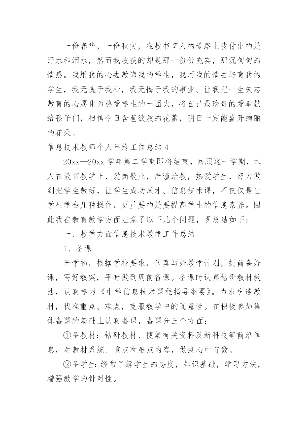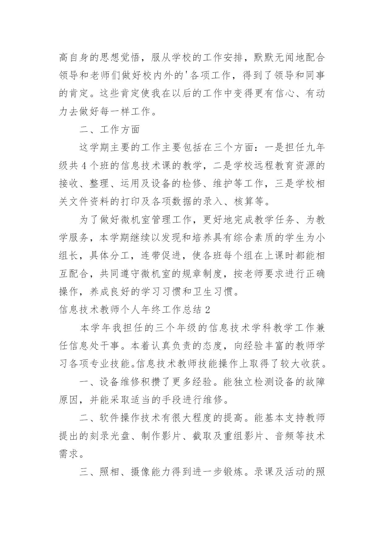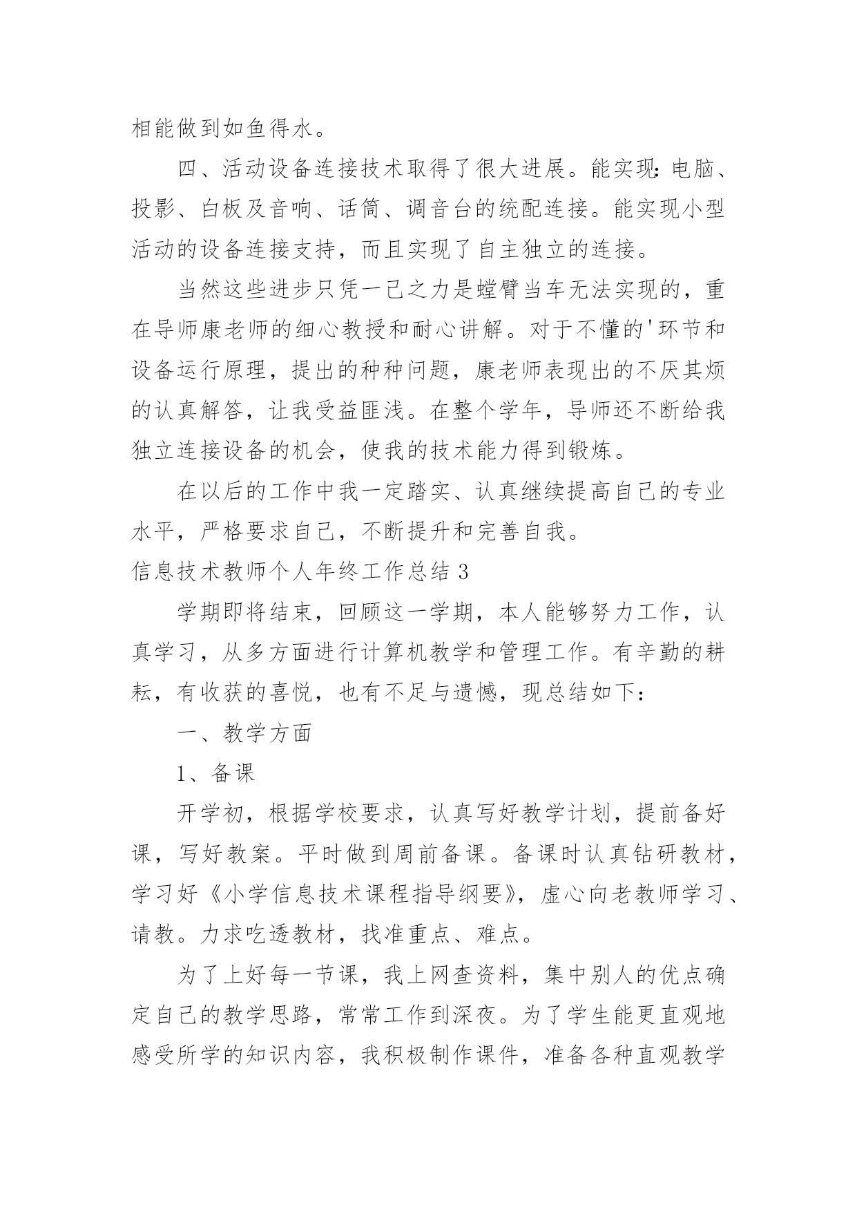 信息技术教师个人年终工作总结信息技术教师个人年终工作总结总结是对某一阶段的工作、学习或思想中的经验或情况进行分析研究的书面材料,它能够使头脑更加清醒,目标更加明确,因此,让我们写一份总结吧。总结怎么写才是正确的呢?下面是小编为大家收集的信息技术教师个人年终工作总结,供大家参考借鉴,希望可以帮助到有需要的朋友。信息技术教师个人年终工作总结1不知不觉中一个学期就要结束了,回顾这个学期的工作,基本上是比较顺利的。我所享有的收获,我会用于下个学期的工作中,我所碰到的问题我会认真思考,想办法解决。在这个学期中,本人能在保持原有良好工作态度的基础上,不断进步,不断进取,不断学习,虚心向有经验的老师学习。为了保持优良的工作姿态,以使下一学年能以更优秀的面貌去继续工作,现将本人这学期的工作情况进行全面的总结,总结如下:一、思想方面在这学期里,我从思想上,利用师德师风教育活动端正自己;从行动上学电脑技术,学教学技能等;在生活上注意形象,为人师表。一学期来,我积极参加政治学习,努力提高自身的思想觉悟,服从学校的工作安排,默默无闻地配合领导和老师们做好校内外的'各项工作,得到了领导和同事的肯定。这些肯定使我在以后的工作中变得更有信心、有动力去做好每一样工作。二、工作方面这学期主要的工作主要包括在三个方面:一是担任九年级共4个班的信息技术课的教学,二是学校远程教育资源的接收、整理、运用及设备的检修、维护等工作,三是学校相关文件资料的打印及各项数据的录入、核算等。为了做好微机室管理工作,更好地完成教学任务、为教学服务,本学期继续以发现和培养具有综合素质的学生为小组长,具体分工,连带促进,使各班每个组在上课时都能相互配合,共同遵守微机室的规章制度,按老师要求进行正确操作,养成良好的学习习惯和卫生习惯。信息技术教师个人年终工作总结2本学年我担任的三个年级的信息技术学科教学工作兼任信息处干事。本着认真负责的态度,向经验丰富的教师学习各项专业技能。信息技术教师技能操作上取得了较大收获。一、设备维修积攒了更多经验。能独立检测设备的故障原因,并能采取适当的手段进行维修。二、软件操作技术有很大程度的提高。能基本支持教师提出的刻录光盘、制作影片、截取及重组影片、音频等技术需求。三、照相、摄像能力得到进一步锻炼。录课及活动的照相能做到如鱼得水。四、活动设备连接技术取得了很大进展。能实现:电脑、投影、白板及音响、话筒、调音台的统配连接。能实现小型活动的设备连接支持,而且实现了自主独立的连接。当然这些进步只凭一己之力是螳臂当车无法实现的,重在导师康老师的细心教授和耐心讲解。对于不懂的'环节和设备运行原理,提出的种种问题,康老师表现出的不厌其烦的认真解答,让我受益匪浅。在整个学年,导师还不断给我独立连接设备的机会,使我的技术能力得到锻炼。在以后的工作中我一定踏实、认真继续提高自己的专业水平,严格要求自己,不断提升和完善自我。信息技术教师个人年终工作总结3学期即将结束,回顾这一学期,本人能够努力工作,认真学习,从多方面进行计算机教学和管理工作。有辛勤的耕耘,有收获的喜悦,也有不足与遗憾,现总结如下:一、教学方面1、备课开学初,根据学校要求,认真写好教学计划,提前备好课,写好教案。平时做到周前备课。备课时认真钻研教材,学习好《小学信息技术课程指导纲要》,虚心向老教师学习、请教。力求吃透教材,找准重点、难点。为了上好每一节课,我上网查资料,集中别人的优点确定自己的教学思路,常常工作到深夜。为了学生能更直观地感受所学的知识内容,我积极制作课件,准备各种直观教学软件,搜集制作各知识点优秀案例展示给学生。2、上课上好课的前提是做好课前准备,不打无准备之仗,尤其本学科主要课程都要上机完成,每节都要认真做好上机备课,检查机器状态,有无“不可用机器”,。上课时认真讲课,力求抓住重点,突破难点,精讲精练。运用多种教学方法,从学生的实际出发,注意调动学生学习的积极性和创造性思维,使学生有举一反三的能力。在学生完成上机任务时,在各台计算机前巡视,注意对学困生进行手把手的辅导,课后及时做课后记,找出不足。3、笔记根据每节课的特点,为学生设计最合理的笔记,既便于学生理解和掌握当堂课的知识。4、收获本学期我校学生参加市教育局组织的现场电脑绘画活动,取得优异的成绩,我校五年二班赵晨曦和高圆涵梦同学的作品选送参加全国第九届中小学电脑绘画比赛获得黑龙江省级一等奖和省级二等奖。在4月初我校报送的电子报刊,幻灯片及电脑绘画作品分别取得奖项得到学校及教育局信息科的好评。不足之处是我校在第五届智能机器人比赛中只取得二等奖,很遗憾。在以后的工作中我会不断努力力争在明年的比赛中取得优异的成绩。让孩子充分的体会到成功的喜悦,分享成功的快乐。二、个人学习:积极学习各种理论,以充实自己,以便在工作中以坚实的理论作为指导,更好