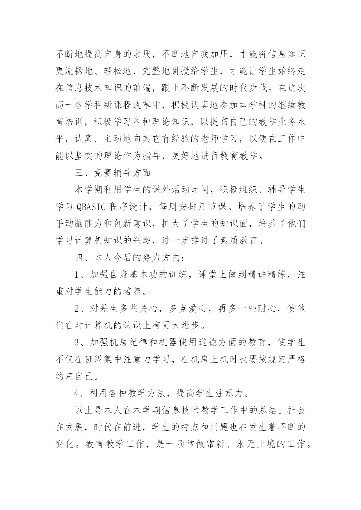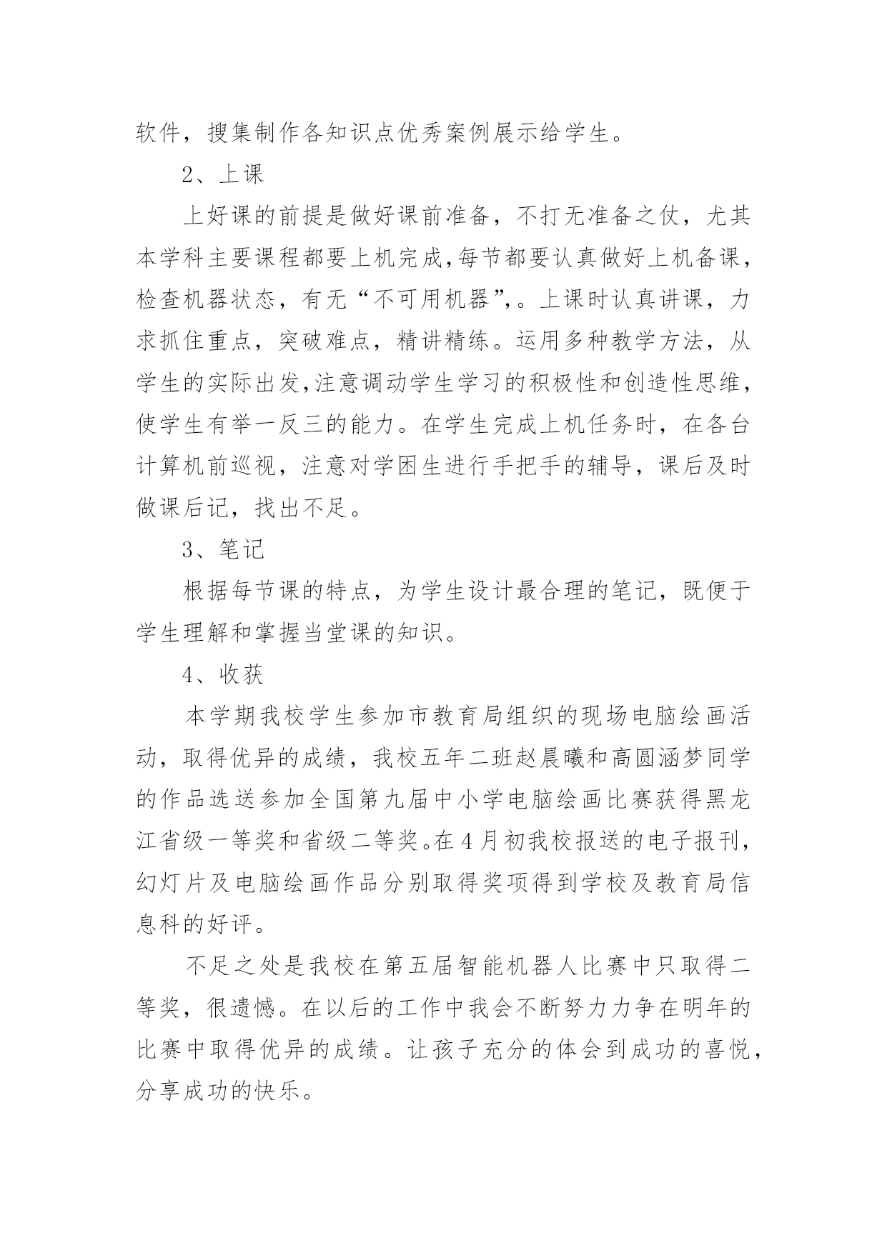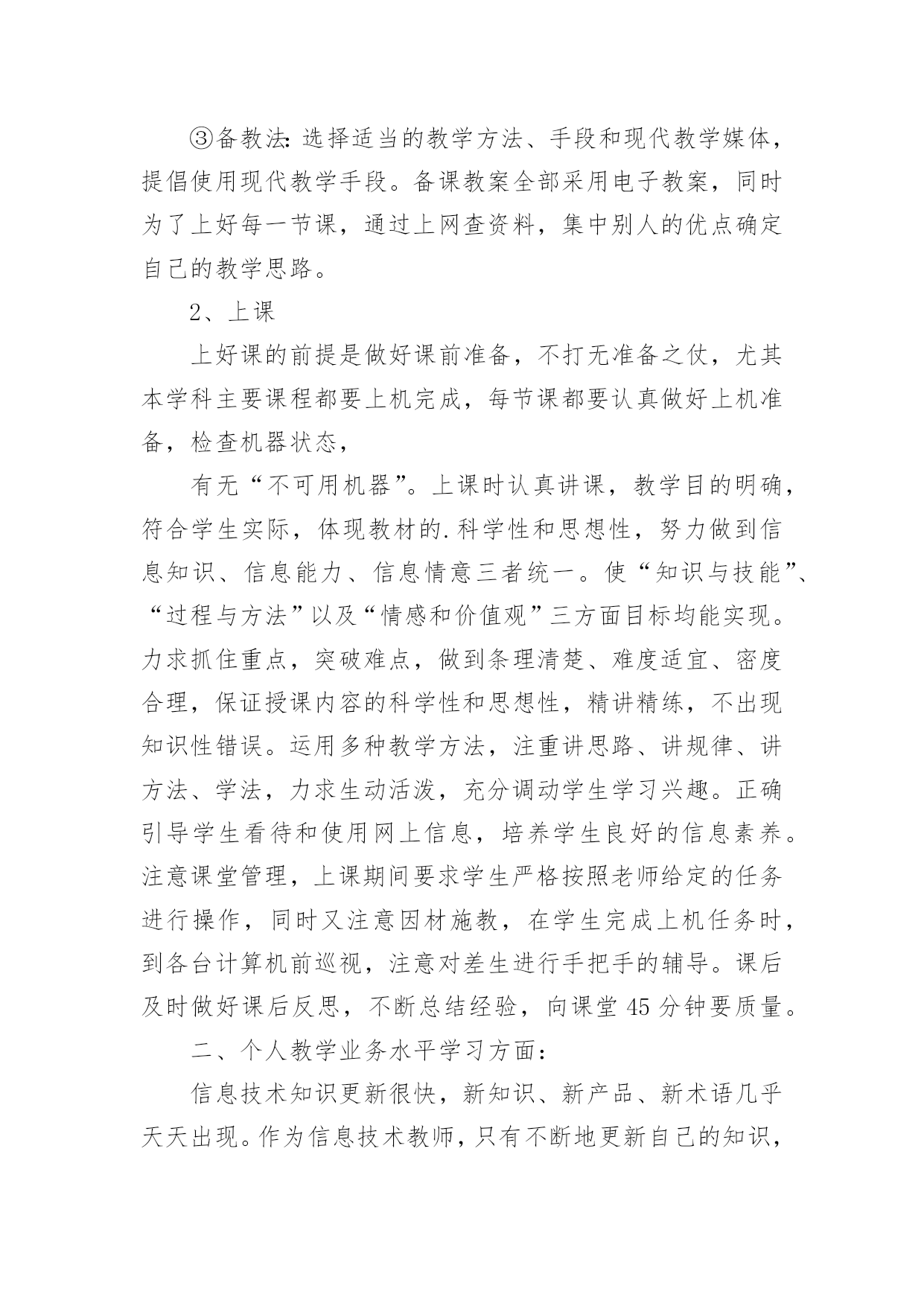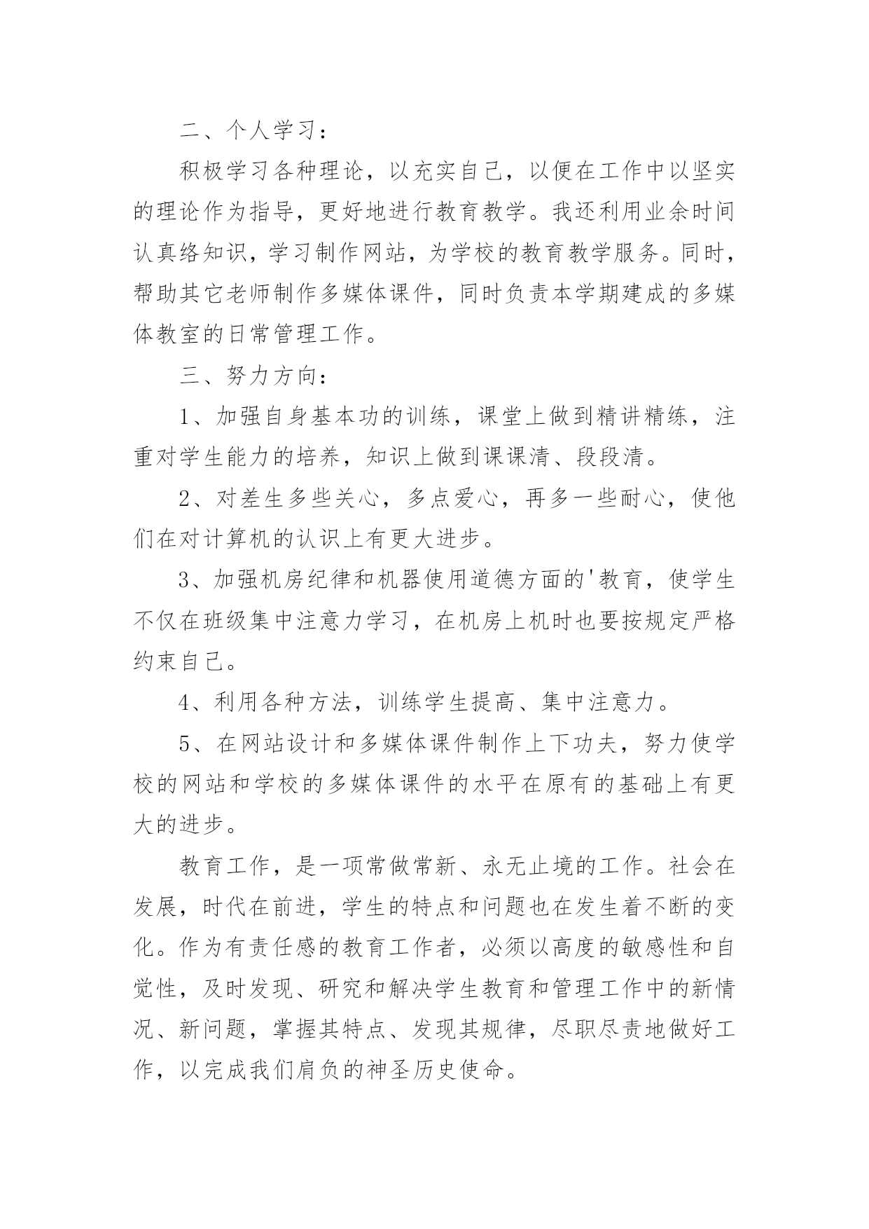 信息技术教师个人年终工作总结信息技术教师个人年终工作总结总结是对某一阶段的工作、学习或思想中的经验或情况进行分析研究的书面材料,它能够使头脑更加清醒,目标更加明确,因此,让我们写一份总结吧。总结怎么写才是正确的呢?下面是小编为大家收集的信息技术教师个人年终工作总结,供大家参考借鉴,希望可以帮助到有需要的朋友。信息技术教师个人年终工作总结1不知不觉中一个学期就要结束了,回顾这个学期的工作,基本上是比较顺利的。我所享有的收获,我会用于下个学期的工作中,我所碰到的问题我会认真思考,想办法解决。在这个学期中,本人能在保持原有良好工作态度的基础上,不断进步,不断进取,不断学习,虚心向有经验的老师学习。为了保持优良的工作姿态,以使下一学年能以更优秀的面貌去继续工作,现将本人这学期的工作情况进行全面的总结,总结如下:一、思想方面在这学期里,我从思想上,利用师德师风教育活动端正自己;从行动上学电脑技术,学教学技能等;在生活上注意形象,为人师表。一学期来,我积极参加政治学习,努力提高自身的思想觉悟,服从学校的工作安排,默默无闻地配合领导和老师们做好校内外的'各项工作,得到了领导和同事的肯定。这些肯定使我在以后的工作中变得更有信心、有动力去做好每一样工作。二、工作方面这学期主要的工作主要包括在三个方面:一是担任九年级共4个班的信息技术课的教学,二是学校远程教育资源的接收、整理、运用及设备的检修、维护等工作,三是学校相关文件资料的打印及各项数据的录入、核算等。为了做好微机室管理工作,更好地完成教学任务、为教学服务,本学期继续以发现和培养具有综合素质的学生为小组长,具体分工,连带促进,使各班每个组在上课时都能相互配合,共同遵守微机室的规章制度,按老师要求进行正确操作,养成良好的学习习惯和卫生习惯。信息技术教师个人年终工作总结2本学年我担任的三个年级的信息技术学科教学工作兼任信息处干事。本着认真负责的态度,向经验丰富的教师学习各项专业技能。信息技术教师技能操作上取得了较大收获。一、设备维修积攒了更多经验。能独立检测设备的故障原因,并能采取适当的手段进行维修。二、软件操作技术有很大程度的提高。能基本支持教师提出的刻录光盘、制作影片、截取及重组影片、音频等技术需求。三、照相、摄像能力得到进一步锻炼。录课及活动的照相能做到如鱼得水。四、活动设备连接技术取得了很大进展。能实现:电脑、投影、白板及音响、话筒、调音台的统配连接。能实现小型活动的设备连接支持,而且实现了自主独立的连接。当然这些进步只凭一己之力是螳臂当车无法实现的,重在导师康老师的细心教授和耐心讲解。对于不懂的'环节和设备运行原理,提出的种种问题,康老师表现出的不厌其烦的认真解答,让我受益匪浅。在整个学年,导师还不断给我独立连接设备的机会,使我的技术能力得到锻炼。在以后的工作中我一定踏实、认真继续提高自己的专业水平,严格要求自己,不断提升和完善自我。信息技术教师个人年终工作总结3学期即将结束,回顾这一学期,本人能够努力工作,认真学习,从多方面进行计算机教学和管理工作。有辛勤的耕耘,有收获的喜悦,也有不足与遗憾,现总结如下:一、教学方面1、备课开学初,根据学校要求,认真写好教学计划,提前备好课,写好教案。平时做到周前备课。备课时认真钻研教材,学习好《小学信息技术课程指导纲要》,虚心向老教师学习、请教。力求吃透教材,找准重点、难点。为了上好每一节课,我上网查资料,集中别人的优点确定自己的教学思路,常常工作到深夜。为了学生能更直观地感受所学的知识内容,我积极制作课件,准备各种直观教学软件,搜集制作各知识点优秀案例展示给学生。2、上课上好课的前提是做好课前准备,不打无准备之仗,尤其本学科主要课程都要上机完成,每节都要认真做好上机备课,检查机器状态,有无“不可用机器”,。上课时认真讲课,力求抓住重点,突破难点,精讲精练。运用多种教学方法,从学生的实际出发,注意调动学生学习的积极性和创造性思维,使学生有举一反三的能力。在学生完成上机任务时,在各台计算机前巡视,注意对学困生进行手把手的辅导,课后及时做课后记,找出不足。3、笔记根据每节课的特点,为学生设计最合理的笔记,既便于学生理解和掌握当堂课的知识。4、收获本学期我校学生参加市教育局组织的现场电脑绘画活动,取得优异的成绩,我校五年二班赵晨曦和高圆涵梦同学的作品选送参加全国第九届中小学电脑绘画比赛获得黑龙江省级一等奖和省级二等奖。在4月初我校报送的电子报刊,幻灯片及电脑绘画作品分别取得奖项得到学校及教育局信息科的好评。不足之处是我校在第五届智能机器人比赛中只取得二等奖,很遗憾。在以后的工作中我会不断努力力争在明年的比赛中取得优异的成绩。让孩子充分的体会到成功的喜悦,分享成功的快乐。二、个人学习:积极学习各种理论,以充实自己,以便在工作中以坚实的理论作为指导,更好