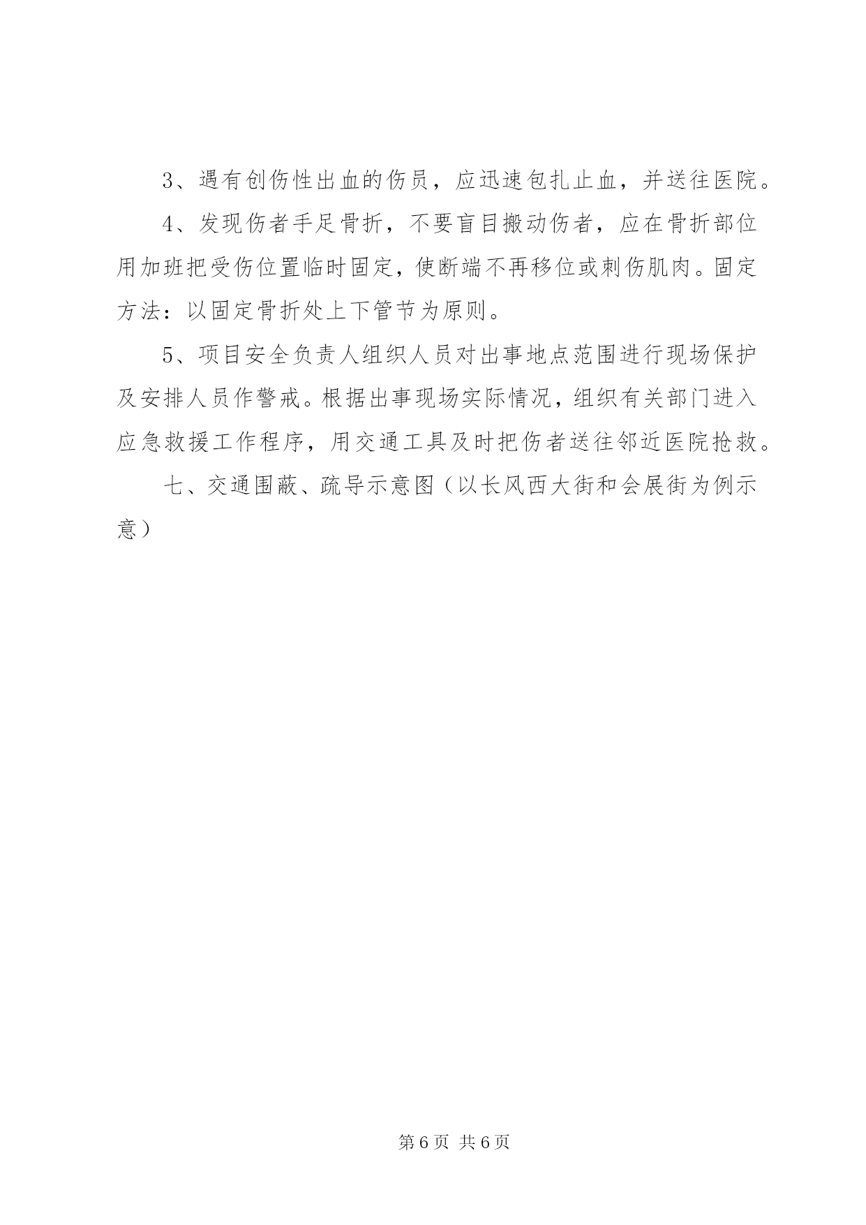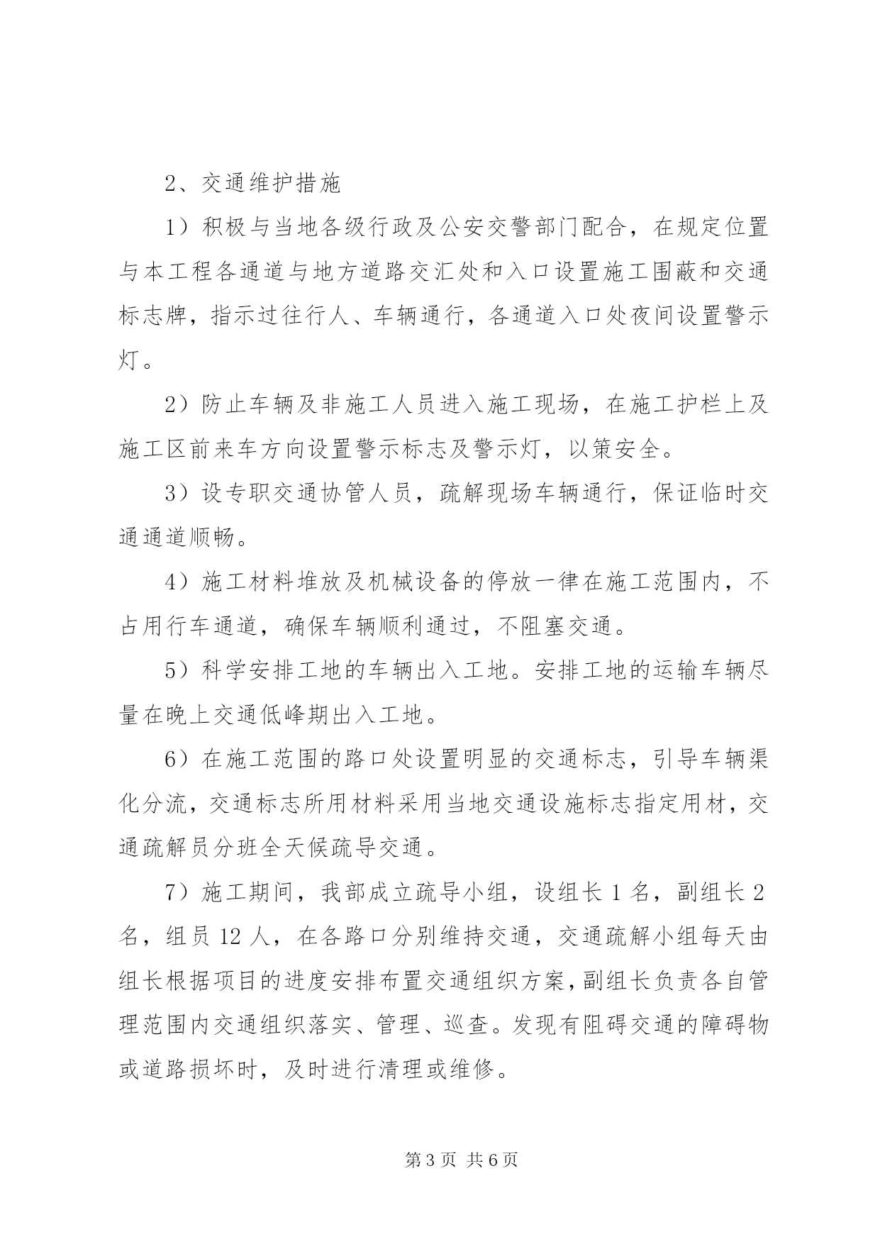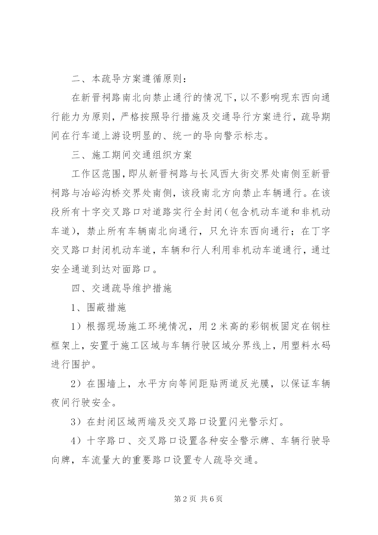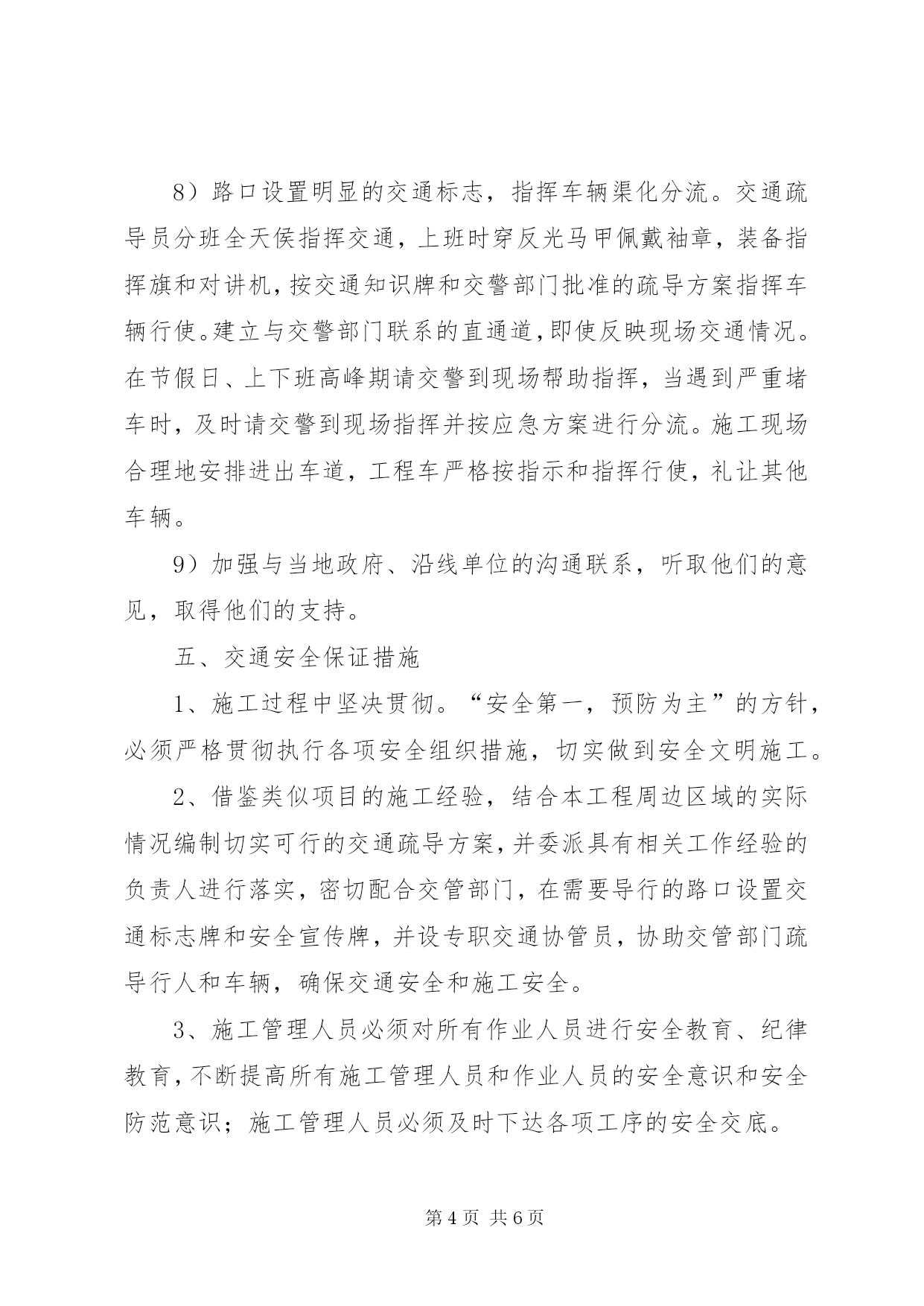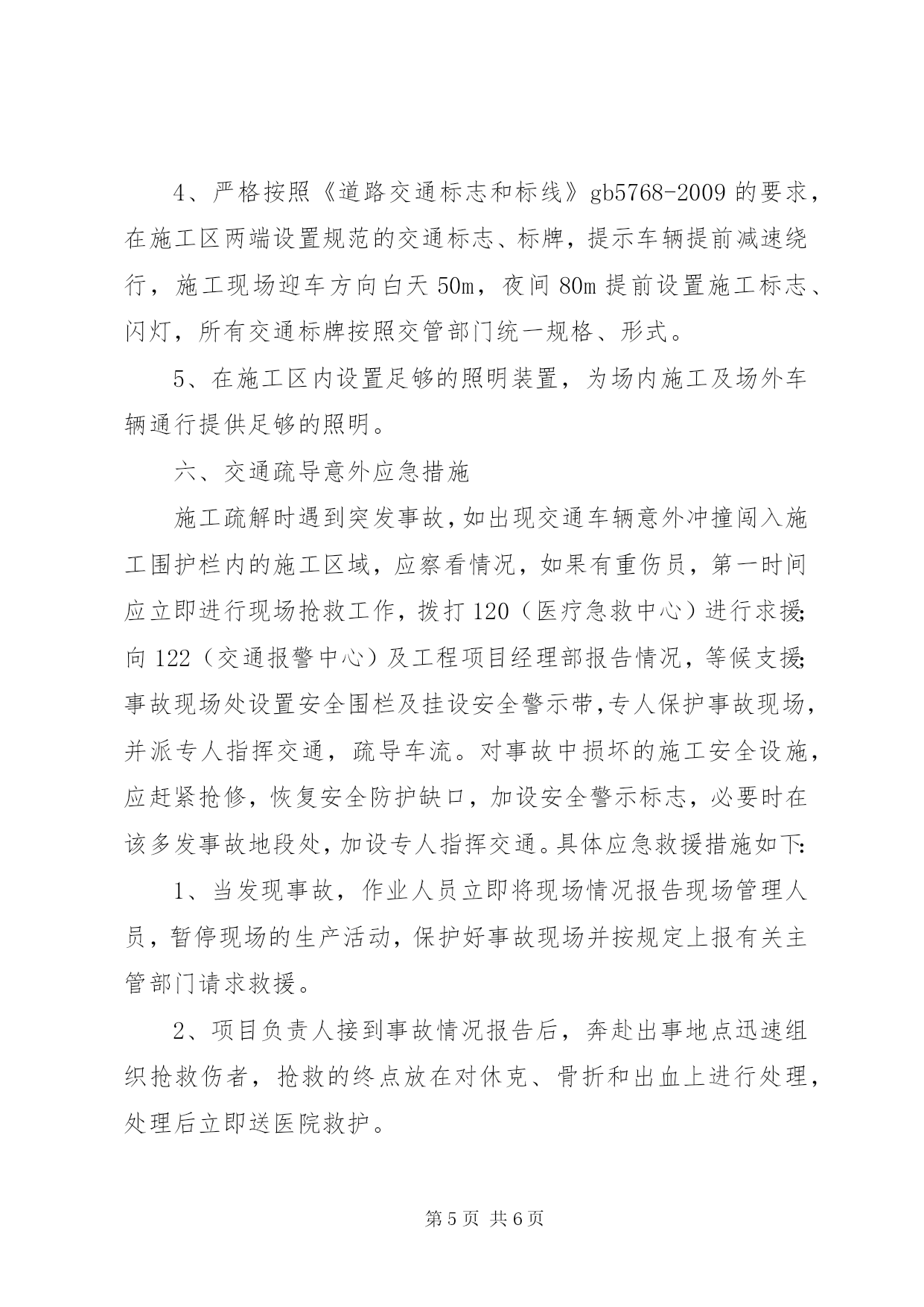第PAGE\*Arabic\*MERGEFORMAT6页共NUMPAGES\*MERGEFORMAT6页江湾路交通疏导方案[定稿]交通疏导方案施工单位:中铁十二局集团编制人:审核人:编制日期:年5月9日2015晋阳污水厂主干管工程长风西大街到冶峪沟桥段顶管施工交通疏导方案一、工程概况晋阳污水厂主干管工程,即河西北中部污水处理厂和南堰污水处理厂场外干管终点至晋阳污水处理厂的污水主干管,其中Ⅰ、Ⅱ标段,主干管道全长7.554km,外接南堰污水处理厂支线管总长1.477km。工程起点为河西北中部污水厂,污水干管横穿新晋祠路,沿新晋祠路西侧绿化带向南延伸至长风西大街,再斜穿至道路中心并沿新晋祠路道路中线延伸至冶峪沟桥。本项目沿线单位、小区、商铺及部分市场进出通道与拟建工程道路平面交叉较多,车流量与人流量较多。结合设计图纸和现场踏查,为减少施工与交通间的干扰,施工区域实行全封闭作业,实行施工区与交通车道分开,即在施工作业范围设置施工围蔽,力求做到互不干涉。当施工与正常交通有冲突时,要先服从交通后安排施工。施工时要兼顾到交通的疏导情况,尽量将对沿线单位、小区、商铺及部分市场进出通道的交通影响降到最低。二、本疏导方案遵循原则:在新晋祠路南北向禁止通行的情况下,以不影响现东西向通行能力为原则,严格按照导行措施及交通导行方案进行,疏导期间在行车道上游设明显的、统一的导向警示标志。三、施工期间交通组织方案工作区范围,即从新晋祠路与长风西大街交界处南侧至新晋祠路与冶峪沟桥交界处南侧,该段南北方向禁止车辆通行。在该段所有十字交叉路口对道路实行全封闭(包含机动车道和非机动车道),禁止所有车辆南北向通行,只允许东西向通行;在丁字交叉路口封闭机动车道,车辆和行人利用非机动车道通行,通过安全通道到达对面路口。四、交通疏导维护措施1、围蔽措施1)根据现场施工环境情况,用2米高的彩钢板固定在钢柱框架上,安置于施工区域与车辆行驶区域分界线上,用塑料水码进行围护。2)在围墙上,水平方向等间距贴两道反光膜,以保证车辆夜间行驶安全。3)在封闭区域两端及交叉路口设置闪光警示灯。4)十字路口、交叉路口设置各种安全警示牌、车辆行驶导向牌,车流量大的重要路口设置专人疏导交通。2、交通维护措施1)积极与当地各级行政及公安交警部门配合,在规定位置与本工程各通道与地方道路交汇处和入口设置施工围蔽和交通标志牌,指示过往行人、车辆通行,各通道入口处夜间设置警示灯。2)防止车辆及非施工人员进入施工现场,在施工护栏上及施工区前来车方向设置警示标志及警示灯,以策安全。3)设专职交通协管人员,疏解现场车辆通行,保证临时交通通道顺畅。4)施工材料堆放及机械设备的停放一律在施工范围内,不占用行车通道,确保车辆顺利通过,不阻塞交通。5)科学安排工地的车辆出入工地。安排工地的运输车辆尽量在晚上交通低峰期出入工地。6)在施工范围的路口处设置明显的交通标志,引导车辆渠化分流,交通标志所用材料采用当地交通设施标志指定用材,交通疏解员分班全天候疏导交通。7)施工期间,我部成立疏导小组,设组长1名,副组长2名,组员12人,在各路口分别维持交通,交通疏解小组每天由组长根据项目的进度安排布置交通组织方案,副组长负责各自管理范围内交通组织落实、管理、巡查。发现有阻碍交通的障碍物或道路损坏时,及时进行清理或维修。8)路口设置明显的交通标志,指挥车辆渠化分流。交通疏导员分班全天侯指挥交通,上班时穿反光马甲佩戴袖章,装备指挥旗和对讲机,按交通知识牌和交警部门批准的疏导方案指挥车辆行使。建立与交警部门联系的直通道,即使反映现场交通情况。在节假日、上下班高峰期请交警到现场帮助指挥,当遇到严重堵车时,及时请交警到现场指挥并按应急方案进行分流。施工现场合理地安排进出车道,工程车严格按指示和指挥行使,礼让其他车辆。9)加强与当地政府、沿线单位的沟通联系,听取他们的意见,取得他们的支持。五、交通安全保证措施1、施工过程中坚决贯彻。“安全第一,预防为主”的方针,必须严格贯彻执行各项安全组织措施,切实做到安全文明施工。2、借鉴类似项目的施工经验,结合本工程周边区域的实际情况编制切实可行的交通疏导方案,并委派具有相关工作经验的负责人进行落实,密切配合交管部门,在需要导行的路口设置交通标志牌和安全宣传牌,并设专职交通协管员,协助交管部门疏导行人和车辆,确保交通安全和施工安全。3、施工管理人员必须对所有作业人员进行安全教育、纪律教育,不断提高所有施工管理人员和作业人员的安全意识和安全防范意识;施工管理人员必须及时下达各项工序的安全交底。4、严格按照《道路交通标志和标线》gb5768-2009的要求,在施工区两端设置规范的交通标志、标牌,提示车辆提前减速绕行,施工现场迎车方向白天50m,夜间80m提前设置施工标志、闪灯,所