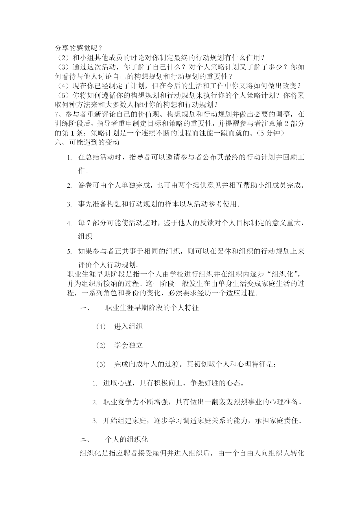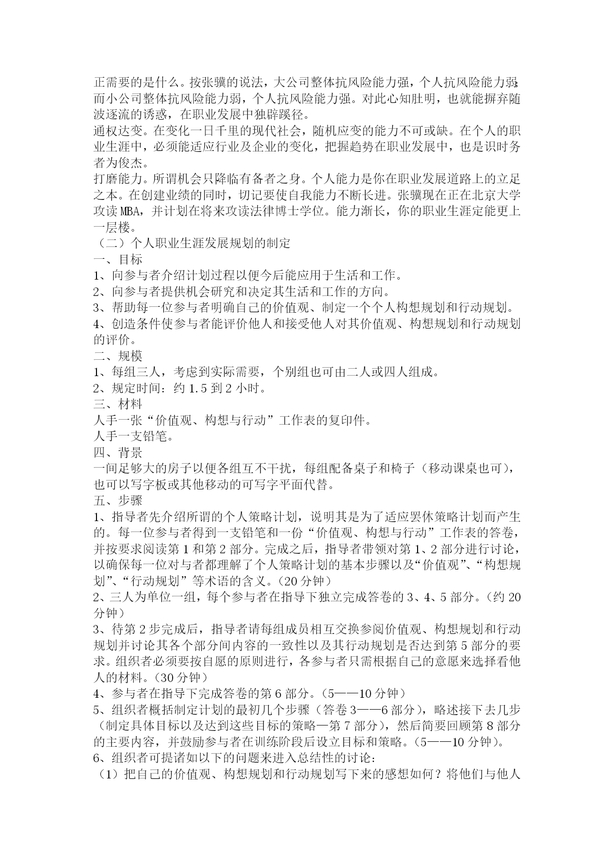 职业选择理论职业具有3个关键功能:“一是给人们提供一个发挥和提高自身才能的机会;二是通过和别人一起共事来克服自我中心的意识;三是提供生存所需的产品和服务。”(一)职业声望与职业分层职业声望(OccupationalPrestige)是人们对职业社会地位的主观评价,是职业生涯管理学研究的重要范畴之一。职业地位是由不同职业所拥有的社会地位资源所决定,但是它往往通过职业声望的形式表现出来。影响职业声望的因素有多种,主要影响因素有:(1)职业环境,包括职业的自然环境和社会环境如工作的技术条件、空间环境、劳动强度、工资收入、福利待遇、晋升机会等;它是任职者所能获得的工作条件与社会经济权利的总和。(2)职业功能,是该职业对国家的政治、经济、科学、文化水平的意义以及在社会生活中对人们的共同福利所担负的责任。(3)任职者的素质要求,如文化程度、能力、道德品质等;职业环境越好,职业功能越大,任职者素质要求越高,职业声望就越高。职业声望在一定时期具有相对稳定性,但在不同社会经济发展阶段、不同经济文化背景的群体和不同年龄性别的群体对同一职业的评价也会存在明显差别。(二)职业期望与职业成功职业期望,也称职业意向,是劳动者自己希望从事某项职业的态度倾向,也就是个人对某一项职业的希望、愿望和向往。职业期望是个人职业价值的直接反映,职业价值观是个人对某一职业的价值判断。每个人的职业价值观不同,因而对某一职业的评价和取向也会不同。这就是所谓的职业价值观。萨柏曾经将人们的职业价值观概括为15种类型:(1)助人。(2)美学。(3)创造。(4)智力刺激。(5)独立。(6)成就感。(7)声望。(8)管理。(9)经济报酬。(10)安全。(11)环境优美。(12)与上级的关系。(13)社交。(14)多样化。(15)生活方式(吴国存,1999)。选择和设计了7种价值取向:(1)能推动社会发展的职业。(2)助人、为社会服务的职业。(3)得到人们的高度评价的职业。(4)受人尊敬的职业。(5)能赚钱的职业。(6)虽平凡但有固定收入的职业。(7)若不为人所用,就自谋职业。职业生涯成功是个人职业生涯追求目标的实现。德尔(C.BrooklynDerr,1988)总结出公司雇员有五种不同的职业生涯成功方向:进取型——使其达到集团和系统的最高地位;安全型——追求认可、工作安全、尊敬和成为“圈内人”;自由型——在工作过程上得到最大的控制不是被控制;攀登型——得到刺激、挑战、冒险和“擦边”的机会;平衡型——在工作、家庭关系和自我发展之间取得有意义的平衡,以使工作不至于变得太耗精力或太乏味。系统地阐述了四种职业生涯成功的标准:(1)一些人将成功定义为一种螺旋型的东西,不断上升和自我完善(攀登型)。(2)一些扎实的人需要长期的稳定和相应不变的工作认可(安全型)。(3)还有一些是暂时的——他们视成功为经历的多样性(自由型)。(4)直线型的人视成功为升入组织或职业较高阶层(进取型)。职业生涯成功与家庭生活成功之间也有着非常密切的关系。个人与家庭发展遵循着并行发展的逻辑关系,职业生涯的每一阶段都与家庭因素息息相关,或协调或冲突。要对职业生涯成功进行全面的评价,必须综合考虑个人、家庭、企业、社会等各方面的因素。有人认为职业生涯成功意味着个人才能的发挥以及为人类社会做出贡献,并认为职业生涯成功的标准可分为“自我认为”、“社会承认”和“历史判定”。三、职业选择理论(一)帕森斯的职业一人匹配论明确阐明职业选择的三大要素和条件:(1)应该清楚地了解自己的态度、能力、兴趣、智谋、局限和其他特征。(2)应清楚地了解职业选择成功的条件,所需知识,在不同职业工作岗位上所占有的优势、不利和补偿、机会和前途。(3)上述两个条件的平衡。帕森斯的理论内涵即是在清楚认识、了解个人的主观条件和社会职业岗位需求条件的基础上。职业一人匹配,分为两种类型:(1)条件匹配。即所需专门技术和专业知识的职业与掌握该种特殊技能和专业知识的择业者相匹配;或者脏、累、险劳动条件很差的职业,需要吃苦耐劳、体格健壮的劳动者与之相匹配。(2)特长匹配。即某些职业需要具有一定的特长,如具有敏感、易动感情、不守常规、有独创性、个性强、理想主义等人格特性的人,宜于从事审美性、自我情感表达的艺术创作类型的职业。(三)霍兰德的职业性向理论职业归属为6种典型的“工作环境”中的一种。1、现实的:建筑、驾驶卡车、农业耕作。2、调查研究性的:科学和学术研究。3、艺术性的:雕刻、表演和书法。4、社会性的:教育、宗教服务和社会性工作。5、开拓性的:销售、政治和金融。6、常规性的:会计、计算机技术药理学。职业性向(包括价值观、动机和需要等)是决定一个人选择何种职业的重要因素。霍兰德的职业性向理论,实质