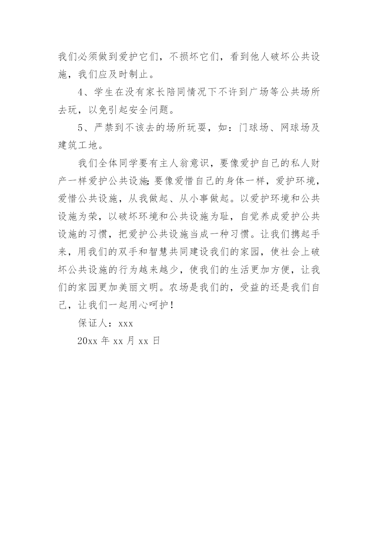 爱护公共财物保证书爱护公共财物保证书在当今社会生活中,保证书在我们的生活中并不鲜见,保证书的具体行文需依照一般书信的格式。我们应当如何写保证书呢?下面是小编收集整理的爱护公共财物保证书,欢迎阅读,希望大家能够喜欢。爱护公共财物保证书1有一片洁净的天空,雄鹰才能翱翔;有一片蔚蓝的海洋,鲸鱼才能遨游;有一个设施完备、美丽、文明的校园,学生才能在知识的海洋中扬帆起航!面对越来越美的校园环境,日益完善的教学设施,我们承诺:爱护公物,从我做起。让我们悉心爱护桌椅,不乱涂乱画;合理利用多媒体设备,不在液晶屏幕前打闹、戳划,手持硬物绕道走,以免划伤屏幕;花草树木,勿践踏攀折。爱护公物,从小事做起。不在雪白的墙壁上蹬踏留痕;不让无辜的碗筷凹陷缺损,更不让粉笔在校园各处身首异处、粉身碎骨。爱护公物,从身边做起。随手关灯,节约每一度电;文明用水,拧紧水龙头,节约每一滴水;捡起地上的纸屑和饮料瓶,保持环境卫生。对于身边一切破坏公物的行为,勇于揭发、制止;对于亵渎文明一切行为,敢于批评指正。要像爱护自己的眼睛一样,爱护学校的一草一木;要像珍惜自己的眼睛一样,珍惜学校的一点一滴;让爱护公物成为我们每个老师、同学的自觉行动;让爱护公物成为我们每个老师、同学的良好习惯;让我们携起手来,杜绝损坏公物的行为。爱护公物,从身边做起,从小事做起,从我做起。保证人:xxx20xx年xx月xx日爱护公共财物保证书2同学们大地之母给予了我们生存的环境,可爱的校园给予我们"学习栖身"之所。我们应该保护它们,j而不能破坏。让我们从身边的事做起"保护环境卫生,爱护公共设施"。不让我们的绿色的草坪、别致的`花坛被践踏,井盖、垃圾箱以及街边健身设备、路灯等公用设施不要被毁容,不要随手丢垃圾,不要随扣吐痰,不浪费水资源,不闯红灯,遵守交通规则,保护环境,爱护公共设施。公共设施是每个公民共同享有的公共服务资源,它是为大家服务的,需要我们共同来爱护和维护,这应该既是一种自觉行动,也是一种社会美德。全体学生必须按照学校要求进行承诺:1、每个人从自身做起,做一个讲文明、讲卫生的小学生,不管在家、在校、还是在社区、楼道、在广场,我们都应该养成良好的讲卫生习惯。做美好环境的保卫者。2、要学会保持好周围的环境。珍惜别人的劳动成果。不随地吐痰,乱扔垃圾不践踏草坪。3、公共设施是大家的,并不是我们各人所有的。因此,我们必须做到爱护它们,不损坏它们,看到他人破坏公共设施,我们应及时制止。4、学生在没有家长陪同情况下不许到广场等公共场所去玩,以免引起安全问题。5、严禁到不该去的场所玩耍,如:门球场、网球场及建筑工地。我们全体同学要有主人翁意识,要像爱护自己的私人财产一样爱护公共设施;要像爱惜自己的身体一样,爱护环境,爱惜公共设施,从我做起、从小事做起。以爱护环境和公共设施为荣,以破坏环境和公共设施为耻,自觉养成爱护公共设施的习惯,把爱护公共设施当成一种习惯。让我们携起手来,用我们的双手和智慧共同建设我们的家园,使社会上破坏公共设施的行为越来越少,使我们的生活更加方便,让我们的家园更加美丽文明。农场是我们的,受益的还是我们自己,让我们一起用心呵护!保证人:xxx20xx年xx月xx日