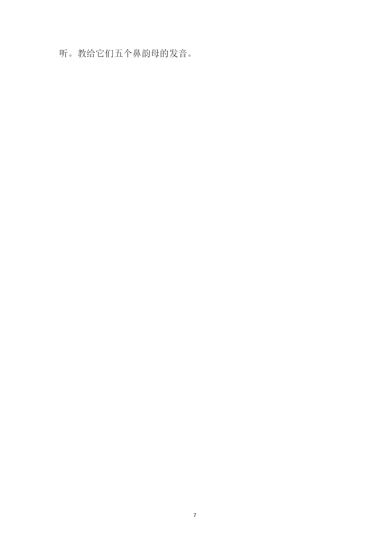 PAGEPAGE7《aneninunün》教学设计教学目标:1.正确掌握五个前鼻韵母aneninunuuml;n的发音方法,认识两个整体认读音节yinyun。体会拼音识字的乐趣,乐意拼读。2.练习与学过的声母相拼,巩固、认识班、人、林、村、军、音、云等字,正音。3.以富有趣味的练习,巩固所学的知识,同时培养学生动脑、动口、动手以及相互合作的能力。教学重难点:掌握五个前鼻韵母的发音位置和发音方法,正确与声母相拼。教与学活动过程:一、复习学过的拼音。1.师:同学们,你们结识的拼音朋友今天被老师请来了一些,请大家一起叫出它们的名字吧。2.电脑依次出示声母、韵母和音节。学生齐读,教师及时正音,相机评价。ncfdaiiueroushuǐ水f浮kui快yu月二、故事导入,激发兴趣。1.师:同学们表现得棒极了,老师决定送给大家一个有趣的童话故事听,你们可要用心来听呀,因为这个故事会教给你新知识的。2.(师边讲边出示配乐电脑课件)老师要讲的是《门的故事》:从前有一位兔妈妈,有五个孩子。老大是小ɑ、老二叫小e、老三是小i、老四叫小u、最小的是小。一天,兔妈妈把五个孩子叫到跟前对他们说:孩子们,我在一家商店里为咱们家的新房子订了一扇门,你们五个今天得把它运回来安上。妈妈的话音刚落,老大小ɑ就抢先说:我是老大,我来负责安(an)门。接着小e说:好吧,你安好了门,我负责在门上安一个用手一摁(en)就响的门铃。这时小连忙说:我最小,我负责把门运(n)回来,可去那家商店的路我不认识呀。就在小为难时,小i开口了;没关系,我认识,我来给你引(in)路。这时小u急了,问:我干什么呀妈妈说:你呀,负责解决最后一个大问(un)题,给门安上锁吧。孩子们赶紧行动吧,把门安好了,妈妈奖励每人一个大鸭梨。于是五个孩子七手八脚地忙起来,没过多时,一扇漂漂亮亮的大门安在了小兔子家的新房子里。三、回忆故事,准确认读。1.学习an的发音。(1)师:同学们记住这个故事了吗让我们一起来回忆一下吧。看,这是兔妈妈(在黑板上贴出兔妈妈的画片),老大小ɑ负责干什么呢(贴出小ɑ的画片)(2)学生答:安门,师板书:an(3)师:因为是小ɑ负责安门,所以读an时要先摆出小ɑ的口型,让声音从鼻子里发出来。(4)师范读,学生边听边观察口型。(5)学生练读。先自读找感觉再指名读,然后分小组读an的四声。(6)拼读b-an-bān(班)2.学习en的发音。(1)师:谁记得小e给门安了一个什么样的门铃(贴出小e的画片)(2)(指名答)师相机板书:en(3)师领读。(4)(指名)说说老师是怎样发出en的音的(5)同位相互练读,注意观察口型和舌头的位置是否正确。(6)喜欢读en的几声的同学就站起来读一读。(7)拼读r-en-rn(人)3.学习un的发音。(1)师:最后一个大问题是谁解决的(2)(指名答)师相机贴小u的画片,并板书:un(3)学生齐读找感觉。(4)认为un的几声最美就起来读一读,并说说是怎样读出来的。(5)拼读c-un-cūn(村)4.学习inn发音。(1)师:小和小i负责干什么呢谁能上来讲一讲,领着大家读一读(贴出小和小i的画片)(2)(指名)到前面领读n和in(3)认为它们的几声最难读,就来读一读,要敢于向困难挑战!(4)相机拼读l-in-ln(林)、j-n-jūn(军)什么军(启发扩词)5.认识整体认读音节yin和yun。(1)电脑出示yinyun(2)会读的一起读。(3)指名读音和云。四、趣味练习,提高能力。1.看图拼读词语。(1)师:小朋友们学拼音学得真好。你们都很聪明。看这儿有些漂亮的卡片大家想拼一拼吗(2)出示卡片,鼓励学生自己拼读对照插图检查。(3)指名领拼再指名拼读,并将每一张卡片送给拼读准确的同学,激励课后带领同学拼读。2.介绍好朋友。(1)师:有几个同学想把自己的好朋友介绍给大家,请他们上台来。(2)指四名同学拿着写有好朋友名字的卡片上台。(3)生:请大家拼一拼我的好朋友是谁(4)学生自由拼,读出名字。(名字音节中的韵母及整体认读音节都与本节所学的有关)(5)台上同学领拼。(6)介绍好朋友的特点,如:王times;times;皮肤很白,身材有些胖。她讲的故事可好听了。希望同学们都和她成为好朋友。(7)逐个介绍:张times;times;马times;times;李times;times;边times;times;3.小组合作拼读、摆字、组句。(1)师:老师也愿意与每个同学成为好朋友,互相学习。下面每个小组奖励一个大礼包。(2)师发给每组学生一张设计成水果形状的卡纸和组句用的生字卡片。(3)提要求:小组里需要小组长组织大家合