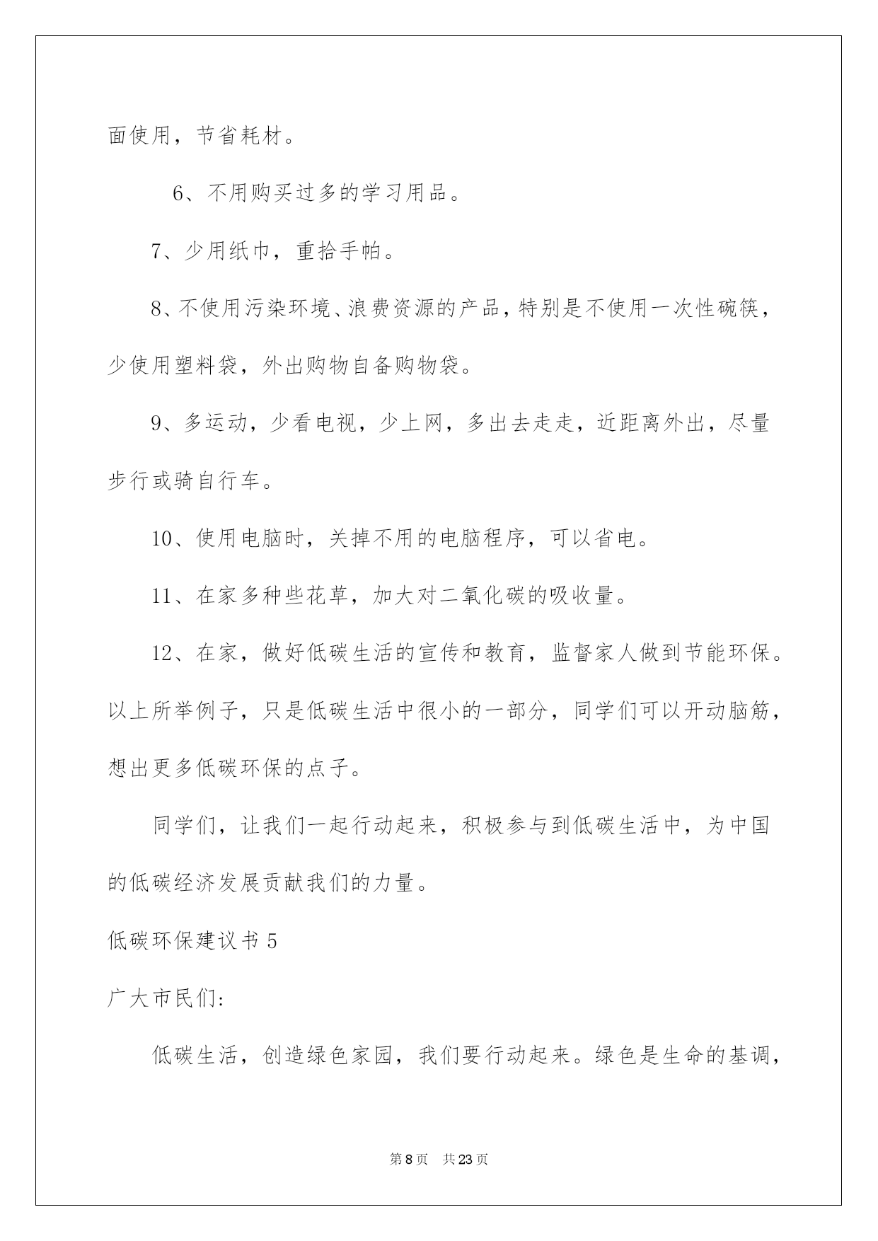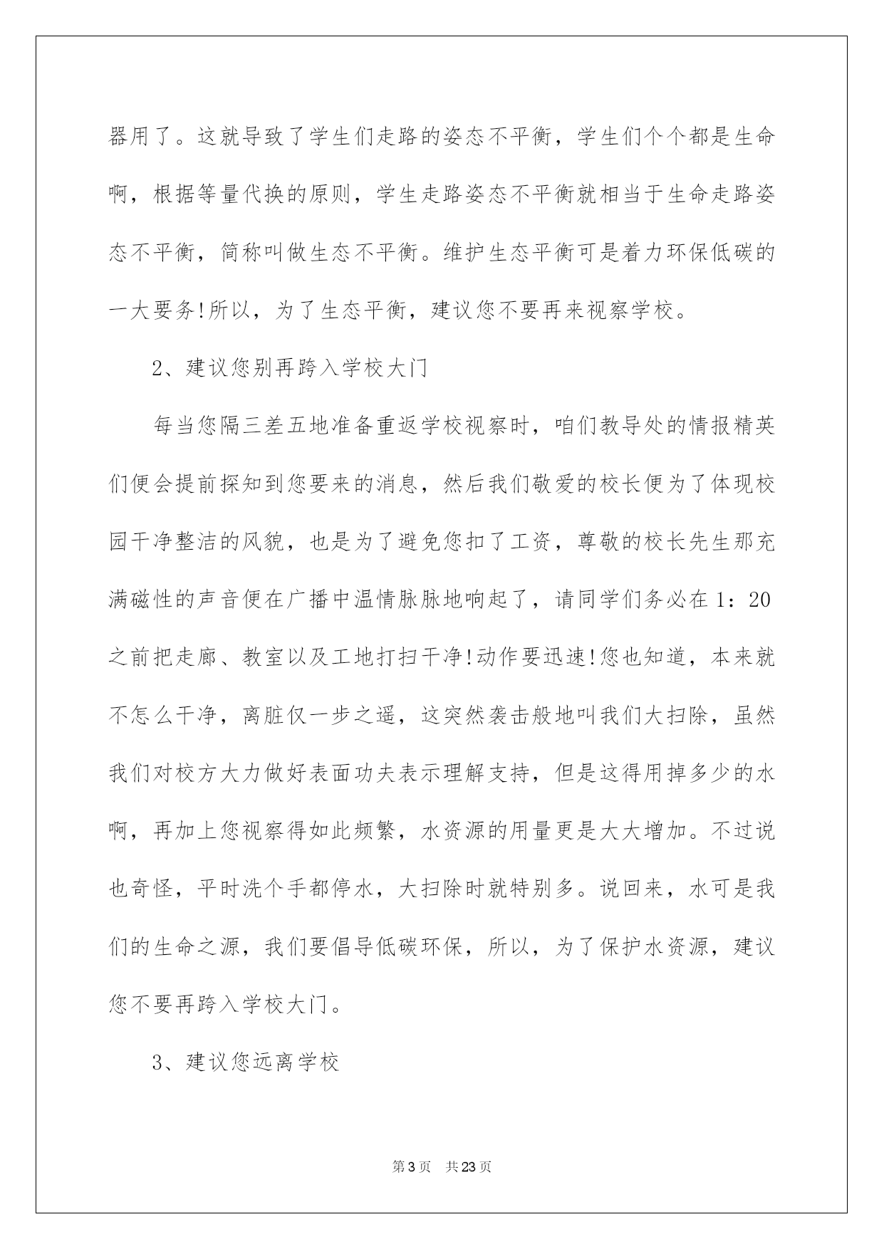 第PAGE\*Arabic\*MERGEFORMAT23页共NUMPAGES\*Arabic\*MERGEFORMAT23页第PAGE\*MERGEFORMAT23页共NUMPAGES\*MERGEFORMAT23页第PAGE\*MERGEFORMAT23页共NUMPAGES\*MERGEFORMAT23页第PAGE\*MERGEFORMAT23页共NUMPAGES\*MERGEFORMAT23页第PAGE\*MERGEFORMAT23页共NUMPAGES\*MERGEFORMAT23页第PAGE\*MERGEFORMAT23页共NUMPAGES\*MERGEFORMAT23页第PAGE\*MERGEFORMAT23页共NUMPAGES\*MERGEFORMAT23页第PAGE\*MERGEFORMAT23页共NUMPAGES\*MERGEFORMAT23页第PAGE\*MERGEFORMAT23页共NUMPAGES\*MERGEFORMAT23页第PAGE\*MERGEFORMAT23页共NUMPAGES\*MERGEFORMAT23页第PAGE\*MERGEFORMAT23页共NUMPAGES\*MERGEFORMAT23页2022低碳环保建议书低碳环保建议书在日常生活和工作中,需要使用建议书的事情愈发增多,建议书是单位或集体向有关单位或上级机关和领导,就某项工作提出某种建议时使用的一种常用书信。那么你有了解过建议书吗?以下是我整理的低碳环保建议书,欢迎大家借鉴与参考,希望对大家有所帮助。低碳环保建议书1各位同学们,老师们:学校的环境不是很好,有人随意的吐痰,乱丢纸榍,上课用完的鞋套乱丢,乱踩小草。我对大家提一点建议。1;吐痰吐在垃圾桶。2;把纸榍扔在垃圾桶3;上课用玩的鞋套仍在垃圾桶。4;不可以乱踩小草。上面是我的建议,为了我们在一个干净舒适的环境里学习,请大家加油!此致敬礼!建议人:xxx日期:20xx年x月x日低碳环保建议书2尊敬的领导:您好!我是一名遵纪守法的好学生。介于本市大力倡导低碳环保。身为城市的一份子,我怎能不为低碳出上一把力?所以,我有以下几点建议,希望敬爱的领导看一看:1、建议您不要再来学校视察为了体现本校文明、知礼的良好校风,每次您一来视察,教导主任便会在广播中不厌其烦地友情提示大家,到时候见了领导一定要九十度弯腰加微笑,再敬礼问声好。本来,临时做一做表面功夫,大家都还是表示体谅,但是您视察得如此之频繁,每次又带那么大一帮子人,学生们都练成了条件反射,弯腰都弯成直角了,直接可以当量角器用了。这就导致了学生们走路的姿态不平衡,学生们个个都是生命啊,根据等量代换的原则,学生走路姿态不平衡就相当于生命走路姿态不平衡,简称叫做生态不平衡。维护生态平衡可是着力环保低碳的一大要务!所以,为了生态平衡,建议您不要再来视察学校。2、建议您别再跨入学校大门每当您隔三差五地准备重返学校视察时,咱们教导处的情报精英们便会提前探知到您要来的消息,然后我们敬爱的校长便为了体现校园干净整洁的风貌,也是为了避免您扣了工资,尊敬的校长先生那充满磁性的声音便在广播中温情脉脉地响起了,请同学们务必在1:20之前把走廊、教室以及工地打扫干净!动作要迅速!您也知道,本来就不怎么干净,离脏仅一步之遥,这突然袭击般地叫我们大扫除,虽然我们对校方大力做好表面功夫表示理解支持,但是这得用掉多少的水啊,再加上您视察得如此频繁,水资源的用量更是大大增加。不过说也奇怪,平时洗个手都停水,大扫除时就特别多。说回来,水可是我们的生命之源,我们要倡导低碳环保,所以,为了保护水资源,建议您不要再跨入学校大门。3、建议您远离学校记得又一次,您心血来潮,要视察我们的课间活动。这下可累坏了我们校导。虽然平时没什么课间活动,但表面功夫一定要做够做足,抱抱佛脚,说不定还要领个奖金什么的。三十几度的天,全校学生练习狂奔,汗水就哗哗地流,热气也蹭蹭地上窜。据说,这是导致全球变暖的几大重要问题之一。您说,您就来看这么一眼,导致了全球变暖,多不低碳。这便是我的建议。我知道,在您看了如此中肯的建议之后,一定会问我的名字,但是我寇宏微做了好事之后是从来不会留名的,这是原则。但是,按照惯例,我还是得加上一句:我叫绿领巾。至此。敬礼!一位好学生低碳环保建议书3地球气候变暖已日益成为危及人类生存的严重问题。频繁发生的灾害性气候所引发的泥石流、暴风雨雪、不断上升的海平面、逐渐消逝的冰川已经给人类生存带来了巨大的威胁。为此,我们向全体家长和幼儿发出“关爱地球、还我绿色”的倡议,号召全体行动起来,做到:一、在日常工作和生活中,时时刻刻注意节