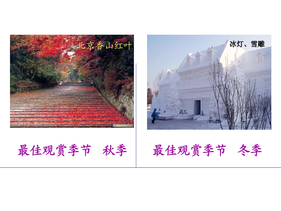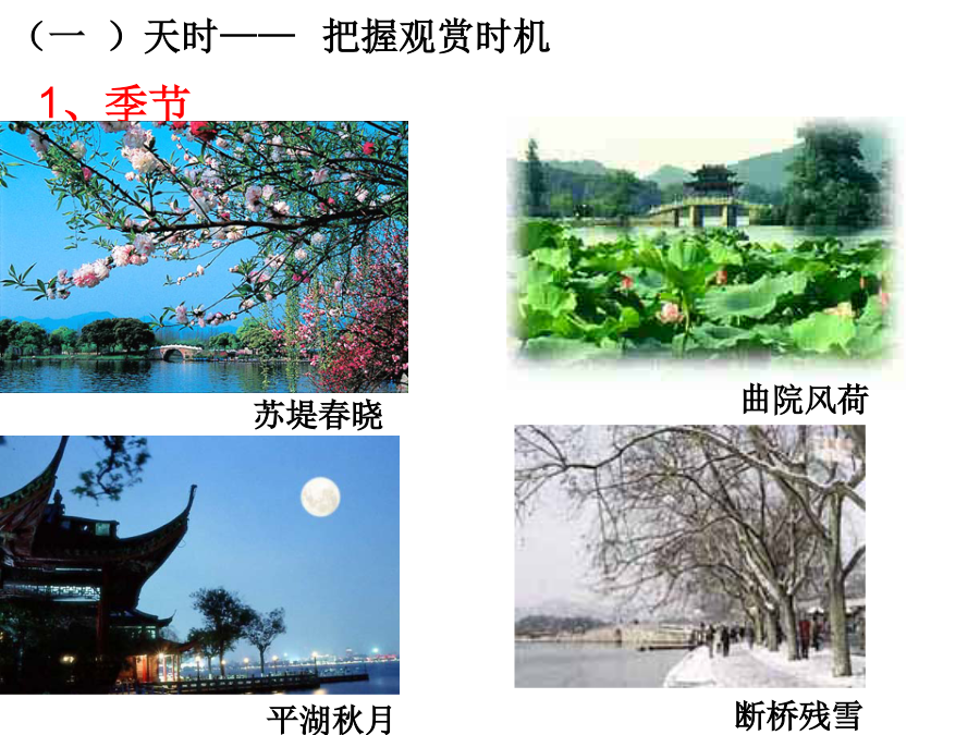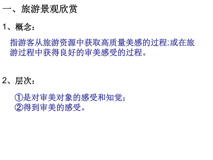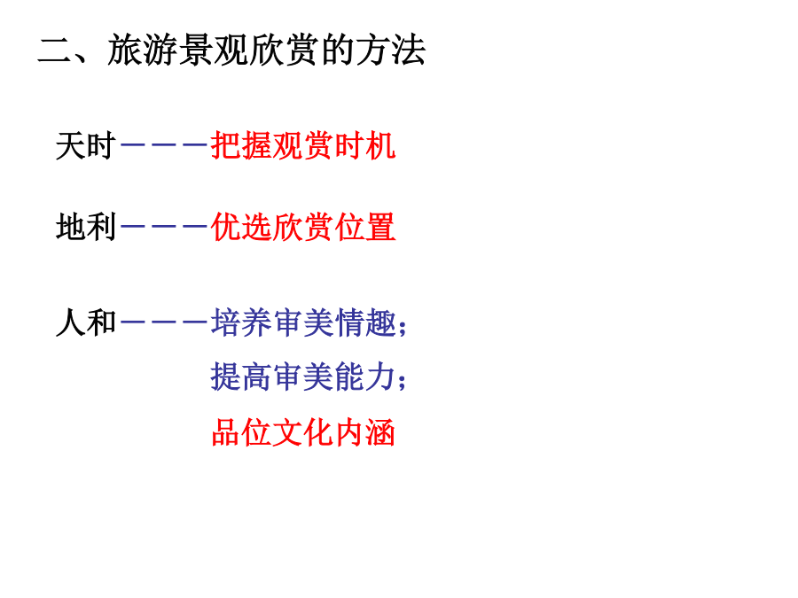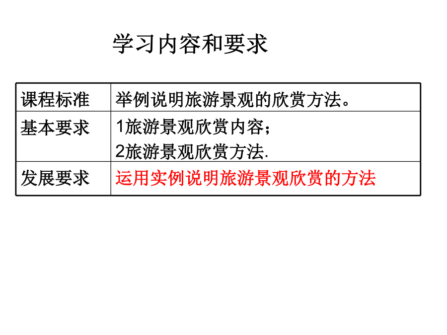 2.1旅游景观欣赏方法学习内容和要求一、旅游景观欣赏二、旅游景观欣赏的方法(一)天时——黄山泰山日出峨眉山佛光钱塘江大潮神女峰3、俯仰3、俯仰3、俯仰4、运动千峰万壑——地貌的酷似造型——峡谷、山洞、一线天——瀑布景观——江河湖海——湖沼池塘——山水组合景观——(三)人和赵州桥位于河北赵县洨河上,建于隋代,距今已有1400多年历史,是著名匠师李春建造,它是世界上建造最早.现存最早、保存最好.单孔跨径(跨径37.02米)最大敞肩型(桥两端肩部各有二个小孔)石拱桥,改变了我国大石桥多为半圆形拱的传统,采用圆弧拱形式。1961年被国务院列为第一批全国重点文物保护单位。1991年,美国土木工程师学会将赵州桥选定为第12个“国际历史土木工程的里程碑”.例1:简答如何欣赏下列景观以达到最好的效果。(1)黄山石猴观海(2)庐山瀑布(3)北京石花洞(4)桂林山水例2:假如你是一位导游,现在有一位北京的旅客想乘火车游览下列景点,最后返回北京,请你设计一条合理的旅游路线。要求:走近路,不走重复路。