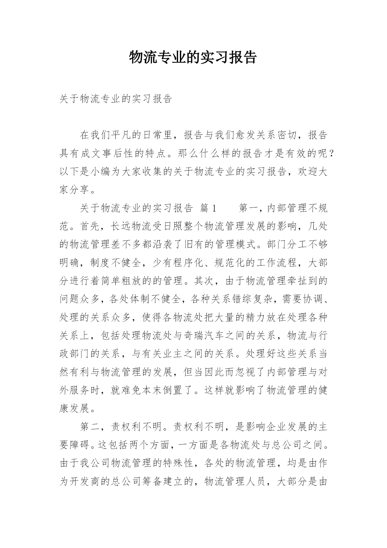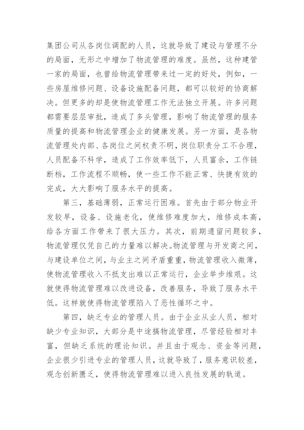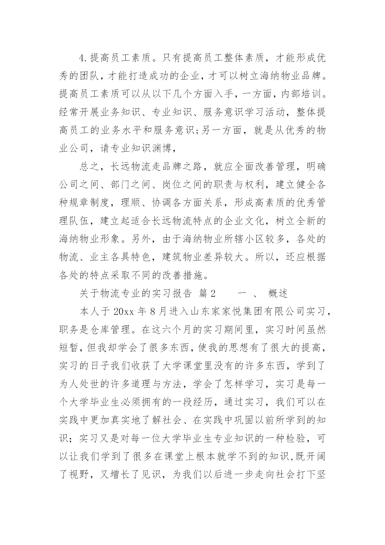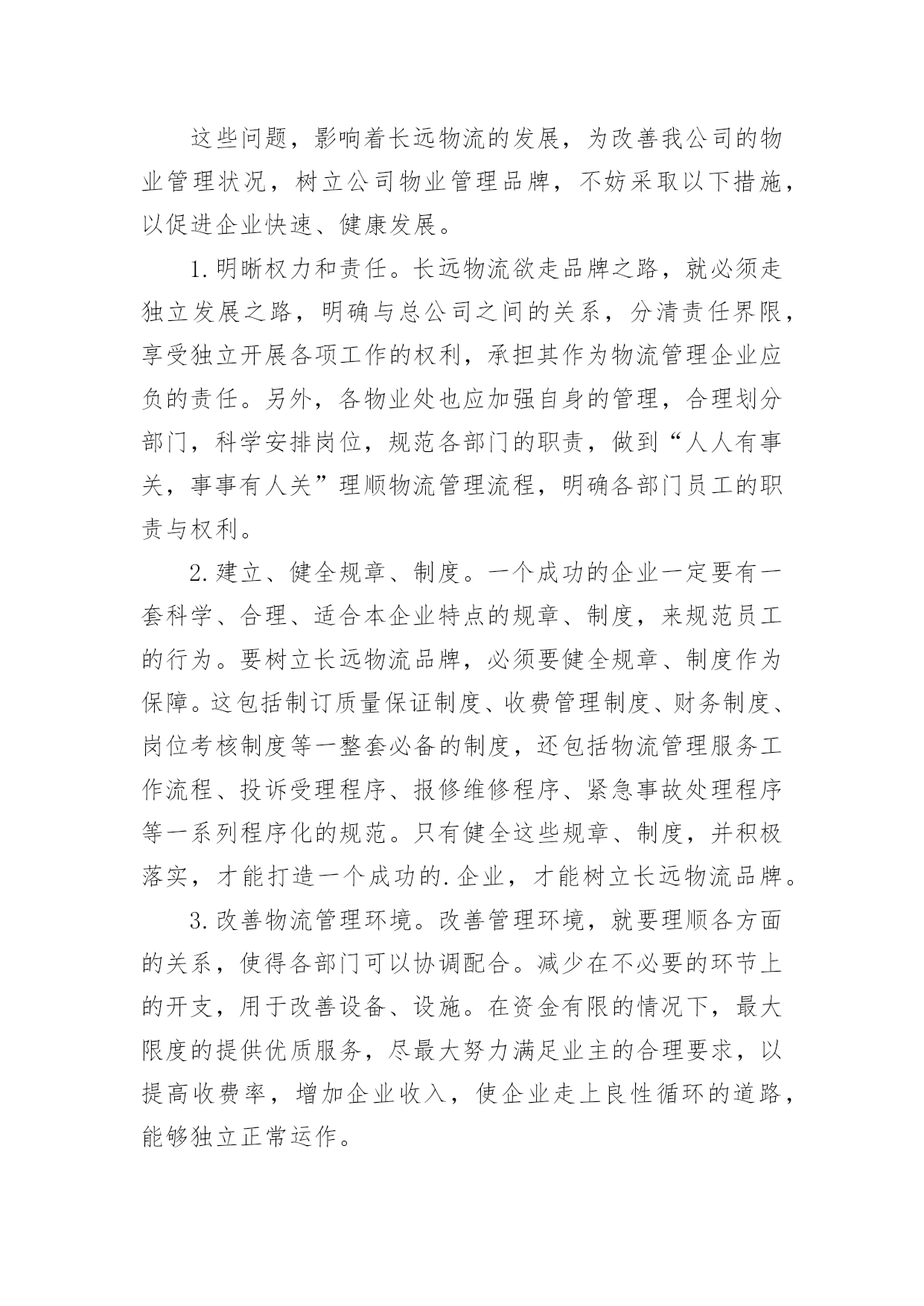 物流专业的实习报告关于物流专业的实习报告在我们平凡的日常里,报告与我们愈发关系密切,报告具有成文事后性的特点。那么什么样的报告才是有效的呢?以下是小编为大家收集的关于物流专业的实习报告,欢迎大家分享。关于物流专业的实习报告篇1第一,内部管理不规范。首先,长远物流受日照整个物流管理发展的影响,几处的物流管理差不多都沿袭了旧有的管理模式。部门分工不够明确,制度不健全,少有程序化、规范化的工作流程,大部分进行着简单粗放的的管理。其次,由于物流管理牵扯到的问题众多,各处体制不健全,各种关系错综复杂,需要协调、处理的关系众多,使得各物流处把大量的精力放在处理各种关系上,包括处理物流处与奇瑞汽车之间的关系,物流与行政部门的关系,与有关业主之间的关系。处理好这些关系当然有利与物流管理的发展,但当因此而忽视了内部管理与对外服务时,就难免本末倒置了。这样就影响了物流管理的健康发展。第二,责权利不明。责权利不明,是影响企业发展的主要障碍。这包括两个方面,一方面是各物流处与总公司之间。由于我公司物流管理的特殊性,各处的物流管理,均是由作为开发商的总公司筹备建立的,物流管理人员,大部分是由集团公司从各岗位调配的人员,这就导致了建设与管理不分的局面,无形之中增加了物流管理的难度。虽然,这种建管一家的局面,也曾给物流管理带来过一定的好处,例如,一些房屋维修问题、设备设施配备问题,都可以较好的协商解决。但更多的却是使物流管理工作无法独立开展。许多问题都需要层层审批,造成了多头管理,影响了物流管理的服务质量的提高和物流管理企业的健康发展。另一方面,是各物流管理处内部、各岗位之间权责不明,岗位职责分工不合理,人员配备不科学,造成了工作效率低下,人员富余,工作链断档,工作流程不顺畅,使一些工作不能正常、快捷有效的完成,大大影响了服务水平的提高。第三,基础薄弱,正常运行困难。首先由于部分物业开发较早,设备、设施老化,使维修难度加大,维修成本高,给各方面工作带来了很大压力。其次,前期遗留问题较多,物流管理仅凭自己的力量难以解决。物流管理与开发商之间,与建设单位之间,与业主之间矛盾重重,物流管理收入微薄,使物流管理收入不抵支出难以正常运行,企业举步维艰。这就使得物流管理难以改进设备,改善服务,导致了服务水平低。这样就使得物流管理陷入了恶性循环之中。第四,缺乏专业的管理人员。由于企业从业人员,相对缺少专业知识,大部分是中途搞物流管理,尽管经验相对丰富,但缺乏系统的理论知识。并且由于观念、资金等问题,企业很少引进专业的管理人员,这就导致了,服务意识较差,观念创新匮乏,使得物流管理难以进入良性发展的轨道。这些问题,影响着长远物流的发展,为改善我公司的物业管理状况,树立公司物业管理品牌,不妨采取以下措施,以促进企业快速、健康发展。1.明晰权力和责任。长远物流欲走品牌之路,就必须走独立发展之路,明确与总公司之间的关系,分清责任界限,享受独立开展各项工作的权利,承担其作为物流管理企业应负的责任。另外,各物业处也应加强自身的管理,合理划分部门,科学安排岗位,规范各部门的职责,做到“人人有事关,事事有人关”理顺物流管理流程,明确各部门员工的职责与权利。2.建立、健全规章、制度。一个成功的企业一定要有一套科学、合理、适合本企业特点的规章、制度,来规范员工的行为。要树立长远物流品牌,必须要健全规章、制度作为保障。这包括制订质量保证制度、收费管理制度、财务制度、岗位考核制度等一整套必备的制度,还包括物流管理服务工作流程、投诉受理程序、报修维修程序、紧急事故处理程序等一系列程序化的规范。只有健全这些规章、制度,并积极落实,才能打造一个成功的.企业,才能树立长远物流品牌。3.改善物流管理环境。改善管理环境,就要理顺各方面的关系,使得各部门可以协调配合。减少在不必要的环节上的开支,用于改善设备、设施。在资金有限的情况下,最大限度的提供优质服务,尽最大努力满足业主的合理要求,以提高收费率,增加企业收入,使企业走上良性循环的道路,能够独立正常运作。4.提高员工素质。只有提高员工整体素质,才能形成优秀的团队,才能打造成功的企业,才可以树立海纳物业品牌。提高员工素质可以从以下几个方面入手,一方面,内部培训。经常开展业务知识、专业知识、服务意识学习活动,整体提高员工的业务水平和服务意识;另一方面,就是从优秀的物业公司,请专业知识渊博,总之,长远物流走品牌之路,就应全面改善管理,明确公司之间、部门之间、岗位之间的职责与权利,建立健全各种规章制度,理顺、协调各方面关系,形成高素质的优秀管理队伍,建立起适合长远物流特点的企业文化,树立全新的海纳物业形象。另外,由于海纳物业所辖小区较多,各处的物流、业主各具特色,建筑物业差异较大。所以,还应根据各处的特点采取不同的改善措施。关于物流专业的实习报告篇2一、概述本