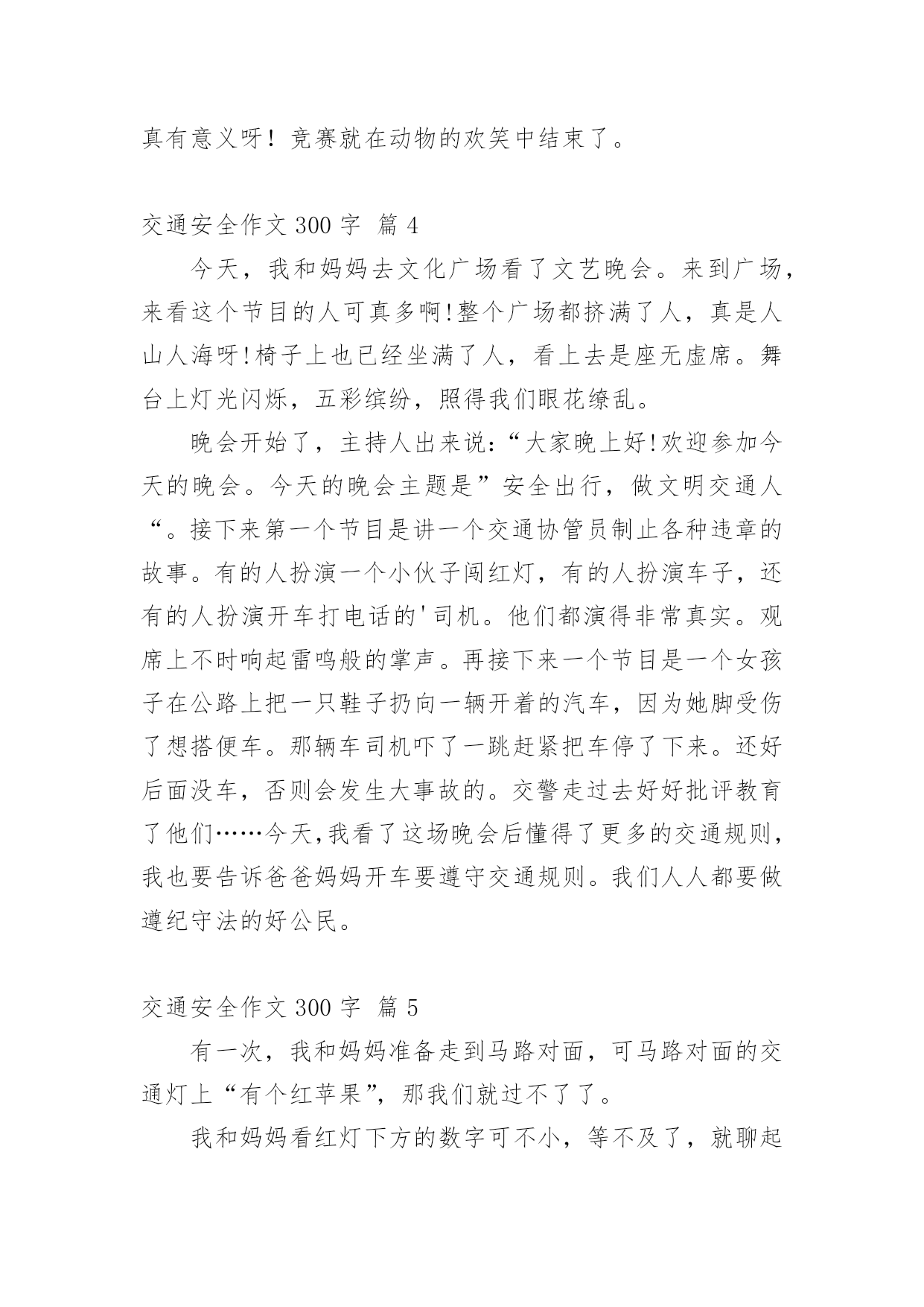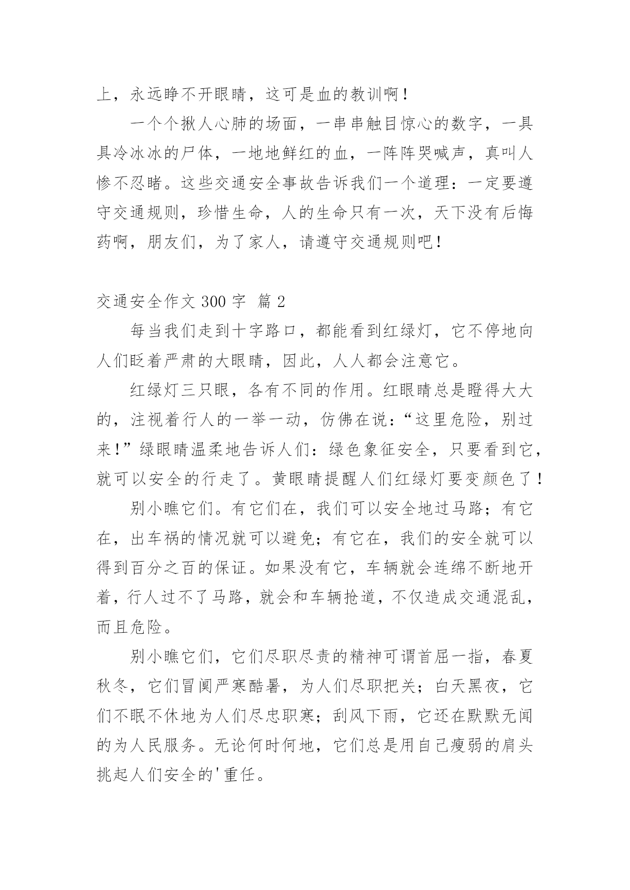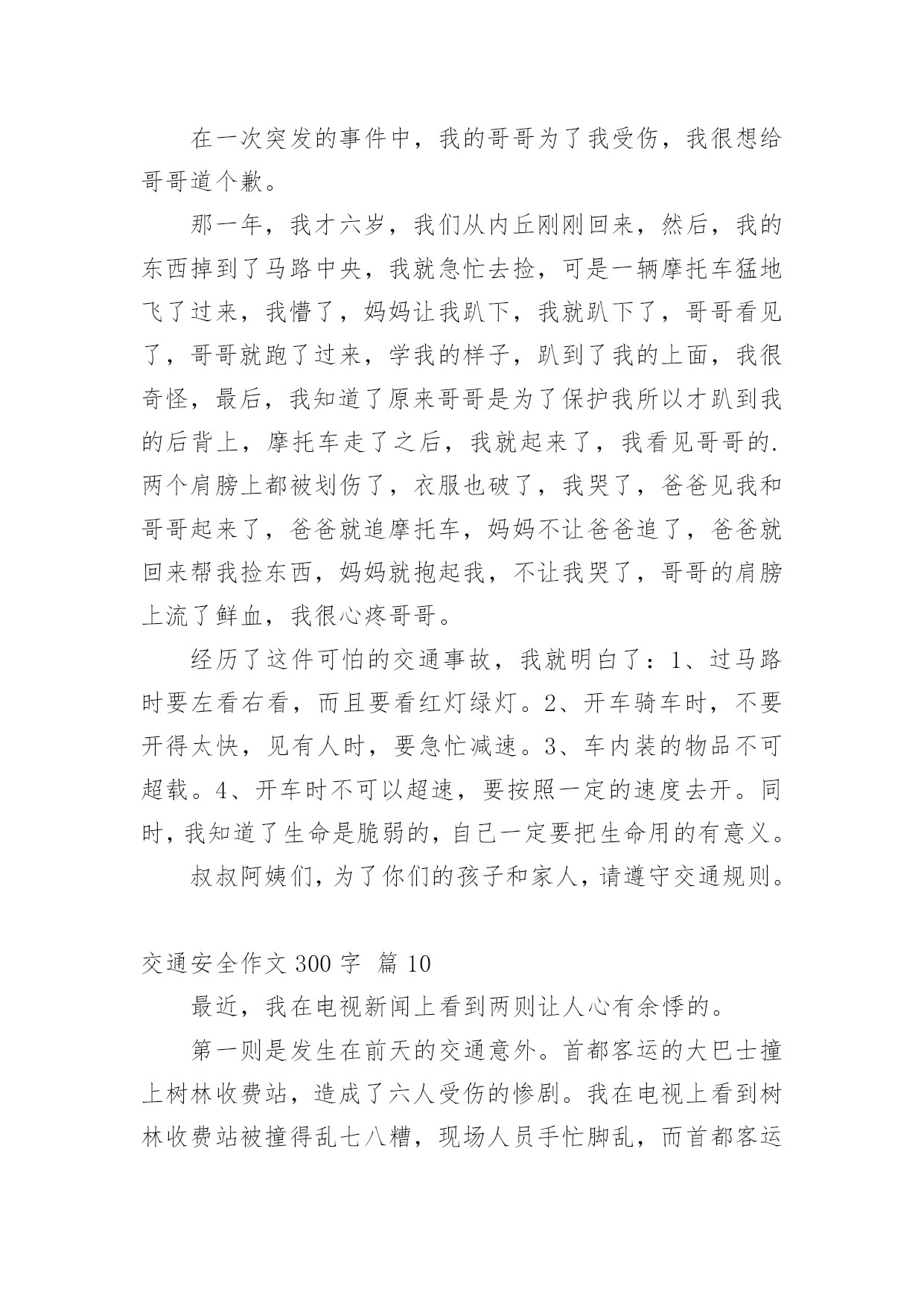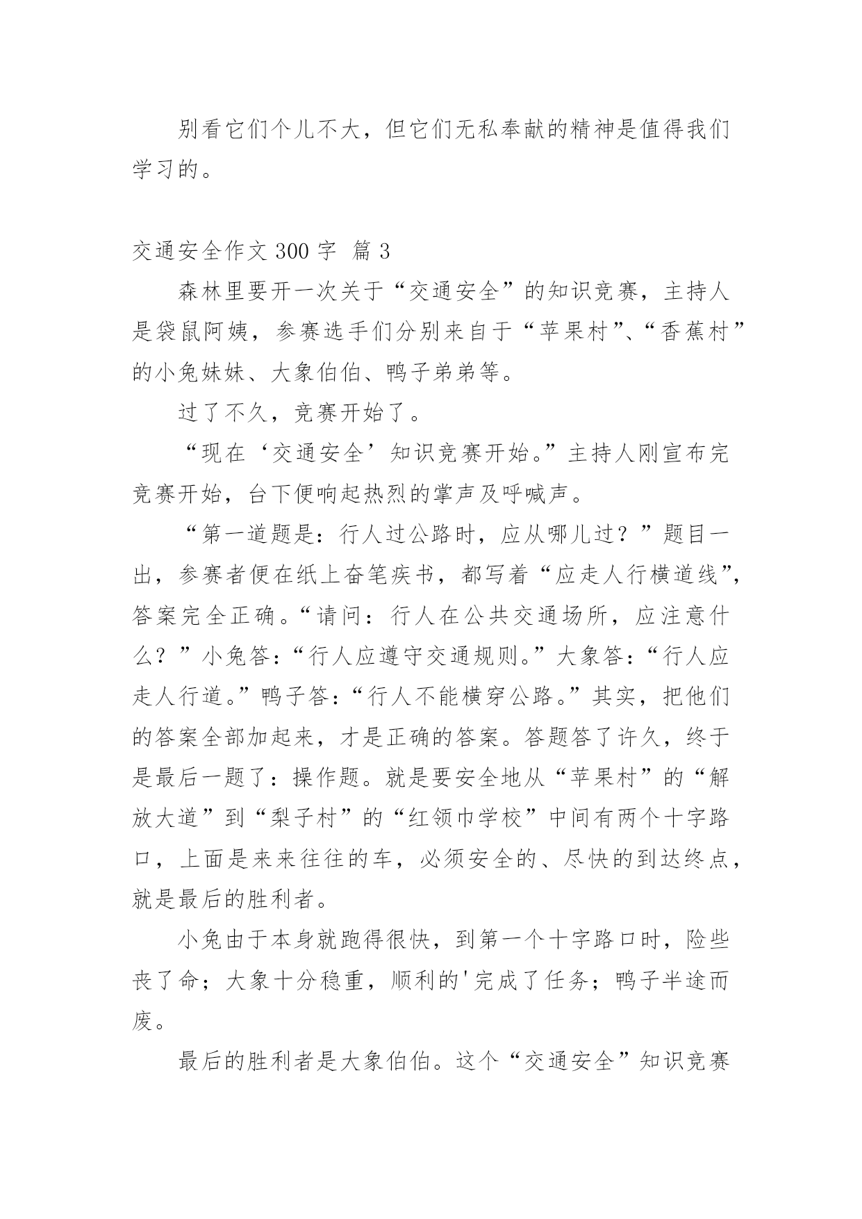 交通安全作文300字交通安全作文300字精选[10篇]在平凡的学习、工作、生活中,大家都写过作文,肯定对各类作文都很熟悉吧,作文一定要做到主题集中,围绕同一主题作深入阐述,切忌东拉西扯,主题涣散甚至无主题。你所见过的作文是什么样的呢?以下是小编为大家收集的交通安全作文300字10篇,欢迎阅读与收藏。交通安全作文300字篇1“红灯停,绿灯行,黄灯慢慢走。”这句话是我们要遵守的交通规则。上帝是公平的,也是自私的,他只赐予每个人一次生命,所以我们必须珍惜自己所拥有的一切。不要因为自己小小的举支,而付出自己的'一生。有一天晚上,我正在窗前写作业,感到十分疲惫,便趴在窗前休息。忽然,一个年轻人自以为车技好,竟坐在自行车上不扶车把手,漫不经心地骑着车。但“天有不测风云,人有旦夕之福”。就在年轻人得意之时,正面冲来一辆飞一般的面包车,由于年轻人来不及拐弯,只听“嘭”地一声,年轻人被弹了出去,头撞在水泥地上,血溅了一地,不省不事。后来被急救车车去医院了。还有一次,我去食杂店买盐。一个看上去17、18的大哥哥,准备过马路。他横冲直接,手里还拿着个手机。“嘭”!大哥哥与一辆黑色的小汽车撞了个正着,倒在了地上,永远睁不开眼睛,这可是血的教训啊!一个个揪人心肺的场面,一串串触目惊心的数字,一具具冷冰冰的尸体,一地地鲜红的血,一阵阵哭喊声,真叫人惨不忍睹。这些交通安全事故告诉我们一个道理:一定要遵守交通规则,珍惜生命,人的生命只有一次,天下没有后悔药啊,朋友们,为了家人,请遵守交通规则吧!交通安全作文300字篇2每当我们走到十字路口,都能看到红绿灯,它不停地向人们眨着严肃的大眼睛,因此,人人都会注意它。红绿灯三只眼,各有不同的作用。红眼睛总是瞪得大大的,注视着行人的一举一动,仿佛在说:“这里危险,别过来!”绿眼睛温柔地告诉人们:绿色象征安全,只要看到它,就可以安全的行走了。黄眼睛提醒人们红绿灯要变颜色了!别小瞧它们。有它们在,我们可以安全地过马路;有它在,出车祸的情况就可以避免;有它在,我们的安全就可以得到百分之百的保证。如果没有它,车辆就会连绵不断地开着,行人过不了马路,就会和车辆抢道,不仅造成交通混乱,而且危险。别小瞧它们,它们尽职尽责的精神可谓首屈一指,春夏秋冬,它们冒阒严寒酷暑,为人们尽职把关;白天黑夜,它们不眠不休地为人们尽忠职寒;刮风下雨,它还在默默无闻的为人民服务。无论何时何地,它们总是用自己瘦弱的肩头挑起人们安全的'重任。别看它们个儿不大,但它们无私奉献的精神是值得我们学习的。交通安全作文300字篇3森林里要开一次关于“交通安全”的知识竞赛,主持人是袋鼠阿姨,参赛选手们分别来自于“苹果村”、“香蕉村”的小兔妹妹、大象伯伯、鸭子弟弟等。过了不久,竞赛开始了。“现在‘交通安全’知识竞赛开始。”主持人刚宣布完竞赛开始,台下便响起热烈的掌声及呼喊声。“第一道题是:行人过公路时,应从哪儿过?”题目一出,参赛者便在纸上奋笔疾书,都写着“应走人行横道线”,答案完全正确。“请问:行人在公共交通场所,应注意什么?”小兔答:“行人应遵守交通规则。”大象答:“行人应走人行道。”鸭子答:“行人不能横穿公路。”其实,把他们的答案全部加起来,才是正确的答案。答题答了许久,终于是最后一题了:操作题。就是要安全地从“苹果村”的“解放大道”到“梨子村”的“红领巾学校”中间有两个十字路口,上面是来来往往的车,必须安全的、尽快的到达终点,就是最后的胜利者。小兔由于本身就跑得很快,到第一个十字路口时,险些丧了命;大象十分稳重,顺利的'完成了任务;鸭子半途而废。最后的胜利者是大象伯伯。这个“交通安全”知识竞赛真有意义呀!竞赛就在动物的欢笑中结束了。交通安全作文300字篇4今天,我和妈妈去文化广场看了文艺晚会。来到广场,来看这个节目的人可真多啊!整个广场都挤满了人,真是人山人海呀!椅子上也已经坐满了人,看上去是座无虚席。舞台上灯光闪烁,五彩缤纷,照得我们眼花缭乱。晚会开始了,主持人出来说:“大家晚上好!欢迎参加今天的晚会。今天的晚会主题是”安全出行,做文明交通人“。接下来第一个节目是讲一个交通协管员制止各种违章的故事。有的人扮演一个小伙子闯红灯,有的人扮演车子,还有的人扮演开车打电话的'司机。他们都演得非常真实。观席上不时响起雷鸣般的掌声。再接下来一个节目是一个女孩子在公路上把一只鞋子扔向一辆开着的汽车,因为她脚受伤了想搭便车。那辆车司机吓了一跳赶紧把车停了下来。还好后面没车,否则会发生大事故的。交警走过去好好批评教育了他们……今天,我看了这场晚会后懂得了更多的交通规则,我也要告诉爸爸妈妈开车要遵守交通规则。我们人人都要做遵纪守法的好公民。交通安全作文300字篇5有一次,我和妈妈准备走到马路对面,可马路对面的交通灯上“有个红苹果”,那我们就过不了了。我和妈妈看红灯下方的数字可