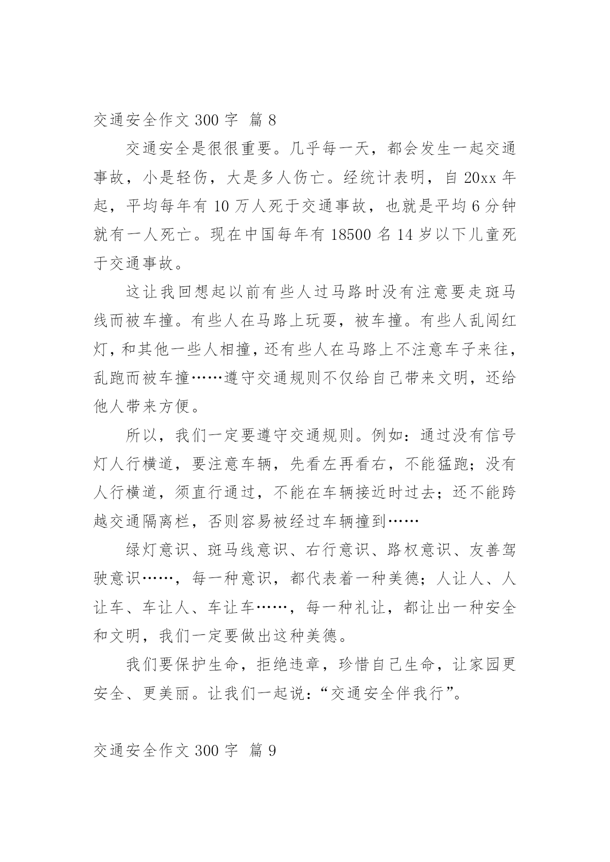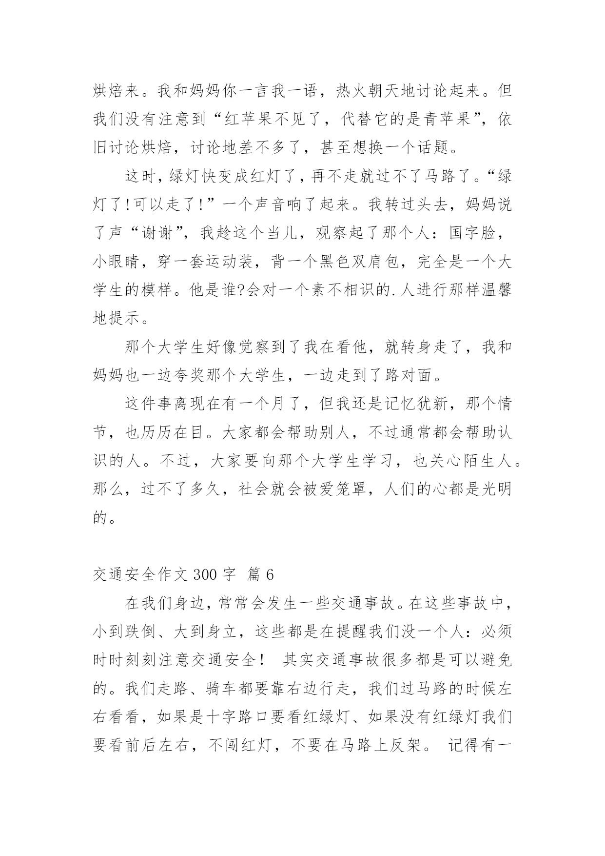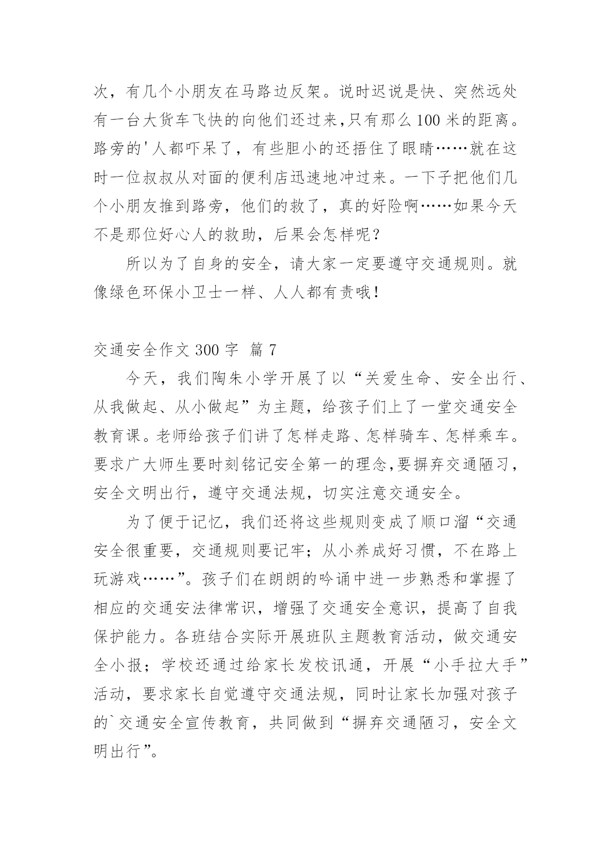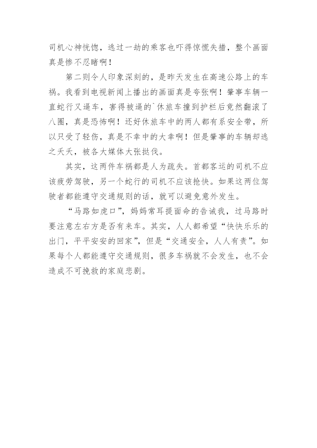 交通安全作文300字交通安全作文300字精选[10篇]在平凡的学习、工作、生活中,大家都写过作文,肯定对各类作文都很熟悉吧,作文一定要做到主题集中,围绕同一主题作深入阐述,切忌东拉西扯,主题涣散甚至无主题。你所见过的作文是什么样的呢?以下是小编为大家收集的交通安全作文300字10篇,欢迎阅读与收藏。交通安全作文300字篇1“红灯停,绿灯行,黄灯慢慢走。”这句话是我们要遵守的交通规则。上帝是公平的,也是自私的,他只赐予每个人一次生命,所以我们必须珍惜自己所拥有的一切。不要因为自己小小的举支,而付出自己的'一生。有一天晚上,我正在窗前写作业,感到十分疲惫,便趴在窗前休息。忽然,一个年轻人自以为车技好,竟坐在自行车上不扶车把手,漫不经心地骑着车。但“天有不测风云,人有旦夕之福”。就在年轻人得意之时,正面冲来一辆飞一般的面包车,由于年轻人来不及拐弯,只听“嘭”地一声,年轻人被弹了出去,头撞在水泥地上,血溅了一地,不省不事。后来被急救车车去医院了。还有一次,我去食杂店买盐。一个看上去17、18的大哥哥,准备过马路。他横冲直接,手里还拿着个手机。“嘭”!大哥哥与一辆黑色的小汽车撞了个正着,倒在了地上,永远睁不开眼睛,这可是血的教训啊!一个个揪人心肺的场面,一串串触目惊心的数字,一具具冷冰冰的尸体,一地地鲜红的血,一阵阵哭喊声,真叫人惨不忍睹。这些交通安全事故告诉我们一个道理:一定要遵守交通规则,珍惜生命,人的生命只有一次,天下没有后悔药啊,朋友们,为了家人,请遵守交通规则吧!交通安全作文300字篇2每当我们走到十字路口,都能看到红绿灯,它不停地向人们眨着严肃的大眼睛,因此,人人都会注意它。红绿灯三只眼,各有不同的作用。红眼睛总是瞪得大大的,注视着行人的一举一动,仿佛在说:“这里危险,别过来!”绿眼睛温柔地告诉人们:绿色象征安全,只要看到它,就可以安全的行走了。黄眼睛提醒人们红绿灯要变颜色了!别小瞧它们。有它们在,我们可以安全地过马路;有它在,出车祸的情况就可以避免;有它在,我们的安全就可以得到百分之百的保证。如果没有它,车辆就会连绵不断地开着,行人过不了马路,就会和车辆抢道,不仅造成交通混乱,而且危险。别小瞧它们,它们尽职尽责的精神可谓首屈一指,春夏秋冬,它们冒阒严寒酷暑,为人们尽职把关;白天黑夜,它们不眠不休地为人们尽忠职寒;刮风下雨,它还在默默无闻的为人民服务。无论何时何地,它们总是用自己瘦弱的肩头挑起人们安全的'重任。别看它们个儿不大,但它们无私奉献的精神是值得我们学习的。交通安全作文300字篇3森林里要开一次关于“交通安全”的知识竞赛,主持人是袋鼠阿姨,参赛选手们分别来自于“苹果村”、“香蕉村”的小兔妹妹、大象伯伯、鸭子弟弟等。过了不久,竞赛开始了。“现在‘交通安全’知识竞赛开始。”主持人刚宣布完竞赛开始,台下便响起热烈的掌声及呼喊声。“第一道题是:行人过公路时,应从哪儿过?”题目一出,参赛者便在纸上奋笔疾书,都写着“应走人行横道线”,答案完全正确。“请问:行人在公共交通场所,应注意什么?”小兔答:“行人应遵守交通规则。”大象答:“行人应走人行道。”鸭子答:“行人不能横穿公路。”其实,把他们的答案全部加起来,才是正确的答案。答题答了许久,终于是最后一题了:操作题。就是要安全地从“苹果村”的“解放大道”到“梨子村”的“红领巾学校”中间有两个十字路口,上面是来来往往的车,必须安全的、尽快的到达终点,就是最后的胜利者。小兔由于本身就跑得很快,到第一个十字路口时,险些丧了命;大象十分稳重,顺利的'完成了任务;鸭子半途而废。最后的胜利者是大象伯伯。这个“交通安全”知识竞赛真有意义呀!竞赛就在动物的欢笑中结束了。交通安全作文300字篇4今天,我和妈妈去文化广场看了文艺晚会。来到广场,来看这个节目的人可真多啊!整个广场都挤满了人,真是人山人海呀!椅子上也已经坐满了人,看上去是座无虚席。舞台上灯光闪烁,五彩缤纷,照得我们眼花缭乱。晚会开始了,主持人出来说:“大家晚上好!欢迎参加今天的晚会。今天的晚会主题是”安全出行,做文明交通人“。接下来第一个节目是讲一个交通协管员制止各种违章的故事。有的人扮演一个小伙子闯红灯,有的人扮演车子,还有的人扮演开车打电话的'司机。他们都演得非常真实。观席上不时响起雷鸣般的掌声。再接下来一个节目是一个女孩子在公路上把一只鞋子扔向一辆开着的汽车,因为她脚受伤了想搭便车。那辆车司机吓了一跳赶紧把车停了下来。还好后面没车,否则会发生大事故的。交警走过去好好批评教育了他们……今天,我看了这场晚会后懂得了更多的交通规则,我也要告诉爸爸妈妈开车要遵守交通规则。我们人人都要做遵纪守法的好公民。交通安全作文300字篇5有一次,我和妈妈准备走到马路对面,可马路对面的交通灯上“有个红苹果”,那我们就过不了了。我和妈妈看红灯下方的数字可