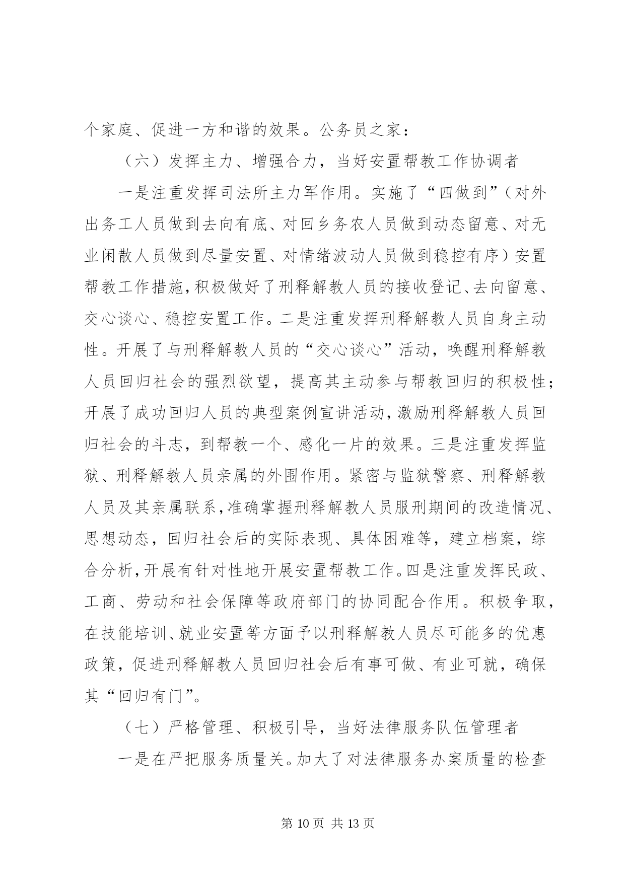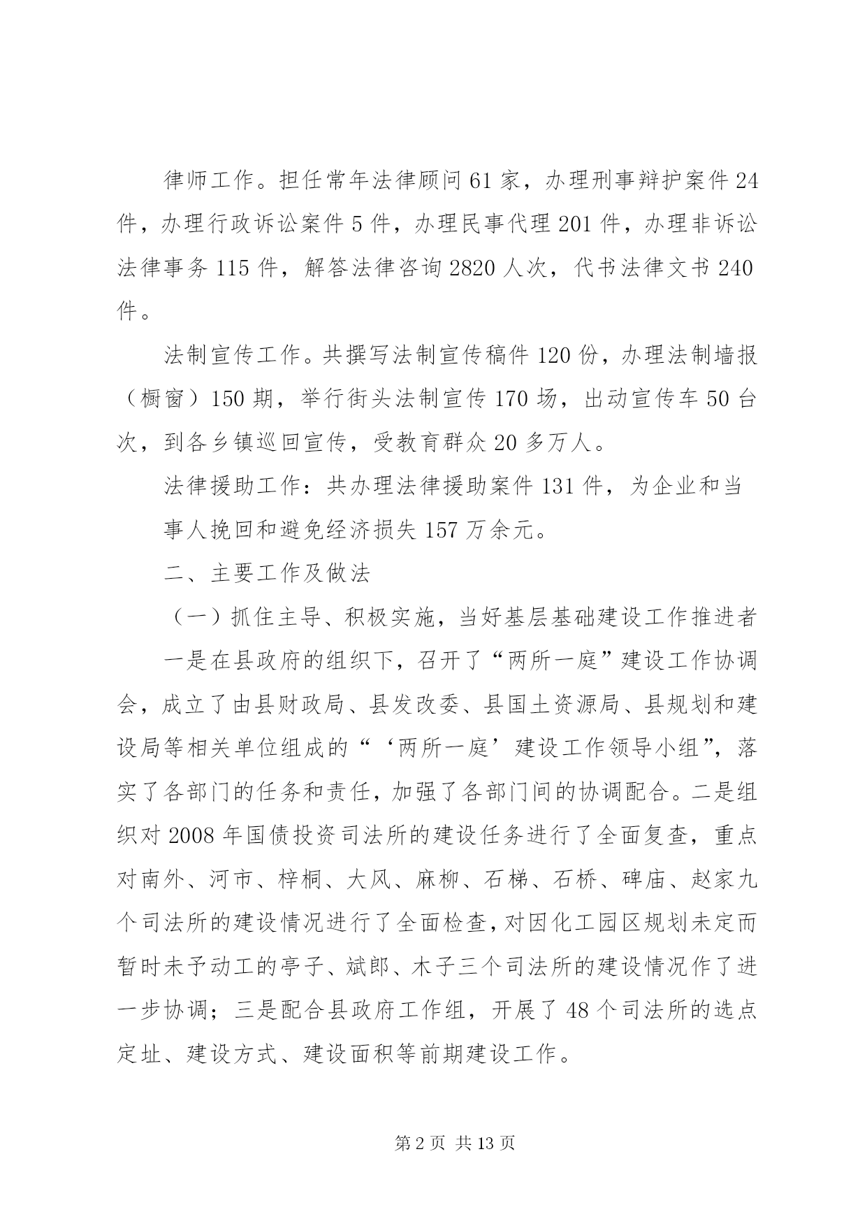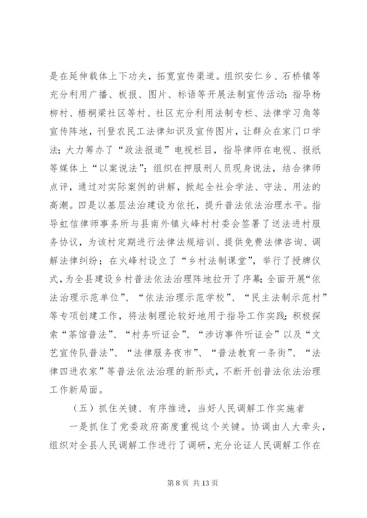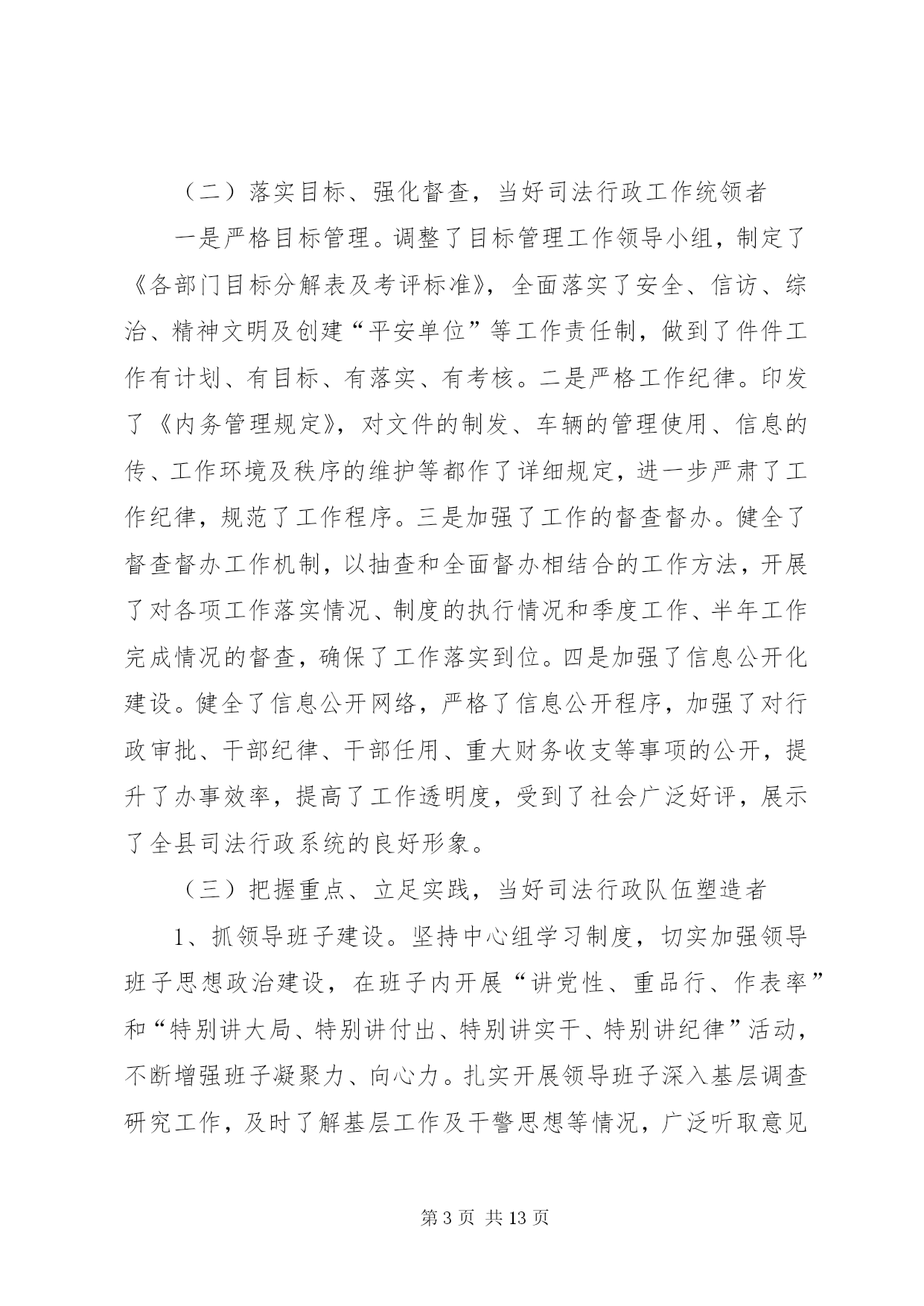 第PAGE\*Arabic\*MERGEFORMAT13页共NUMPAGES\*MERGEFORMAT13页司法局管理半年工作总结上半年,我局在县委、县政府及市司法局的正确领导和指导下,紧紧围绕全县的中心工作,严格按照年初下的各项目标任务,坚持以邓小平理论和“三个代表”重要思想为指导,认真学习贯彻十七大、十七届三中全会、省委九届四、五、六次全会及市委二届十二次全会精神,全面落实科学发展观和建设社会主义和谐社会,切实强化法制宣传、法律服务和法律保障职能作用,为促进全县经济止滑提速,推进县经济社会又好又快发展,建设和谐县做出了积极贡献。一、主要目标完成情况基层工作。担任常年法律顾问1730家;办理法律事务14900件,占全年任务数19250件的82%;全县共发生民间纠纷5230件,调解5120件,调解率98%,成功调解4980件,成功率97.2%,防止民转刑14件20人,防止民间纠纷引发自杀、凶杀8件10人,制止群众性械斗12件112人;共接收两释人员168人,安置155人,安置率92.3%,帮教160人,帮教率95.2%,重新犯罪率控制在2%以下。公证工作。办理各类公证事项4913件。其中办理民事公证事项780件;经济公证事项4062件,涉港、澳、台及涉外公证71件;提供司法建议3条;拒绝办理不法行为公证158件,避免和挽回经济损失200余万元。律师工作。担任常年法律顾问61家,办理刑事辩护案件24件,办理行政诉讼案件5件,办理民事代理201件,办理非诉讼法律事务115件,解答法律咨询2820人次,代书法律文书240件。法制宣传工作。共撰写法制宣传稿件120份,办理法制墙报(橱窗)150期,举行街头法制宣传170场,出动宣传车50台次,到各乡镇巡回宣传,受教育群众20多万人。法律援助工作:共办理法律援助案件131件,为企业和当事人挽回和避免经济损失157万余元。二、主要工作及做法(一)抓住主导、积极实施,当好基层基础建设工作推进者一是在县政府的组织下,召开了“两所一庭”建设工作协调会,成立了由县财政局、县发改委、县国土资源局、县规划和建设局等相关单位组成的“‘两所一庭’建设工作领导小组”,落实了各部门的任务和责任,加强了各部门间的协调配合。二是组织对2008年国债投资司法所的建设任务进行了全面复查,重点对南外、河市、梓桐、大风、麻柳、石梯、石桥、碑庙、赵家九个司法所的建设情况进行了全面检查,对因化工园区规划未定而暂时未予动工的亭子、斌郎、木子三个司法所的建设情况作了进一步协调;三是配合县政府工作组,开展了48个司法所的选点定址、建设方式、建设面积等前期建设工作。(二)落实目标、强化督查,当好司法行政工作统领者一是严格目标管理。调整了目标管理工作领导小组,制定了《各部门目标分解表及考评标准》,全面落实了安全、信访、综治、精神文明及创建“平安单位”等工作责任制,做到了件件工作有计划、有目标、有落实、有考核。二是严格工作纪律。印发了《内务管理规定》,对文件的制发、车辆的管理使用、信息的传、工作环境及秩序的维护等都作了详细规定,进一步严肃了工作纪律,规范了工作程序。三是加强了工作的督查督办。健全了督查督办工作机制,以抽查和全面督办相结合的工作方法,开展了对各项工作落实情况、制度的执行情况和季度工作、半年工作完成情况的督查,确保了工作落实到位。四是加强了信息公开化建设。健全了信息公开网络,严格了信息公开程序,加强了对行政审批、干部纪律、干部任用、重大财务收支等事项的公开,提升了办事效率,提高了工作透明度,受到了社会广泛好评,展示了全县司法行政系统的良好形象。(三)把握重点、立足实践,当好司法行政队伍塑造者1、抓领导班子建设。坚持中心组学习制度,切实加强领导班子思想政治建设,在班子内开展“讲党性、重品行、作表率”和“特别讲大局、特别讲付出、特别讲实干、特别讲纪律”活动,不断增强班子凝聚力、向心力。扎实开展领导班子深入基层调查研究工作,及时了解基层工作及干警思想等情况,广泛听取意见与建议,促进科学决策,切实增强班子实干力、战斗力。2、抓干部职工教育培训。扎实开展社会主义法治理念教育,不断强化社会主义法治观念,提高党员干部依法行政意识。抓思想政治教育,坚持“三会一课”(党小组会、支委会、全体党员会、一把手讲党课)及每周五下午的干部职工集中政治学习制度,系统学习党的知识、“三个代表”重要思想、和谐社会涵义等,牢固树立立党为公、执政为民理念。抓理想信念教育,积极开展和谐支部创建及与联系乡镇的“结对帮扶”活动,进一步增强了党员干部的公仆意识、服务意识、责任意识。扎实开展创建学习型机关活动,以全省政法系统在线考试活动为依托,深入开展干部职工“补充知识、提高技能、善学善思”、人民调解员业务技能培训等活动,提高了干部职工服务大局、