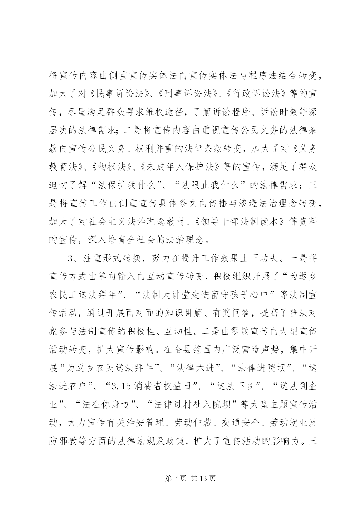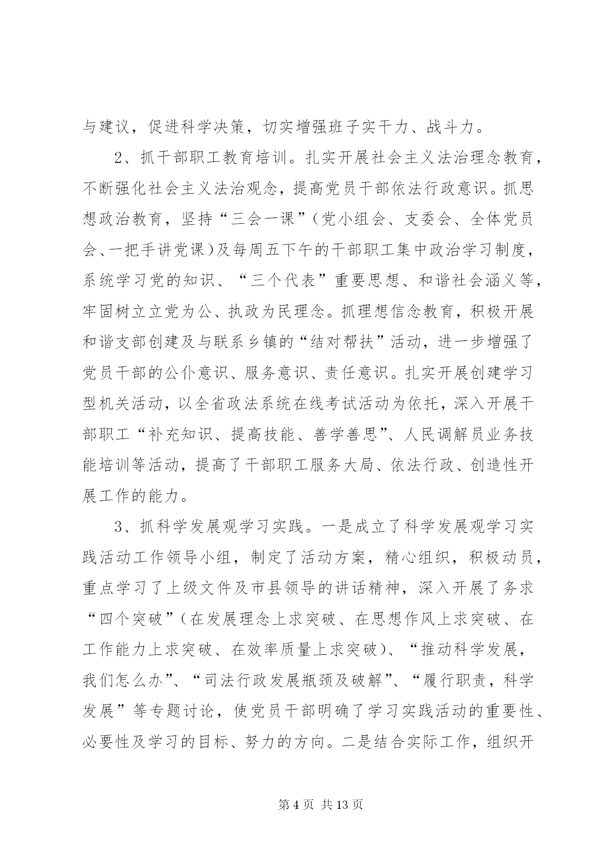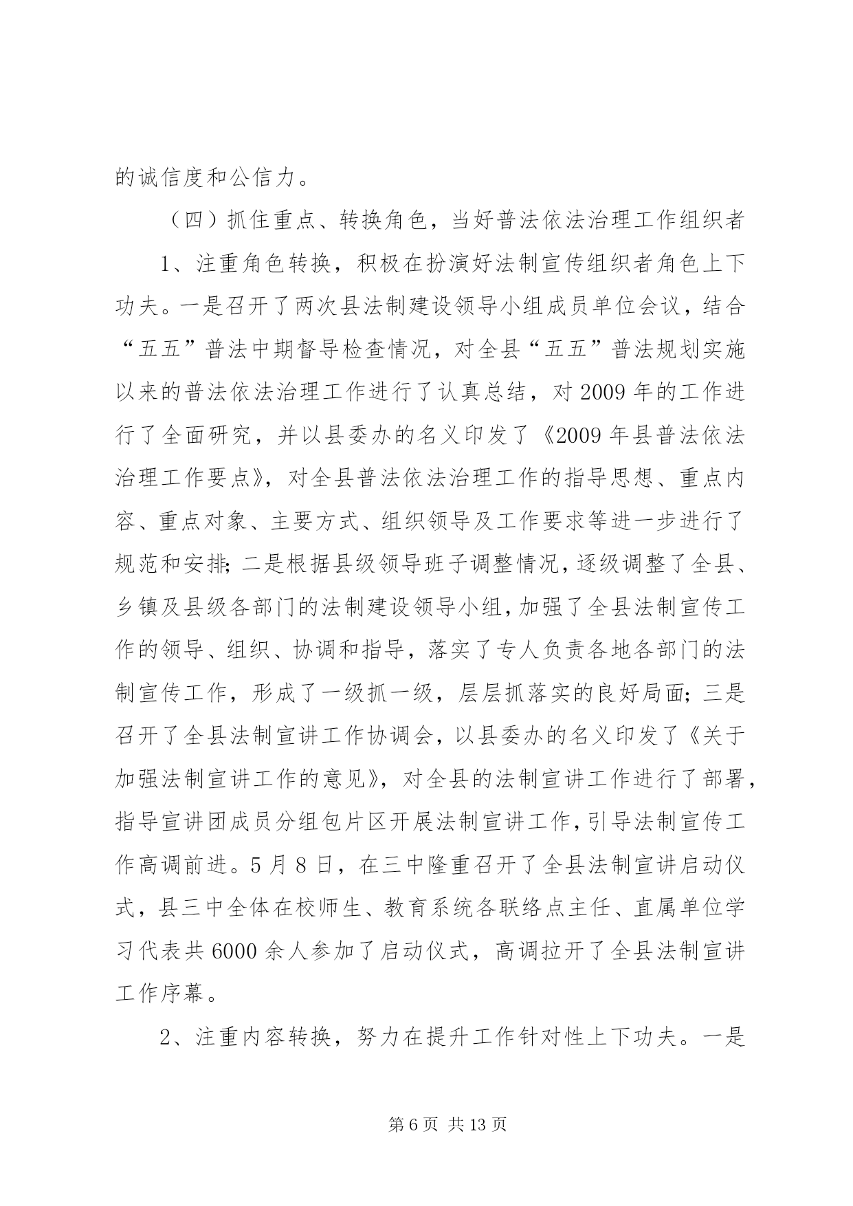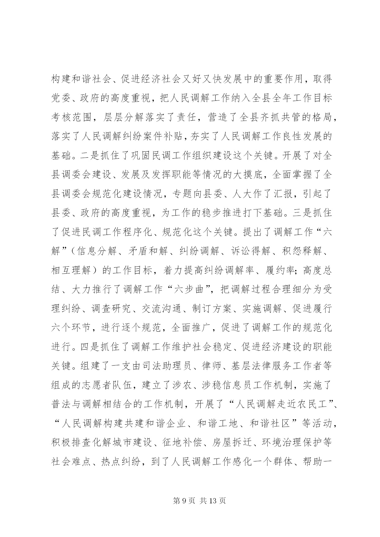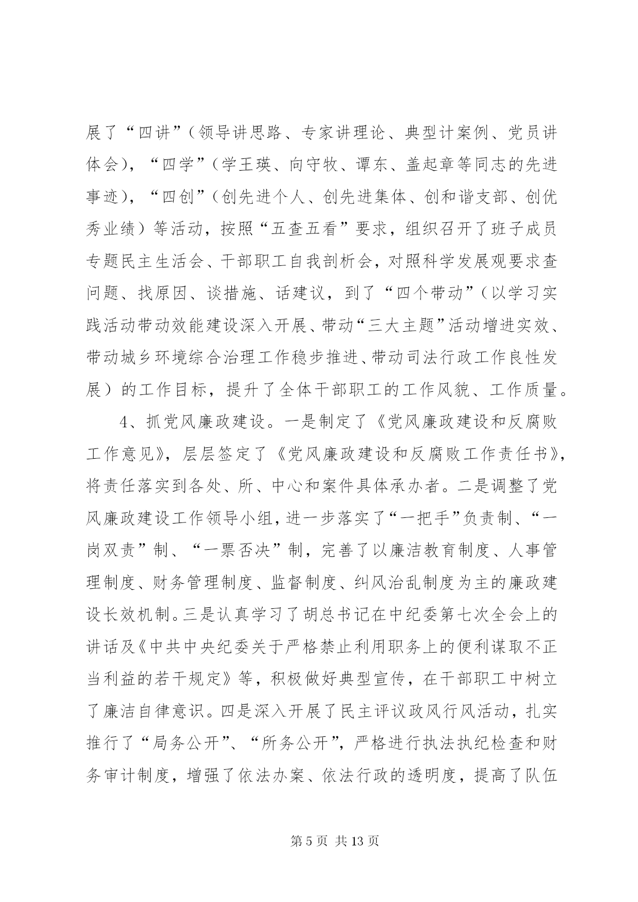 第PAGE\*Arabic\*MERGEFORMAT13页共NUMPAGES\*MERGEFORMAT13页司法局管理半年工作总结上半年,我局在县委、县政府及市司法局的正确领导和指导下,紧紧围绕全县的中心工作,严格按照年初下的各项目标任务,坚持以邓小平理论和“三个代表”重要思想为指导,认真学习贯彻十七大、十七届三中全会、省委九届四、五、六次全会及市委二届十二次全会精神,全面落实科学发展观和建设社会主义和谐社会,切实强化法制宣传、法律服务和法律保障职能作用,为促进全县经济止滑提速,推进县经济社会又好又快发展,建设和谐县做出了积极贡献。一、主要目标完成情况基层工作。担任常年法律顾问1730家;办理法律事务14900件,占全年任务数19250件的82%;全县共发生民间纠纷5230件,调解5120件,调解率98%,成功调解4980件,成功率97.2%,防止民转刑14件20人,防止民间纠纷引发自杀、凶杀8件10人,制止群众性械斗12件112人;共接收两释人员168人,安置155人,安置率92.3%,帮教160人,帮教率95.2%,重新犯罪率控制在2%以下。公证工作。办理各类公证事项4913件。其中办理民事公证事项780件;经济公证事项4062件,涉港、澳、台及涉外公证71件;提供司法建议3条;拒绝办理不法行为公证158件,避免和挽回经济损失200余万元。律师工作。担任常年法律顾问61家,办理刑事辩护案件24件,办理行政诉讼案件5件,办理民事代理201件,办理非诉讼法律事务115件,解答法律咨询2820人次,代书法律文书240件。法制宣传工作。共撰写法制宣传稿件120份,办理法制墙报(橱窗)150期,举行街头法制宣传170场,出动宣传车50台次,到各乡镇巡回宣传,受教育群众20多万人。法律援助工作:共办理法律援助案件131件,为企业和当事人挽回和避免经济损失157万余元。二、主要工作及做法(一)抓住主导、积极实施,当好基层基础建设工作推进者一是在县政府的组织下,召开了“两所一庭”建设工作协调会,成立了由县财政局、县发改委、县国土资源局、县规划和建设局等相关单位组成的“‘两所一庭’建设工作领导小组”,落实了各部门的任务和责任,加强了各部门间的协调配合。二是组织对2008年国债投资司法所的建设任务进行了全面复查,重点对南外、河市、梓桐、大风、麻柳、石梯、石桥、碑庙、赵家九个司法所的建设情况进行了全面检查,对因化工园区规划未定而暂时未予动工的亭子、斌郎、木子三个司法所的建设情况作了进一步协调;三是配合县政府工作组,开展了48个司法所的选点定址、建设方式、建设面积等前期建设工作。(二)落实目标、强化督查,当好司法行政工作统领者一是严格目标管理。调整了目标管理工作领导小组,制定了《各部门目标分解表及考评标准》,全面落实了安全、信访、综治、精神文明及创建“平安单位”等工作责任制,做到了件件工作有计划、有目标、有落实、有考核。二是严格工作纪律。印发了《内务管理规定》,对文件的制发、车辆的管理使用、信息的传、工作环境及秩序的维护等都作了详细规定,进一步严肃了工作纪律,规范了工作程序。三是加强了工作的督查督办。健全了督查督办工作机制,以抽查和全面督办相结合的工作方法,开展了对各项工作落实情况、制度的执行情况和季度工作、半年工作完成情况的督查,确保了工作落实到位。四是加强了信息公开化建设。健全了信息公开网络,严格了信息公开程序,加强了对行政审批、干部纪律、干部任用、重大财务收支等事项的公开,提升了办事效率,提高了工作透明度,受到了社会广泛好评,展示了全县司法行政系统的良好形象。(三)把握重点、立足实践,当好司法行政队伍塑造者1、抓领导班子建设。坚持中心组学习制度,切实加强领导班子思想政治建设,在班子内开展“讲党性、重品行、作表率”和“特别讲大局、特别讲付出、特别讲实干、特别讲纪律”活动,不断增强班子凝聚力、向心力。扎实开展领导班子深入基层调查研究工作,及时了解基层工作及干警思想等情况,广泛听取意见与建议,促进科学决策,切实增强班子实干力、战斗力。2、抓干部职工教育培训。扎实开展社会主义法治理念教育,不断强化社会主义法治观念,提高党员干部依法行政意识。抓思想政治教育,坚持“三会一课”(党小组会、支委会、全体党员会、一把手讲党课)及每周五下午的干部职工集中政治学习制度,系统学习党的知识、“三个代表”重要思想、和谐社会涵义等,牢固树立立党为公、执政为民理念。抓理想信念教育,积极开展和谐支部创建及与联系乡镇的“结对帮扶”活动,进一步增强了党员干部的公仆意识、服务意识、责任意识。扎实开展创建学习型机关活动,以全省政法系统在线考试活动为依托,深入开展干部职工“补充知识、提高技能、善学善思”、人民调解员业务技能培训等活动,提高了干部职工服务大局、