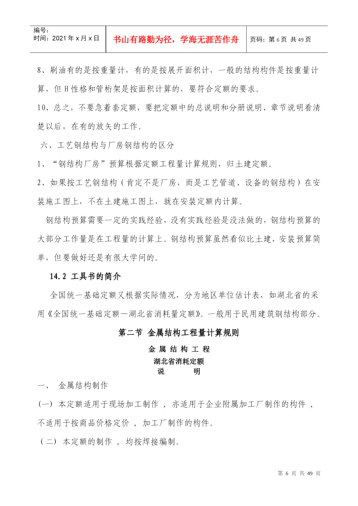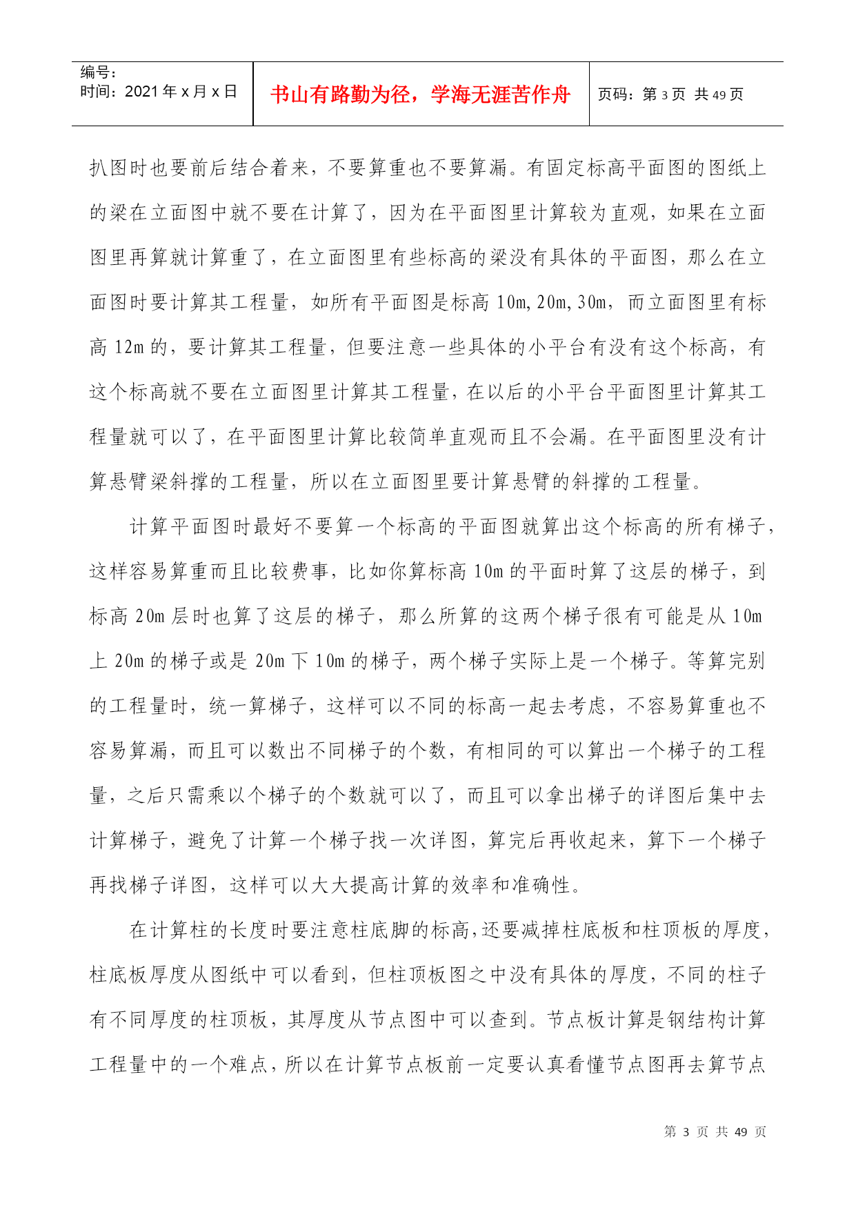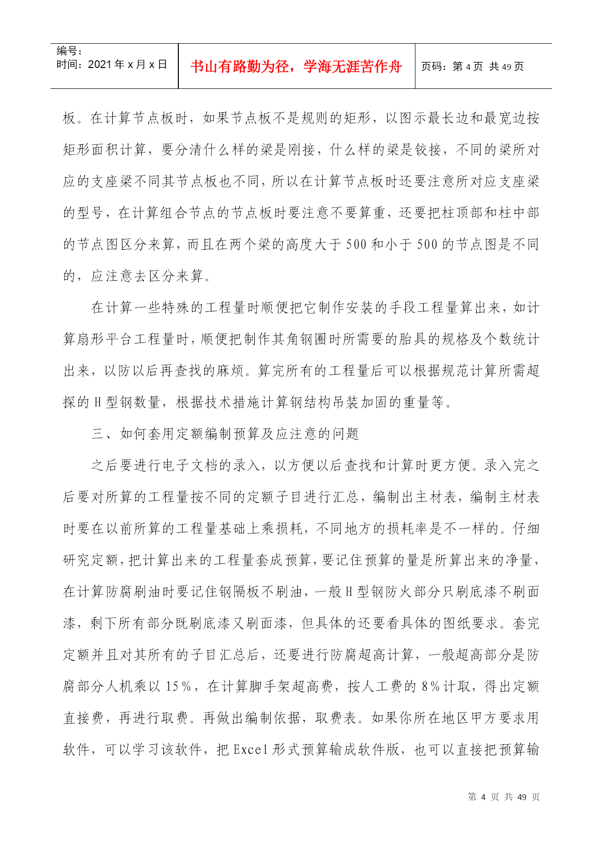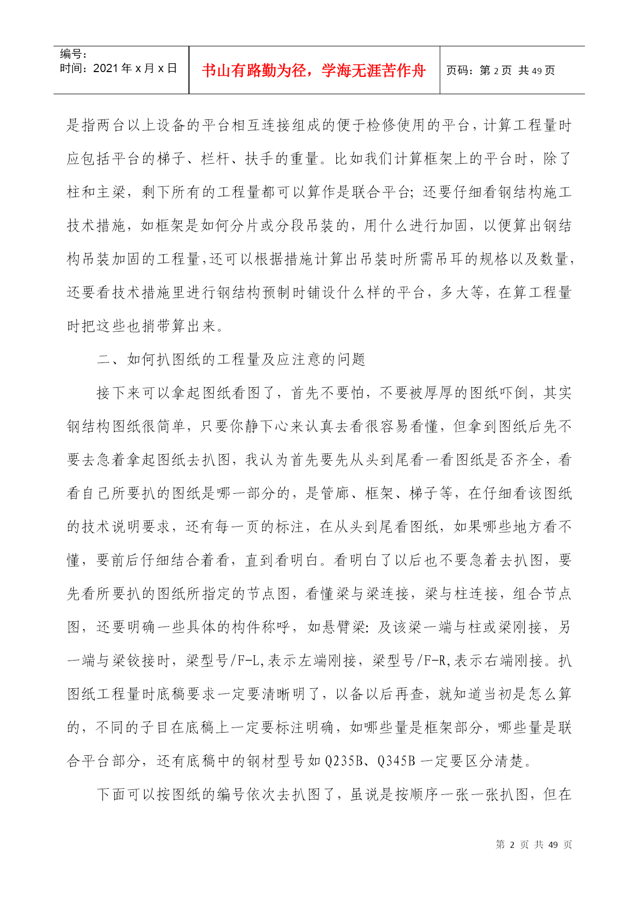 PAGE钢结构预算讲义二零壹零年叁月PAGE0PAGE1目录TOC\o"1-4"\h\z\uHYPERLINK\l"_Toc257311023"目录PAGEREF_Toc257311023\h1编号:时间:2021年x月x日书山有路勤为径,学海无涯苦作舟页码:第PAGE47页共NUMPAGES49页第PAGE\*MERGEFORMAT47页共NUMPAGES\*MERGEFORMAT49页第十四章金属结构预算第一节预算工具书简介钢结构预算常用工具书分三类:全国统一基础定额、冶金工程预算定额、工程量清单计价规范。前两种是传统的定额计价方式,后面一种是清单计价方式。全国统一基础定额又根据实际情况,分为地区单位估计表,如湖北省的采用《全国统一基础定额—湖北省消耗量定额》。14.1概述一、做预算前的准备工作对于一个初学者做钢结构预算前应该必备一些知识,首先要知道钢结构的施工工艺,具体每道工序是如何领料、如何下料、如何施工的,这样可以使以后计算工程量时不漏,还可以知道哪里损耗多一些;还要学习钢结构施工规范如柱脚垫铁是如何布置,有什么要求,数量是多少;无损检测,H型钢对接焊缝需要无损检测,知道哪个是H型钢翼板,哪个是H型钢腹板,翼板一级焊缝需要100%超探,腹板二级焊缝需要20%超探等,还要了解定额,知道工艺金属结构制作安装定额有哪些定额子目,具体某一工程量该套哪个子目,以便在计算底稿上清楚的标明不同子目的工程量,以方便以后的查看。看完定额,知道了定额有哪些子目,再去学习工程量计算规则,根据所学的定额子目,在学习工程量计算规则,在计算规则中学习每项子目在计算时应该注意什么,比如计量单位是m还是m2,比如钢结构超探以焊缝长度以“m”为计量单位,金属板材板面探伤,以板材面积“m2”为计量单位;尤其要记住什么是联合平台,因为联合平台子目费用比较高,套此项比较合适,联合平台是指两台以上设备的平台相互连接组成的便于检修使用的平台,计算工程量时应包括平台的梯子、栏杆、扶手的重量。比如我们计算框架上的平台时,除了柱和主梁,剩下所有的工程量都可以算作是联合平台;还要仔细看钢结构施工技术措施,如框架是如何分片或分段吊装的,用什么进行加固,以便算出钢结构吊装加固的工程量,还可以根据措施计算出吊装时所需吊耳的规格以及数量,还要看技术措施里进行钢结构预制时铺设什么样的平台,多大等,在算工程量时把这些也捎带算出来。二、如何扒图纸的工程量及应注意的问题接下来可以拿起图纸看图了,首先不要怕,不要被厚厚的图纸吓倒,其实钢结构图纸很简单,只要你静下心来认真去看很容易看懂,但拿到图纸后先不要去急着拿起图纸去扒图,我认为首先要先从头到尾看一看图纸是否齐全,看看自己所要扒的图纸是哪一部分的,是管廊、框架、梯子等,在仔细看该图纸的技术说明要求,还有每一页的标注,在从头到尾看图纸,如果哪些地方看不懂,要前后仔细结合着看,直到看明白。看明白了以后也不要急着去扒图,要先看所要扒的图纸所指定的节点图,看懂梁与梁连接,梁与柱连接,组合节点图,还要明确一些具体的构件称呼,如悬臂梁:及该梁一端与柱或梁刚接,另一端与梁铰接时,梁型号/F-L,表示左端刚接,梁型号/F-R,表示右端刚接。扒图纸工程量时底稿要求一定要清晰明了,以备以后再查,就知道当初是怎么算的,不同的子目在底稿上一定要标注明确,如哪些量是框架部分,哪些量是联合平台部分,还有底稿中的钢材型号如Q235B、Q345B一定要区分清楚。下面可以按图纸的编号依次去扒图了,虽说是按顺序一张一张扒图,但在扒图时也要前后结合着来,不要算重也不要算漏。有固定标高平面图的图纸上的梁在立面图中就不要在计算了,因为在平面图里计算较为直观,如果在立面图里再算就计算重了,在立面图里有些标高的梁没有具体的平面图,那么在立面图时要计算其工程量,如所有平面图是标高10m,20m,30m,而立面图里有标高12m的,要计算其工程量,但要注意一些具体的小平台有没有这个标高,有这个标高就不要在立面图里计算其工程量,在以后的小平台平面图里计算其工程量就可以了,在平面图里计算比较简单直观而且不会漏。在平面图里没有计算悬臂梁斜撑的工程量,所以在立面图里要计算悬臂的斜撑的工程量。计算平面图时最好不要算一个标高的平面图就算出这个标高的所有梯子,这样容易算重而且比较费事,比如你算标高10m的平面时算了这层的梯子,到标高20m层时也算了这层的梯子,那么所算的这两个梯子很有可能是从10m上20m的梯子或是20m下10m的梯子,两个梯子实际上是一个梯子。等算完别的工程量时,统一算梯子,这样可以不同的标高一起去考虑,不容易算重也不容易算漏,而且可以数出不同梯子的个数,