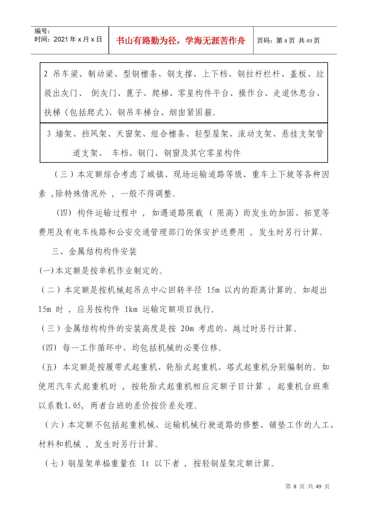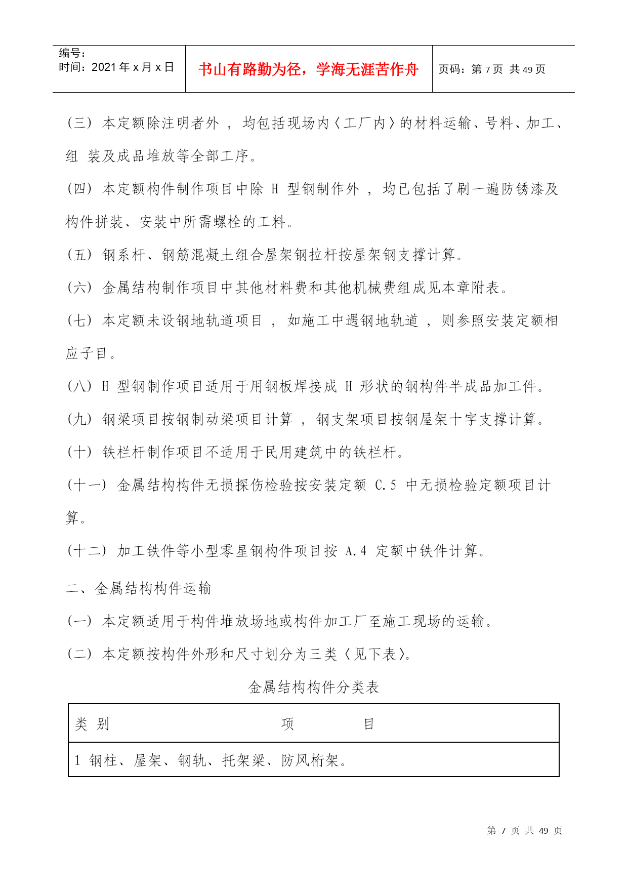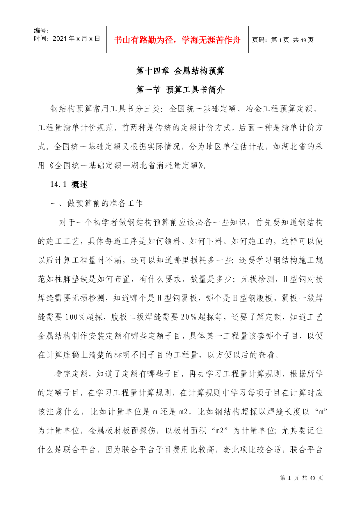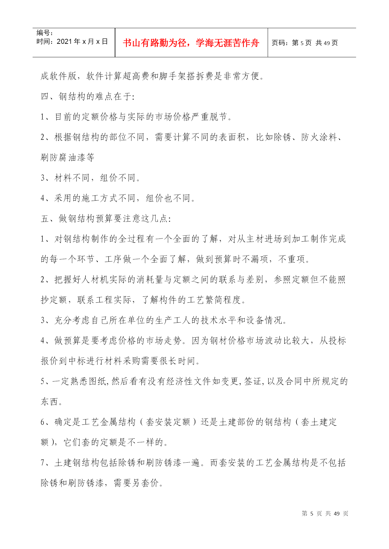 PAGE钢结构预算讲义二零壹零年叁月PAGE0PAGE1目录TOC\o"1-4"\h\z\uHYPERLINK\l"_Toc257311023"目录PAGEREF_Toc257311023\h1编号:时间:2021年x月x日书山有路勤为径,学海无涯苦作舟页码:第PAGE47页共NUMPAGES49页第PAGE\*MERGEFORMAT47页共NUMPAGES\*MERGEFORMAT49页第十四章金属结构预算第一节预算工具书简介钢结构预算常用工具书分三类:全国统一基础定额、冶金工程预算定额、工程量清单计价规范。前两种是传统的定额计价方式,后面一种是清单计价方式。全国统一基础定额又根据实际情况,分为地区单位估计表,如湖北省的采用《全国统一基础定额—湖北省消耗量定额》。14.1概述一、做预算前的准备工作对于一个初学者做钢结构预算前应该必备一些知识,首先要知道钢结构的施工工艺,具体每道工序是如何领料、如何下料、如何施工的,这样可以使以后计算工程量时不漏,还可以知道哪里损耗多一些;还要学习钢结构施工规范如柱脚垫铁是如何布置,有什么要求,数量是多少;无损检测,H型钢对接焊缝需要无损检测,知道哪个是H型钢翼板,哪个是H型钢腹板,翼板一级焊缝需要100%超探,腹板二级焊缝需要20%超探等,还要了解定额,知道工艺金属结构制作安装定额有哪些定额子目,具体某一工程量该套哪个子目,以便在计算底稿上清楚的标明不同子目的工程量,以方便以后的查看。看完定额,知道了定额有哪些子目,再去学习工程量计算规则,根据所学的定额子目,在学习工程量计算规则,在计算规则中学习每项子目在计算时应该注意什么,比如计量单位是m还是m2,比如钢结构超探以焊缝长度以“m”为计量单位,金属板材板面探伤,以板材面积“m2”为计量单位;尤其要记住什么是联合平台,因为联合平台子目费用比较高,套此项比较合适,联合平台是指两台以上设备的平台相互连接组成的便于检修使用的平台,计算工程量时应包括平台的梯子、栏杆、扶手的重量。比如我们计算框架上的平台时,除了柱和主梁,剩下所有的工程量都可以算作是联合平台;还要仔细看钢结构施工技术措施,如框架是如何分片或分段吊装的,用什么进行加固,以便算出钢结构吊装加固的工程量,还可以根据措施计算出吊装时所需吊耳的规格以及数量,还要看技术措施里进行钢结构预制时铺设什么样的平台,多大等,在算工程量时把这些也捎带算出来。二、如何扒图纸的工程量及应注意的问题接下来可以拿起图纸看图了,首先不要怕,不要被厚厚的图纸吓倒,其实钢结构图纸很简单,只要你静下心来认真去看很容易看懂,但拿到图纸后先不要去急着拿起图纸去扒图,我认为首先要先从头到尾看一看图纸是否齐全,看看自己所要扒的图纸是哪一部分的,是管廊、框架、梯子等,在仔细看该图纸的技术说明要求,还有每一页的标注,在从头到尾看图纸,如果哪些地方看不懂,要前后仔细结合着看,直到看明白。看明白了以后也不要急着去扒图,要先看所要扒的图纸所指定的节点图,看懂梁与梁连接,梁与柱连接,组合节点图,还要明确一些具体的构件称呼,如悬臂梁:及该梁一端与柱或梁刚接,另一端与梁铰接时,梁型号/F-L,表示左端刚接,梁型号/F-R,表示右端刚接。扒图纸工程量时底稿要求一定要清晰明了,以备以后再查,就知道当初是怎么算的,不同的子目在底稿上一定要标注明确,如哪些量是框架部分,哪些量是联合平台部分,还有底稿中的钢材型号如Q235B、Q345B一定要区分清楚。下面可以按图纸的编号依次去扒图了,虽说是按顺序一张一张扒图,但在扒图时也要前后结合着来,不要算重也不要算漏。有固定标高平面图的图纸上的梁在立面图中就不要在计算了,因为在平面图里计算较为直观,如果在立面图里再算就计算重了,在立面图里有些标高的梁没有具体的平面图,那么在立面图时要计算其工程量,如所有平面图是标高10m,20m,30m,而立面图里有标高12m的,要计算其工程量,但要注意一些具体的小平台有没有这个标高,有这个标高就不要在立面图里计算其工程量,在以后的小平台平面图里计算其工程量就可以了,在平面图里计算比较简单直观而且不会漏。在平面图里没有计算悬臂梁斜撑的工程量,所以在立面图里要计算悬臂的斜撑的工程量。计算平面图时最好不要算一个标高的平面图就算出这个标高的所有梯子,这样容易算重而且比较费事,比如你算标高10m的平面时算了这层的梯子,到标高20m层时也算了这层的梯子,那么所算的这两个梯子很有可能是从10m上20m的梯子或是20m下10m的梯子,两个梯子实际上是一个梯子。等算完别的工程量时,统一算梯子,这样可以不同的标高一起去考虑,不容易算重也不容易算漏,而且可以数出不同梯子的个数,