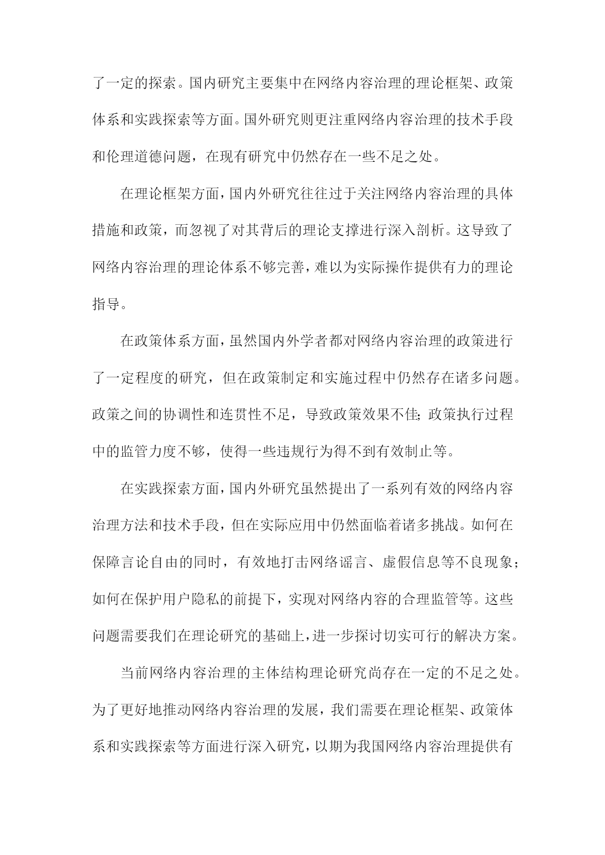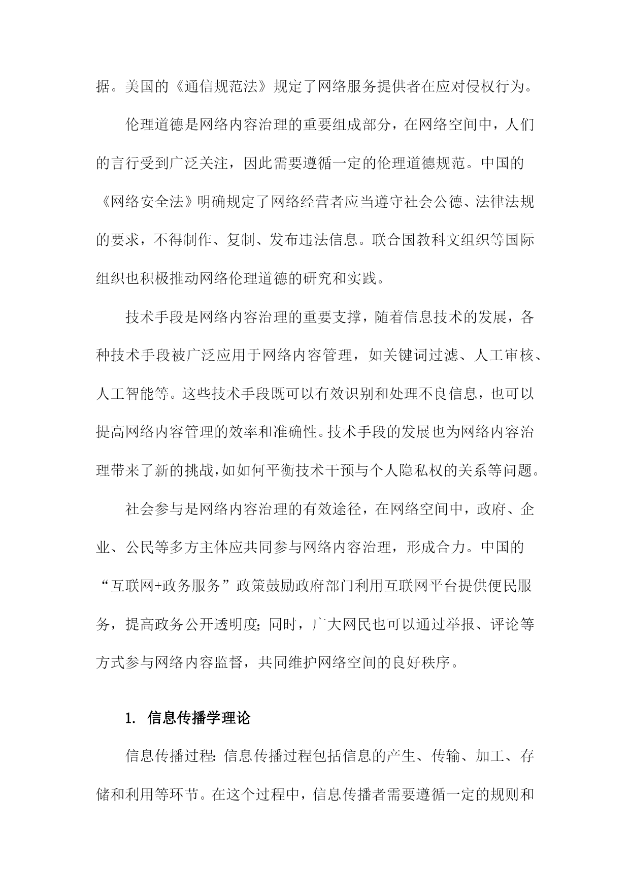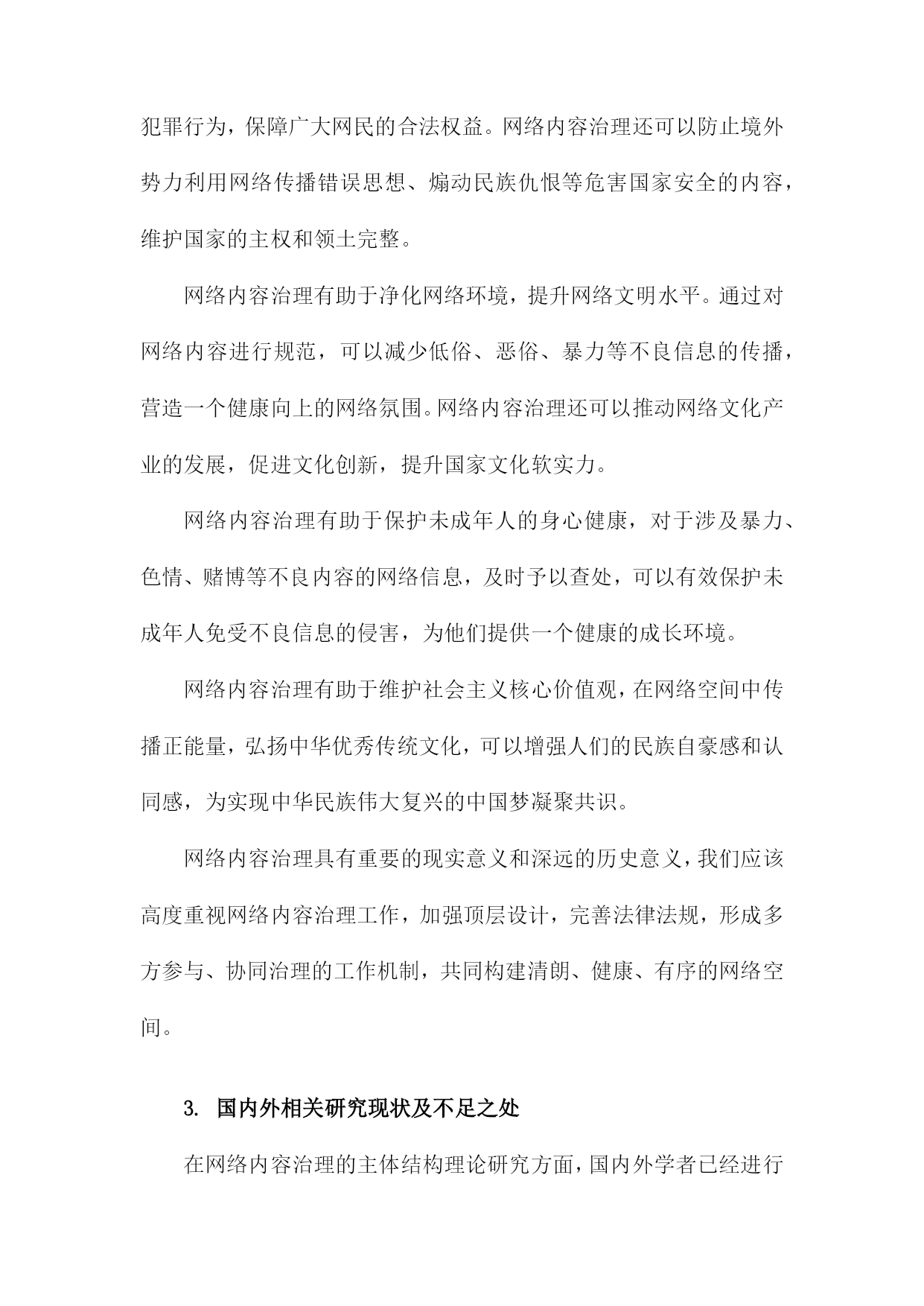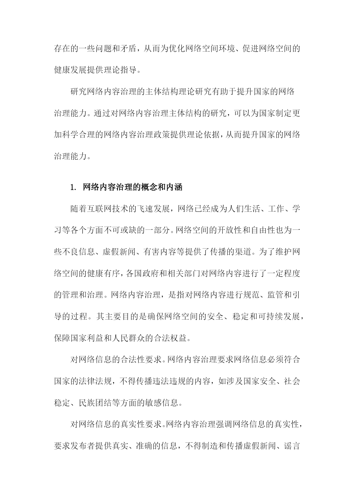 网络内容治理的主体结构理论研究一、研究背景和意义随着互联网技术的飞速发展,网络已经成为人们生活、工作、学习等各个方面不可或缺的重要组成部分。网络空间的虚拟性和匿名性为一些不法分子提供了传播违法违规信息、侵犯他人权益的便利条件。网络内容治理成为维护网络秩序、保障国家安全和社会稳定的重要任务。在这个背景下,网络内容治理的主体结构理论研究具有重要的现实意义和理论价值。研究网络内容治理的主体结构理论研究有助于揭示网络内容治理的内在规律。通过对网络内容治理的主体结构进行深入分析,可以更好地理解网络内容治理的运行机制,为制定有效的网络内容治理政策提供理论支持。研究网络内容治理的主体结构理论研究有助于提高网络内容治理的针对性和有效性。通过对不同主体在网络内容治理中的作用和地位进行分析,可以有针对性地加强网络内容治理,提高网络内容治理的效果。研究网络内容治理的主体结构理论研究有助于促进网络空间的健康发展。通过对网络内容治理主体结构的分析,可以发现网络空间存在的一些问题和矛盾,从而为优化网络空间环境、促进网络空间的健康发展提供理论指导。研究网络内容治理的主体结构理论研究有助于提升国家的网络治理能力。通过对网络内容治理主体结构的研究,可以为国家制定更加科学合理的网络内容治理政策提供理论依据,从而提升国家的网络治理能力。1.网络内容治理的概念和内涵随着互联网技术的飞速发展,网络已经成为人们生活、工作、学习等各个方面不可或缺的一部分。网络空间的开放性和自由性也为一些不良信息、虚假新闻、有害内容等提供了传播的渠道。为了维护网络空间的健康有序,各国政府和相关部门对网络内容进行了一定程度的管理和治理。网络内容治理,是指对网络内容进行规范、监管和引导的过程。其主要目的是确保网络空间的安全、稳定和可持续发展,保障国家利益和人民群众的合法权益。对网络信息的合法性要求。网络内容治理要求网络信息必须符合国家的法律法规,不得传播违法违规的内容,如涉及国家安全、社会稳定、民族团结等方面的敏感信息。对网络信息的真实性要求。网络内容治理强调网络信息的真实性,要求发布者提供真实、准确的信息,不得制造和传播虚假新闻、谣言等不实信息。对网络信息的道德性要求。网络内容治理要求网络信息要遵循社会公德,不得传播低俗、恶俗、暴力等不道德的信息。对网络信息的安全性要求。网络内容治理要求保护用户的隐私权和个人信息安全,防止网络攻击、黑客行为等网络安全问题的发生。对网络信息的多样性要求。网络内容治理鼓励网络信息的多样化发展,尊重不同群体的文化差异和审美需求,促进网络文化的繁荣发展。网络内容治理是一种旨在维护网络空间秩序、保障国家利益和人民群众权益的综合性管理措施。在全球化和信息化的大背景下,网络内容治理已成为各国政府和社会各界共同关注的重要议题。2.网络内容治理的重要性和必要性随着互联网技术的飞速发展,网络已经成为人们获取信息、交流思想、娱乐休闲的重要平台。网络空间的开放性和自由性也为一些不良信息、虚假谣言和有害内容提供了滋生的土壤。这些不良信息不仅对个人用户的心理健康造成影响,还可能引发社会问题,甚至威胁国家安全。网络内容治理的重要性和必要性日益凸显。网络内容治理有助于维护网络空间的安全稳定,通过对网络内容进行有效管理,可以有效遏制网络暴力、网络欺诈、网络侵权等违法犯罪行为,保障广大网民的合法权益。网络内容治理还可以防止境外势力利用网络传播错误思想、煽动民族仇恨等危害国家安全的内容,维护国家的主权和领土完整。网络内容治理有助于净化网络环境,提升网络文明水平。通过对网络内容进行规范,可以减少低俗、恶俗、暴力等不良信息的传播,营造一个健康向上的网络氛围。网络内容治理还可以推动网络文化产业的发展,促进文化创新,提升国家文化软实力。网络内容治理有助于保护未成年人的身心健康,对于涉及暴力、色情、赌博等不良内容的网络信息,及时予以查处,可以有效保护未成年人免受不良信息的侵害,为他们提供一个健康的成长环境。网络内容治理有助于维护社会主义核心价值观,在网络空间中传播正能量,弘扬中华优秀传统文化,可以增强人们的民族自豪感和认同感,为实现中华民族伟大复兴的中国梦凝聚共识。网络内容治理具有重要的现实意义和深远的历史意义,我们应该高度重视网络内容治理工作,加强顶层设计,完善法律法规,形成多方参与、协同治理的工作机制,共同构建清朗、健康、有序的网络空间。3.国内外相关研究现状及不足之处在网络内容治理的主体结构理论研究方面,国内外学者已经进行了一定的探索。国内研究主要集中在网络内容治理的理论框架、政策体系和实践探索等方面。国外研究则更注重网络内容治理的技术手段和伦理道德问题,在现有研究中仍然存在一些不足之处。在理论框架方面,国内外研究往往过于关注网络内容治理的具体措施和政