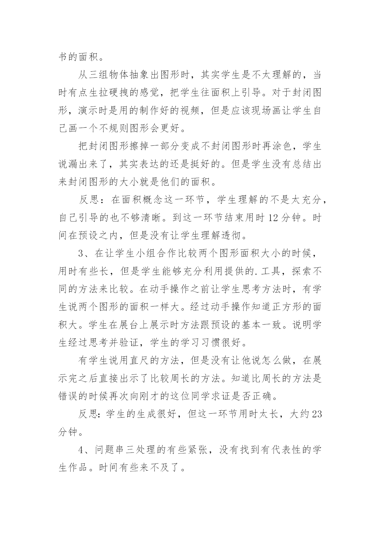 什么是面积教学反思什么是面积教学反思身为一名人民老师,我们需要很强的教学能力,写教学反思可以很好的把我们的教学记录下来,那么教学反思应该怎么写才合适呢?以下是小编收集整理的什么是面积教学反思,欢迎大家借鉴与参考,希望对大家有所帮助。什么是面积教学反思1这节课是按照上学期教学设计大赛时的上课流程进行的。1、从拼图导入。学生回答选择哪个会拼的比较快时,回答问题的学生大多数还是从拼图的某一部分是大象还是天空来确定哪一个容易拼,没有从面的大小去思考。反思:我问的问题的指向性不够明确,学生不太理解这一部分到底是干什么的。2、在探讨面积概念的环节,有点太急了,没有让学生明白面积到底是什么。学生课前对面积有所了解,但是对面积具体的含义还不够清楚。从三组物体的表面的大小总结出物体表面的大小就是它们的面积,但是没有让学生举例生活中的例子,比如:手掌的大小就是手掌的面积。出示完物体表面的大小就是它们的面积,也没有让学生说一说,数学书封面的大小就是数学书的面积。从三组物体抽象出图形时,其实学生是不太理解的,当时有点生拉硬拽的感觉,把学生往面积上引导。对于封闭图形,演示时是用的制作好的视频,但是应该现场画让学生自己画一个不规则图形会更好。把封闭图形擦掉一部分变成不封闭图形时再涂色,学生说漏出来了,其实表达的还是挺好的。但是学生没有总结出来封闭图形的大小就是他们的面积。反思:在面积概念这一环节,学生理解的不是太充分,自己引导的也不够清晰。到这一环节结束用时12分钟。时间在预设之内,但是没有让学生理解透彻。3、在让学生小组合作比较两个图形面积大小的时候,用时有些长,但是学生能够充分利用提供的.工具,探索不同的方法来比较。在动手操作之前让学生思考方法时,有学生说两个图形的面积一样大。经过动手操作知道正方形的面积大。学生在展台上展示时方法跟预设的基本一致。说明学生经过思考并验证,学生的学习习惯很好。有学生说用直尺的方法,但是没有让他说怎么做,在展示完之后直接出示了比较周长的方法。知道比周长的方法是错误的时候再次向刚才的这位同学求证是否正确。反思:学生的生成很好,但这一环节用时太长,大约23分钟。4、问题串三处理的有些紧张,没有找到有代表性的学生作品。时间有些来不及了。5、没有处理练习,前面用时过长。什么是面积教学反思2本节课学生自主探索的过程比较多,教学过程比较好地体现了新课程的“让学生经历知识形成的全过程”这一理念。1.在丰富的生活背景上学习数学,强化感知,建立概念。本节课属于面积概念教学。面积的概念具有较强的抽象性,学生理解起来会有一定的'难度。为了使学生较好地理解和掌握“面积”这个比较抽象的概念,我从生活入手,让学生通过找一找、摸一摸活动,感知物体的面有大有小,通过物体面的大小比较揭示物体的面积,使学生把面积这个抽象的概念与生活中具体的事例联系起来,加深对面积的理解。这样层层深入,环环相扣,学生在不知不觉中理解了面积的含义。在此基础上通过抓住关键词的方式揭示概念的本质特征,使学生明确新概念的本质属性及意义。这样既把感性知识上升到理性认识,又从知其然上升到知其所以然。学生同时在学习过程中,发展了智能,提高了素质,体现了新的教学理念。2.创设实践活动的机会,让学生经历了知识形成的全过程。在探索比较两个图形面积大小的环节中,为学生创设了从事数学学习活动和交流的空间。学生先讨论比较方法,然后通过实践、操作验证自己的猜测。学生用剪拼、数方格、重叠等方法,从多角度、多方面去思考,选用不同的方法来比较。教师适时引导,让每个学生都有表达想法的机会,使探究学习落到实处。这样学生全面、主动地参与到学习过程中,使不同的学生在数学学习中获得不同的发展。在实践活动中,让学生经历了知识形成的全过程,加深了对面积含义的理解,同时培养了他们分析、比较能力与合作意识。在一定程度上渗透解决问题的策略意识.