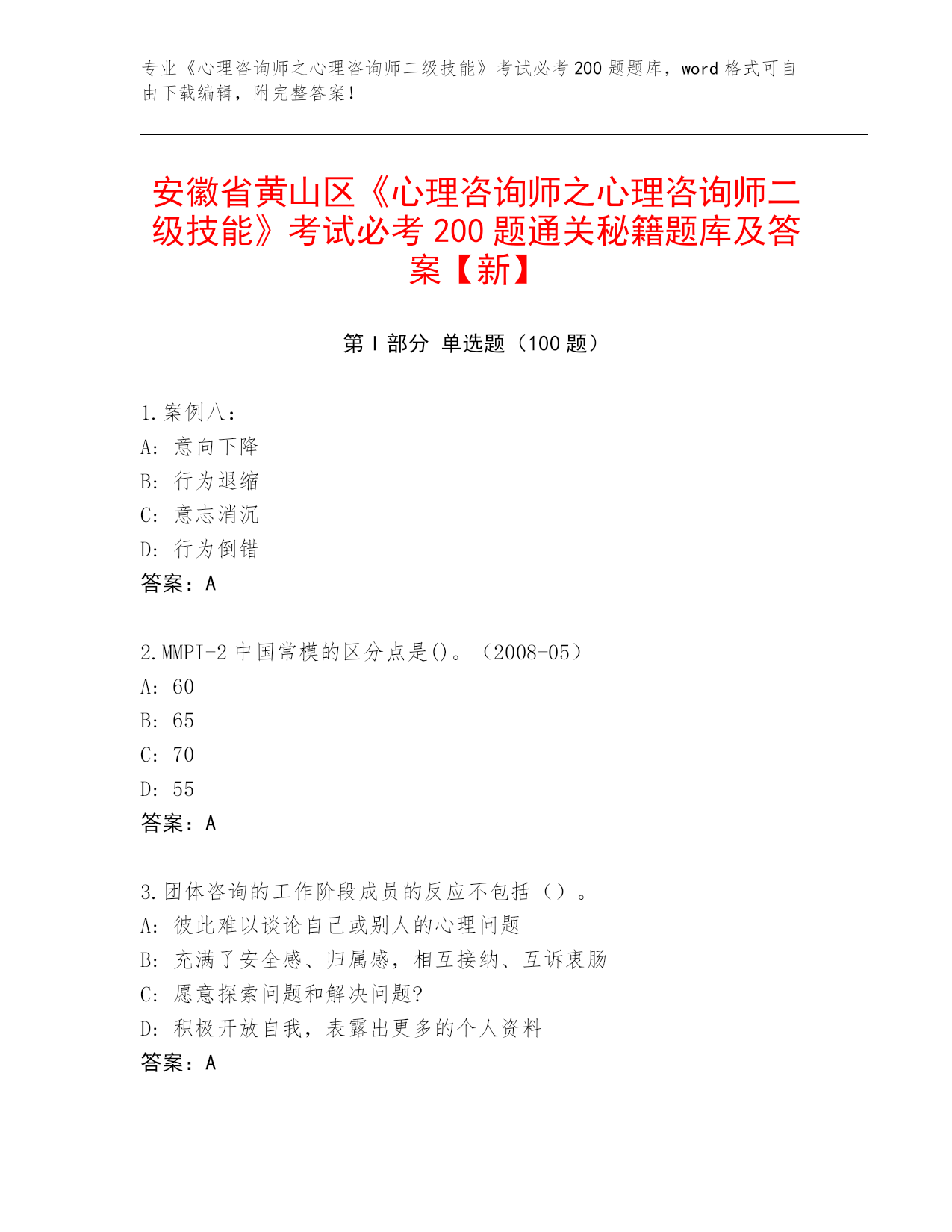 安徽省黄山区《心理咨询师之心理咨询师二级技能》考试必考200题通关秘籍题库及答案【新】