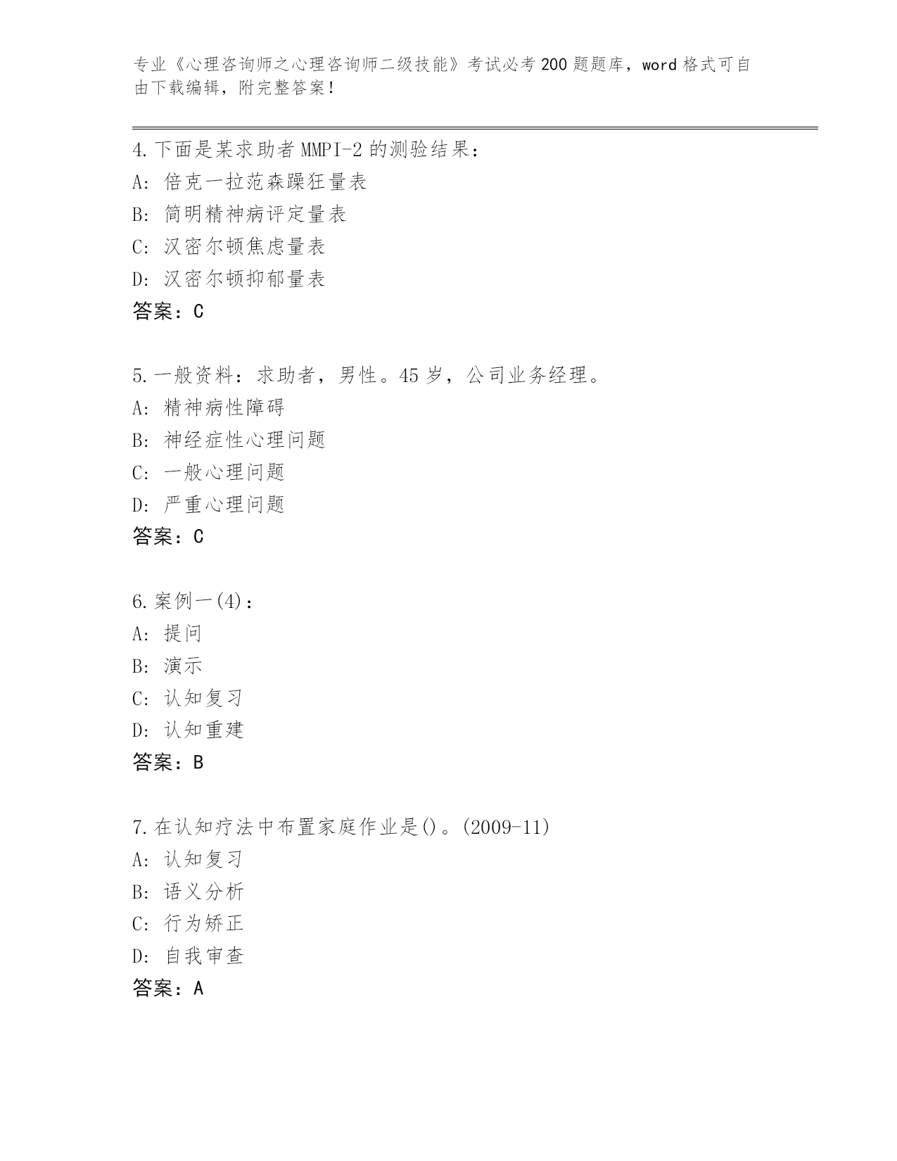安徽省包河区2024年《心理咨询师之心理咨询师二级技能》考试必考200题通关秘籍题库及答案(全优)