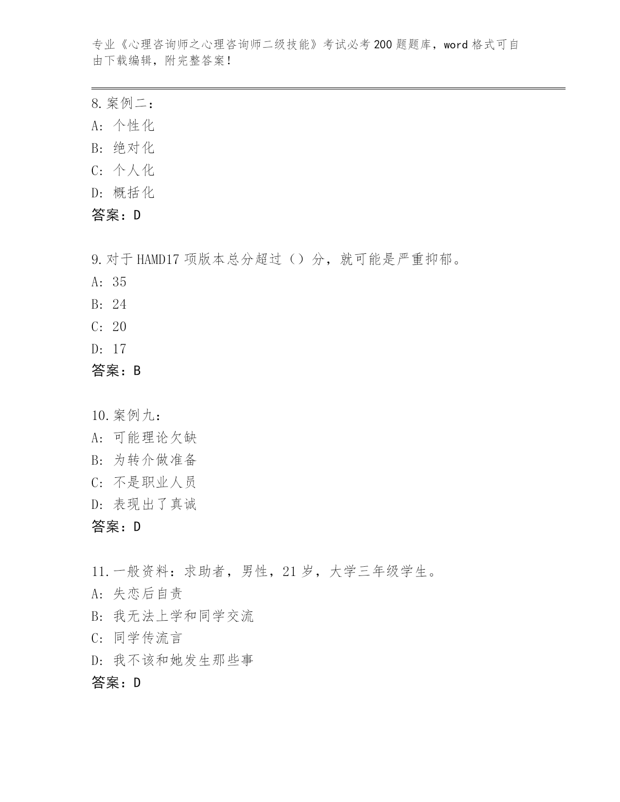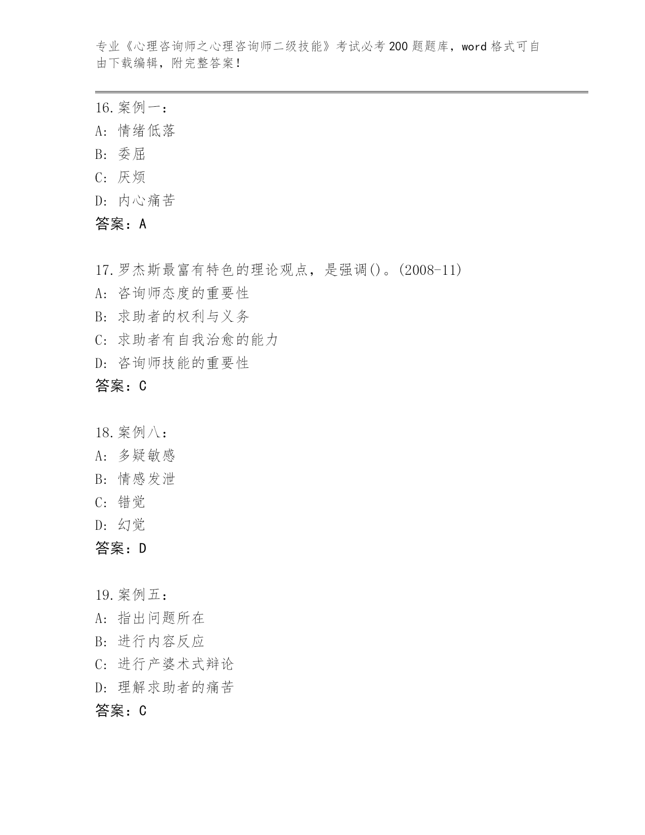 湖北省《心理咨询师之心理咨询师二级技能》考试必考200题通关秘籍题库附答案