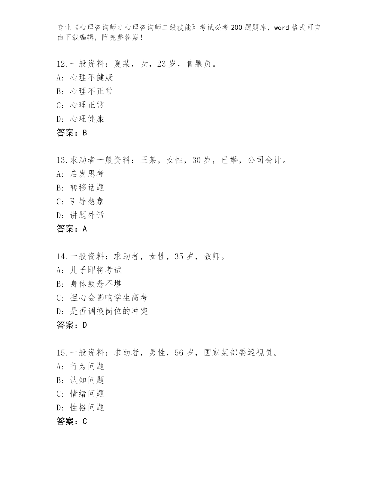 安徽省谯城区2024年《心理咨询师之心理咨询师二级技能》考试必考200题通关秘籍题库及答案解析