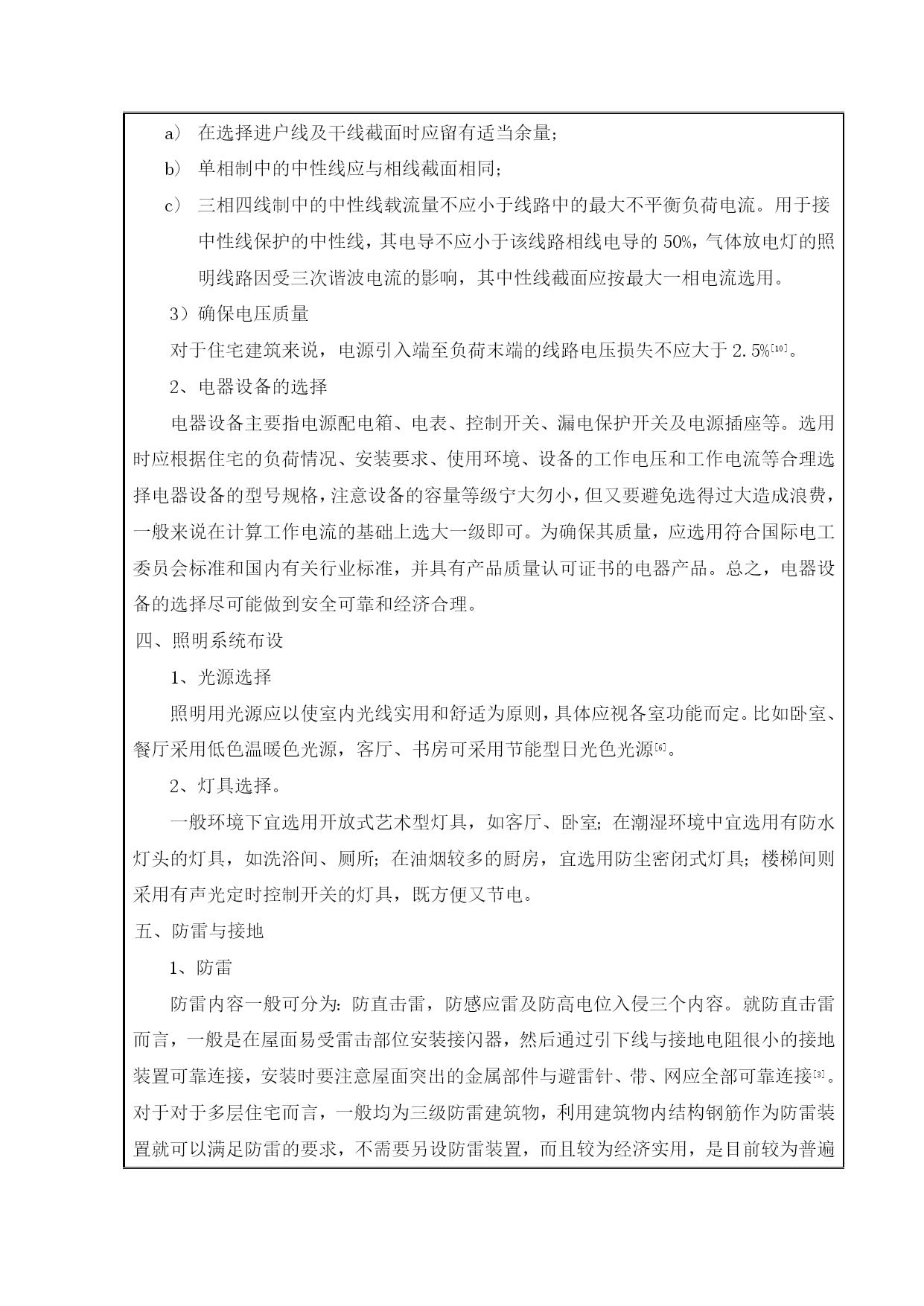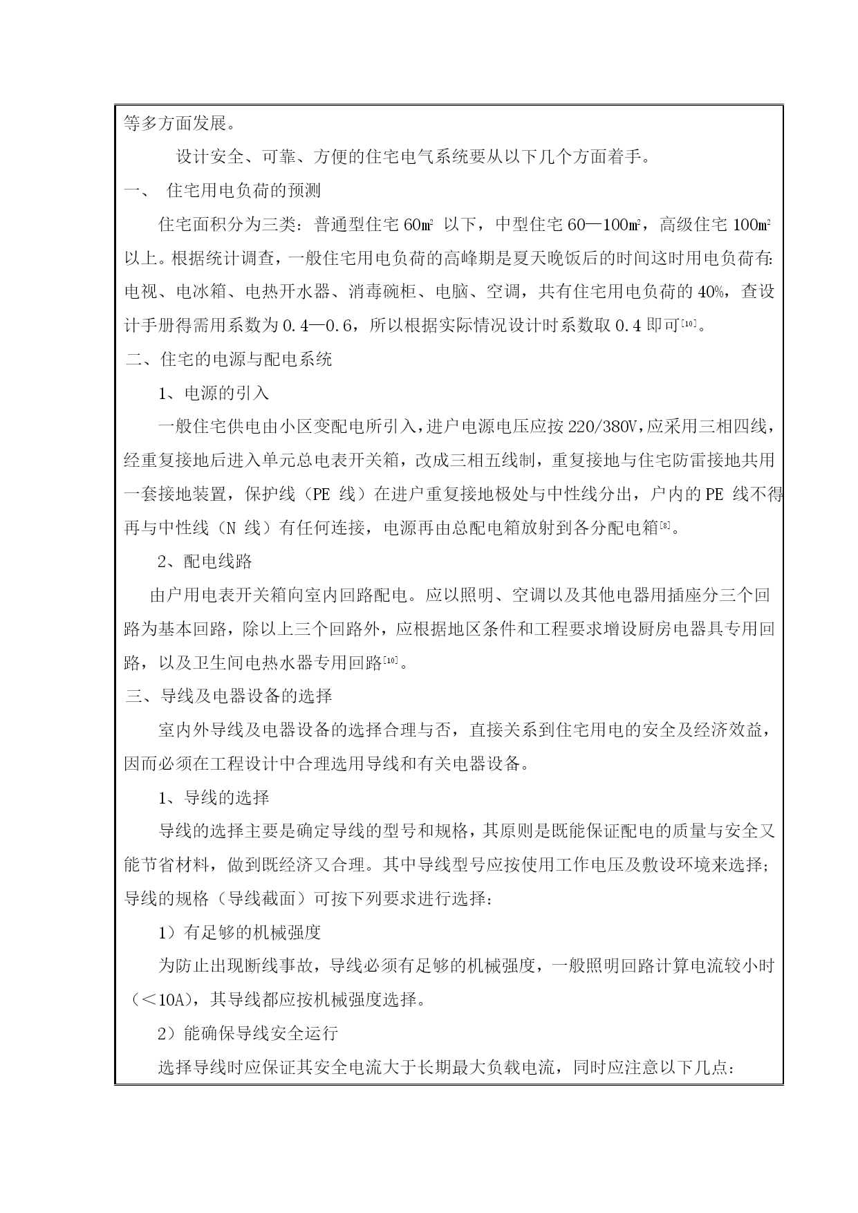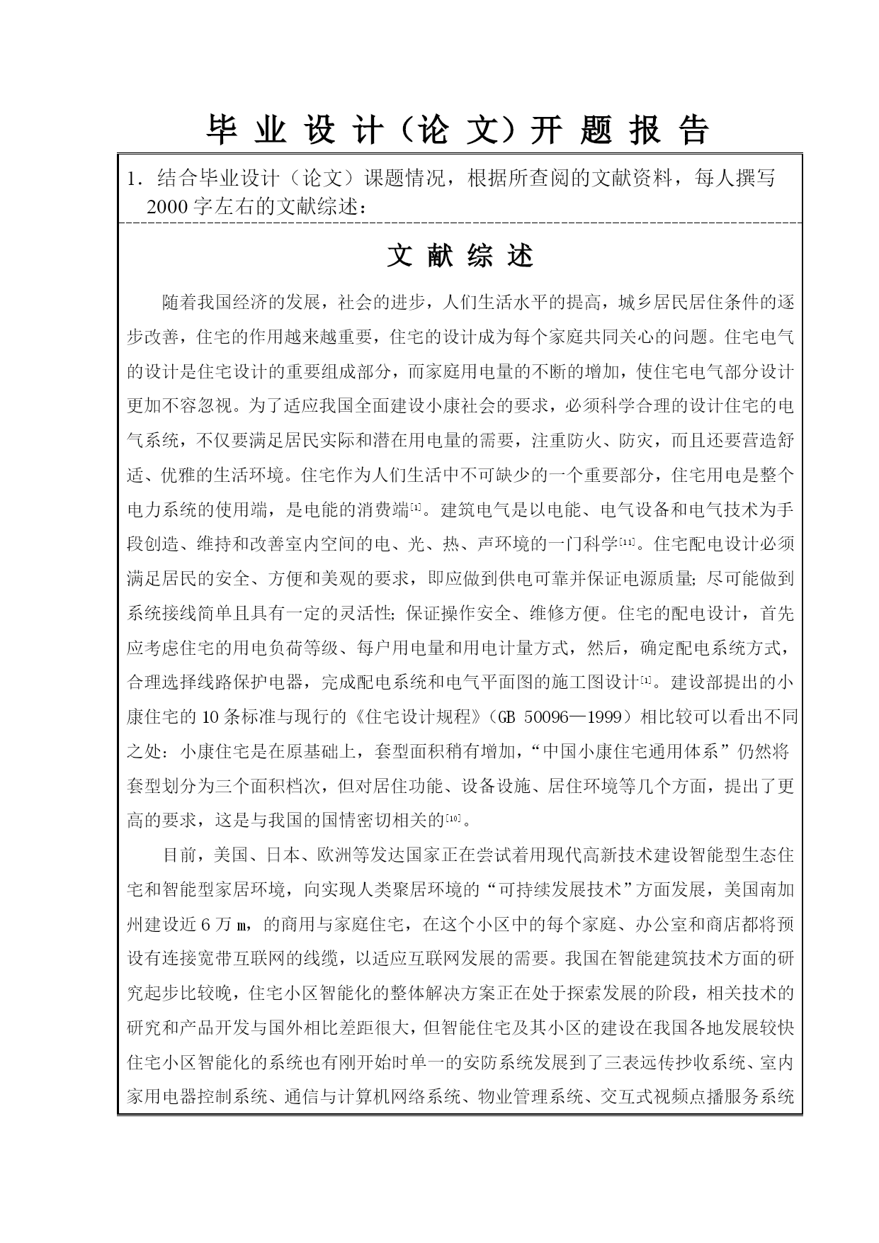 毕业设计(论文)开题报告学生姓名:学号:09144802专业:供用电技术设计(论文)题目:多层住宅电气部分设计指导教师:2012年4月6日开题报告填写要求1.开题报告(含“文献综述”)作为毕业设计(论文)答辩委员会对学生答辩资格审查的依据材料之一。此报告应在指导教师指导下,由学生在毕业设计(论文)工作前期内完成,经指导教师签署意见及所在系审查后生效;2.开题报告内容必须用黑墨水笔工整书写或按教务处统一设计的电子文档标准格式打印,禁止打印在其它纸上后剪贴,完成后应及时交给指导教师签署意见;3.“文献综述”应按论文的格式成文,并直接书写(或打印)在本开题报告第一栏目内,学生写文献综述的参考文献应不少于10篇(不包括辞典、手册);4.有关年月日等日期的填写,应当按照国标GB/T7408—94《数据元和交换格式、信息交换、日期和时间表示法》规定的要求,一律用阿拉伯数字书写。如“2002年4月26日”或“2002-04-26”。毕业设计(论文)开题报告1.结合毕业设计(论文)课题情况,根据所查阅的文献资料,每人撰写2000字左右的文献综述:文献综述随着我国经济的发展,社会的进步,人们生活水平的提高,城乡居民居住条件的逐步改善,住宅的作用越来越重要,住宅的设计成为每个家庭共同关心的问题。住宅电气的设计是住宅设计的重要组成部分,而家庭用电量的不断的增加,使住宅电气部分设计更加不容忽视。为了适应我国全面建设小康社会的要求,必须科学合理的设计住宅的电气系统,不仅要满足居民实际和潜在用电量的需要,注重防火、防灾,而且还要营造舒适、优雅的生活环境。住宅作为人们生活中不可缺少的一个重要部分,住宅用电是整个电力系统的使用端,是电能的消费端[1]。建筑电气是以电能、电气设备和电气技术为手段创造、维持和改善室内空间的电、光、热、声环境的一门科学[11]。住宅配电设计必须满足居民的安全、方便和美观的要求,即应做到供电可靠并保证电源质量;尽可能做到系统接线简单且具有一定的灵活性;保证操作安全、维修方便。住宅的配电设计,首先应考虑住宅的用电负荷等级、每户用电量和用电计量方式,然后,确定配电系统方式,合理选择线路保护电器,完成配电系统和电气平面图的施工图设计[1]。建设部提出的小康住宅的10条标准与现行的《住宅设计规程》(GB50096—1999)相比较可以看出不同之处:小康住宅是在原基础上,套型面积稍有增加,“中国小康住宅通用体系”仍然将套型划分为三个面积档次,但对居住功能、设备设施、居住环境等几个方面,提出了更高的要求,这是与我国的国情密切相关的[10]。目前,美国、日本、欧洲等发达国家正在尝试着用现代高新技术建设智能型生态住宅和智能型家居环境,向实现人类聚居环境的“可持续发展技术”方面发展,美国南加州建设近6万m,的商用与家庭住宅,在这个小区中的每个家庭、办公室和商店都将预设有连接宽带互联网的线缆,以适应互联网发展的需要。我国在智能建筑技术方面的研究起步比较晚,住宅小区智能化的整体解决方案正在处于探索发展的阶段,相关技术的研究和产品开发与国外相比差距很大,但智能住宅及其小区的建设在我国各地发展较快住宅小区智能化的系统也有刚开始时单一的安防系统发展到了三表远传抄收系统、室内家用电器控制系统、通信与计算机网络系统、物业管理系统、交互式视频点播服务系统等多方面发展。设计安全、可靠、方便的住宅电气系统要从以下几个方面着手。一、住宅用电负荷的预测住宅面积分为三类:普通型住宅60m2以下,中型住宅60—100m2,高级住宅100m2以上。根据统计调查,一般住宅用电负荷的高峰期是夏天晚饭后的时间这时用电负荷有:电视、电冰箱、电热开水器、消毒碗柜、电脑、空调,共有住宅用电负荷的40%,查设计手册得需用系数为0.4—0.6,所以根据实际情况设计时系数取0.4即可[10]。二、住宅的电源与配电系统1、电源的引入一般住宅供电由小区变配电所引入,进户电源电压应按220/380V,应采用三相四线,经重复接地后进入单元总电表开关箱,改成三相五线制,重复接地与住宅防雷接地共用一套接地装置,保护线(PE线)在进户重复接地极处与中性线分出,户内的PE线不得再与中性线(N线)有任何连接,电源再由总配电箱放射到各分配电箱[8]。2、配电线路由户用电表开关箱向室内回路配电。应以照明、空调以及其他电器用插座分三个回路为基本回路,除以上三个回路外,应根据地区条件和工程要求增设厨房电器具专用回路,以及卫生间电热水器专用回路[10]。三、导线及电器设备的选择室内外导线及电器设备的选择合理与否,直接关系到住宅用电的安全及经济效益,因而必须在工程设计中合理选用导线和有关电器设备。1、导线的选择导线的选择主要是确