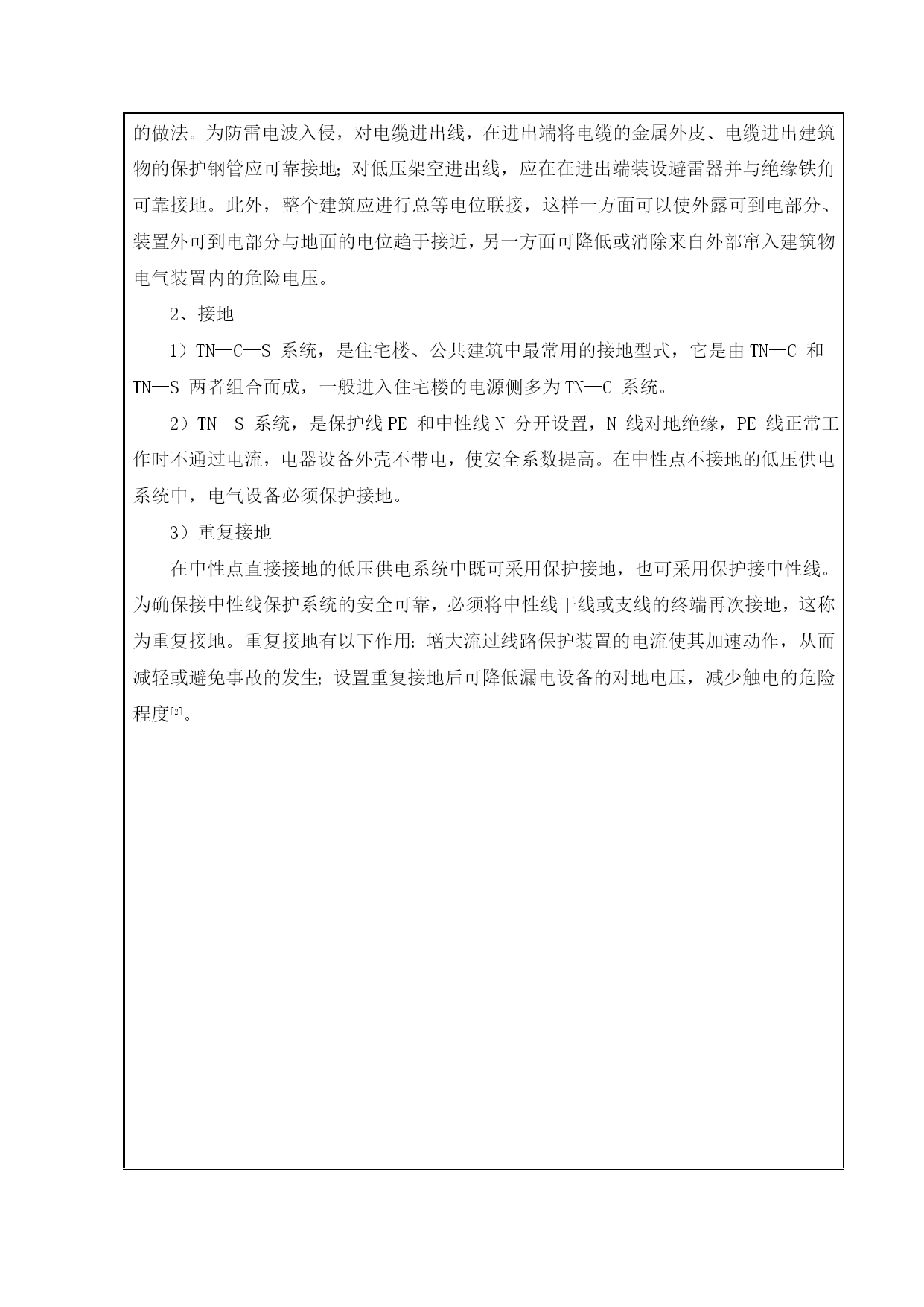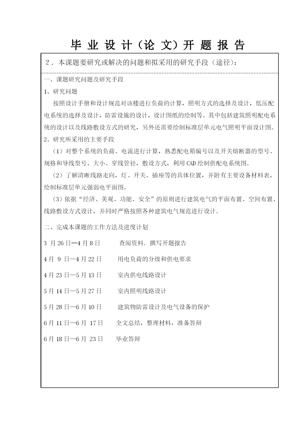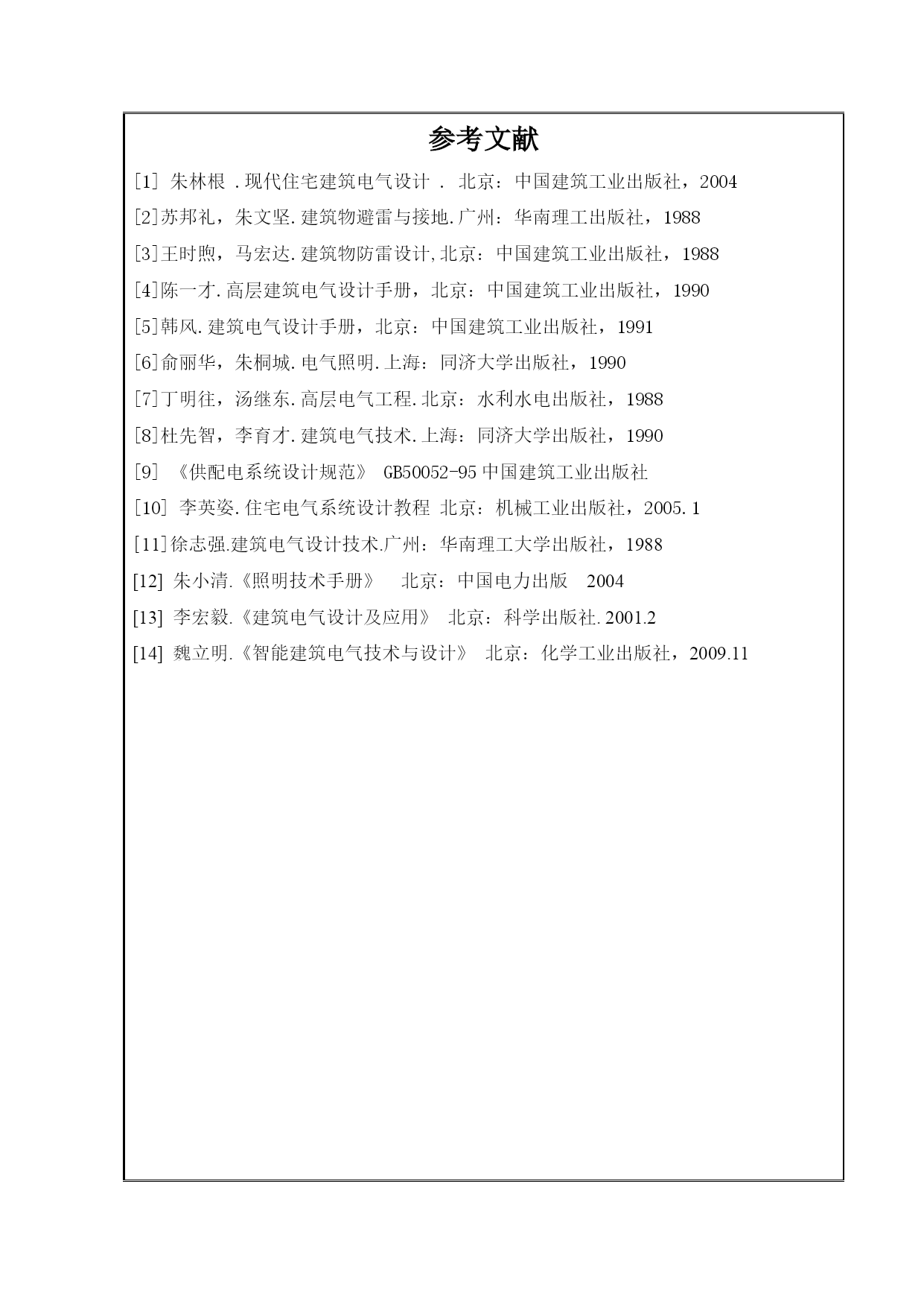毕业设计(论文)开题报告学生姓名:学号:09144802专业:供用电技术设计(论文)题目:多层住宅电气部分设计指导教师:2012年4月6日开题报告填写要求1.开题报告(含“文献综述”)作为毕业设计(论文)答辩委员会对学生答辩资格审查的依据材料之一。此报告应在指导教师指导下,由学生在毕业设计(论文)工作前期内完成,经指导教师签署意见及所在系审查后生效;2.开题报告内容必须用黑墨水笔工整书写或按教务处统一设计的电子文档标准格式打印,禁止打印在其它纸上后剪贴,完成后应及时交给指导教师签署意见;3.“文献综述”应按论文的格式成文,并直接书写(或打印)在本开题报告第一栏目内,学生写文献综述的参考文献应不少于10篇(不包括辞典、手册);4.有关年月日等日期的填写,应当按照国标GB/T7408—94《数据元和交换格式、信息交换、日期和时间表示法》规定的要求,一律用阿拉伯数字书写。如“2002年4月26日”或“2002-04-26”。毕业设计(论文)开题报告1.结合毕业设计(论文)课题情况,根据所查阅的文献资料,每人撰写2000字左右的文献综述:文献综述随着我国经济的发展,社会的进步,人们生活水平的提高,城乡居民居住条件的逐步改善,住宅的作用越来越重要,住宅的设计成为每个家庭共同关心的问题。住宅电气的设计是住宅设计的重要组成部分,而家庭用电量的不断的增加,使住宅电气部分设计更加不容忽视。为了适应我国全面建设小康社会的要求,必须科学合理的设计住宅的电气系统,不仅要满足居民实际和潜在用电量的需要,注重防火、防灾,而且还要营造舒适、优雅的生活环境。住宅作为人们生活中不可缺少的一个重要部分,住宅用电是整个电力系统的使用端,是电能的消费端[1]。建筑电气是以电能、电气设备和电气技术为手段创造、维持和改善室内空间的电、光、热、声环境的一门科学[11]。住宅配电设计必须满足居民的安全、方便和美观的要求,即应做到供电可靠并保证电源质量;尽可能做到系统接线简单且具有一定的灵活性;保证操作安全、维修方便。住宅的配电设计,首先应考虑住宅的用电负荷等级、每户用电量和用电计量方式,然后,确定配电系统方式,合理选择线路保护电器,完成配电系统和电气平面图的施工图设计[1]。建设部提出的小康住宅的10条标准与现行的《住宅设计规程》(GB50096—1999)相比较可以看出不同之处:小康住宅是在原基础上,套型面积稍有增加,“中国小康住宅通用体系”仍然将套型划分为三个面积档次,但对居住功能、设备设施、居住环境等几个方面,提出了更高的要求,这是与我国的国情密切相关的[10]。目前,美国、日本、欧洲等发达国家正在尝试着用现代高新技术建设智能型生态住宅和智能型家居环境,向实现人类聚居环境的“可持续发展技术”方面发展,美国南加州建设近6万m,的商用与家庭住宅,在这个小区中的每个家庭、办公室和商店都将预设有连接宽带互联网的线缆,以适应互联网发展的需要。我国在智能建筑技术方面的研究起步比较晚,住宅小区智能化的整体解决方案正在处于探索发展的阶段,相关技术的研究和产品开发与国外相比差距很大,但智能住宅及其小区的建设在我国各地发展较快住宅小区智能化的系统也有刚开始时单一的安防系统发展到了三表远传抄收系统、室内家用电器控制系统、通信与计算机网络系统、物业管理系统、交互式视频点播服务系统等多方面发展。设计安全、可靠、方便的住宅电气系统要从以下几个方面着手。一、住宅用电负荷的预测住宅面积分为三类:普通型住宅60m2以下,中型住宅60—100m2,高级住宅100m2以上。根据统计调查,一般住宅用电负荷的高峰期是夏天晚饭后的时间这时用电负荷有:电视、电冰箱、电热开水器、消毒碗柜、电脑、空调,共有住宅用电负荷的40%,查设计手册得需用系数为0.4—0.6,所以根据实际情况设计时系数取0.4即可[10]。二、住宅的电源与配电系统1、电源的引入一般住宅供电由小区变配电所引入,进户电源电压应按220/380V,应采用三相四线,经重复接地后进入单元总电表开关箱,改成三相五线制,重复接地与住宅防雷接地共用一套接地装置,保护线(PE线)在进户重复接地极处与中性线分出,户内的PE线不得再与中性线(N线)有任何连接,电源再由总配电箱放射到各分配电箱[8]。2、配电线路由户用电表开关箱向室内回路配电。应以照明、空调以及其他电器用插座分三个回路为基本回路,除以上三个回路外,应根据地区条件和工程要求增设厨房电器具专用回路,以及卫生间电热水器专用回路[10]。三、导线及电器设备的选择室内外导线及电器设备的选择合理与否,直接关系到住宅用电的安全及经济效益,因而必须在工程设计中合理选用导线和有关电器设备。1、导线的选择导线的选择主要是确