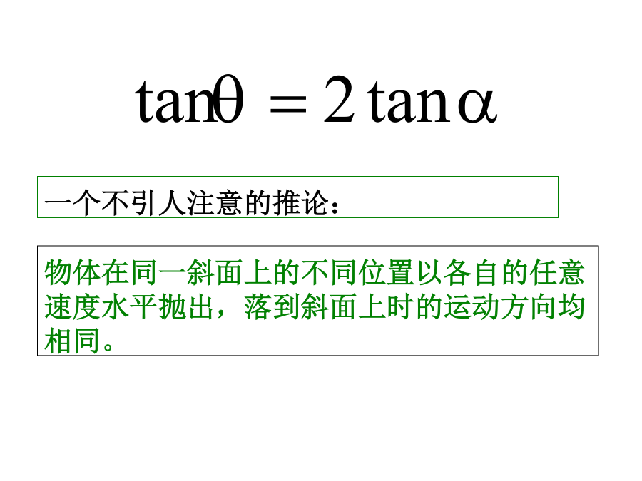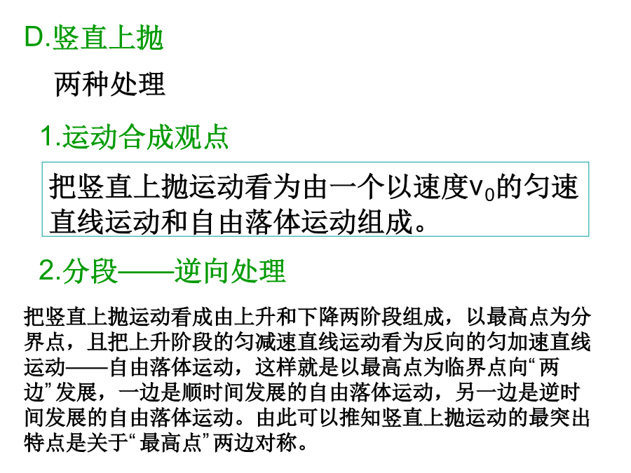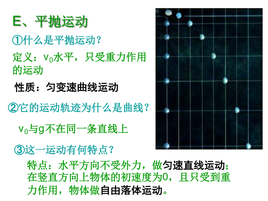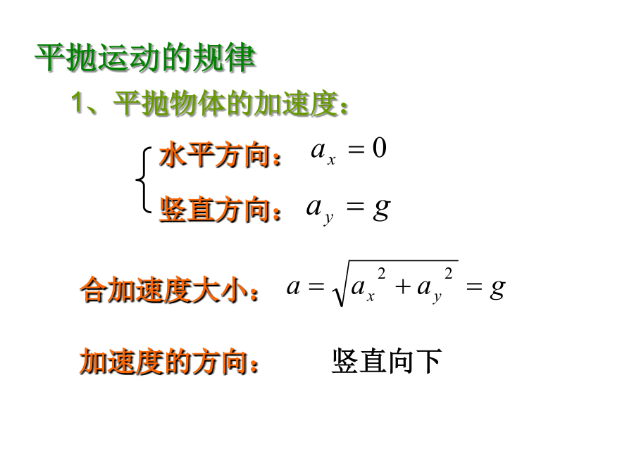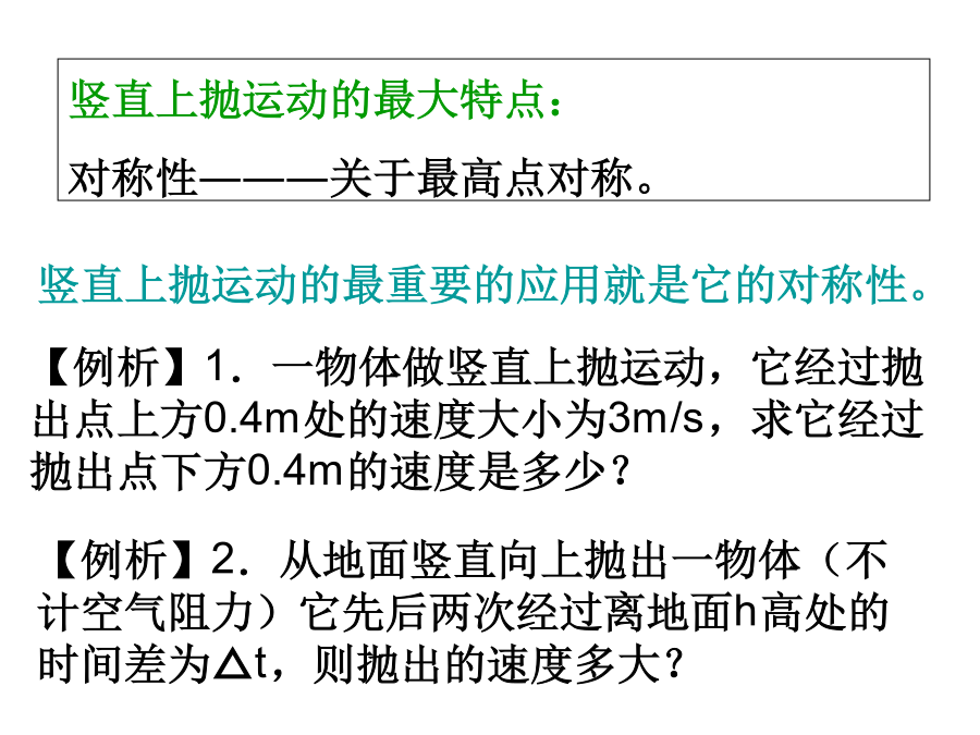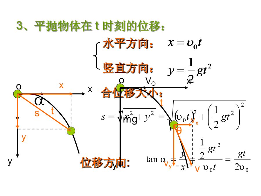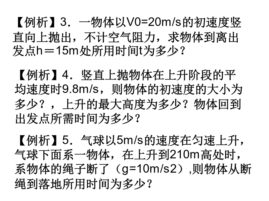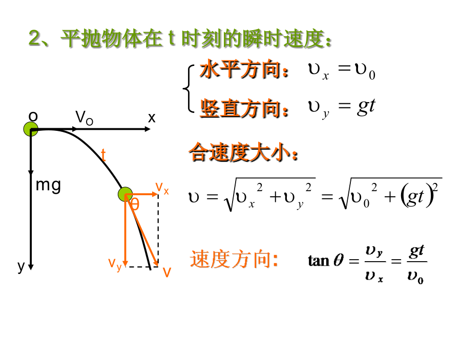 【例析】3.有一辆汽车尾部敞开,顶篷只能盖到A处,货物可放到B处,如图所示,AB连线与竖直方向AC的夹角φ=300。汽车冒雨在平直公路上以6km/h的速度行驶时,雨点恰好能淋到C点,而不发生侧向偏移,当汽车以18km/h的速度行驶时,雨滴恰好能打到B点,则雨点的速度大小为多少?D.竖直上抛竖直上抛运动的最大特点:对称性―――关于最高点对称。【例析】3.一物体以V0=20m/s的初速度竖直向上抛出,不计空气阻力,求物体到离出发点h=15m处所用时间t为多少?有空气阻力的竖直向上抛出物体的运动E、平抛运动1、平抛物体的加速度:2、平抛物体在t时刻的瞬时速度:3、平抛物体在t时刻的位移:一个不引人注意的推论:4.难点透视2对平抛运动几个物理量的讨论a.平抛运动物体在空中运动的时间,由高度h决定,与初速度无关。b.平抛运动物体的水平位移,与水平初速度V0及高度h都由关系。C.落地瞬时速度的大小,由水平初速度V0及高度h决定。d.落地速度方向与水平方向的夹角,h越大,空中运动时间越长,φ越大。2平抛物体运动中的速度变化F、类平抛运动【例析】6.如图所示,三个α粒子在同一地点沿同一方向同时垂直于电场方向飞入电场,轨迹如图,则可以看出()A.b飞离电场的同时,a刚好打在负极板上B.它们进入电场时的初速度Vc>Vb>VaC.在电场中的飞行时间ta=tb>tcD.在此过程中粒子动能的增加量ΔEka=ΔEkb>ΔEkc5.平抛运动和类平抛运动飞行时间的决定因素讨论1.质量为m的子弹在h=10m高处以800m/s的水平速度射出枪口,质量为M(M>m)的物体也在同一地方同时以10m/s的水平速度抛出,(不计空气阻力),则有()A.物体比子弹落地迟B.子弹比物体落地迟C.子弹水平飞行距离较长D.无法确定特殊情况:知道抛出点、下落高度h和飞行的水平位移S的情况:有:得:普适情况: