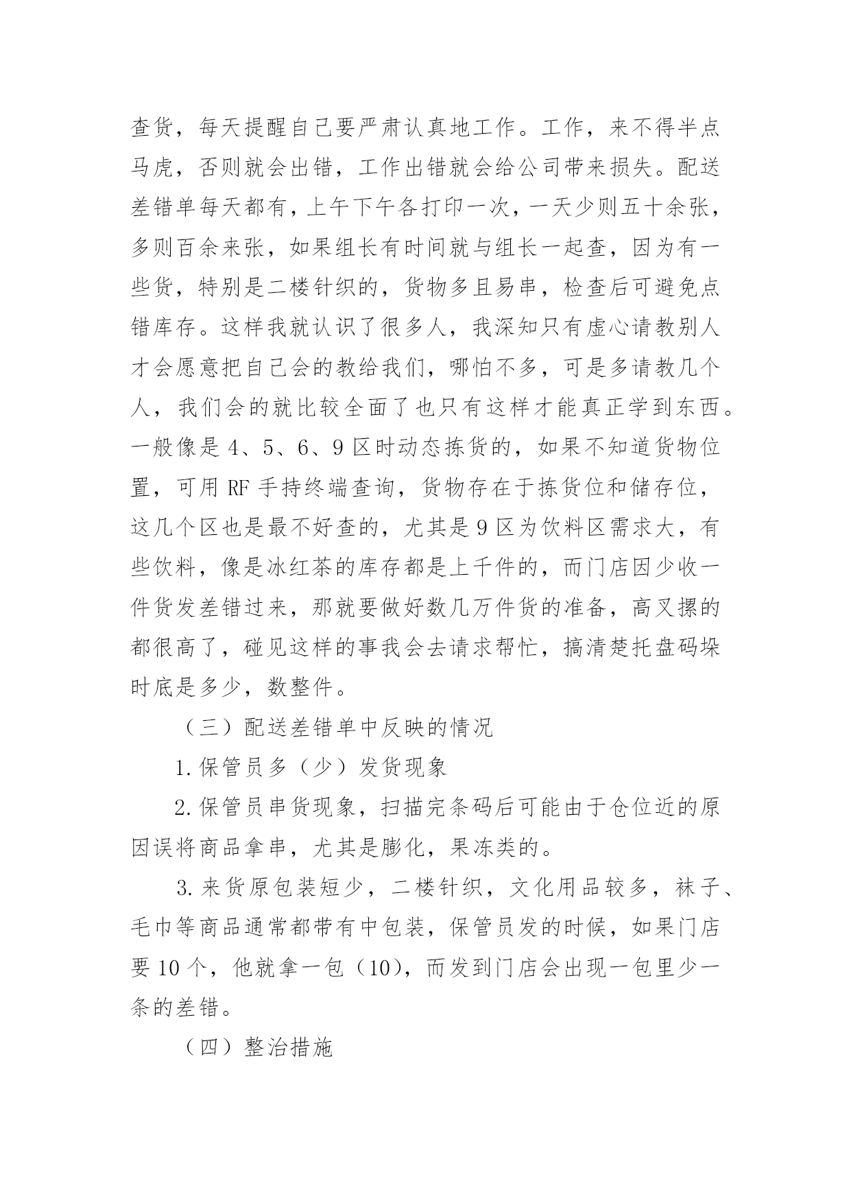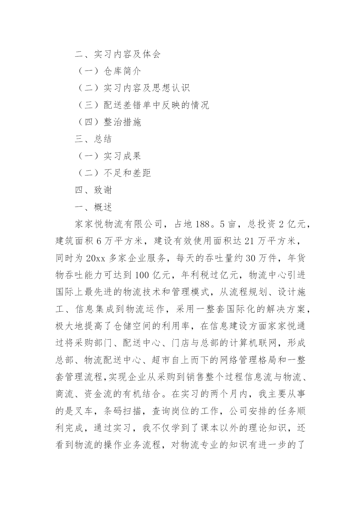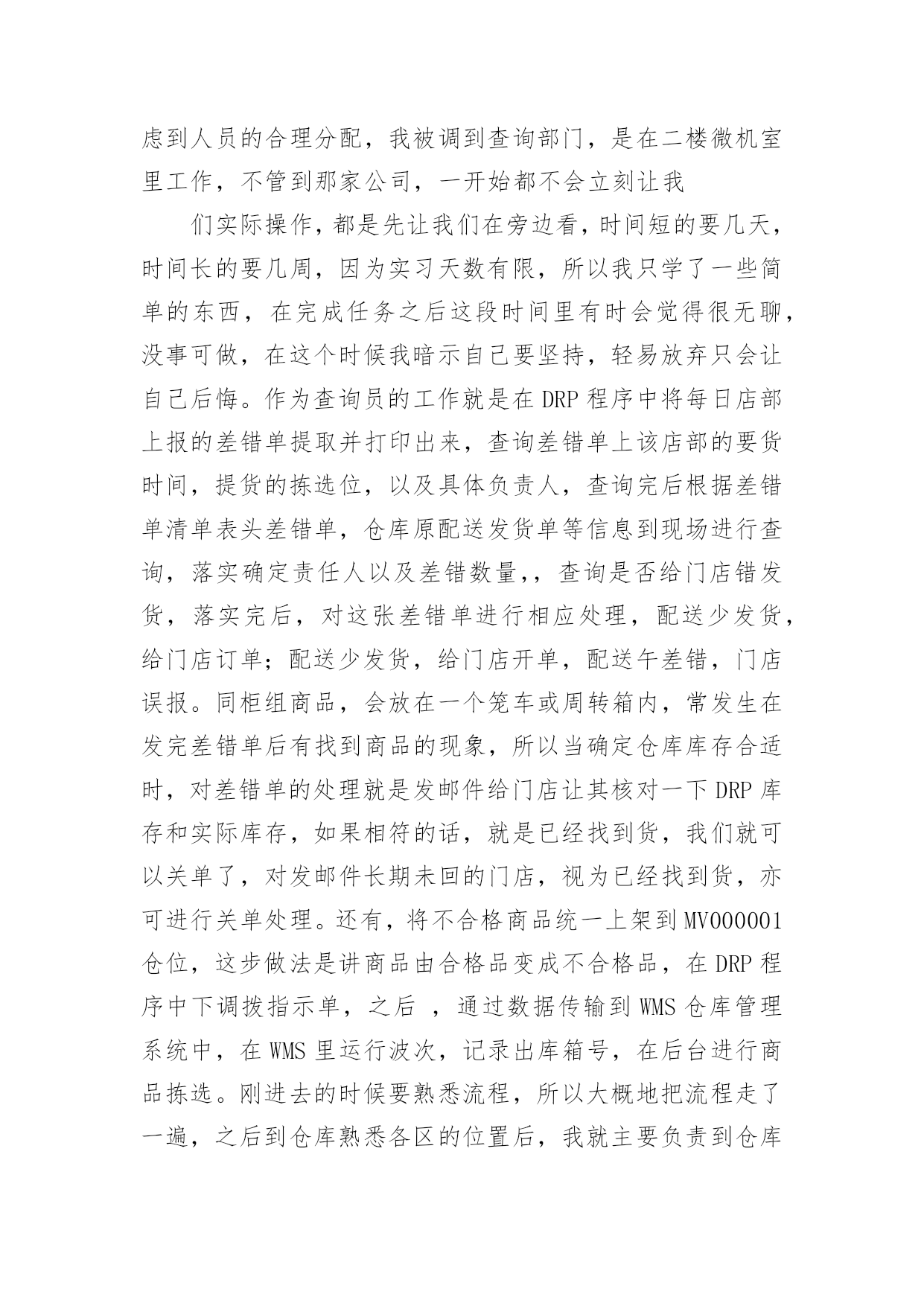 物流的实习报告关于物流的实习报告在现在社会,报告使用的频率越来越高,其在写作上具有一定的窍门。写起报告来就毫无头绪?以下是小编为大家收集的关于物流的实习报告,仅供参考,大家一起来看看吧。关于物流的实习报告1xx学院顶岗实习报告系别管理工程系姓名xx学号xxxxxxx专业物流管理实习单位山东家家悦集团“威海物流中心”实习岗位查询学校指导教师xx实习单位指导教师实习日期:20xx年6月27日至20xx年8月26日xx学院09届顶岗实习报告目录一、概述二、实习内容及体会(一)仓库简介(二)实习内容及思想认识(三)配送差错单中反映的情况(四)整治措施三、总结(一)实习成果(二)不足和差距四、致谢一、概述家家悦物流有限公司,占地188。5亩,总投资2亿元,建筑面积6万平方米,建设有效使用面积达21万平方米,同时为20xx多家企业服务,每天的吞吐量约30万件,年货物吞吐能力可达到100亿元,年利税过亿元,物流中心引进国际上最先进的物流技术和管理模式,从流程规划、设计施工、信息集成到物流运作,采用一整套国际化的解决方案,极大地提高了仓储空间的利用率,在信息建设方面家家悦通过将采购部门、配送中心、门店与总部的计算机联网,形成总部、物流配送中心、超市自上而下的网络管理格局和一整套管理流程,实现企业从采购到销售整个过程信息流与物流、商流、资金流的有机结合。在实习的两个月内,我主要从事的是叉车,条码扫描,查询岗位的工作,公司安排的任务顺利完成,通过实习,我不仅学到了课本以外的理论知识,还看到物流的操作业务流程,对物流专业的知识有进一步的了解。二、实习内容及体会(一)仓库简介来到家家悦配送中心,真正感受到现代物流的气息,仓库一楼是作业区,分为北中南,北区是语音拣选区,拣选工具是语音拣选和电动拖车,这是国内目前首家采用语言拣选的仓库管理系统,能进行人机对话,工作效率非常高。中区分为0区地堆,6区糕点区,5区调味区,使用的拣选工具是RF枪,电拖。南区分1区化洗拆零区,2区日用区,3区食品拆零,4区饼干区,集货发运区,开电拖将集货暂存区商品运到集货发货区,按RF指示,送到指定店部。二楼,针织文化,贵重商品,在一楼用高叉将来货送到二楼收货区,有4个货物入口,笼车上下是通过升降机来实现的,另外还有直通商品,它的拣选方式是播种式(二)实习内容及思想认识思想是行为的先导,它支配着人的行为,也决定着人们做事的'态度,只有有了坚定地态度、乐观的情绪,才能采取积极地行动,对于顶岗实习同样也是如此。自顶岗实习开始,我就时刻提醒自己保持一个积极乐观的心态,坚定自己的态度。刚去的时候开了2天叉车,叉车是对成件托盘货物进行装卸,堆垛和短距离运输作业的搬运车辆,练了近两天,虽然一直想要做好,但对拖车的控制能力还是很生熟,确实不合适,所有就调了工作,转用RF枪扫描将要运到各门店的装有货物的笼车及托盘上的条码,实习时长一周,之后考虑到人员的合理分配,我被调到查询部门,是在二楼微机室里工作,不管到那家公司,一开始都不会立刻让我们实际操作,都是先让我们在旁边看,时间短的要几天,时间长的要几周,因为实习天数有限,所以我只学了一些简单的东西,在完成任务之后这段时间里有时会觉得很无聊,没事可做,在这个时候我暗示自己要坚持,轻易放弃只会让自己后悔。作为查询员的工作就是在DRP程序中将每日店部上报的差错单提取并打印出来,查询差错单上该店部的要货时间,提货的拣选位,以及具体负责人,查询完后根据差错单清单表头差错单,仓库原配送发货单等信息到现场进行查询,落实确定责任人以及差错数量,,查询是否给门店错发货,落实完后,对这张差错单进行相应处理,配送少发货,给门店订单;配送少发货,给门店开单,配送午差错,门店误报。同柜组商品,会放在一个笼车或周转箱内,常发生在发完差错单后有找到商品的现象,所以当确定仓库库存合适时,对差错单的处理就是发邮件给门店让其核对一下DRP库存和实际库存,如果相符的话,就是已经找到货,我们就可以关单了,对发邮件长期未回的门店,视为已经找到货,亦可进行关单处理。还有,将不合格商品统一上架到MV000001仓位,这步做法是讲商品由合格品变成不合格品,在DRP程序中下调拨指示单,之后,通过数据传输到WMS仓库管理系统中,在WMS里运行波次,记录出库箱号,在后台进行商品拣选。刚进去的时候要熟悉流程,所以大概地把流程走了一遍,之后到仓库熟悉各区的位置后,我就主要负责到仓库查货,每天提醒自己要严肃认真地工作。工作,来不得半点马虎,否则就会出错,工作出错就会给公司带来损失。配送差错单每天都有,上午下午各打印一次,一天少则五十余张,多则百余来张,如果组长有时间就与组长一起查,因为有一些货,特别是二楼针织的,货物多且易串,检查后可避免点错库存。这样我就认识了很多人,我深知只有虚心请教别人才会愿意把自