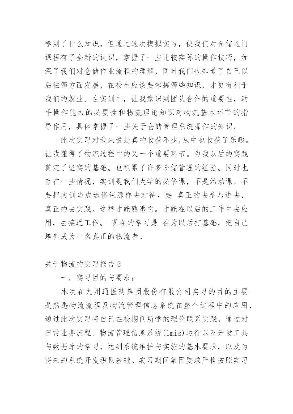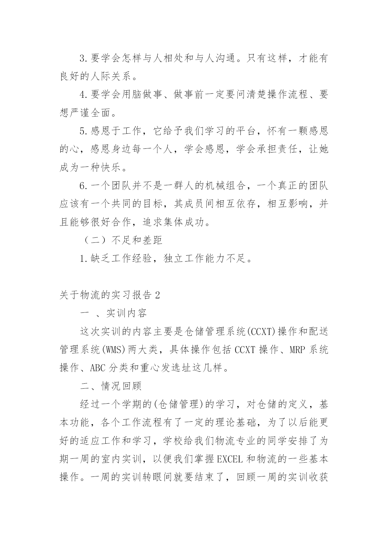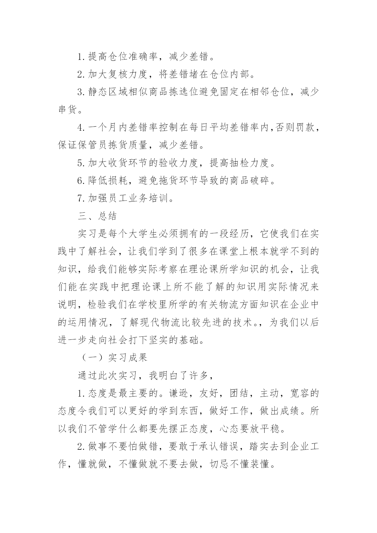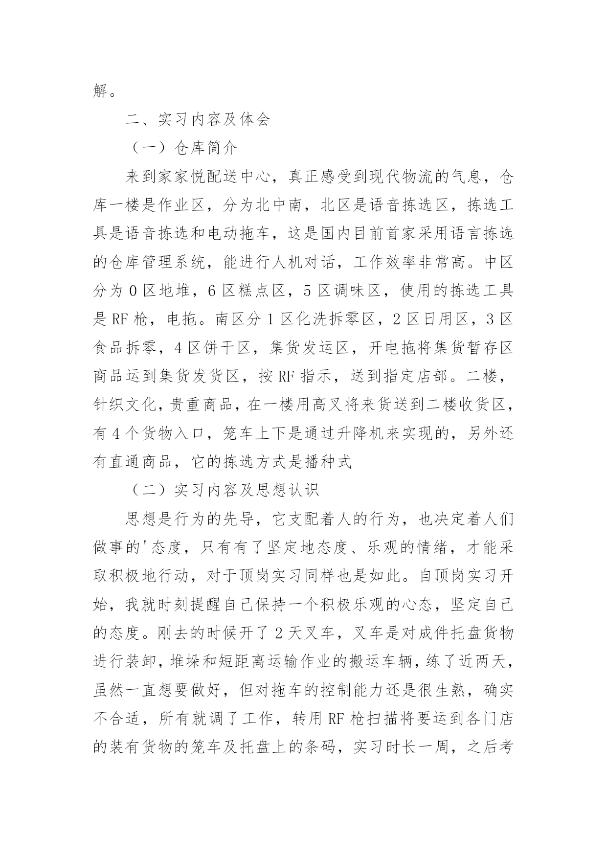 物流的实习报告关于物流的实习报告在现在社会,报告使用的频率越来越高,其在写作上具有一定的窍门。写起报告来就毫无头绪?以下是小编为大家收集的关于物流的实习报告,仅供参考,大家一起来看看吧。关于物流的实习报告1xx学院顶岗实习报告系别管理工程系姓名xx学号xxxxxxx专业物流管理实习单位山东家家悦集团“威海物流中心”实习岗位查询学校指导教师xx实习单位指导教师实习日期:20xx年6月27日至20xx年8月26日xx学院09届顶岗实习报告目录一、概述二、实习内容及体会(一)仓库简介(二)实习内容及思想认识(三)配送差错单中反映的情况(四)整治措施三、总结(一)实习成果(二)不足和差距四、致谢一、概述家家悦物流有限公司,占地188。5亩,总投资2亿元,建筑面积6万平方米,建设有效使用面积达21万平方米,同时为20xx多家企业服务,每天的吞吐量约30万件,年货物吞吐能力可达到100亿元,年利税过亿元,物流中心引进国际上最先进的物流技术和管理模式,从流程规划、设计施工、信息集成到物流运作,采用一整套国际化的解决方案,极大地提高了仓储空间的利用率,在信息建设方面家家悦通过将采购部门、配送中心、门店与总部的计算机联网,形成总部、物流配送中心、超市自上而下的网络管理格局和一整套管理流程,实现企业从采购到销售整个过程信息流与物流、商流、资金流的有机结合。在实习的两个月内,我主要从事的是叉车,条码扫描,查询岗位的工作,公司安排的任务顺利完成,通过实习,我不仅学到了课本以外的理论知识,还看到物流的操作业务流程,对物流专业的知识有进一步的了解。二、实习内容及体会(一)仓库简介来到家家悦配送中心,真正感受到现代物流的气息,仓库一楼是作业区,分为北中南,北区是语音拣选区,拣选工具是语音拣选和电动拖车,这是国内目前首家采用语言拣选的仓库管理系统,能进行人机对话,工作效率非常高。中区分为0区地堆,6区糕点区,5区调味区,使用的拣选工具是RF枪,电拖。南区分1区化洗拆零区,2区日用区,3区食品拆零,4区饼干区,集货发运区,开电拖将集货暂存区商品运到集货发货区,按RF指示,送到指定店部。二楼,针织文化,贵重商品,在一楼用高叉将来货送到二楼收货区,有4个货物入口,笼车上下是通过升降机来实现的,另外还有直通商品,它的拣选方式是播种式(二)实习内容及思想认识思想是行为的先导,它支配着人的行为,也决定着人们做事的'态度,只有有了坚定地态度、乐观的情绪,才能采取积极地行动,对于顶岗实习同样也是如此。自顶岗实习开始,我就时刻提醒自己保持一个积极乐观的心态,坚定自己的态度。刚去的时候开了2天叉车,叉车是对成件托盘货物进行装卸,堆垛和短距离运输作业的搬运车辆,练了近两天,虽然一直想要做好,但对拖车的控制能力还是很生熟,确实不合适,所有就调了工作,转用RF枪扫描将要运到各门店的装有货物的笼车及托盘上的条码,实习时长一周,之后考虑到人员的合理分配,我被调到查询部门,是在二楼微机室里工作,不管到那家公司,一开始都不会立刻让我们实际操作,都是先让我们在旁边看,时间短的要几天,时间长的要几周,因为实习天数有限,所以我只学了一些简单的东西,在完成任务之后这段时间里有时会觉得很无聊,没事可做,在这个时候我暗示自己要坚持,轻易放弃只会让自己后悔。作为查询员的工作就是在DRP程序中将每日店部上报的差错单提取并打印出来,查询差错单上该店部的要货时间,提货的拣选位,以及具体负责人,查询完后根据差错单清单表头差错单,仓库原配送发货单等信息到现场进行查询,落实确定责任人以及差错数量,,查询是否给门店错发货,落实完后,对这张差错单进行相应处理,配送少发货,给门店订单;配送少发货,给门店开单,配送午差错,门店误报。同柜组商品,会放在一个笼车或周转箱内,常发生在发完差错单后有找到商品的现象,所以当确定仓库库存合适时,对差错单的处理就是发邮件给门店让其核对一下DRP库存和实际库存,如果相符的话,就是已经找到货,我们就可以关单了,对发邮件长期未回的门店,视为已经找到货,亦可进行关单处理。还有,将不合格商品统一上架到MV000001仓位,这步做法是讲商品由合格品变成不合格品,在DRP程序中下调拨指示单,之后,通过数据传输到WMS仓库管理系统中,在WMS里运行波次,记录出库箱号,在后台进行商品拣选。刚进去的时候要熟悉流程,所以大概地把流程走了一遍,之后到仓库熟悉各区的位置后,我就主要负责到仓库查货,每天提醒自己要严肃认真地工作。工作,来不得半点马虎,否则就会出错,工作出错就会给公司带来损失。配送差错单每天都有,上午下午各打印一次,一天少则五十余张,多则百余来张,如果组长有时间就与组长一起查,因为有一些货,特别是二楼针织的,货物多且易串,检查后可避免点错库存。这样我就认识了很多人,我深知只有虚心请教别人才会愿意把自