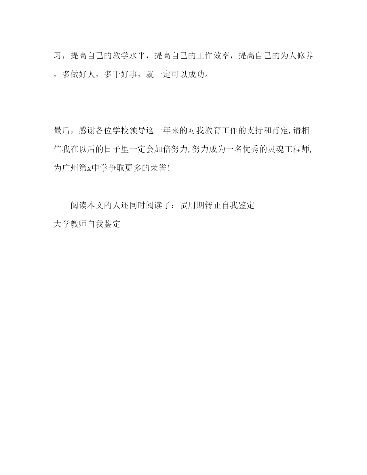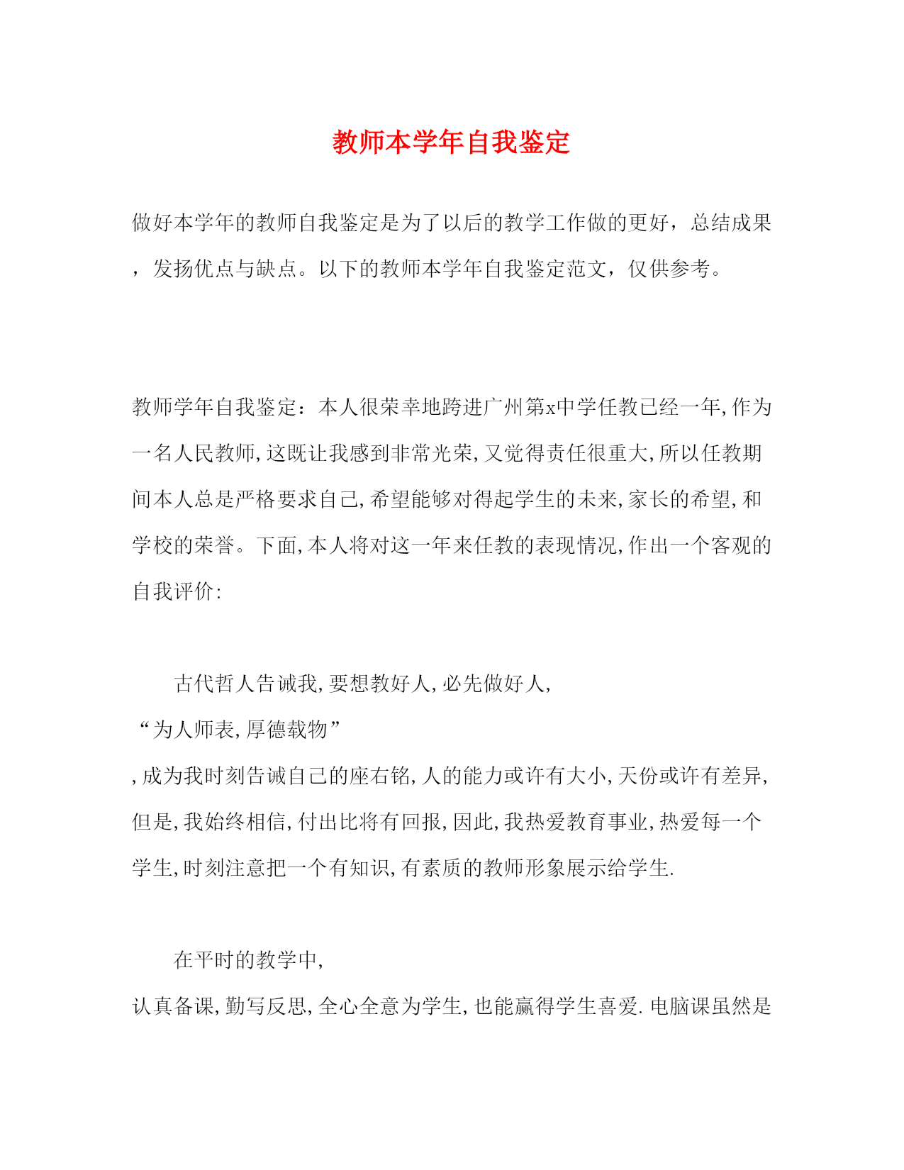PAGE此资料由网络收集而来,如有侵权请告知上传者立即删除。资料共分享,我们负责传递知识。教师本学年自我鉴定做好本学年的教师自我鉴定是为了以后的教学工作做的更好,总结成果,发扬优点与缺点。以下的教师本学年自我鉴定范文,仅供参考。教师学年自我鉴定:本人很荣幸地跨进广州第x中学任教已经一年,作为一名人民教师,这既让我感到非常光荣,又觉得责任很重大,所以任教期间本人总是严格要求自己,希望能够对得起学生的未来,家长的希望,和学校的荣誉。下面,本人将对这一年来任教的表现情况,作出一个客观的自我评价:古代哲人告诫我,要想教好人,必先做好人,“为人师表,厚德载物”,成为我时刻告诫自己的座右铭,人的能力或许有大小,天份或许有差异,但是,我始终相信,付出比将有回报,因此,我热爱教育事业,热爱每一个学生,时刻注意把一个有知识,有素质的教师形象展示给学生.在平时的教学中,认真备课,勤写反思,全心全意为学生,也能赢得学生喜爱.电脑课虽然是副课,却可以影响学生的未来,学生往往喜欢游戏,如何正确引导,成为我努力的方向,让知识与欢乐共同分享.教学教研方面,认真虚心的向其他教师请教,重视听课特别是师傅欧阳老师的课,每周听课不少于三节,认真写听课笔记,分析此节课的教学亮点.陶行之说过,教育理论只有和实践结合,才是真实的知识,让教学和科研一起成长,让理论和实践一起内化.为人处世方面,真诚对待每一位同事,,当同事有困难,及时帮助,特别是换课,同时听从领导的安排,认真完成任务,虚心对待同事给自己的建议.出勤方面,不迟到,上课不打手机,在校不作与教学无关的事情.我想,找到一份有成就感的工作,是不容易的,自己应该珍惜,说句心里话,自己还是有很多不足的地方,我记得中国有句老话,”不怕慢,就怕站”,即使离一个优秀的教师的差距还是存在,每天的小进步或许可以成为大进步。路漫漫,吾将上下而求索,只要自己不断努力,加强业务学习,提高自己的教学水平,提高自己的工作效率,提高自己的为人修养,多做好人,多干好事,就一定可以成功。最后,感谢各位学校领导这一年来的对我教育工作的支持和肯定,请相信我在以后的日子里一定会加倍努力,努力成为一名优秀的灵魂工程师,为广州第x中学争取更多的荣誉!阅读本文的人还同时阅读了:试用期转正自我鉴定大学教师自我鉴定