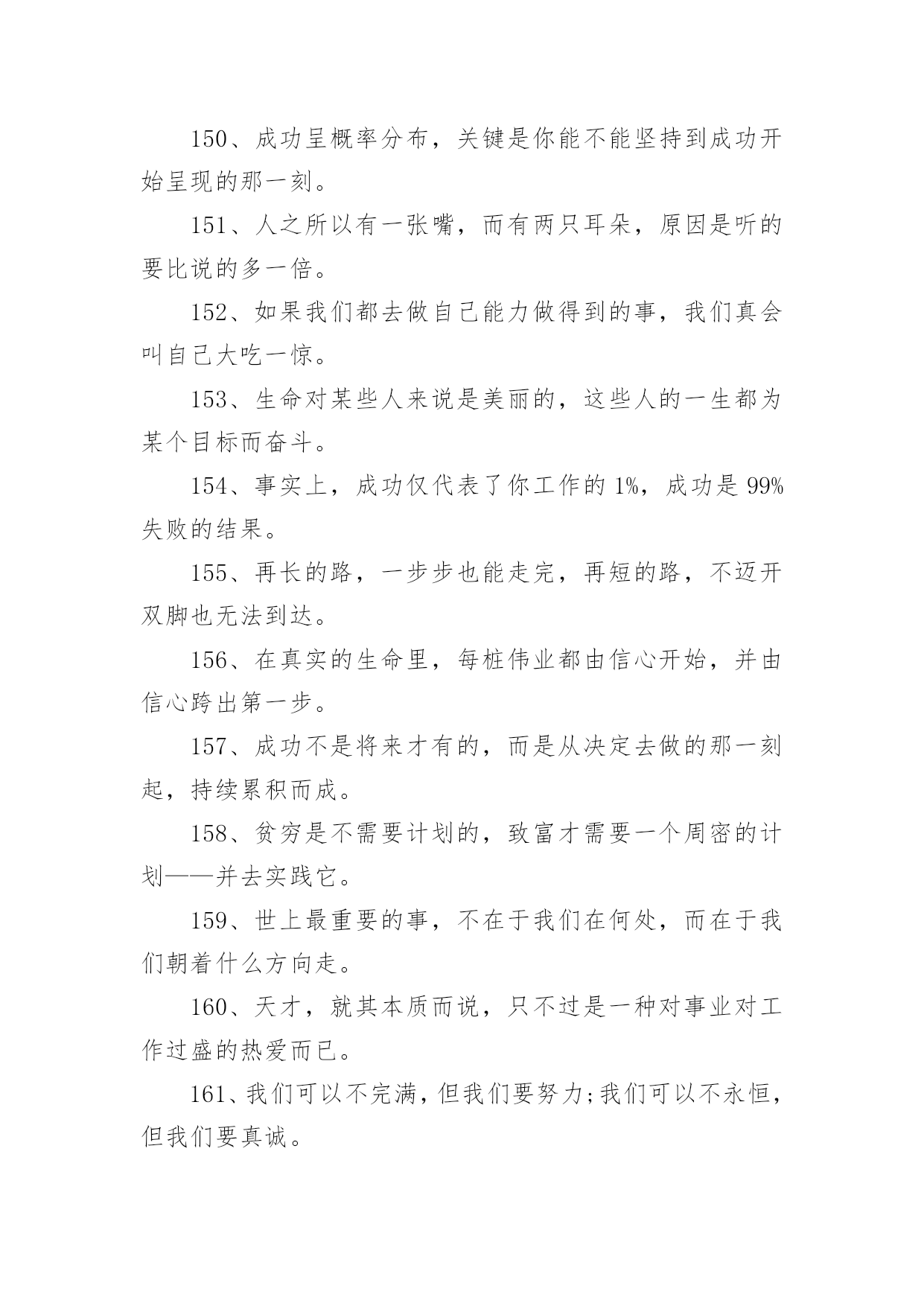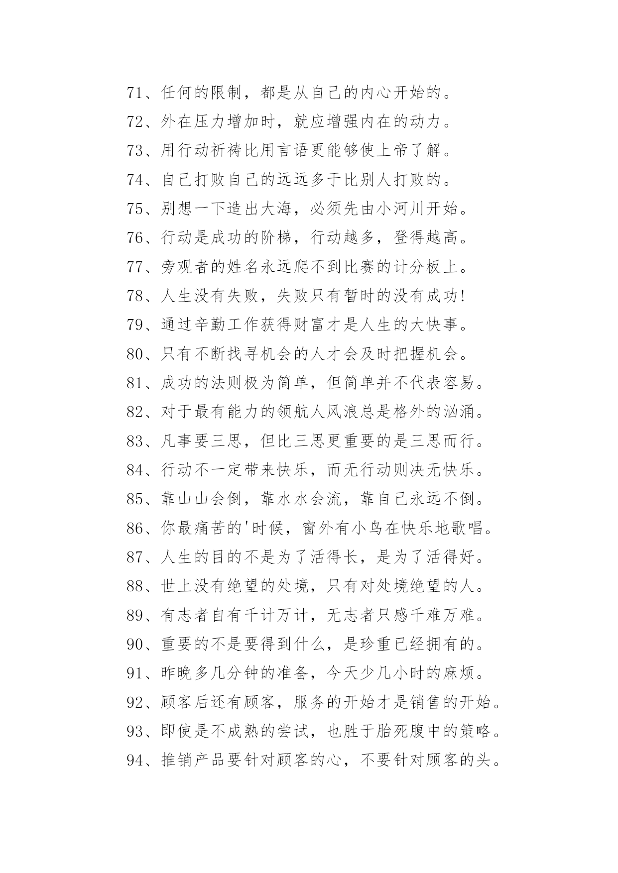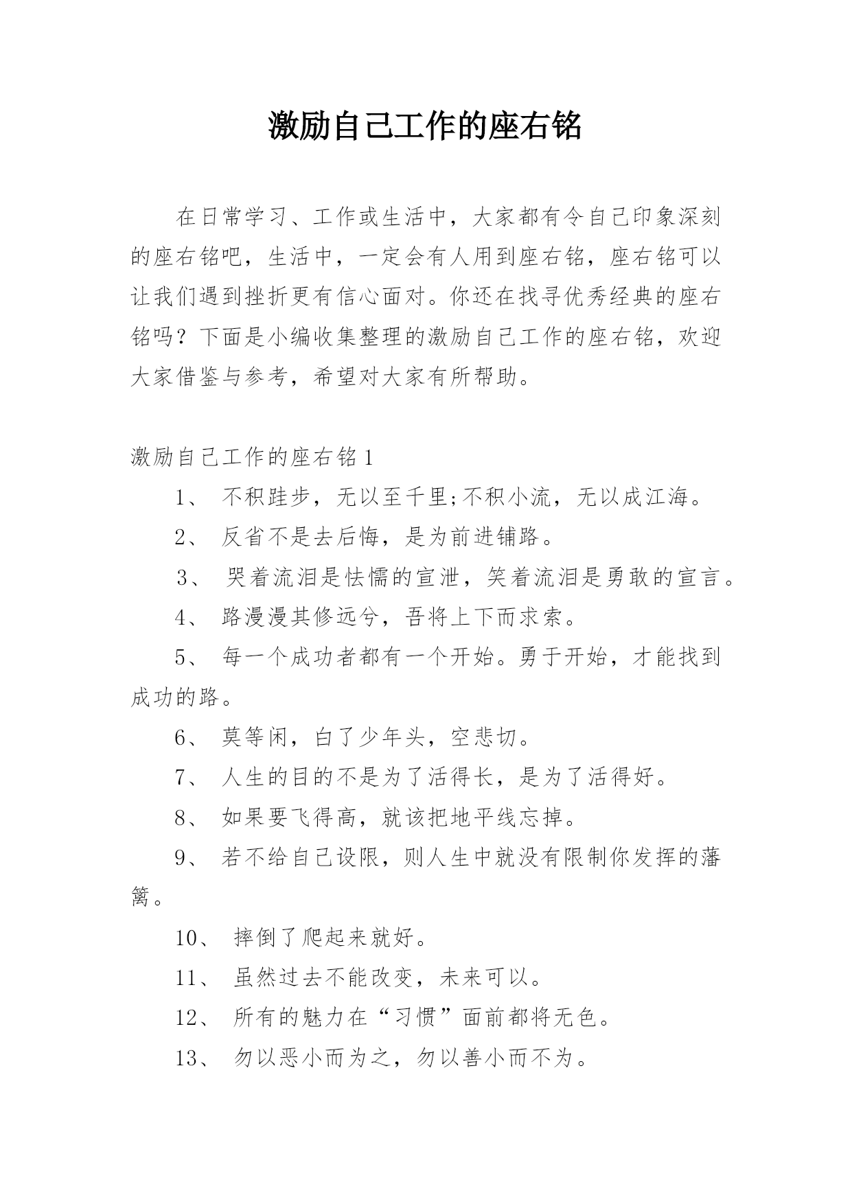 激励自己工作的座右铭在日常学习、工作或生活中,大家都有令自己印象深刻的座右铭吧,生活中,一定会有人用到座右铭,座右铭可以让我们遇到挫折更有信心面对。你还在找寻优秀经典的座右铭吗?下面是小编收集整理的激励自己工作的座右铭,欢迎大家借鉴与参考,希望对大家有所帮助。激励自己工作的座右铭11、不积跬步,无以至千里;不积小流,无以成江海。2、反省不是去后悔,是为前进铺路。3、哭着流泪是怯懦的宣泄,笑着流泪是勇敢的宣言。4、路漫漫其修远兮,吾将上下而求索。5、每一个成功者都有一个开始。勇于开始,才能找到成功的路。6、莫等闲,白了少年头,空悲切。7、人生的目的不是为了活得长,是为了活得好。8、如果要飞得高,就该把地平线忘掉。9、若不给自己设限,则人生中就没有限制你发挥的藩篱。10、摔倒了爬起来就好。11、虽然过去不能改变,未来可以。12、所有的魅力在“习惯”面前都将无色。13、勿以恶小而为之,勿以善小而不为。14、蚁穴虽小,溃之千里。15、与其临渊羡鱼转至,不如退而结网。16、玉不琢,不成器;人不学,不知道。17、欲速则不达,见小利则大事不成。18、造物之前,必先造人。19、重要的不是要得到什么,是珍重已经拥有的。20、赚钱之道很多,但是找不到赚钱的种子,便成不了事业家。21、最有效的资本是我们的信誉,它24小时不停为我们工作。22、人生至善,就是对生活乐观,对工作愉快,对事业兴奋。23、人生是一个永不停息的工厂,那里没有懒人的位置。工作吧!创造吧!24、人能为自己心爱的工作贡献出全部力量、全部精力、全部知识,那么这项工作将完成得出色,收效也更大。25、天才就是最强有力的牛,他们一刻不停地,一天要工作小时。26、那里有天才,我是把别人喝咖啡的工夫都用在工作上的。27、教育工作中的百分之一的废品,就会使国家遭受严重的损失。28、如果工作对于人类不是人生强索的代价,而是目的,人类将是多么幸福。29、不为模糊不清的未来担忧,只为清清楚楚的现在努力。30、只有先改变自己的态度,才能改变人生的高度。31、在抱怨自己赚钱少之前,先努力,学着让自己值钱。32、学历代表过去,学习能力才代表将来。33、耐得住寂寞才能守得住繁华,该奋斗的年龄不要选择了安逸。34、有些事情不是看到希望才去坚持,而是坚持了才看得到希望。35、压力不是有人比你努力,而是比你牛几倍的人依然在努力。36、你所做的事情,也许暂时看不到成功,但不要灰心,你不是没有成长,而是在扎根。37、现实和理想之间,不变的是跋涉,暗淡与辉煌之间,不变的是开拓。38、未曾失败的人恐怕也未曾成功过。39、幸福存在于一个人真正的工作中。40、欲速则不达,见小利则大事不成。41、不经清贫难成人,不经世事总天真。42、不是境况造就人,而是人造就境况。43、路漫漫其修远兮,吾将上下而求索。44、拿望远镜看别人,拿放大镜看自己。45、平凡的脚步也可以走完伟大的行程。46、人才进行工作,而天才则进行创造。47、人格的完善是本,财富的确立是末。48、如果要飞得高,就该把地平线忘掉。49、勿以恶小而为之,勿以善小而不为。50、玉不琢,不成器;人不学,不知道。51、欲望以提升热忱,毅力以磨平高山。52、只要我们能梦想的,我们就能实现。53、智者一切求自己,愚者一切求他人。54、挫折其实就是迈向成功所应缴的学费。55、没有口水与汗水,就没有成功的泪水。56、任何业绩的质变都来自于量变的积累。57、世界会向那些有目标和远见的人让路。58、所有的魅力在“习惯”面前都将无色。59、网络事业创造了富裕,又延续了平等。60、忘掉失败,不过要牢记失败中的教训。61、成功决不喜欢会见懒汉,而是唤醒懒汉。62、诚心诚意,“诚”字的另一半就是成功。63、出门走好路,出口说好话,出手做好事。64、凡真心尝试助人者,没有不帮到自己的。65、环境不会改变,解决之道在于改变自己。66、没有天生的信心,只有不断培养的信心。67、每一发奋努力的背后,必有加倍的赏赐。68、你一天的爱心可能带来别人一生的感谢。69、努力学习,勤奋工作,让青春更加光彩。70、人生伟业的建立,不在能知,乃在能行。71、任何的限制,都是从自己的内心开始的。72、外在压力增加时,就应增强内在的动力。73、用行动祈祷比用言语更能够使上帝了解。74、自己打败自己的远远多于比别人打败的。75、别想一下造出大海,必须先由小河川开始。76、行动是成功的阶梯,行动越多,登得越高。77、旁观者的姓名永远爬不到比赛的计分板上。78、人生没有失败,失败只有暂时的没有成功!79、通过辛勤工作获得财富才是人生的大快事。80、只有不断找寻机会的人才会及时把握机会。81、成功的法则极为简单,但简单并不代表容易。82、对于最有能力的领航人风浪总是格外的汹涌。83、凡事要三思,但比三思更重要的是三思而行。84