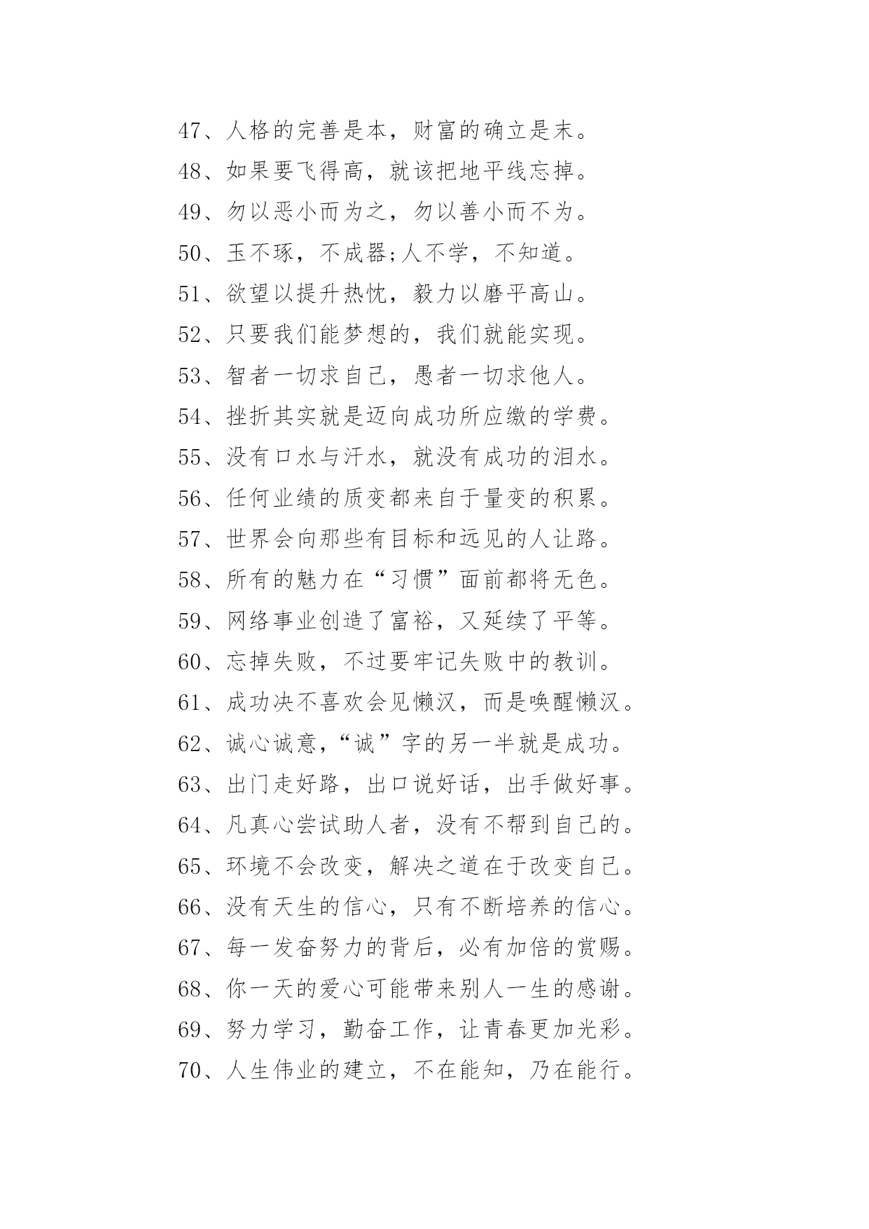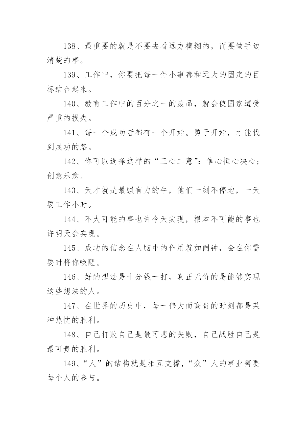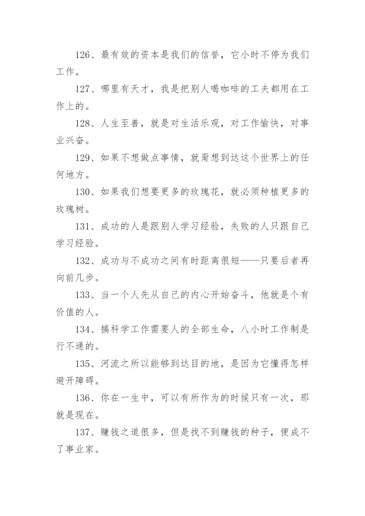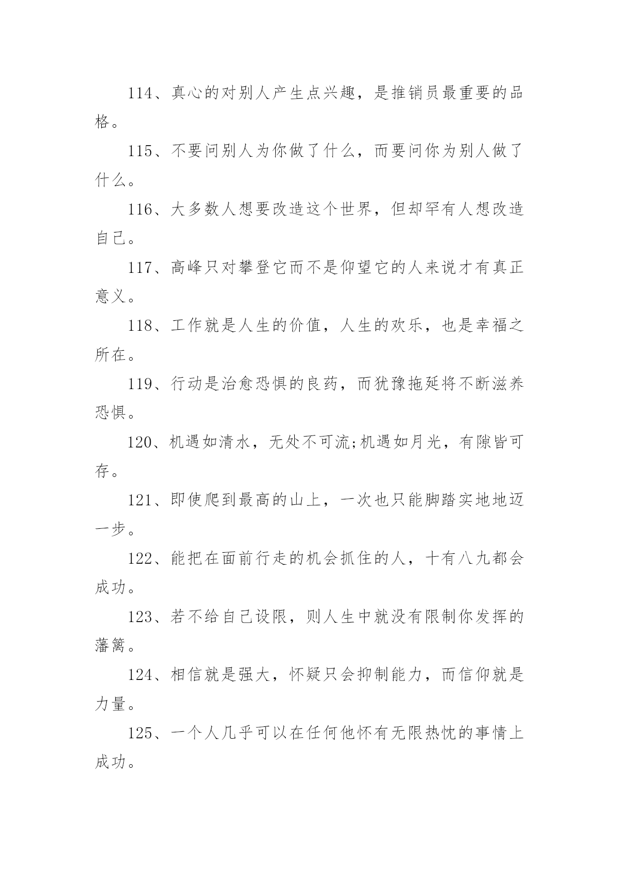 激励自己工作的座右铭在日常学习、工作或生活中,大家都有令自己印象深刻的座右铭吧,生活中,一定会有人用到座右铭,座右铭可以让我们遇到挫折更有信心面对。你还在找寻优秀经典的座右铭吗?下面是小编收集整理的激励自己工作的座右铭,欢迎大家借鉴与参考,希望对大家有所帮助。激励自己工作的座右铭11、不积跬步,无以至千里;不积小流,无以成江海。2、反省不是去后悔,是为前进铺路。3、哭着流泪是怯懦的宣泄,笑着流泪是勇敢的宣言。4、路漫漫其修远兮,吾将上下而求索。5、每一个成功者都有一个开始。勇于开始,才能找到成功的路。6、莫等闲,白了少年头,空悲切。7、人生的目的不是为了活得长,是为了活得好。8、如果要飞得高,就该把地平线忘掉。9、若不给自己设限,则人生中就没有限制你发挥的藩篱。10、摔倒了爬起来就好。11、虽然过去不能改变,未来可以。12、所有的魅力在“习惯”面前都将无色。13、勿以恶小而为之,勿以善小而不为。14、蚁穴虽小,溃之千里。15、与其临渊羡鱼转至,不如退而结网。16、玉不琢,不成器;人不学,不知道。17、欲速则不达,见小利则大事不成。18、造物之前,必先造人。19、重要的不是要得到什么,是珍重已经拥有的。20、赚钱之道很多,但是找不到赚钱的种子,便成不了事业家。21、最有效的资本是我们的信誉,它24小时不停为我们工作。22、人生至善,就是对生活乐观,对工作愉快,对事业兴奋。23、人生是一个永不停息的工厂,那里没有懒人的位置。工作吧!创造吧!24、人能为自己心爱的工作贡献出全部力量、全部精力、全部知识,那么这项工作将完成得出色,收效也更大。25、天才就是最强有力的牛,他们一刻不停地,一天要工作小时。26、那里有天才,我是把别人喝咖啡的工夫都用在工作上的。27、教育工作中的百分之一的废品,就会使国家遭受严重的损失。28、如果工作对于人类不是人生强索的代价,而是目的,人类将是多么幸福。29、不为模糊不清的未来担忧,只为清清楚楚的现在努力。30、只有先改变自己的态度,才能改变人生的高度。31、在抱怨自己赚钱少之前,先努力,学着让自己值钱。32、学历代表过去,学习能力才代表将来。33、耐得住寂寞才能守得住繁华,该奋斗的年龄不要选择了安逸。34、有些事情不是看到希望才去坚持,而是坚持了才看得到希望。35、压力不是有人比你努力,而是比你牛几倍的人依然在努力。36、你所做的事情,也许暂时看不到成功,但不要灰心,你不是没有成长,而是在扎根。37、现实和理想之间,不变的是跋涉,暗淡与辉煌之间,不变的是开拓。38、未曾失败的人恐怕也未曾成功过。39、幸福存在于一个人真正的工作中。40、欲速则不达,见小利则大事不成。41、不经清贫难成人,不经世事总天真。42、不是境况造就人,而是人造就境况。43、路漫漫其修远兮,吾将上下而求索。44、拿望远镜看别人,拿放大镜看自己。45、平凡的脚步也可以走完伟大的行程。46、人才进行工作,而天才则进行创造。47、人格的完善是本,财富的确立是末。48、如果要飞得高,就该把地平线忘掉。49、勿以恶小而为之,勿以善小而不为。50、玉不琢,不成器;人不学,不知道。51、欲望以提升热忱,毅力以磨平高山。52、只要我们能梦想的,我们就能实现。53、智者一切求自己,愚者一切求他人。54、挫折其实就是迈向成功所应缴的学费。55、没有口水与汗水,就没有成功的泪水。56、任何业绩的质变都来自于量变的积累。57、世界会向那些有目标和远见的人让路。58、所有的魅力在“习惯”面前都将无色。59、网络事业创造了富裕,又延续了平等。60、忘掉失败,不过要牢记失败中的教训。61、成功决不喜欢会见懒汉,而是唤醒懒汉。62、诚心诚意,“诚”字的另一半就是成功。63、出门走好路,出口说好话,出手做好事。64、凡真心尝试助人者,没有不帮到自己的。65、环境不会改变,解决之道在于改变自己。66、没有天生的信心,只有不断培养的信心。67、每一发奋努力的背后,必有加倍的赏赐。68、你一天的爱心可能带来别人一生的感谢。69、努力学习,勤奋工作,让青春更加光彩。70、人生伟业的建立,不在能知,乃在能行。71、任何的限制,都是从自己的内心开始的。72、外在压力增加时,就应增强内在的动力。73、用行动祈祷比用言语更能够使上帝了解。74、自己打败自己的远远多于比别人打败的。75、别想一下造出大海,必须先由小河川开始。76、行动是成功的阶梯,行动越多,登得越高。77、旁观者的姓名永远爬不到比赛的计分板上。78、人生没有失败,失败只有暂时的没有成功!79、通过辛勤工作获得财富才是人生的大快事。80、只有不断找寻机会的人才会及时把握机会。81、成功的法则极为简单,但简单并不代表容易。82、对于最有能力的领航人风浪总是格外的汹涌。83、凡事要三思,但比三思更重要的是三思而行。84