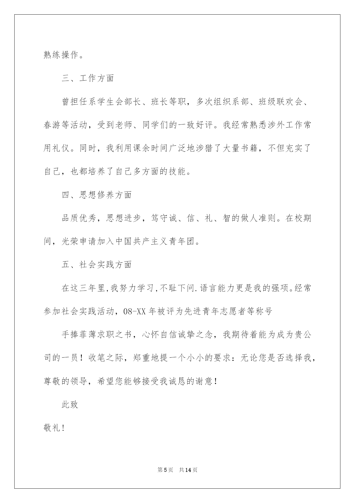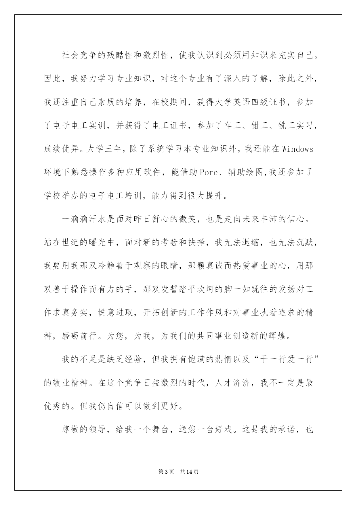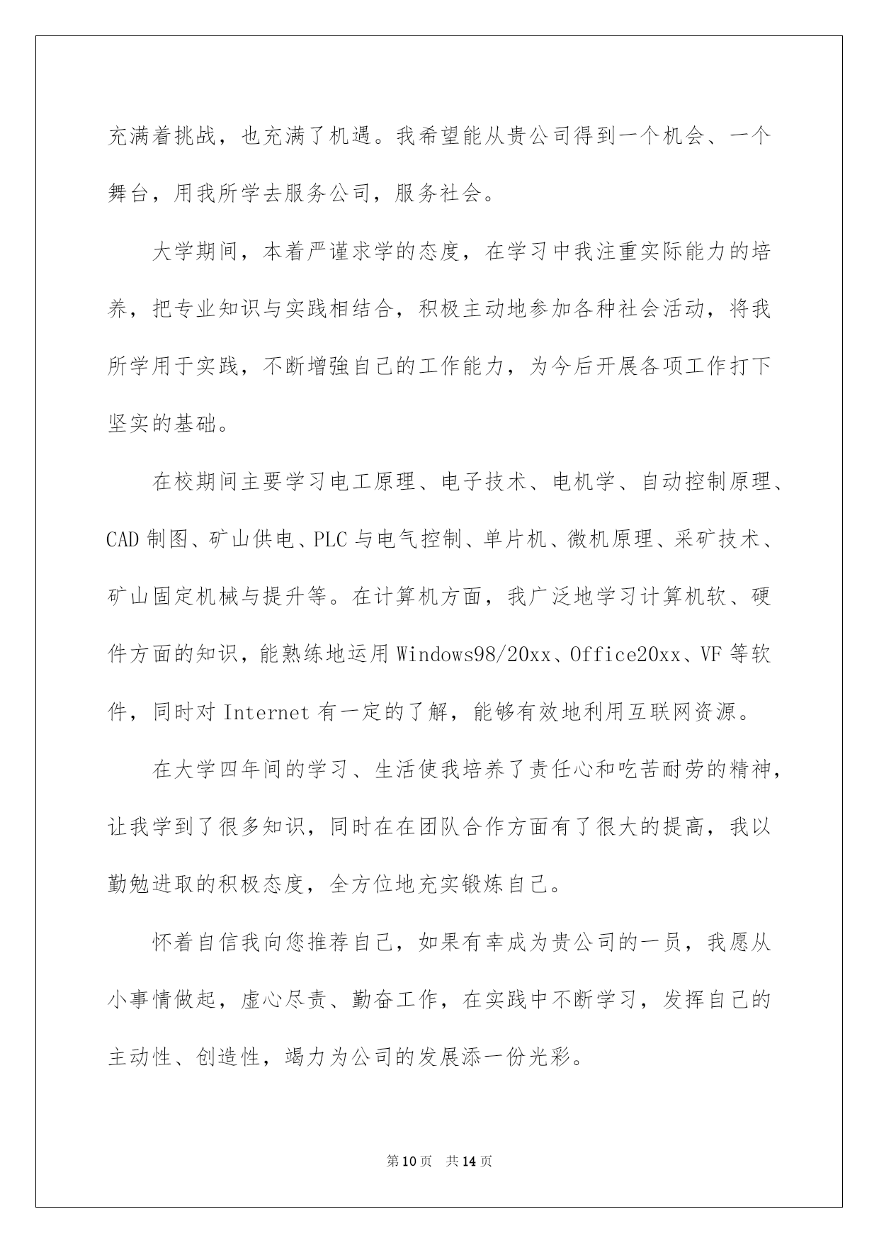 第PAGE\*Arabic\*MERGEFORMAT14页共NUMPAGES\*Arabic\*MERGEFORMAT14页第PAGE\*MERGEFORMAT14页共NUMPAGES\*MERGEFORMAT14页第PAGE\*MERGEFORMAT14页共NUMPAGES\*MERGEFORMAT14页第PAGE\*MERGEFORMAT14页共NUMPAGES\*MERGEFORMAT14页第PAGE\*MERGEFORMAT14页共NUMPAGES\*MERGEFORMAT14页第PAGE\*MERGEFORMAT14页共NUMPAGES\*MERGEFORMAT14页第PAGE\*MERGEFORMAT14页共NUMPAGES\*MERGEFORMAT14页第PAGE\*MERGEFORMAT14页共NUMPAGES\*MERGEFORMAT14页第PAGE\*MERGEFORMAT14页共NUMPAGES\*MERGEFORMAT14页第PAGE\*MERGEFORMAT14页共NUMPAGES\*MERGEFORMAT14页第PAGE\*MERGEFORMAT14页共NUMPAGES\*MERGEFORMAT14页2022机电求职信集合八篇机电求职信集合八篇时间一晃而过,找工作对于我们说已越来越近,现在的你想必是在写求职信吧。求职信怎么写才不会千篇一律呢?以下是我整理的机电求职信10篇,供大家参考借鉴,希望可以帮助到有需要的朋友。机电求职信篇1我是一名湄洲湾职业技术学院机电专业的毕业生。十分感激您在百忙之中抽出工夫,阅读我这份自荐资料,给我一次迈向成功的时机。中专两年转眼即过,我满怀希望地走进社会这个愈加广博的课堂。当今世界充溢着竞争、充溢着应战,也充溢了机遇。我希望能从贵公司失掉一个时机、一个舞台,用我所学去效劳公司,效劳社会。中专时期,本着严谨求学的态度,在学习中我注重实践才能的培育,把专业知识与理论相结合,积极自动地参与各种社会活动,将我所学用于理论,不时增強本人的任务才能,为今后展开各项任务打下坚实的根底。在校时期次要学习电工原理、电子技术、电机学、自动控制原理、cad制图、机械与提升等。在计算机方面,我普遍地学习计算机软、硬件方面的知识,能纯熟地运用windows98/20xx、office20xx、vf等软件,同时也经过计算机高新(中级)考试,对internet有一定的理解,可以无效天时用互联网资源。怀着自信我向您引荐本人,假如有幸成为贵公司的一员,我愿从大事情做起,谦虚尽责、勤劳任务,在理论中不时学习,发扬本人的自动性、发明性,极力为公司的开展添一份光荣。最初,再次感激您阅读此信,等待着您的早日回答。愿贵单位兴隆兴旺!机电求职信篇2尊敬的领导:首先真诚地感谢您在百忙之中浏览本人的求职信,这对一个即将迈出校门的学子而言,将是一份莫大的鼓励。这是一份简单的求职信,也许它的普通没深深地吸住您的眼光,但它却蕴涵着一颗真诚的心。为此,我诚心恳求您能阅读这份普通的求职函!我是机电一体化专业即将毕业的一名学生,名叫XXX。我怀着一颗赤诚的心和对事业的执著追求,真诚地向您推荐自己。社会竞争的残酷性和激烈性,使我认识到必须用知识来充实自己。因此,我努力学习专业知识,对这个专业有了深入的了解,除此之外,我还注重自己素质的培养,在校期间,获得大学英语四级证书,参加了电子电工实训,并获得了电工证书,参加了车工、钳工、铣工实习,成绩优异。大学三年,除了系统学习本专业知识外,我还能在Windows环境下熟悉操作多种应用软件,能借助Pore、辅助绘图,我还参加了学校举办的电子电工培训,能力得到很大提升。一滴滴汗水是面对昨日舒心的微笑,也是走向未来丰沛的信心。站在世纪的曙光中,面对新的考验和抉择,我无法退缩,也无法沉默,我要用我那双冷静善于观察的眼睛,那颗真诚而热爱事业的心,用那双善于操作而有力的手,那双发誓踏平坎坷的脚一如既往的发扬对工作求真务实,锐意进取,开拓创新的工作作风和对事业执着追求的精神,磨砺前行。为您,为我,为我们的共同事业创造新的辉煌。我的不足是缺乏经验,但我拥有饱满的热情以及“干一行爱一行”的敬业精神。在这个竞争日益激烈的时代,人才济济,我不一定是最优秀的。但我仍自信可以做到更好。尊敬的领导,给我一个舞台,送您一台好戏。这是我的承诺,也是我的决心。此致敬礼!求职人:XXXXX年XX月XX日机电求职信篇3尊敬的领导:您好!当恁展开这封求职信将是对我过去两年的检阅,当你最终合上这封求职信时又将决定了我人生的新的征程。我是一名即将毕业的机电系中专生,一、理论学习方