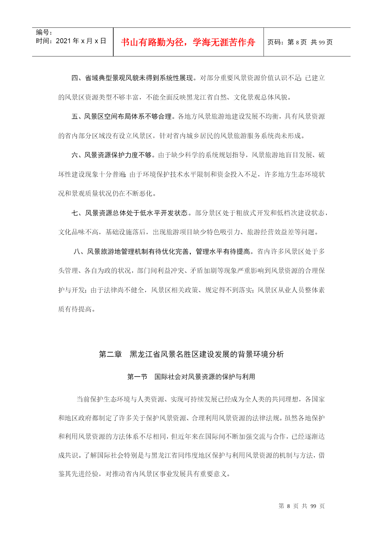 编号:时间:2021年x月x日书山有路勤为径,学海无涯苦作舟页码:第PAGE99页共NUMPAGES99页第PAGE\*MERGEFORMAT99页共NUMPAGES\*MERGEFORMAT99页第一章黑龙江省风景名胜区建设发展概况与分析第一节风景名胜区体系建制状况与特点分析1982年,黑龙江省五大连池风景区和镜泊湖风景区被国务院首批审定公布为国家重点风景名胜区。1989年,经黑龙江省政府审定批准设立了太阳岛、丹清河、二龙山、桃山、兴凯湖5处风景区为省级风景名胜区。1994年,省政府审定批准延寿山庄、莲花湖、吉兴河、哈达河、柳树岛、四丰山、明月岛、卧牛湖、龙凤山9处风景区为省级风景名胜区。1988年,国家组织审定第二批国家重点风景区,要求各省从已建制的省级风景区中选送,当时我省虽然尚无省级风景区建制,但积极补充申报了兴凯湖风景区,由于准备不够等原因,未获批准。当前黑龙江省正式建立有国家重点风景名胜区2处,省级风景名胜区14处,详见表1-1。全省各地进行旅游开发建设的风景区点200余处,虽然部分风景旅游开发地以风景区命名,但是除上述16处风景区外,其它都未经正式审批建制并报送风景区主管部门备案。黑龙江省现状16处风景区主要分布于黑龙江省中东部地区,分属8个地市。大庆市、绥化市、鹤岗市、双鸭山市、大兴安岭地区尚未建立风景区。16处风景区全部属于自然风景资源主导型,各风景区都有少量人文景观,但与自然景观相比,人文景观价值较低。按主体风景资源类型划分为以下5种类型:·山林——湖泊景观类型:镜泊湖、莲花湖、卧牛湖、二龙山、龙凤山、吉兴河、四丰山、哈达河、延寿山庄9处风景区。其中,镜泊湖风景区拥有火山熔岩地貌、天然瀑布及火山口森林等特色景观,风景资源价值较高。其它8处风景区都是因修建水库而形成的山水风光区。·火山地貌(矿泉)型:五大连池风景区,属于特色风景资源区,有较高的观赏、科学研究、医疗保健价值。·山地森林型:桃山、丹清河2处风景区,北国山林特色,生态环境质量较好。·天然湖泊型:兴凯湖风景区,中俄界湖,天然景色极为秀美。·江河洲岛型:太阳岛、明月岛、柳树岛3处风景区,均位于大城市近郊区,景区内开发建设有娱乐、度假等旅游服务建筑,特别是太阳岛风景区已出现“城市化”建设形态。由以上分析表明,黑龙江省现状风景区以山林——湖泊(水库)资源型为主,类型不够丰富,黑龙江省内具有地方特色的冰雪气象、原生森林、湿地、草原等特色景观资源在风景区内尚未得到充分展现。表1-1黑龙江省现状风景名胜区统计表风景名胜区名称位置面积(km2)景观类型批准建立时间镜泊湖国家重点风景名胜区宁安市1214高山堰塞湖自然景观1982年五大连池国家重点风景名胜区五大连池市1060矿泉、火山口、熔岩奇观1982年太阳岛省级风景名胜区哈尔滨市38江河洲岛景观1989年兴凯湖省级风景名胜区密山市2800天然湖泊1989年二龙山省级风景名胜区宾县25湖泊(水库),山水结合型1989年桃山省级风景名胜区铁力市1000山地森林景观1989年丹青河省级风景名胜区依兰县460山地森林、历史文化景观1989年延寿山庄省级风景名胜区延寿县99湖泊(水库),山水结合型1994年莲花湖省级风景名胜区海林市1900湖泊(水库),山水结合型1994年吉兴河省级风景名胜区勃利县40湖泊(水库),山水结合型1994年哈达河省级风景名胜区鸡西市30.7湖泊(水库),山水结合型1994年柳树岛省级风景名胜区佳木斯市10.57江河洲岛景观1994年四丰山省级风景名胜区佳木斯市15湖泊(水库),山水结合型1994年明月岛省级风景名胜区齐齐哈尔市7.66江河洲岛景观1994年卧牛湖省级风景名胜区黑河市50湖泊(水库),山水结合型1994年龙凤山省级风景名胜区五常市1840湖泊(水库),山水结合型1994年第二节风景资源开发与保护状况一、风景资源开发进程黑龙江省风景旅游活动萌发于19世纪末期,随着我国东北地区交通的建设而逐渐发展起来。1903年中东铁路建成,黑龙江省铁路、公路、码头也纷纷兴建,游客多时铁路部门便临时增发列车。哈尔滨周边扎兰屯、巴林、二层甸子、一面坡、呼兰等地成为重要旅游地。民国初年,群众性旅游兴起,黑龙江巡抚衙门曾通知各地中小学校组织“暑假游历”。旅游活动从观赏“三风”——自然风光、建筑风貌、风土人情,发展扩充为到自然环境中避暑、钓鱼、狩猎、探胜等项目。日伪统治的萧条时期,旅游市场受到政治和经济影响,旅游业呈现一蹶不振的局面。其间产生“近郊四景”的称谓,包括呼兰、阿城、玉泉、第二松花江。在牡丹江、佳木斯、齐齐哈尔、黑河等地区也进行了风景旅游开发活动,开发的景区有镜泊湖、横道河子、雅鲁河等。新中国成立后,旅游业曾一度展现复苏态势,但