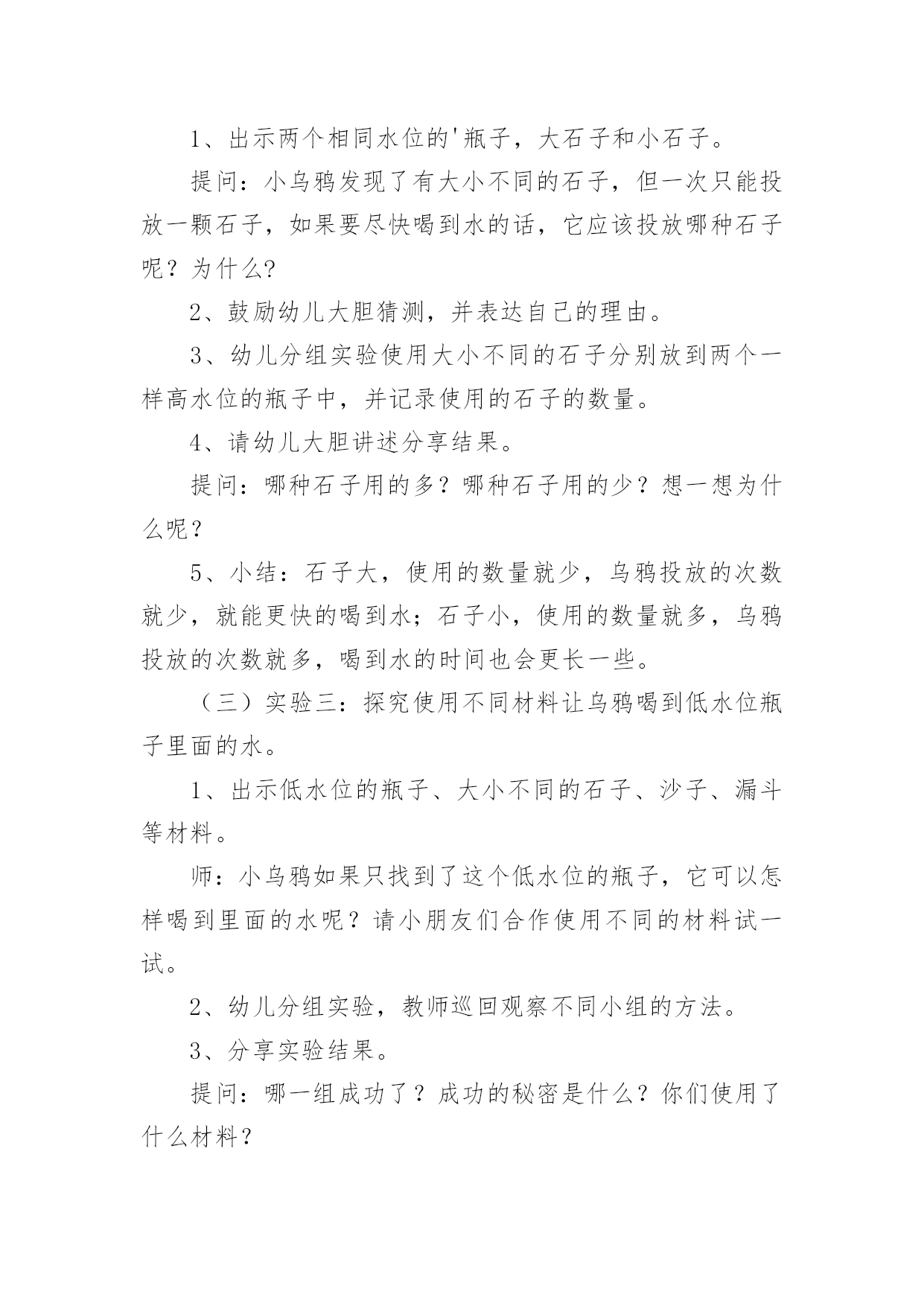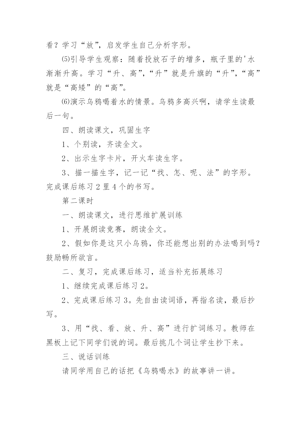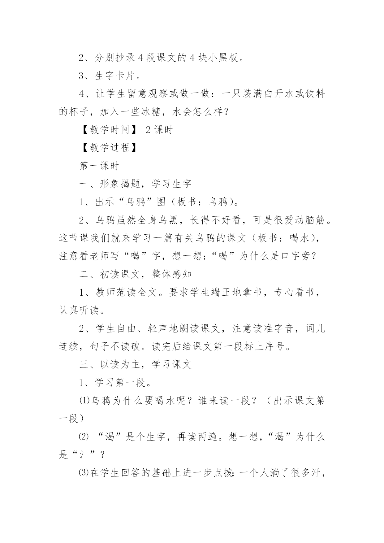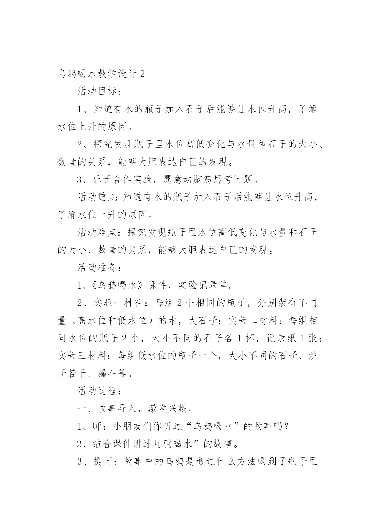 乌鸦喝水教学设计在教学工作者开展教学活动前,往往需要进行教学设计编写工作,教学设计是根据课程标准的要求和教学对象的特点,将教学诸要素有序安排,确定合适的教学方案的设想和计划。一份好的教学设计是什么样子的呢?下面是小编帮大家整理的乌鸦喝水教学设计,仅供参考,大家一起来看看吧。乌鸦喝水教学设计1【教学要求】1、学会本课8个生字和4个词语,认识4个字。2、正确、流利地朗读课文。背诵课文。3、鼓励学生遇到困难要积极动脑,设法解决。【教学重点】读准翘舌音、平舌音、前鼻音和后鼻音的字,准确掌握找、看、放、升的字形。理解到处、升高的意思。正确、流利地朗读课文。【教学难点】提示生字音、形、义的联系,帮助学生牢固地掌握字形。【课前准备】1、一幅画有瓶子、小石子、大石块和草叶的背景图及一只头可以活动的乌鸦(可用破硬纸板做)。有条件的可准备一个与插图相仿的玻璃瓶,瓶子里装好半瓶水,一堆小石子。2、分别抄录4段课文的4块小黑板。3、生字卡片。4、让学生留意观察或做一做:一只装满白开水或饮料的杯子,加入一些冰糖,水会怎么样?【教学时间】2课时【教学过程】第一课时一、形象揭题,学习生字1、出示“乌鸦”图(板书:乌鸦)。2、乌鸦虽然全身乌黑,长得不好看,可是很爱动脑筋。这节课我们就来学习一篇有关乌鸦的课文(板书:喝水),注意看老师写“喝”字,想一想:“喝”为什么是口字旁?二、初读课文,整体感知1、教师范读全文。要求学生端正地拿书,专心看书,认真听读。2、学生自由、轻声地朗读课文,注意读准字音,词儿连续,句子不读破。读完后给课文第一段标上序号。三、以读为主,学习课文1、学习第一段。⑴乌鸦为什么要喝水呢?谁来读一段?(出示课文第一段)⑵“渴”是个生字,再读两遍。想一想,“渴”为什么是“氵”?⑶在学生回答的基础上进一步点拨:一个人淌了很多汗,太阳又火辣辣地照着,感觉很渴。想想看,“一只乌鸦口渴了,到处找水喝”会是什么样呢?谁愿意表演给大家看看?⑷乌鸦跑了许多地方去找水,真着争啊,谁愿意再读读第一段?注意“找”是翘舌音,全班多读两遍。⑸他读出了乌鸦着急的样子,全班读一读。2、学习第二段。⑴这时,乌鸦看见一个瓶子,瓶子里有水。多高兴啊!谁来读一读这句?“瓶”是后鼻音,再读一读。(出示第二段课文)⑵“看”是生字,再读几遍。我们有时为了看清远处的东西,会这样做:(老师手搭凉蓬做出远望动作),所以这个生字可以用什么好办法记呢?⑶乌鸦看见一个瓶子里有水,可是,乌鸦喝不着水,这是什么原因呢?谁业读第二句?⑷学生观察插图或实物,想象或演示乌鸦把嘴伸进瓶口喝不着水的情景。乌鸦多着急啊,谁再来读这句?⑸谁来读最后一句,注意“怎”和“呢”读音,多读几遍。3、学习第三段、第四段。⑴请学生轻声自由地朗读三、四段课文,想一想,乌鸦是怎么喝到水的?⑵请学生个别朗读三、四段课文。(出示三、四段课文)⑶教师引读:乌鸦想出的办法是_学生接读第四段。⑷乌鸦把小石子怎么放进瓶子里的?谁来演给大家看看?学习“放”,启发学生自己分析字形。⑸引导学生观察:随着投放石子的增多,瓶子里的'水渐渐升高。学习“升、高”,“升”就是升旗的“升”,“高”就是“高矮”的“高”。⑹演示乌鸦喝着水的情景。乌鸦多高兴啊,请学生读最后一句。四、朗读课文,巩固生字1、个别读,齐读全文。2、出示生字卡片,开火车读生字。3、描一描生字,记一记“找、怎、呢、法”的字形。完成课后练习2里4个的书写。第二课时一、朗读课文,进行思维扩展训练1、开展朗读竞赛,朗读全文。2、假如你是这只小乌鸦,你还能想出别的办法喝到吗?鼓励畅所欲言。二、复习,完成课后练习,适当补充拓展练习1、继续完成课后练习2。2、完成课后练习3。先自由读词语,再指名读,最后抄写。3、用“找、看、放、升、高”进行扩词练习。教师在黑板上记下同学们说的词。最后挑几个词让学生抄下来。三、说话训练请同学用自己的话把《乌鸦喝水》的故事讲一讲。乌鸦喝水教学设计2活动目标:1、知道有水的瓶子加入石子后能够让水位升高,了解水位上升的原因。2、探究发现瓶子里水位高低变化与水量和石子的大小、数量的关系,能够大胆表达自己的发现。3、乐于合作实验,愿意动脑筋思考问题。活动重点:知道有水的瓶子加入石子后能够让水位升高,了解水位上升的原因。活动难点:探究发现瓶子里水位高低变化与水量和石子的大小、数量的关系,能够大胆表达自己的发现。活动准备:1、《乌鸦喝水》课件,实验记录单。2、实验一材料:每组2个相同的瓶子,分别装有不同量(高水位和低水位)的水,大石子;实验二材料:每组相同水位的瓶子2个,大小不同的石子各1杯,记录纸1张;实验三材料:每组低水位的瓶子一个,大小不同的石子、沙子若干、漏斗等。活动过程:一、故事导入,激发兴趣。1、师:小朋友们你听过“乌鸦喝水”的故事吗?2、结合课件讲述乌鸦喝水”的故事。3