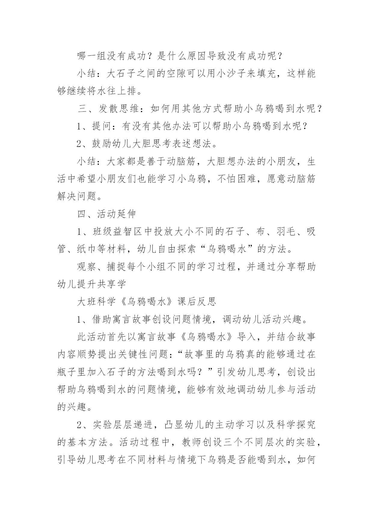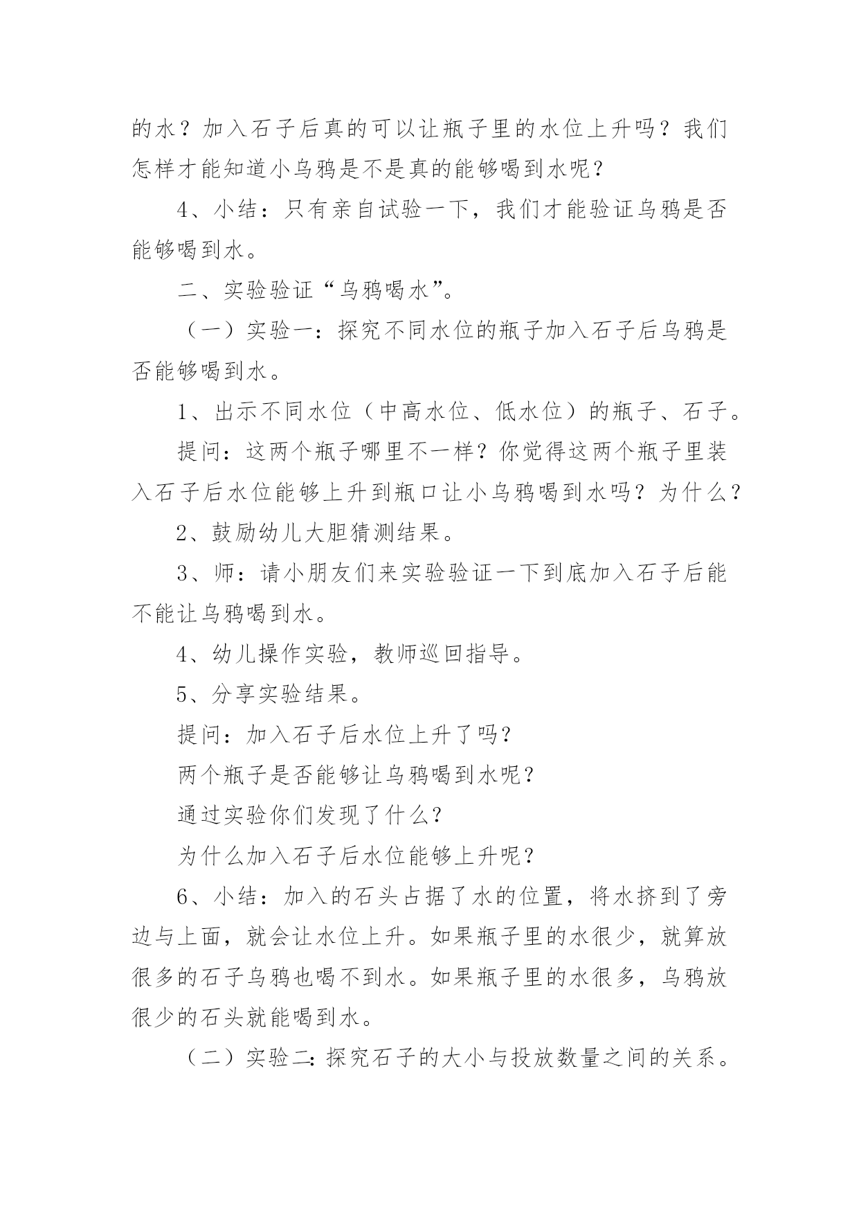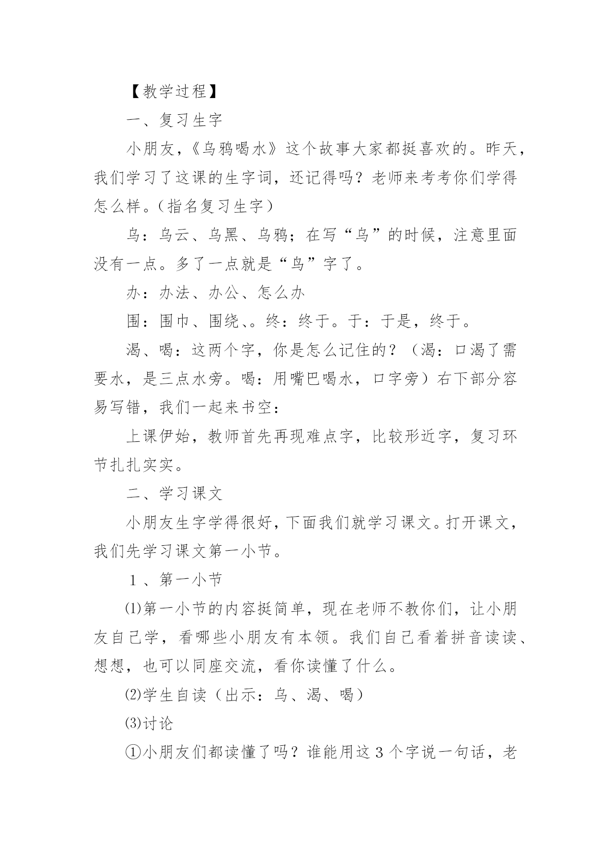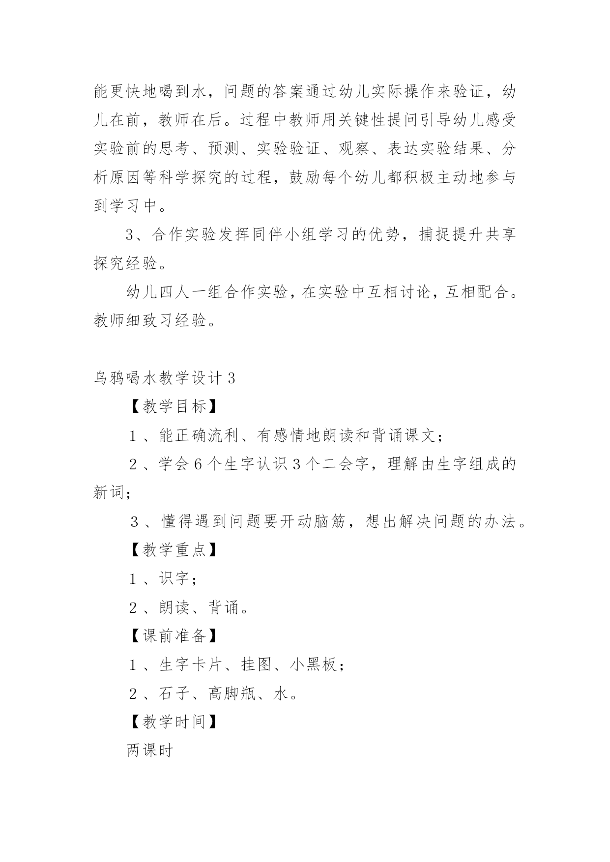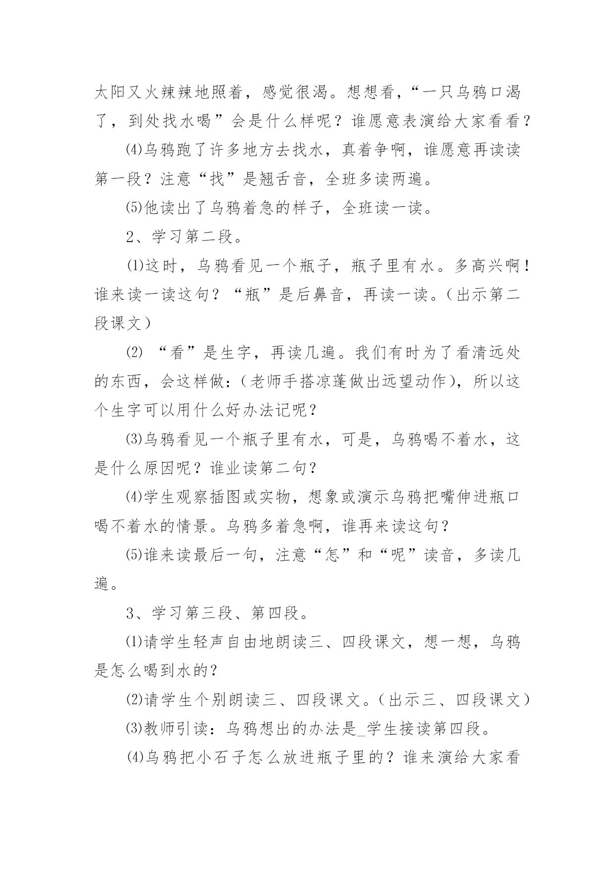 乌鸦喝水教学设计在教学工作者开展教学活动前,往往需要进行教学设计编写工作,教学设计是根据课程标准的要求和教学对象的特点,将教学诸要素有序安排,确定合适的教学方案的设想和计划。一份好的教学设计是什么样子的呢?下面是小编帮大家整理的乌鸦喝水教学设计,仅供参考,大家一起来看看吧。乌鸦喝水教学设计1【教学要求】1、学会本课8个生字和4个词语,认识4个字。2、正确、流利地朗读课文。背诵课文。3、鼓励学生遇到困难要积极动脑,设法解决。【教学重点】读准翘舌音、平舌音、前鼻音和后鼻音的字,准确掌握找、看、放、升的字形。理解到处、升高的意思。正确、流利地朗读课文。【教学难点】提示生字音、形、义的联系,帮助学生牢固地掌握字形。【课前准备】1、一幅画有瓶子、小石子、大石块和草叶的背景图及一只头可以活动的乌鸦(可用破硬纸板做)。有条件的可准备一个与插图相仿的玻璃瓶,瓶子里装好半瓶水,一堆小石子。2、分别抄录4段课文的4块小黑板。3、生字卡片。4、让学生留意观察或做一做:一只装满白开水或饮料的杯子,加入一些冰糖,水会怎么样?【教学时间】2课时【教学过程】第一课时一、形象揭题,学习生字1、出示“乌鸦”图(板书:乌鸦)。2、乌鸦虽然全身乌黑,长得不好看,可是很爱动脑筋。这节课我们就来学习一篇有关乌鸦的课文(板书:喝水),注意看老师写“喝”字,想一想:“喝”为什么是口字旁?二、初读课文,整体感知1、教师范读全文。要求学生端正地拿书,专心看书,认真听读。2、学生自由、轻声地朗读课文,注意读准字音,词儿连续,句子不读破。读完后给课文第一段标上序号。三、以读为主,学习课文1、学习第一段。⑴乌鸦为什么要喝水呢?谁来读一段?(出示课文第一段)⑵“渴”是个生字,再读两遍。想一想,“渴”为什么是“氵”?⑶在学生回答的基础上进一步点拨:一个人淌了很多汗,太阳又火辣辣地照着,感觉很渴。想想看,“一只乌鸦口渴了,到处找水喝”会是什么样呢?谁愿意表演给大家看看?⑷乌鸦跑了许多地方去找水,真着争啊,谁愿意再读读第一段?注意“找”是翘舌音,全班多读两遍。⑸他读出了乌鸦着急的样子,全班读一读。2、学习第二段。⑴这时,乌鸦看见一个瓶子,瓶子里有水。多高兴啊!谁来读一读这句?“瓶”是后鼻音,再读一读。(出示第二段课文)⑵“看”是生字,再读几遍。我们有时为了看清远处的东西,会这样做:(老师手搭凉蓬做出远望动作),所以这个生字可以用什么好办法记呢?⑶乌鸦看见一个瓶子里有水,可是,乌鸦喝不着水,这是什么原因呢?谁业读第二句?⑷学生观察插图或实物,想象或演示乌鸦把嘴伸进瓶口喝不着水的情景。乌鸦多着急啊,谁再来读这句?⑸谁来读最后一句,注意“怎”和“呢”读音,多读几遍。3、学习第三段、第四段。⑴请学生轻声自由地朗读三、四段课文,想一想,乌鸦是怎么喝到水的?⑵请学生个别朗读三、四段课文。(出示三、四段课文)⑶教师引读:乌鸦想出的办法是_学生接读第四段。⑷乌鸦把小石子怎么放进瓶子里的?谁来演给大家看看?学习“放”,启发学生自己分析字形。⑸引导学生观察:随着投放石子的增多,瓶子里的'水渐渐升高。学习“升、高”,“升”就是升旗的“升”,“高”就是“高矮”的“高”。⑹演示乌鸦喝着水的情景。乌鸦多高兴啊,请学生读最后一句。四、朗读课文,巩固生字1、个别读,齐读全文。2、出示生字卡片,开火车读生字。3、描一描生字,记一记“找、怎、呢、法”的字形。完成课后练习2里4个的书写。第二课时一、朗读课文,进行思维扩展训练1、开展朗读竞赛,朗读全文。2、假如你是这只小乌鸦,你还能想出别的办法喝到吗?鼓励畅所欲言。二、复习,完成课后练习,适当补充拓展练习1、继续完成课后练习2。2、完成课后练习3。先自由读词语,再指名读,最后抄写。3、用“找、看、放、升、高”进行扩词练习。教师在黑板上记下同学们说的词。最后挑几个词让学生抄下来。三、说话训练请同学用自己的话把《乌鸦喝水》的故事讲一讲。乌鸦喝水教学设计2活动目标:1、知道有水的瓶子加入石子后能够让水位升高,了解水位上升的原因。2、探究发现瓶子里水位高低变化与水量和石子的大小、数量的关系,能够大胆表达自己的发现。3、乐于合作实验,愿意动脑筋思考问题。活动重点:知道有水的瓶子加入石子后能够让水位升高,了解水位上升的原因。活动难点:探究发现瓶子里水位高低变化与水量和石子的大小、数量的关系,能够大胆表达自己的发现。活动准备:1、《乌鸦喝水》课件,实验记录单。2、实验一材料:每组2个相同的瓶子,分别装有不同量(高水位和低水位)的水,大石子;实验二材料:每组相同水位的瓶子2个,大小不同的石子各1杯,记录纸1张;实验三材料:每组低水位的瓶子一个,大小不同的石子、沙子若干、漏斗等。活动过程:一、故事导入,激发兴趣。1、师:小朋友们你听过“乌鸦喝水”的故事吗?2、结合课件讲述乌鸦喝水”的故事。3