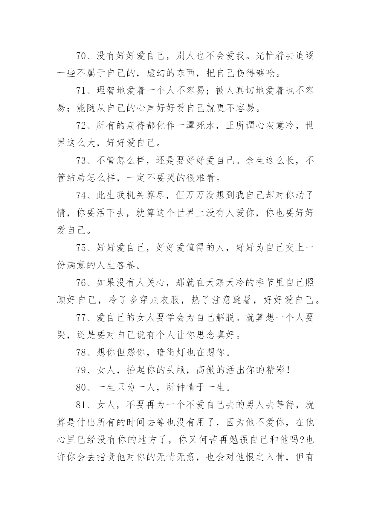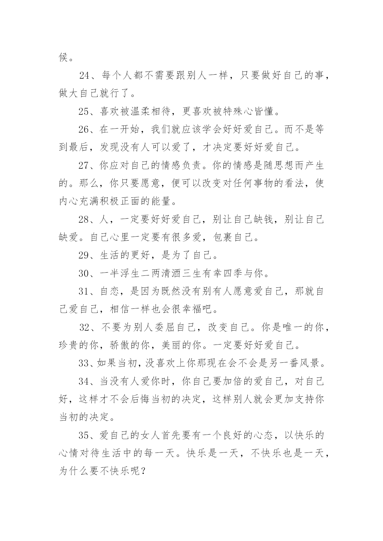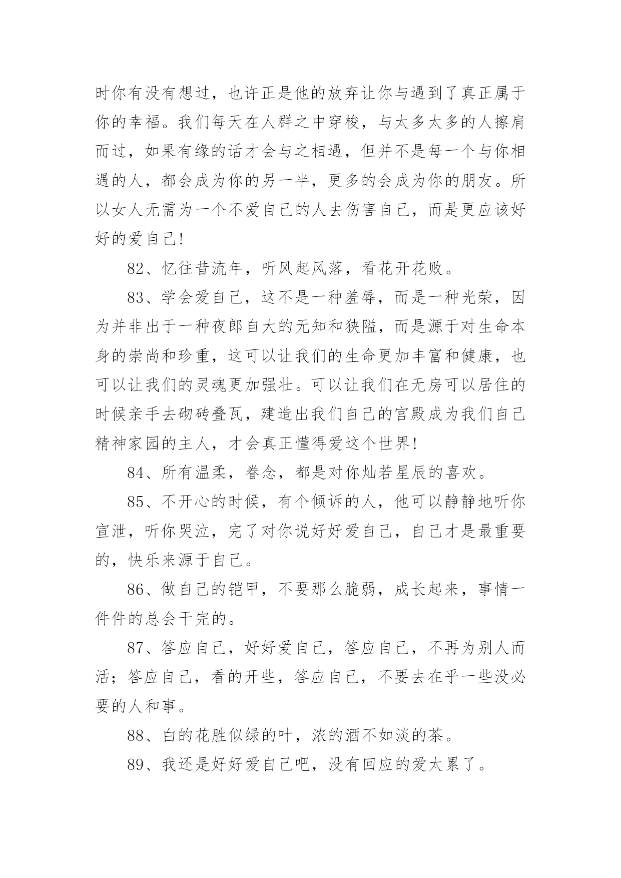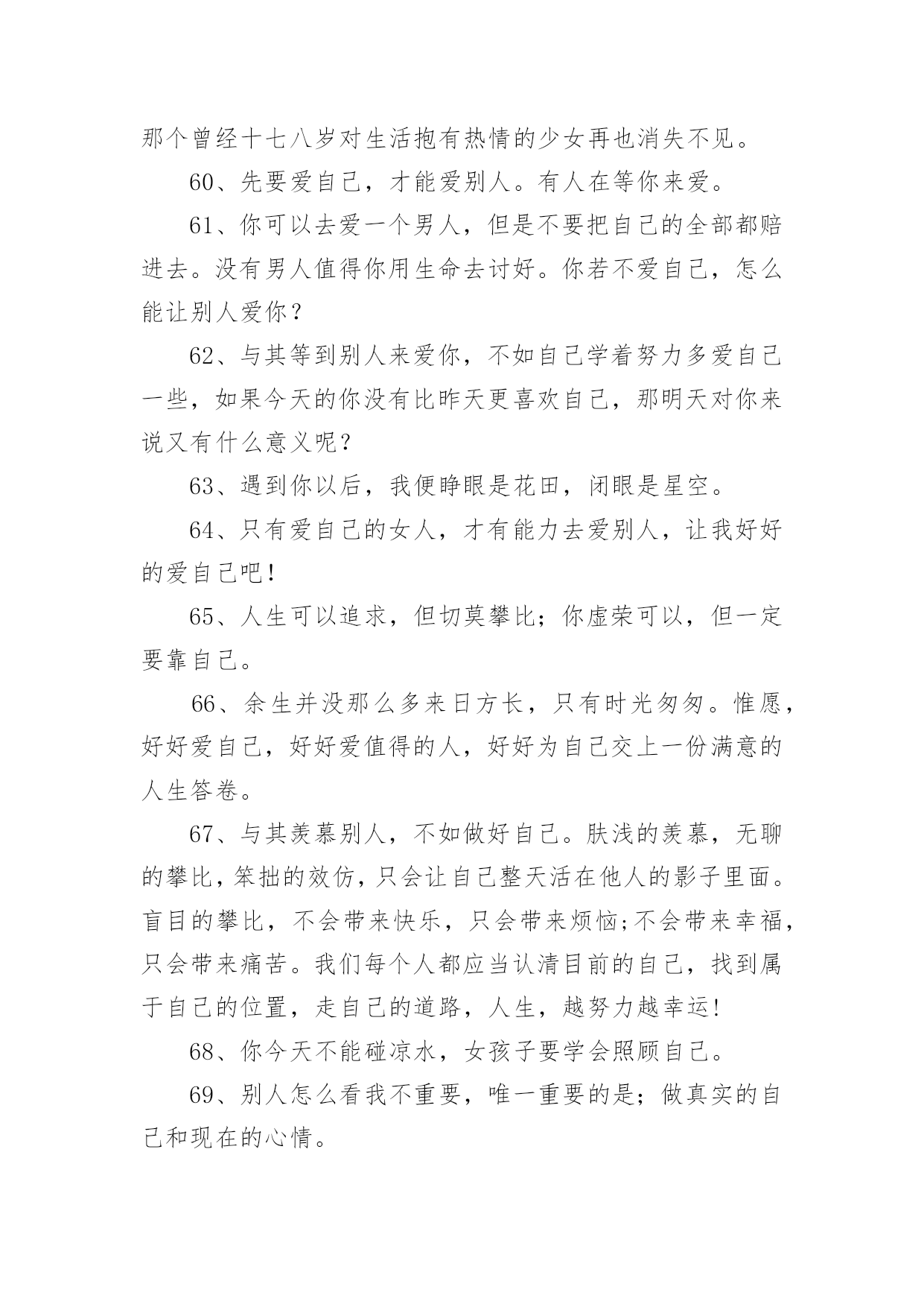 爱生活爱自己的句子爱生活爱自己的句子400句在日常的学习、工作、生活中,大家都知道一些经典的句子吧,句子由词或词组部分和语调所表示的语气部分组成。句子的类型多样,你所见过的句子是什么样的呢?下面是小编精心整理的爱生活爱自己的句子,希望能够帮助到大家。1、永远不要担心发生了什么,也不要担心没有发生什么。担心它已经发生的事实是没有帮助的。没有发生的事情只会通过主观臆测增加忧虑,这使得推断事情的方向变得不可能。2、生活的理想,是为了理想的生活。3、有时候也要现实和虚伪一点,否则很难混。4、不要伤害相思,幸福不是你的那份。当你把爱赶出生活,你就把快乐赶出了生活。爱情一帆风顺,其实无味。5、不要给自己找任何借口。当他们错了的时候,没有人喜欢他们。6、生活中,容易消沉的男人,不是男人,只是男人。7、不同的人生理想,不同的人生态度,决定了一个人在战斗中的地位。8、生活并不是像火车经过每个车站一样经过人生的每个阶段。生活总是笔直向前,不留遗憾。9、不要总是告诉别人你的困难,暴露你的弱点。10、生活的乐趣在于生活本身,而不在于工作或生活的地方。11、对人性的弱点有清楚的认识,但要相信真诚的爱情,总要有单纯的对爱情的向往。12、爱你的父母,因为他们给了你生命,也是爱你最无私的人。13、痛苦是成长的机会。这是一个挑战。不要害怕痛苦的事情,它还有一个积极的作用。14、人生不是苦,也不是乐,但我们应该为之奋斗并坚持到底的事业。15、世界上最脆弱的东西是生命,健康,非常重要。16、人的生命如同浩瀚的海洋,在它不可测的深处保存着无数的奇迹。17、试着去爱一个人。付出,不一定有收获;不付出,就不会有收获,不期待奇迹。18、自己不喜欢的人,可以用沉默的微笑回报它;自己喜欢的人,那是什么,因为你的感情会受阻也会受阻表现。19、只有一种成功,那就是用自己的方式生活。20、请记住,好朋友的定义是:你混得好,她真心为你高兴;你和她处得不好,她是真心为你担心。21、人生就像一杯烈性酒,没有反复的提炼就不会如此美味!22、学会原谅伤害自己的人,因为他们很穷,每个人都有自己的困难,每个人都不容易。23、当你没有时间休息的时候,那就是你应该休息的时候。24、每个人都不需要跟别人一样,只要做好自己的事,做大自己就行了。25、喜欢被温柔相待,更喜欢被特殊心皆懂。26、在一开始,我们就应该学会好好爱自己。而不是等到最后,发现没有人可以爱了,才决定要好好爱自己。27、你应对自己的情感负责。你的情感是随思想而产生的。那么,你只要愿意,便可以改变对任何事物的看法,使内心充满积极正面的能量。28、人,一定要好好爱自己,别让自己缺钱,别让自己缺爱。自己心里一定要有很多爱,包裹自己。29、生活的更好,是为了自己。30、一半浮生二两清酒三生有幸四季与你。31、自恋,是因为既然没有别有人愿意爱自己,那就自己爱自己,相信一样也会很幸福吧。32、不要为别人委屈自己,改变自己。你是唯一的你,珍贵的你,骄傲的你,美丽的你。一定要好好爱自己。33、如果当初,没喜欢上你那现在会不会是另一番风景。34、当没有人爱你时,你自己要加倍的爱自己,对自己好,这样才不会后悔当初的决定,这样别人就会更加支持你当初的决定。35、爱自己的女人首先要有一个良好的心态,以快乐的心情对待生活中的每一天。快乐是一天,不快乐也是一天,为什么要不快乐呢?36、如果别人惹了你,并不需要去报复。因为智商差是这世上最远的距离,别人做一件极坏的事,你跟着做,就等于把自己也拉低到同样层级。当有人和你过不去时,请沉默着离开。不要生气,但更不要记得。对付一个人最狠的办法,不是教训他,而是从记忆里删除他。37、黄昏中总有那么几个时刻,炙热而又深情。38、做最真实的自己,做最自然的自己,不必为他人而改变自己。39、你逆光而来,你踏星而来,你不为我而来。40、那一瞬间的美好,仿佛只是一个过客。41、愿你懂得好好爱自己,穿越风雪,余生全是幸福!42、余生,真的累了,也真的懂了,一切都回不去了,余生,只好好的爱自己。43、有空多爱自己吧,不要指望别人,别人很忙,早点休息,忙碌和早睡是治愈自己最好的方式。44、没有不会淡的疤,没有不会好的伤;没有不会停下来的绝望。45、做一个自信的女人,展现自己的才华,也会出脱的潇洒淋漓!46、经历过绝望的人,才能获得新生,就会明白世上除了生死,什么都是浮云。余生爱自己多一点。47、你不疼自己,谁会更疼你,你不爱自己,没人会爱你!48、每一天都是崭新的一天,我们要坚强,要努力,要疯狂,要微笑!49、有钱才敢做最真实的自己,没钱只能做讨人喜欢的自己。50、既然自己已经习惯了不爱自己,那就找个人来爱自己;既然没有人来爱自己,那就自己学会爱自己。51、你是我惊鸿一瞥的春光,也是我永恒追逐的星辰大海。52、每当遇到阴天,就努力做自己的