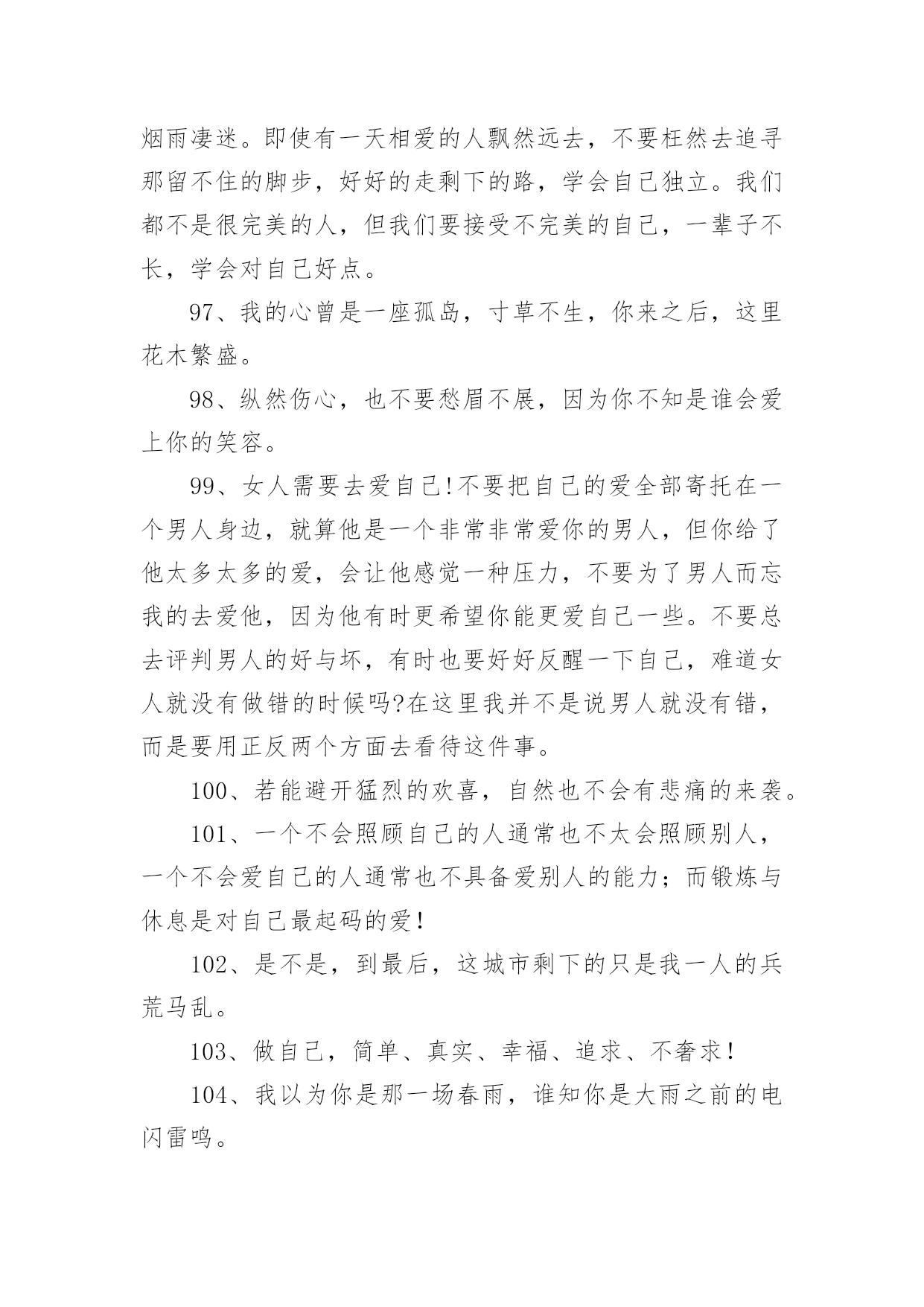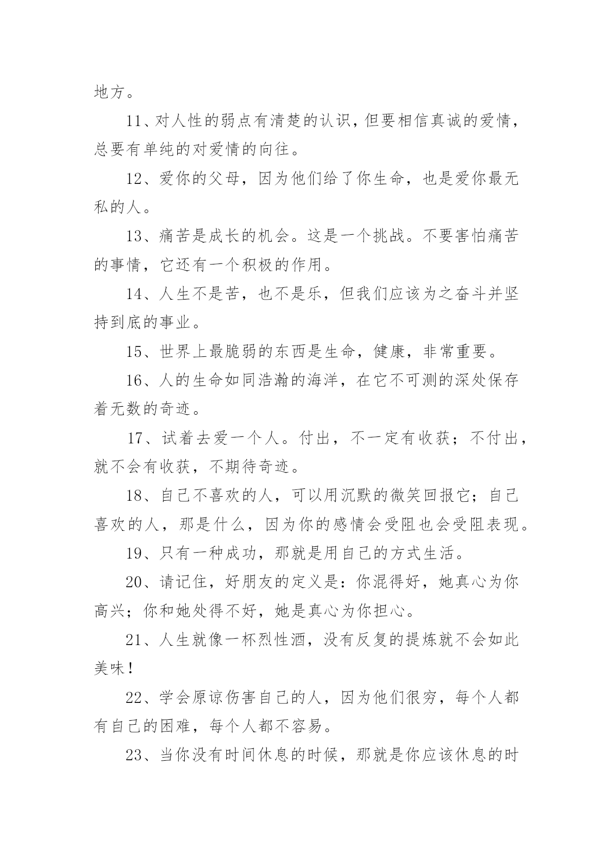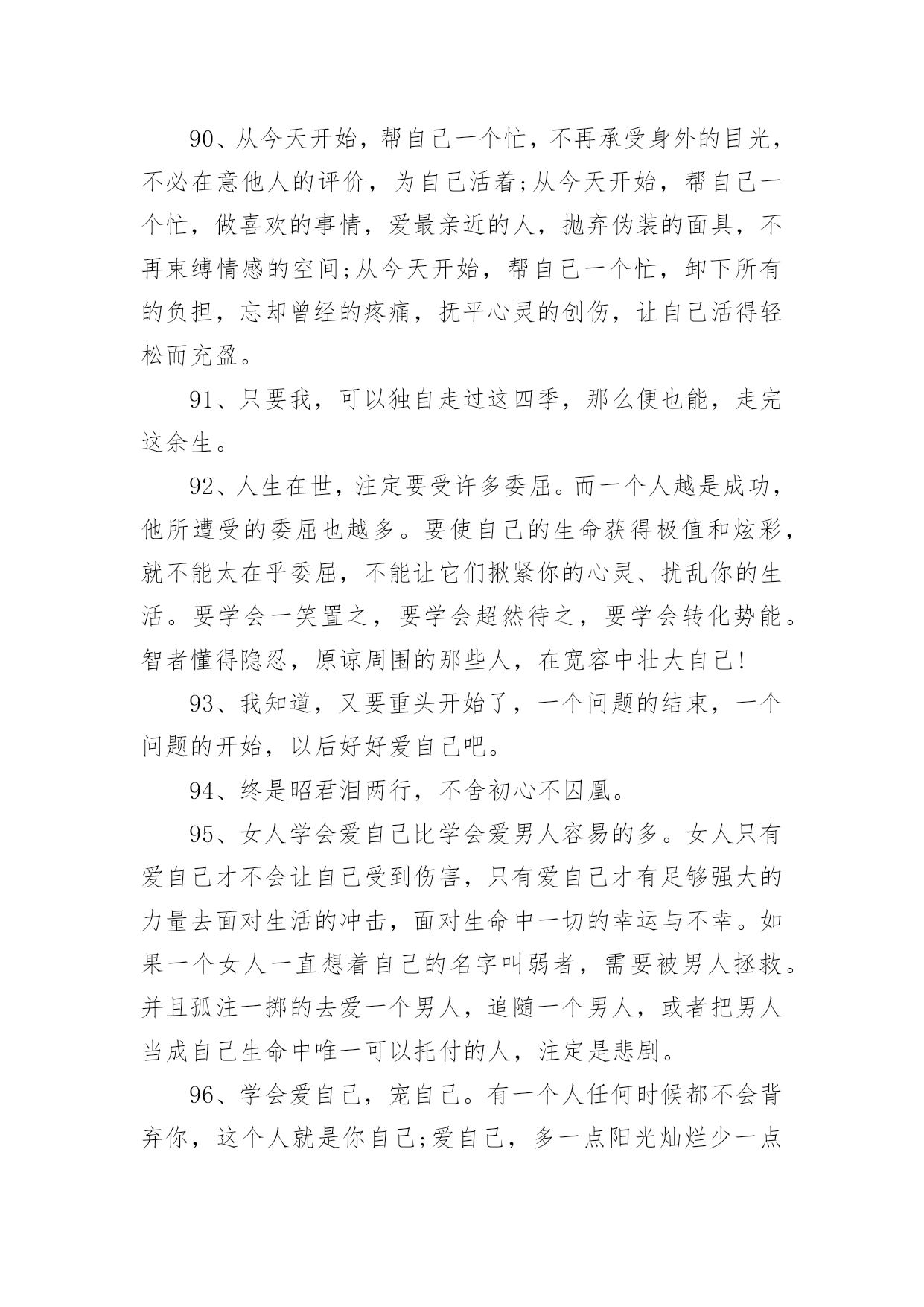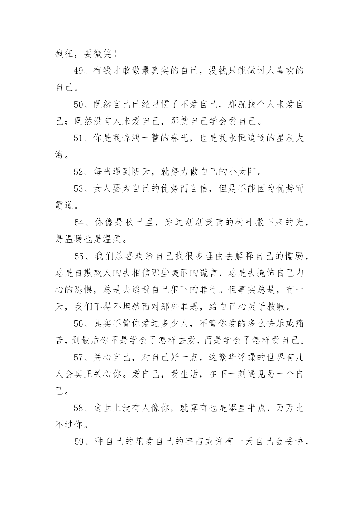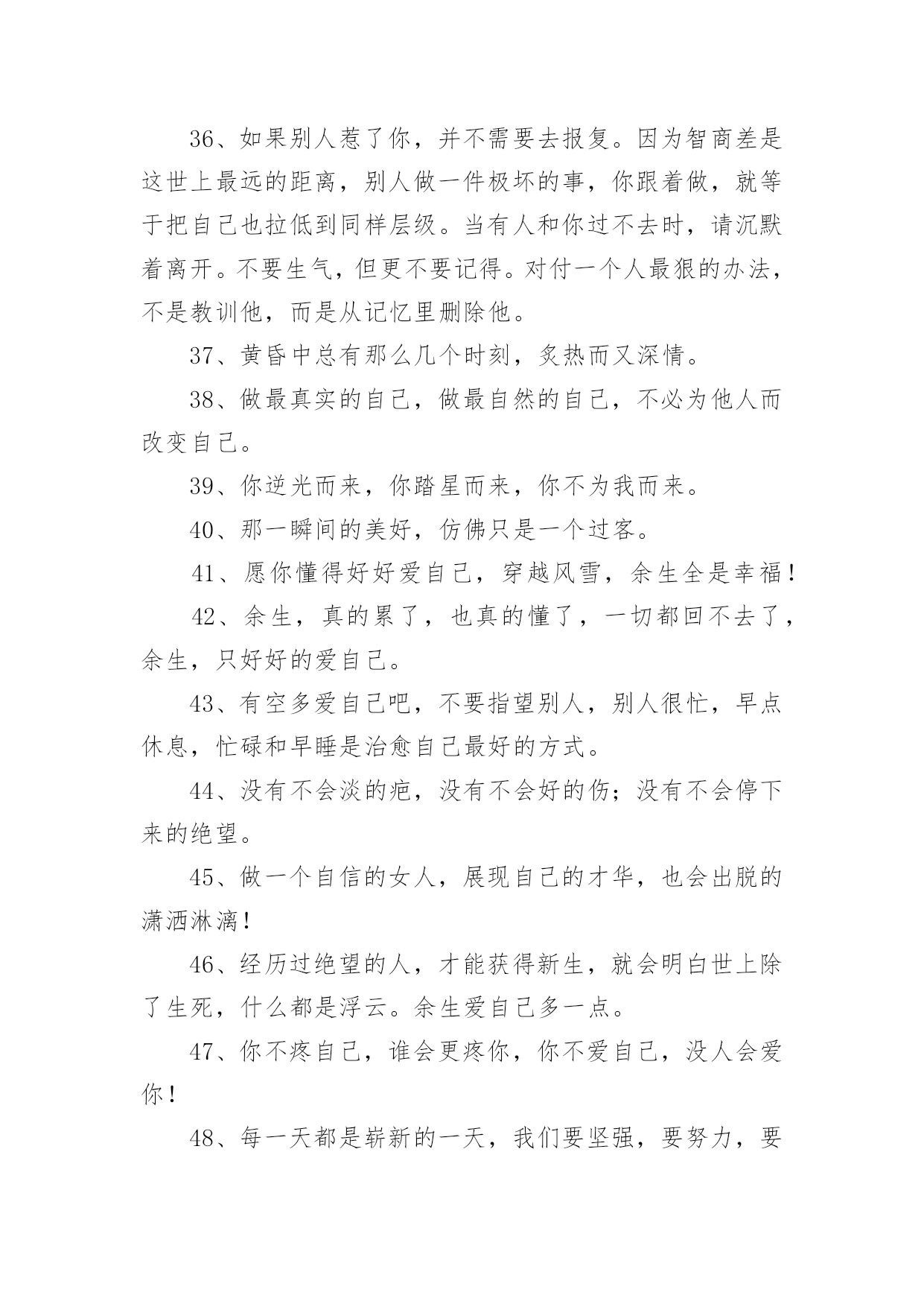 爱生活爱自己的句子爱生活爱自己的句子400句在日常的学习、工作、生活中,大家都知道一些经典的句子吧,句子由词或词组部分和语调所表示的语气部分组成。句子的类型多样,你所见过的句子是什么样的呢?下面是小编精心整理的爱生活爱自己的句子,希望能够帮助到大家。1、永远不要担心发生了什么,也不要担心没有发生什么。担心它已经发生的事实是没有帮助的。没有发生的事情只会通过主观臆测增加忧虑,这使得推断事情的方向变得不可能。2、生活的理想,是为了理想的生活。3、有时候也要现实和虚伪一点,否则很难混。4、不要伤害相思,幸福不是你的那份。当你把爱赶出生活,你就把快乐赶出了生活。爱情一帆风顺,其实无味。5、不要给自己找任何借口。当他们错了的时候,没有人喜欢他们。6、生活中,容易消沉的男人,不是男人,只是男人。7、不同的人生理想,不同的人生态度,决定了一个人在战斗中的地位。8、生活并不是像火车经过每个车站一样经过人生的每个阶段。生活总是笔直向前,不留遗憾。9、不要总是告诉别人你的困难,暴露你的弱点。10、生活的乐趣在于生活本身,而不在于工作或生活的地方。11、对人性的弱点有清楚的认识,但要相信真诚的爱情,总要有单纯的对爱情的向往。12、爱你的父母,因为他们给了你生命,也是爱你最无私的人。13、痛苦是成长的机会。这是一个挑战。不要害怕痛苦的事情,它还有一个积极的作用。14、人生不是苦,也不是乐,但我们应该为之奋斗并坚持到底的事业。15、世界上最脆弱的东西是生命,健康,非常重要。16、人的生命如同浩瀚的海洋,在它不可测的深处保存着无数的奇迹。17、试着去爱一个人。付出,不一定有收获;不付出,就不会有收获,不期待奇迹。18、自己不喜欢的人,可以用沉默的微笑回报它;自己喜欢的人,那是什么,因为你的感情会受阻也会受阻表现。19、只有一种成功,那就是用自己的方式生活。20、请记住,好朋友的定义是:你混得好,她真心为你高兴;你和她处得不好,她是真心为你担心。21、人生就像一杯烈性酒,没有反复的提炼就不会如此美味!22、学会原谅伤害自己的人,因为他们很穷,每个人都有自己的困难,每个人都不容易。23、当你没有时间休息的时候,那就是你应该休息的时候。24、每个人都不需要跟别人一样,只要做好自己的事,做大自己就行了。25、喜欢被温柔相待,更喜欢被特殊心皆懂。26、在一开始,我们就应该学会好好爱自己。而不是等到最后,发现没有人可以爱了,才决定要好好爱自己。27、你应对自己的情感负责。你的情感是随思想而产生的。那么,你只要愿意,便可以改变对任何事物的看法,使内心充满积极正面的能量。28、人,一定要好好爱自己,别让自己缺钱,别让自己缺爱。自己心里一定要有很多爱,包裹自己。29、生活的更好,是为了自己。30、一半浮生二两清酒三生有幸四季与你。31、自恋,是因为既然没有别有人愿意爱自己,那就自己爱自己,相信一样也会很幸福吧。32、不要为别人委屈自己,改变自己。你是唯一的你,珍贵的你,骄傲的你,美丽的你。一定要好好爱自己。33、如果当初,没喜欢上你那现在会不会是另一番风景。34、当没有人爱你时,你自己要加倍的爱自己,对自己好,这样才不会后悔当初的决定,这样别人就会更加支持你当初的决定。35、爱自己的女人首先要有一个良好的心态,以快乐的心情对待生活中的每一天。快乐是一天,不快乐也是一天,为什么要不快乐呢?36、如果别人惹了你,并不需要去报复。因为智商差是这世上最远的距离,别人做一件极坏的事,你跟着做,就等于把自己也拉低到同样层级。当有人和你过不去时,请沉默着离开。不要生气,但更不要记得。对付一个人最狠的办法,不是教训他,而是从记忆里删除他。37、黄昏中总有那么几个时刻,炙热而又深情。38、做最真实的自己,做最自然的自己,不必为他人而改变自己。39、你逆光而来,你踏星而来,你不为我而来。40、那一瞬间的美好,仿佛只是一个过客。41、愿你懂得好好爱自己,穿越风雪,余生全是幸福!42、余生,真的累了,也真的懂了,一切都回不去了,余生,只好好的爱自己。43、有空多爱自己吧,不要指望别人,别人很忙,早点休息,忙碌和早睡是治愈自己最好的方式。44、没有不会淡的疤,没有不会好的伤;没有不会停下来的绝望。45、做一个自信的女人,展现自己的才华,也会出脱的潇洒淋漓!46、经历过绝望的人,才能获得新生,就会明白世上除了生死,什么都是浮云。余生爱自己多一点。47、你不疼自己,谁会更疼你,你不爱自己,没人会爱你!48、每一天都是崭新的一天,我们要坚强,要努力,要疯狂,要微笑!49、有钱才敢做最真实的自己,没钱只能做讨人喜欢的自己。50、既然自己已经习惯了不爱自己,那就找个人来爱自己;既然没有人来爱自己,那就自己学会爱自己。51、你是我惊鸿一瞥的春光,也是我永恒追逐的星辰大海。52、每当遇到阴天,就努力做自己的