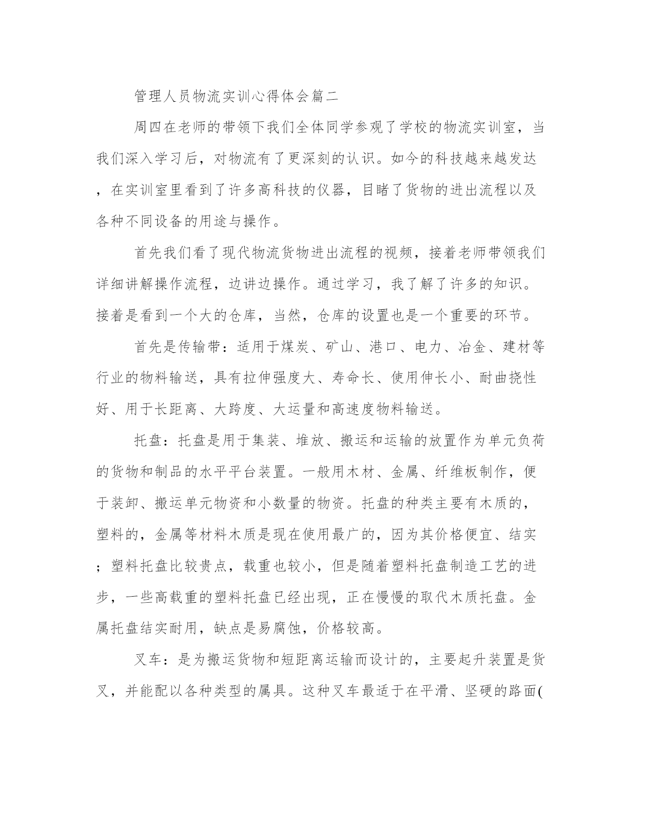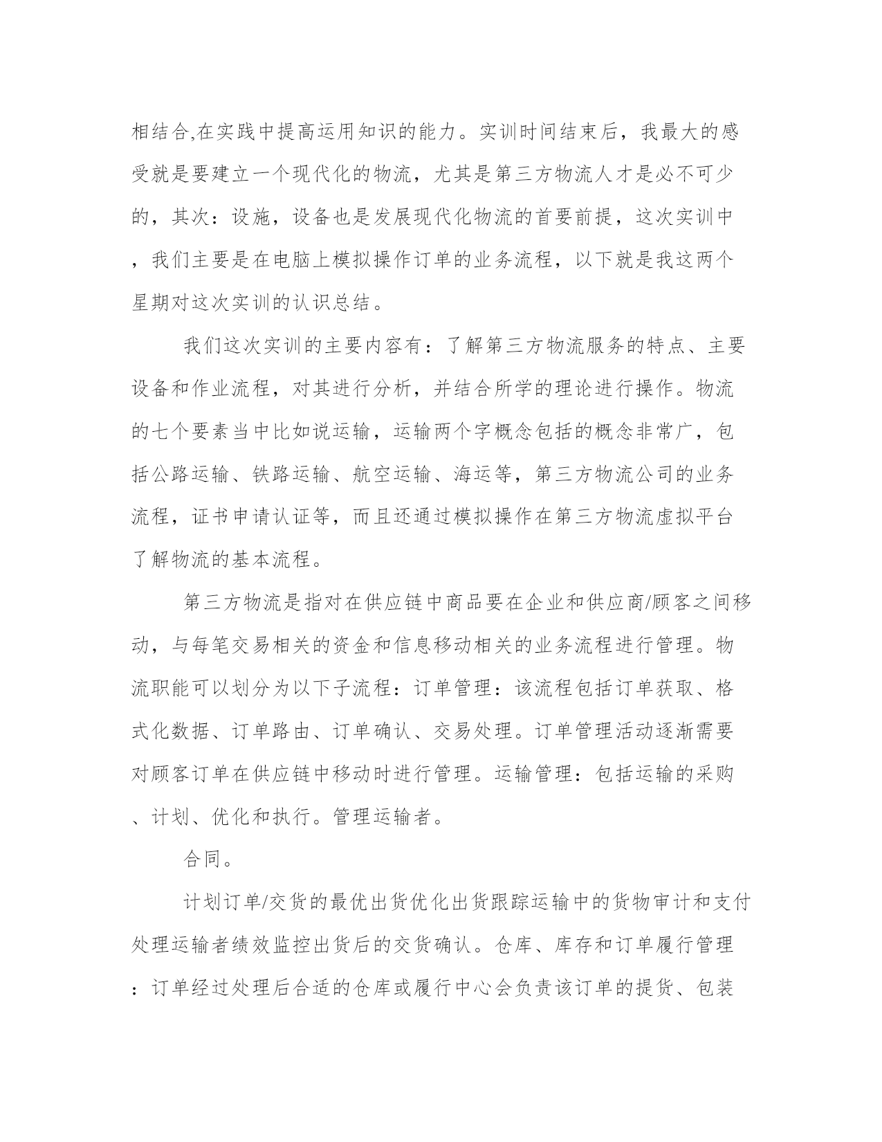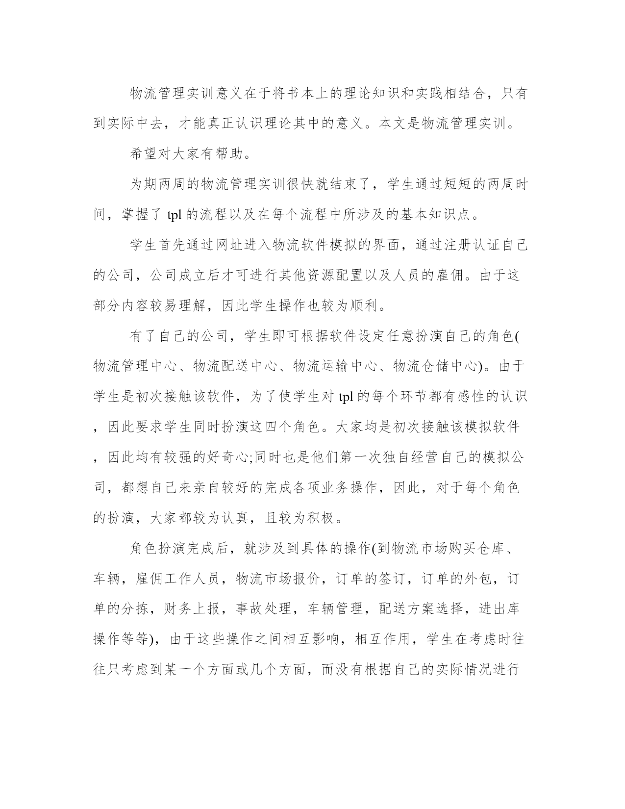 管理人员物流实训心得体会(通用16篇)心得体会可以是文字、图片、音频等形式,通过多样化的方式呈现个人对事物的理解和感悟。9.写心得体会时,我们可以参考一些优秀的范文或经典作品,学习他人的表达方式和写作技巧,提升自己的写作水平。以下是小编为大家收集的心得体会范文,仅供参考,希望能给大家带来一些启发。管理人员物流实训心得体会篇一4月1日公司组织了一次管理人员培训课程,使我不仅从理论上更深层次的学习了什么是管理,同时在思想上也受到了启发,从中更认识到作为管理人员,怎样站好自己的岗位,怎样协调好、培训好员工,让每个人都认清工作目标,知道该做什么,让每个人都高效地工作,让每个人都相互协作;让大家都有继续获得培养成长的机会,让大家都有为达成目标与实现自我的动力。作为主管能积极向上的带领团队一起朝着公司制定的目标努力奋斗,把各项工作做到最好是我们的职责。管理人员要善于培养他人,包括自己,在培养下属的同时也是在培养自己,管理人员要做到承上启下的作用,不要整天做跟保姆一样的工作。伟策企业管理咨询公司的韦老师讲到了在管理工作中,事前控制的重要性,以“扁鹊论医术”来举例:魏文王问名医扁鹊说:“你们家兄弟三人,都精于医术,到底哪一位最好呢?”扁鹊答:“长兄最好,中兄次之,我最差。”文王再问:“那么为什么你最出名呢?”扁鹊答:“长兄治病,是治病于病情发作之前。由于一般人不知道他事先能铲除病因,所以他的名气无法传出去;中兄治病,是治病于病情初起时。一般人以为他只能治轻微的小病,所以他的名气只及本乡里。而我是治病于病情严重之时。一般人都看到我在经脉上穿针管放血、在皮肤上敷药等大手术,所以以为我的医术高明,名气因此响遍全国。”管理心得:事后控制不如事中控制,事中控制不如事前控制,可惜大多数的管理人员均未能体会到这一点,等到错误的决策造成了重大的损失才寻求弥补。而往往是即使请来了名气很大的“空降兵”,结果于事无补。所以日常工作中,重要不紧急的事情是我们最应关注的;我们应该把主要精力放在重要不紧急的事情上,尽量避免紧急重要的事情。正所谓日日行,不怕千万里,常常做,不怕千万事!尤其在财务上是非常适用的。出处fAnWen.cHAzIdIaN.COM“团结、务实、创新、超越”是公司倡导的企业精神,我想这也是一个企业的灵魂和推动其不断发展的不竭动力所在。xx年是公司创造品牌的年,公司是每一位加盟公司的员工组成的利益共体,大家坐在同一条船上奋力驶向这同一个理想的目标。创造出一流的品牌,工作出一流的品质!管理人员物流实训心得体会篇二周四在老师的带领下我们全体同学参观了学校的物流实训室,当我们深入学习后,对物流有了更深刻的认识。如今的科技越来越发达,在实训室里看到了许多高科技的仪器,目睹了货物的进出流程以及各种不同设备的用途与操作。首先我们看了现代物流货物进出流程的视频,接着老师带领我们详细讲解操作流程,边讲边操作。通过学习,我了解了许多的知识。接着是看到一个大的仓库,当然,仓库的设置也是一个重要的环节。首先是传输带:适用于煤炭、矿山、港口、电力、冶金、建材等行业的物料输送,具有拉伸强度大、寿命长、使用伸长小、耐曲挠性好、用于长距离、大跨度、大运量和高速度物料输送。托盘:托盘是用于集装、堆放、搬运和运输的放置作为单元负荷的货物和制品的水平平台装置。一般用木材、金属、纤维板制作,便于装卸、搬运单元物资和小数量的物资。托盘的种类主要有木质的,塑料的,金属等材料木质是现在使用最广的,因为其价格便宜、结实;塑料托盘比较贵点,载重也较小,但是随着塑料托盘制造工艺的进步,一些高载重的塑料托盘已经出现,正在慢慢的取代木质托盘。金属托盘结实耐用,缺点是易腐蚀,价格较高。叉车:是为搬运货物和短距离运输而设计的,主要起升装置是货叉,并能配以各种类型的属具。这种叉车最适于在平滑、坚硬的路面(柏油、水泥等)上行驶。用于仓库、铁路车站、轮船码头、建筑工地等进行装卸或堆垛作业,可减轻工作人员的劳动强度,提高装卸效率。货架:货架是指商店营业厅中展示和放置近期拟销商品的橱、架、柜、箱等各种器具。货架从中国古老的中药店里药柜到现代各式商场店铺里所用的各种货架,到大型立体仓库里的钢筋或是更为先进的材质所制成的货架,人们都是耳熟能详。托盘货架、搁板式货架等对安装服务要求不高的品种,而对于安装服务要求较高的立体库出口还比较少。中国自动化仓库用货架已达到国际水平。货架按货架的发展分为传统货架和新型货架。传统式货架包括:层架、层横梁式货架格式货架、抽屉式货架、橱柜式货架、u形架、悬臂架、栅架、鞍架、气罐钢筒架、车胎专用货架等。新型货架包括:旋转式货架、移动式货架、装配式货架、调节式货架、托盘货架、进车式货架、高层货架、阁楼式货架、重力式货架、平挂式货架等。货架的制造材料有钢、钢筋混凝