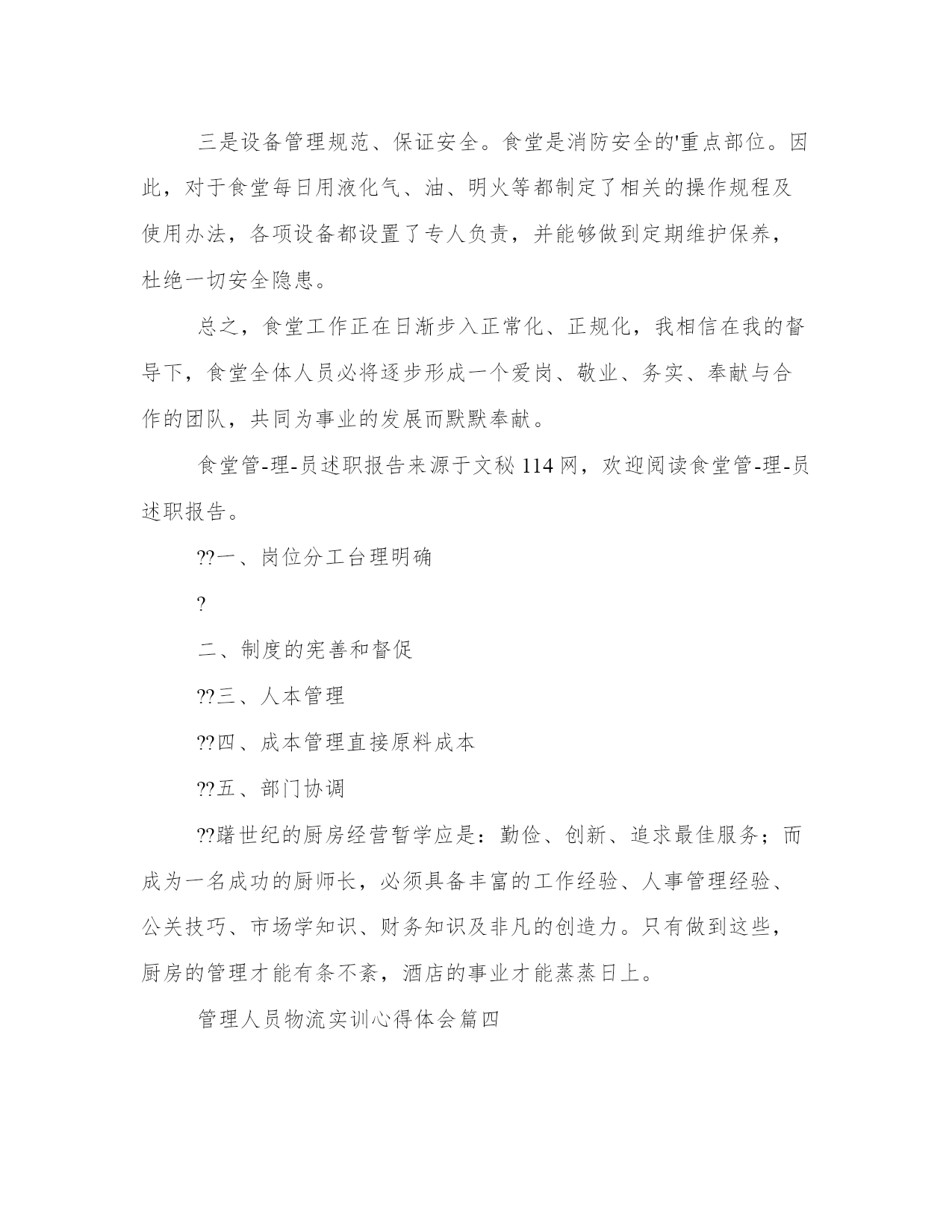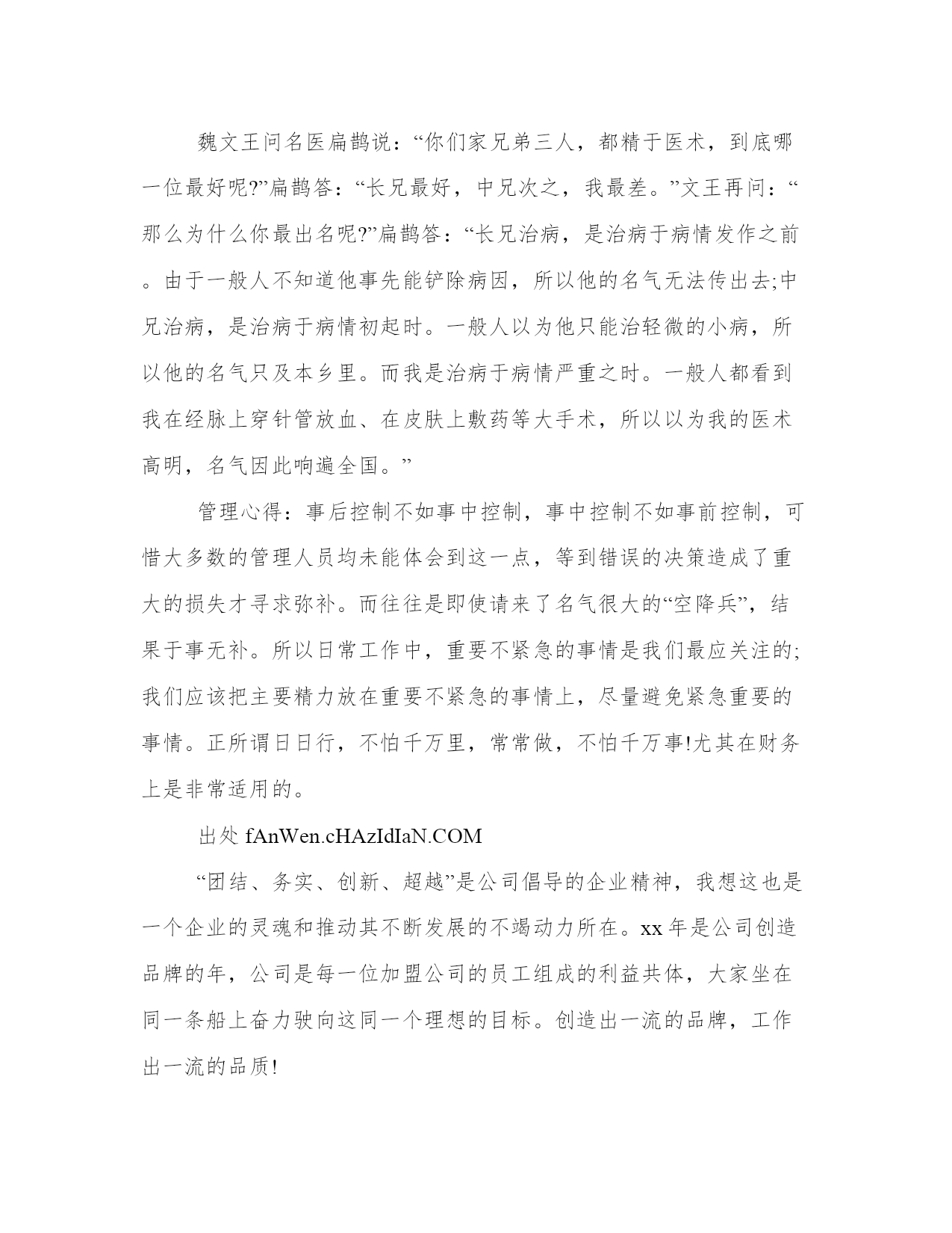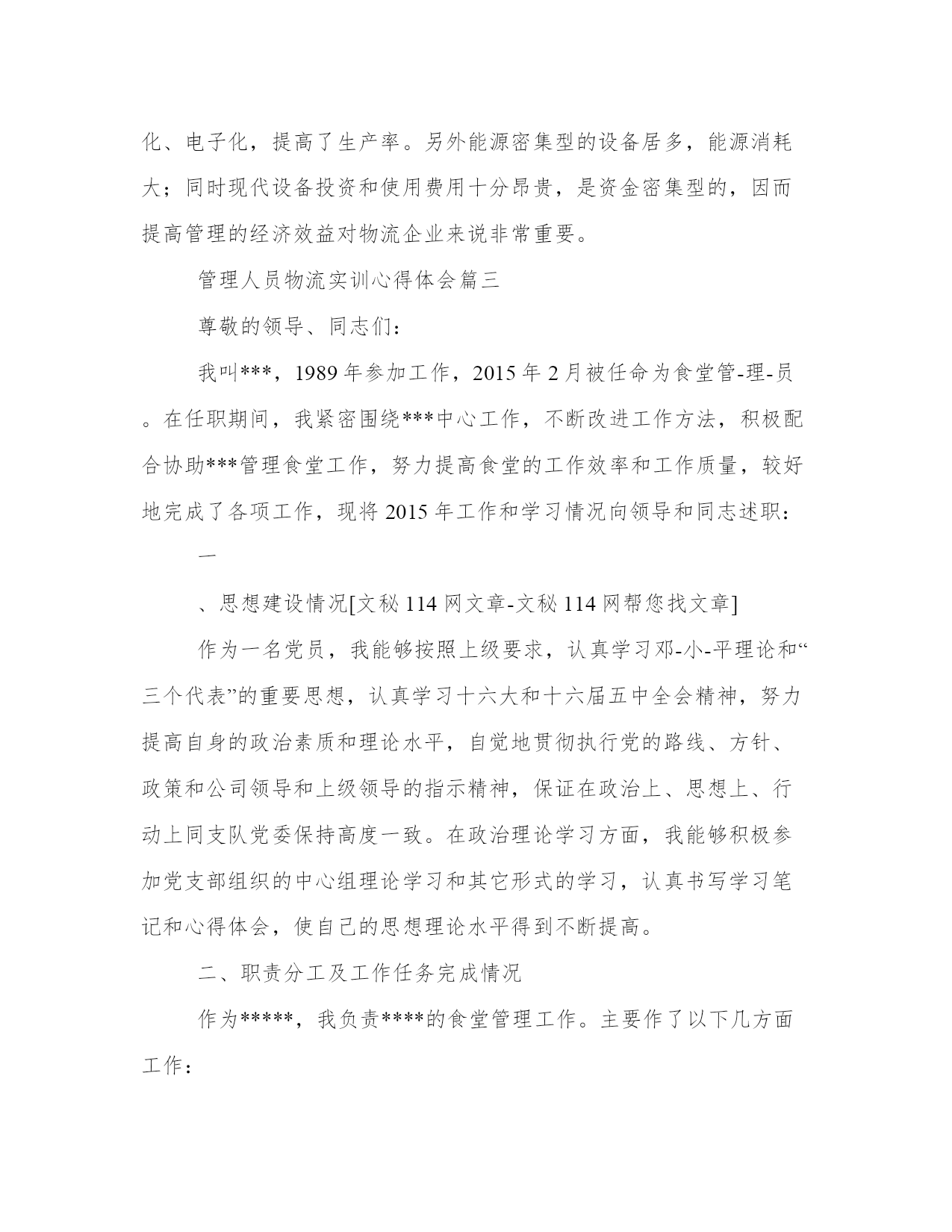 管理人员物流实训心得体会(通用16篇)心得体会可以是文字、图片、音频等形式,通过多样化的方式呈现个人对事物的理解和感悟。9.写心得体会时,我们可以参考一些优秀的范文或经典作品,学习他人的表达方式和写作技巧,提升自己的写作水平。以下是小编为大家收集的心得体会范文,仅供参考,希望能给大家带来一些启发。管理人员物流实训心得体会篇一4月1日公司组织了一次管理人员培训课程,使我不仅从理论上更深层次的学习了什么是管理,同时在思想上也受到了启发,从中更认识到作为管理人员,怎样站好自己的岗位,怎样协调好、培训好员工,让每个人都认清工作目标,知道该做什么,让每个人都高效地工作,让每个人都相互协作;让大家都有继续获得培养成长的机会,让大家都有为达成目标与实现自我的动力。作为主管能积极向上的带领团队一起朝着公司制定的目标努力奋斗,把各项工作做到最好是我们的职责。管理人员要善于培养他人,包括自己,在培养下属的同时也是在培养自己,管理人员要做到承上启下的作用,不要整天做跟保姆一样的工作。伟策企业管理咨询公司的韦老师讲到了在管理工作中,事前控制的重要性,以“扁鹊论医术”来举例:魏文王问名医扁鹊说:“你们家兄弟三人,都精于医术,到底哪一位最好呢?”扁鹊答:“长兄最好,中兄次之,我最差。”文王再问:“那么为什么你最出名呢?”扁鹊答:“长兄治病,是治病于病情发作之前。由于一般人不知道他事先能铲除病因,所以他的名气无法传出去;中兄治病,是治病于病情初起时。一般人以为他只能治轻微的小病,所以他的名气只及本乡里。而我是治病于病情严重之时。一般人都看到我在经脉上穿针管放血、在皮肤上敷药等大手术,所以以为我的医术高明,名气因此响遍全国。”管理心得:事后控制不如事中控制,事中控制不如事前控制,可惜大多数的管理人员均未能体会到这一点,等到错误的决策造成了重大的损失才寻求弥补。而往往是即使请来了名气很大的“空降兵”,结果于事无补。所以日常工作中,重要不紧急的事情是我们最应关注的;我们应该把主要精力放在重要不紧急的事情上,尽量避免紧急重要的事情。正所谓日日行,不怕千万里,常常做,不怕千万事!尤其在财务上是非常适用的。出处fAnWen.cHAzIdIaN.COM“团结、务实、创新、超越”是公司倡导的企业精神,我想这也是一个企业的灵魂和推动其不断发展的不竭动力所在。xx年是公司创造品牌的年,公司是每一位加盟公司的员工组成的利益共体,大家坐在同一条船上奋力驶向这同一个理想的目标。创造出一流的品牌,工作出一流的品质!管理人员物流实训心得体会篇二周四在老师的带领下我们全体同学参观了学校的物流实训室,当我们深入学习后,对物流有了更深刻的认识。如今的科技越来越发达,在实训室里看到了许多高科技的仪器,目睹了货物的进出流程以及各种不同设备的用途与操作。首先我们看了现代物流货物进出流程的视频,接着老师带领我们详细讲解操作流程,边讲边操作。通过学习,我了解了许多的知识。接着是看到一个大的仓库,当然,仓库的设置也是一个重要的环节。首先是传输带:适用于煤炭、矿山、港口、电力、冶金、建材等行业的物料输送,具有拉伸强度大、寿命长、使用伸长小、耐曲挠性好、用于长距离、大跨度、大运量和高速度物料输送。托盘:托盘是用于集装、堆放、搬运和运输的放置作为单元负荷的货物和制品的水平平台装置。一般用木材、金属、纤维板制作,便于装卸、搬运单元物资和小数量的物资。托盘的种类主要有木质的,塑料的,金属等材料木质是现在使用最广的,因为其价格便宜、结实;塑料托盘比较贵点,载重也较小,但是随着塑料托盘制造工艺的进步,一些高载重的塑料托盘已经出现,正在慢慢的取代木质托盘。金属托盘结实耐用,缺点是易腐蚀,价格较高。叉车:是为搬运货物和短距离运输而设计的,主要起升装置是货叉,并能配以各种类型的属具。这种叉车最适于在平滑、坚硬的路面(柏油、水泥等)上行驶。用于仓库、铁路车站、轮船码头、建筑工地等进行装卸或堆垛作业,可减轻工作人员的劳动强度,提高装卸效率。货架:货架是指商店营业厅中展示和放置近期拟销商品的橱、架、柜、箱等各种器具。货架从中国古老的中药店里药柜到现代各式商场店铺里所用的各种货架,到大型立体仓库里的钢筋或是更为先进的材质所制成的货架,人们都是耳熟能详。托盘货架、搁板式货架等对安装服务要求不高的品种,而对于安装服务要求较高的立体库出口还比较少。中国自动化仓库用货架已达到国际水平。货架按货架的发展分为传统货架和新型货架。传统式货架包括:层架、层横梁式货架格式货架、抽屉式货架、橱柜式货架、u形架、悬臂架、栅架、鞍架、气罐钢筒架、车胎专用货架等。新型货架包括:旋转式货架、移动式货架、装配式货架、调节式货架、托盘货架、进车式货架、高层货架、阁楼式货架、重力式货架、平挂式货架等。货架的制造材料有钢、钢筋混凝